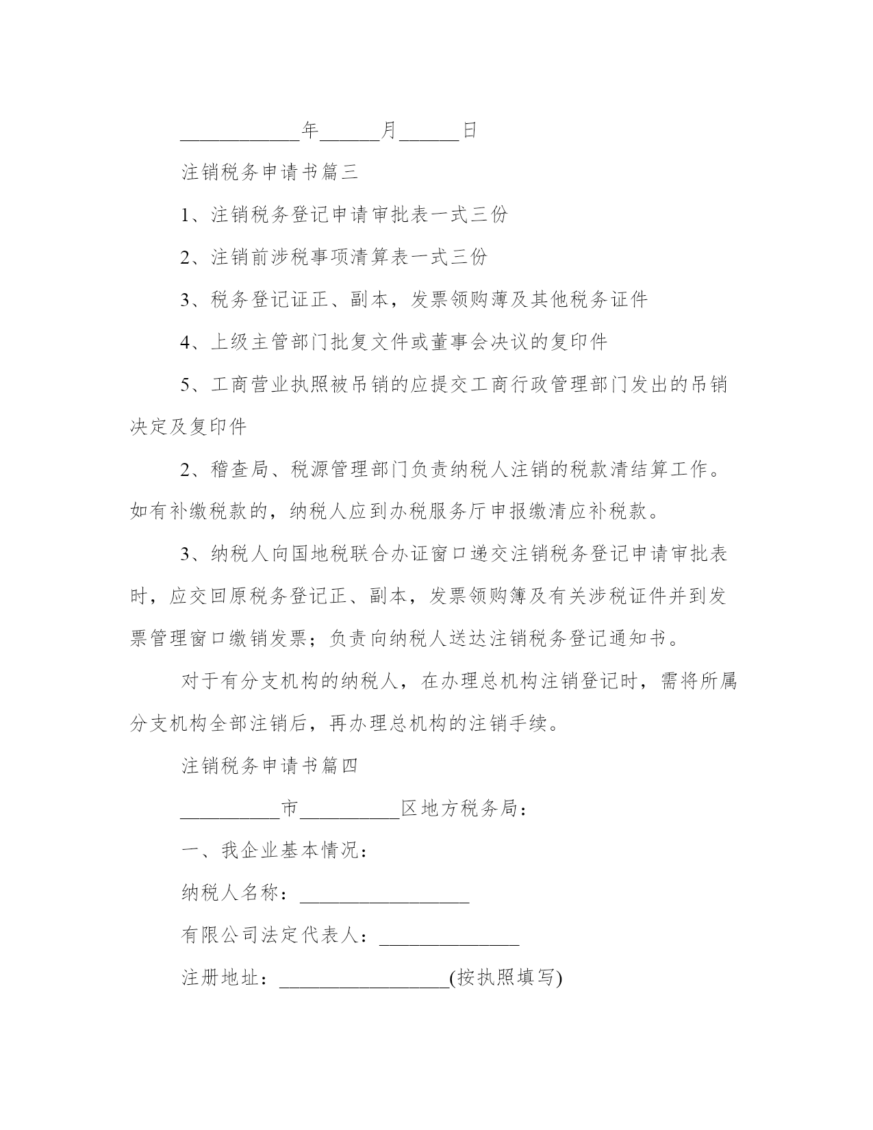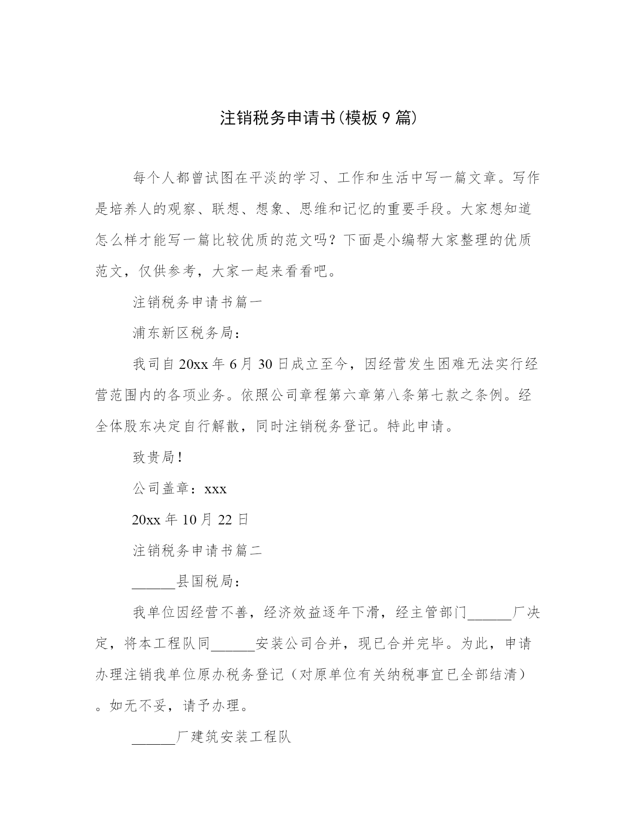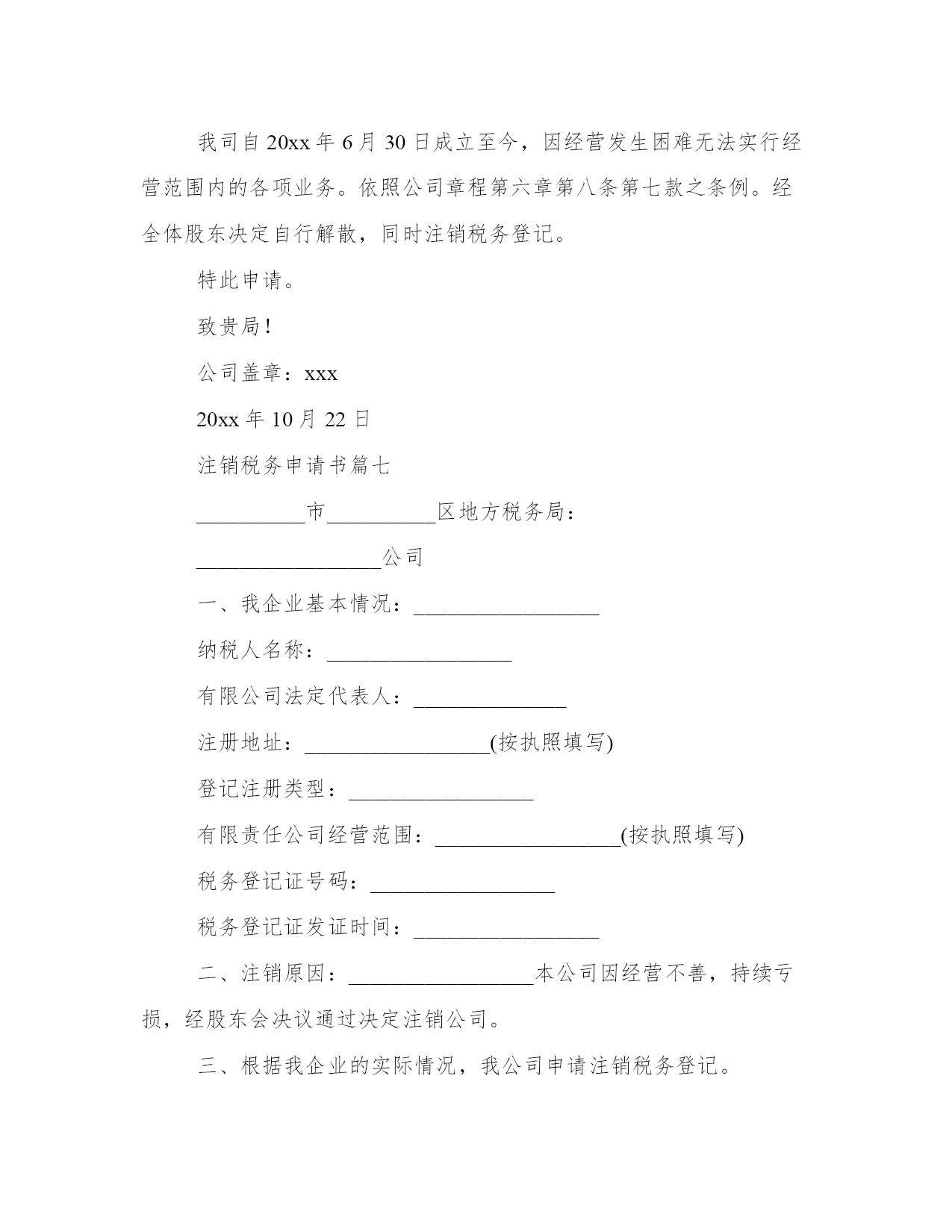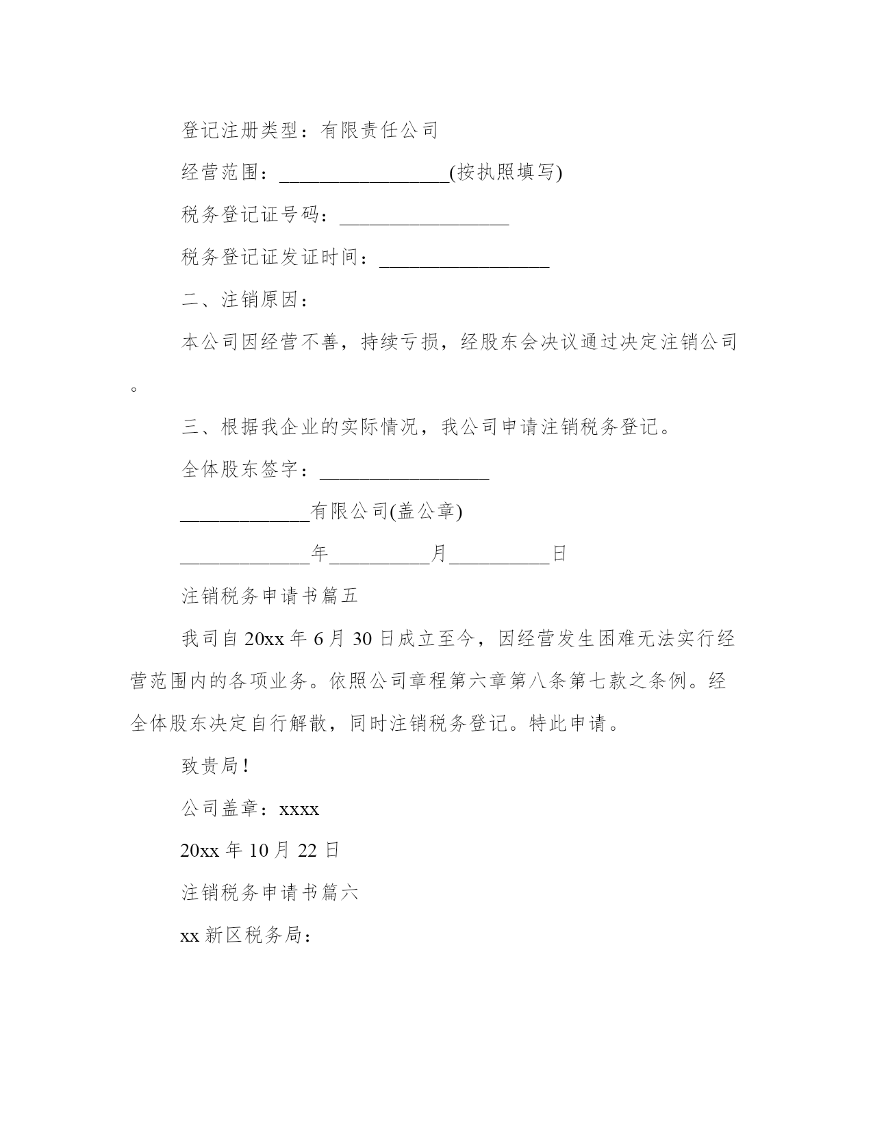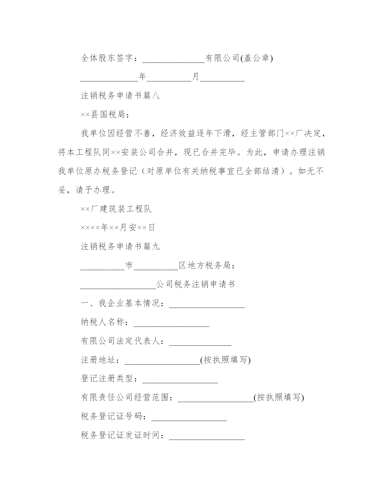 注销税务申请书(模板9篇)每个人都曾试图在平淡的学习、工作和生活中写一篇文章。写作是培养人的观察、联想、想象、思维和记忆的重要手段。大家想知道怎么样才能写一篇比较优质的范文吗?下面是小编帮大家整理的优质范文,仅供参考,大家一起来看看吧。注销税务申请书篇一浦东新区税务局:我司自20xx年6月30日成立至今,因经营发生困难无法实行经营范围内的各项业务。依照公司章程第六章第八条第七款之条例。经全体股东决定自行解散,同时注销税务登记。特此申请。致贵局!公司盖章:xxx20xx年10月22日注销税务申请书篇二______县国税局:我单位因经营不善,经济效益逐年下滑,经主管部门______厂决定,将本工程队同______安装公司合并,现已合并完毕。为此,申请办理注销我单位原办税务登记(对原单位有关纳税事宜已全部结清)。如无不妥,请予办理。______厂建筑安装工程队____________年______月______日注销税务申请书篇三1、注销税务登记申请审批表一式三份2、注销前涉税事项清算表一式三份3、税务登记证正、副本,发票领购薄及其他税务证件4、上级主管部门批复文件或董事会决议的复印件5、工商营业执照被吊销的应提交工商行政管理部门发出的吊销决定及复印件2、稽查局、税源管理部门负责纳税人注销的税款清结算工作。如有补缴税款的,纳税人应到办税服务厅申报缴清应补税款。3、纳税人向国地税联合办证窗口递交注销税务登记申请审批表时,应交回原税务登记正、副本,发票领购簿及有关涉税证件并到发票管理窗口缴销发票;负责向纳税人送达注销税务登记通知书。对于有分支机构的纳税人,在办理总机构注销登记时,需将所属分支机构全部注销后,再办理总机构的注销手续。注销税务申请书篇四__________市__________区地方税务局:一、我企业基本情况:纳税人名称:_________________有限公司法定代表人:______________注册地址:_________________(按执照填写)登记注册类型:有限责任公司经营范围:_________________(按执照填写)税务登记证号码:_________________税务登记证发证时间:_________________二、注销原因:本公司因经营不善,持续亏损,经股东会决议通过决定注销公司。三、根据我企业的实际情况,我公司申请注销税务登记。全体股东签字:______________________________有限公司(盖公章)_____________年__________月__________日注销税务申请书篇五我司自20xx年6月30日成立至今,因经营发生困难无法实行经营范围内的各项业务。依照公司章程第六章第八条第七款之条例。经全体股东决定自行解散,同时注销税务登记。特此申请。致贵局!公司盖章:xxxx20xx年10月22日注销税务申请书篇六xx新区税务局:我司自20xx年6月30日成立至今,因经营发生困难无法实行经营范围内的各项业务。依照公司章程第六章第八条第七款之条例。经全体股东决定自行解散,同时注销税务登记。特此申请。致贵局!公司盖章:xxx20xx年10月22日注销税务申请书篇七__________市__________区地方税务局:_________________公司一、我企业基本情况:_________________纳税人名称:_________________有限公司法定代表人:______________注册地址:_________________(按执照填写)登记注册类型:_________________有限责任公司经营范围:_________________(按执照填写)税务登记证号码:_________________税务登记证发证时间:_________________二、注销原因:_________________本公司因经营不善,持续亏损,经股东会决议通过决定注销公司。三、根据我企业的实际情况,我公司申请注销税务登记。全体股东签字:______________有限公司(盖公章)_____________年__________月__________注销税务申请书篇八××县国税局:我单位因经营不善,经济效益逐年下滑,经主管部门××厂决定,将本工程队同××安装公司合并,现已合并完毕。为此,申请办理注销我单位原办税务登记(对原单位有关纳税事宜已全部结清)。如无不妥,请予办理。××厂建筑装工程队××××年××月安××日注销税务申请书篇九__________市__________区地方税务局:_________________公