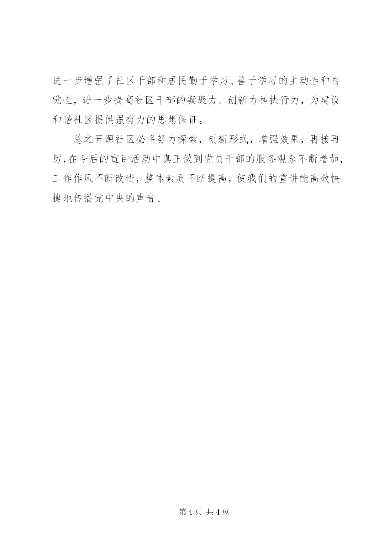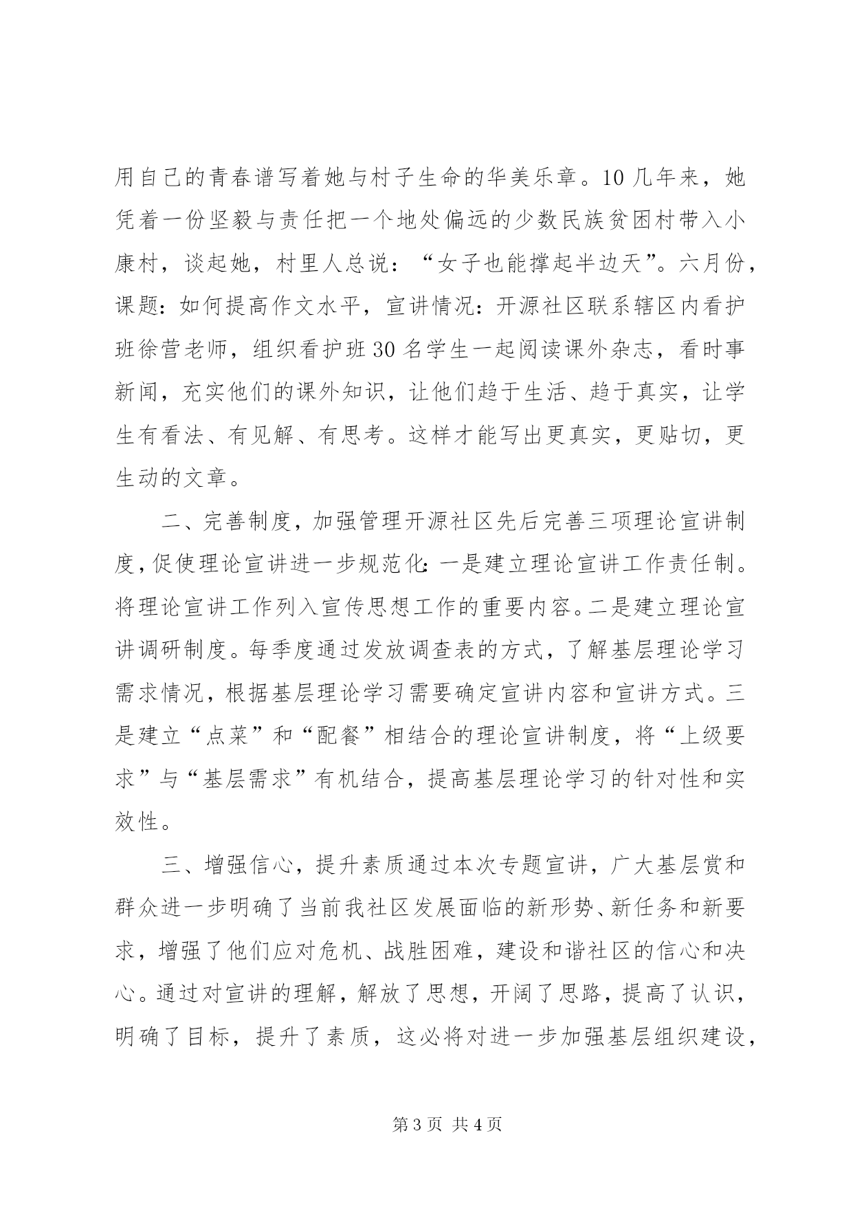 第PAGE\*Arabic\*MERGEFORMAT4页共NUMPAGES\*MERGEFORMAT4页理论宣讲半年工作总结开源社区基层理论宣讲工作半年总结开源社区基层理论宣讲工作半年总结开源社区理论宣讲工作在街道有关部门的正确领导和精心指导下,本着理论指导实践、服务实践的原则,以基层理论宣讲站为阵地,充分发挥思想政治宣讲工作,密切党同人民群众血肉联系的桥梁纽带作用,以拓展党员干部群众理论学习覆盖面为目的,围绕中心,服务大局。在统一思想、凝聚人心、提升居民思想道德文化素质、推动和谐宣化建设上,发挥了重要作用。现将我社区宣讲工作活动总结如下:一、高度重视,精心组织开源社区对专题宣讲工作高度重视,开展20XX年专题宣讲工作的通知,对宣教工作的目标任务、组织领导、宣讲内容作出了具体部署和要求。开源社区每月进行一次理论宣讲活动:一月份,课题:好人说事,宣讲情况:上午9点30分在和顺活动室,召开好人好事报告会,会上望花好人胡永泰向大家介绍了自己的先进事迹,胡永泰是铝厂退休的老党员,已是花甲之年的他身体硬朗、热情善良、热心公益、关心邻里,谁家有个大事小情的,他都乐意帮忙,社区活动他也积极参加。为小区种下一片绿荫,为居民传播文明新风,用行动共建美好和谐新家园。二月份,课题:青少年法制教育讲座,宣讲情况:为了开源社区青少年对法律有更深入的了解,开源社区开展了辖区青少年宣讲法律知识的小课堂。由社区书记对辖区青少年宣讲了法律小常识,教育和引导学生遵纪守法,提高自我防范意识和能力。三月份,课题:人民的好儿女--赵广军,宣讲情况:社区党总支组织社区工作人员和党员观看了人民好儿女专题片,其中赵广军的先进事迹使我们感动不已,他自费开通热心咨询电话,帮助过1000名问题市民,他说做人要有爱心还要有恒心,正是这三颗心支持着他,以一个优秀的共产党员坚持着为自己为人民服务的事业。四月份,课题:学习郭明义先进事迹,宣讲情况:社区党总支组织社区工作人员和党员观看了人民好儿女专题片,组织赏干部学习了郭明义典型先进事迹,郭义明出生于XX市一个普通的矿工家庭,现任大山铁矿公路管理员。他坚持做好事近30年,支助贫困大学生100多人,无偿献血6万余毫升。“好人”郭义明的先进事迹和崇高精神是新历史下雷锋精神的传承与弘扬,作为新中国的建设者,就是要学习他那种脚踏实地为岗位做贡献,为社会献爱心的精神,自觉做社会主义美德的传承者、社会主义道德规范的实践者,要学习他甘当“矿人”的奉献精神。五月份,课题:十年人生路--余留芬,宣讲情况:社区党总支组织社区工作人员和党员观看了人民好儿女专题片,十年光阴,放弃了自己的利益,奉献着自己的青春。让几百村民对其依赖和信任的余留芬是XX省盘县淤泥乡岩博村里首屈一指的好支书,她用自己的青春谱写着她与村子生命的华美乐章。10几年来,她凭着一份坚毅与责任把一个地处偏远的少数民族贫困村带入小康村,谈起她,村里人总说:“女子也能撑起半边天”。六月份,课题:如何提高作文水平,宣讲情况:开源社区联系辖区内看护班徐营老师,组织看护班30名学生一起阅读课外杂志,看时事新闻,充实他们的课外知识,让他们趋于生活、趋于真实,让学生有看法、有见解、有思考。这样才能写出更真实,更贴切,更生动的文章。二、完善制度,加强管理开源社区先后完善三项理论宣讲制度,促使理论宣讲进一步规范化:一是建立理论宣讲工作责任制。将理论宣讲工作列入宣传思想工作的重要内容。二是建立理论宣讲调研制度。每季度通过发放调查表的方式,了解基层理论学习需求情况,根据基层理论学习需要确定宣讲内容和宣讲方式。三是建立“点菜”和“配餐”相结合的理论宣讲制度,将“上级要求”与“基层需求”有机结合,提高基层理论学习的针对性和实效性。三、增强信心,提升素质通过本次专题宣讲,广大基层赏和群众进一步明确了当前我社区发展面临的新形势、新任务和新要求,增强了他们应对危机、战胜困难,建设和谐社区的信心和决心。通过对宣讲的理解,解放了思想,开阔了思路,提高了认识,明确了目标,提升了素质,这必将对进一步加强基层组织建设,进一步增强了社区干部和居民勤于学习、善于学习的主动性和自觉性,进一步提高社区干部的凝聚力、创新力和执行力,为建设和谐社区提供强有力的思想保证。总之开源社区必将努力探索,创新形式,增强效果,再接再厉,在今后的宣讲活动中真正做到党员干部的服务观念不断增加,工作作风不断改进,整体素质不断提高,使我们的宣讲能高效快捷地传播党中央的声音。