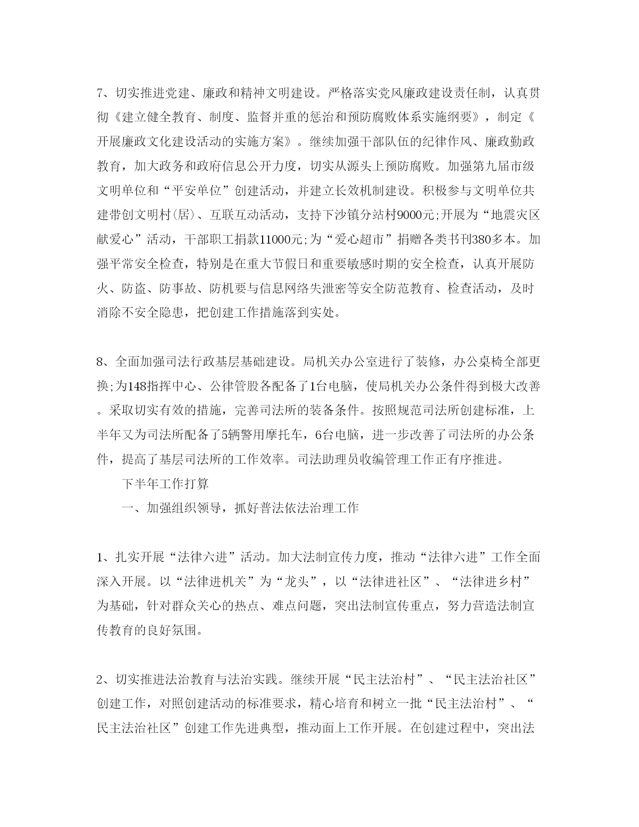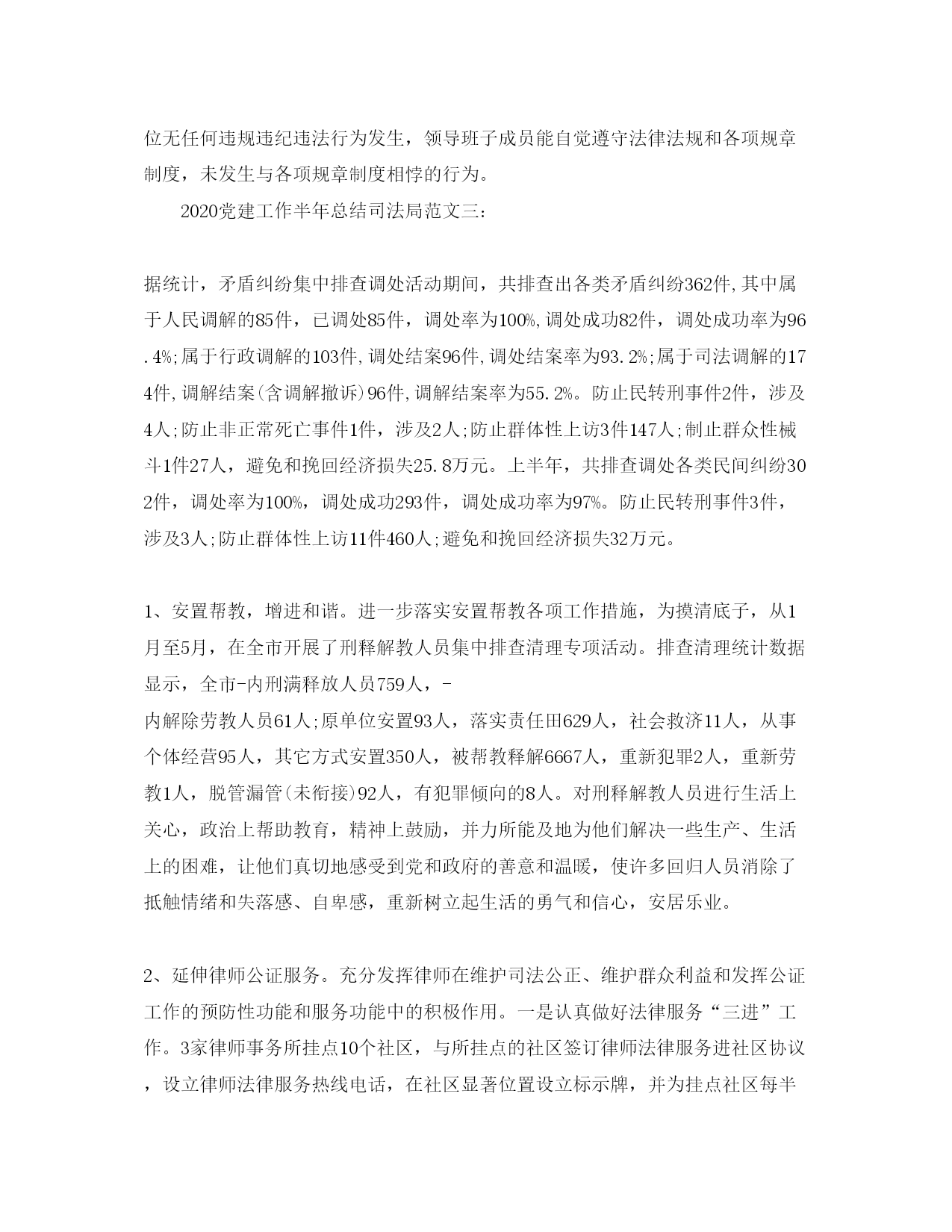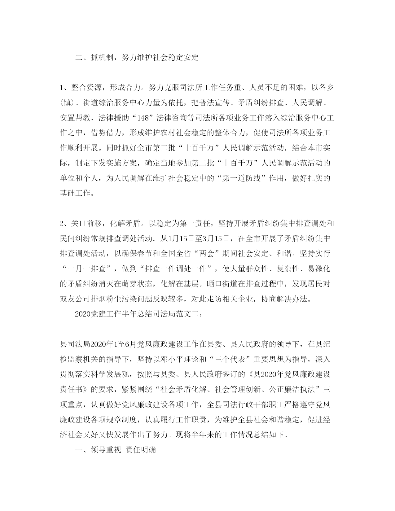 此资料由网络收集而来,如有侵权请告知上传者立即删除。资料共分享,我们负责传递知识。2020党建工作半年总结司法局今天小编给大家为您整理了2020党建工作半年总结司法局,希望对大家有所帮助。2020党建工作半年总结司法局范文一:全面落实科学发展观,牢固树立社会主义法治理念,以维护社会稳定大局为目标,以维护人民利益为根本,以改革创新为动力,以服务社会主义新农村为主题,充分发挥司法行政职能作用,为构建和谐社会提供优质高效的法律服务和坚强有力的法律保障,取得了较好的成效。上半年,我市司法行政工作在市委、市政府的正确领导和市人大的监督下,在上级司法行政机关的指导下,坚持以邓小平理论和“三个代表”重要思想为指导,认真贯彻执行党的xx大、上级司法行政工作会议和全市政法工作会议精神,紧密围绕建设海峡西岸经济区绿色腹地经济强市这个中心,全面落实科学发展观,牢固树立社会主义法治理念,以维护社会稳定大局为目标,以维护人民利益为根本,以改革创新为动力,以服务社会主义新农村为主题,充分发挥司法行政职能作用,为构建和谐社会提供优质高效的法律服务和坚强有力的法律保障,取得了较好的成效。一、抓载体,深入开展普法和依法治理工作1、积极营造普法和依法治理良好氛围。是“五五”普法承上启下的重要一年,依据市“五五”普法规划制定下发了《年普法依法治理工作要点》。为进一步推动“五五”普法目标的实现和任务的完成,营造普法和依法治理良好氛围,抓住“五五”普法中期督导检查这个契机,召开依法治市领导小组成员单位及相关部门会议,下发《关于组织开展“五五”普法中期督导检查的通知》,安排部署“五五”普法中期督导检查和迎检工作。全市各乡镇(街道)、市直各单位对照“五五”普法中期督导检查考核指标,认真组织自查,积极采取有效措施和手段,总结经验和成绩,查找问题和不足,及时进行整改。抽调人员组成4个督查组,根据“五五”普法中期督导检查考核指标对部分乡镇(街道)、部分市直单位进行中期检查验收。同时,根据市督导检查指标,组织人员精心准备、选好抽查点,准备好文字材料、台帐,迎接上级检查。通过“五五”普法中期督导检查和迎检准备,掀起了普法和依法治理新高潮。2、扎实开展“法律六进”活动。以“法律进社区”、“法律进乡村”为载体,促进“法律六进”活动全面、深入、务实发展。组织人员深入到等地开展以“关注民生,服务大众”为主题活动的法律宣传咨询活动,发放《物权法》、《道路交通安全法》、《公证法》等法律知识宣传材料1500余份,法律书籍160本,接待群众法律咨询96人次,深受群众的好评。同时派员组织人员到开展迎奥运法律咨询活动,为前来咨询的群众进行耐心细致的解答,向群众宣传政策法规。现场为村民赠书、发放法制宣传资料,深受村民欢迎。据统计,活动当天共接待群众法律咨询185人,发放宣传资料1500多份,赠送《农民身边的法律顾问》、《物权法》、《劳动合同法》等法律书籍300多本。3、有效推进基层依法治理。以“民主法治示范村”和“民主法治社区”创建活动为载体,通过建立健全“户代表制度”,全面完善村、居自治和村、居公开各项制度,推进村级事务民主管理,依法保障农民群众的选举权、参与权和监督权,促进农村发展。在省、市命名我市首批“民主法治示范村”的基础上,今年等14个村又被市司法局、民政局联合命名为市级“民主法治示范村”荣誉称号。按照规范化小区建设的要求,进一步加强基层民主法制建设,完善城市社区居民自治,提升我市社区建设和依法管理的水平。继续抓好3个“民主法治社区”试点社区,取得一定成效,并向全市推广,现创建工作现已全面推开,力争在“五五”普法结束时,全市有60%的社区跨入“民主法治社区”行列。二、抓机制,努力维护社会稳定安定1、整合资源,形成合力。努力克服司法所工作任务重、人员不足的困难,以各乡(镇)、街道综治服务中心力量为依托,把普法宣传、矛盾纠纷排查、人民调解、安置帮教、法律援助“148”法律咨询等司法所各项业务工作溶入综治服务中心工作之中,借势借力,形成维护农村社会稳定的整体合力,促使司法所各项业务工作顺利开展。同时抓好全市第二批“十百千万”人民调解示范活动,结合本市实际,制定下发实施方案,确定当地参加第二批“十百千万”人民调解示范活动的单位和个人,为人民调解在维护社会稳定中的“第一道防线”作用,做好扎实的基础工作。2、关口前移,化解矛盾。以稳定为第一责任,坚持开展矛盾纠纷集中排查调处和民间纠纷常规排查调处活动。从1月15日至3月15日,在全市开展了矛盾纠纷集中排查调处活动,以确保春节和全国全省“两会”期间社会安定、和谐。坚持实行“一月一排查”,做到“排查一件调处一件”,使大量群众性、复杂性、易激化的矛盾纠纷消灭在萌芽状态,化解在基层。晒口街道在排查过程中,发现居民对双友公司排烟粉尘污染问题反