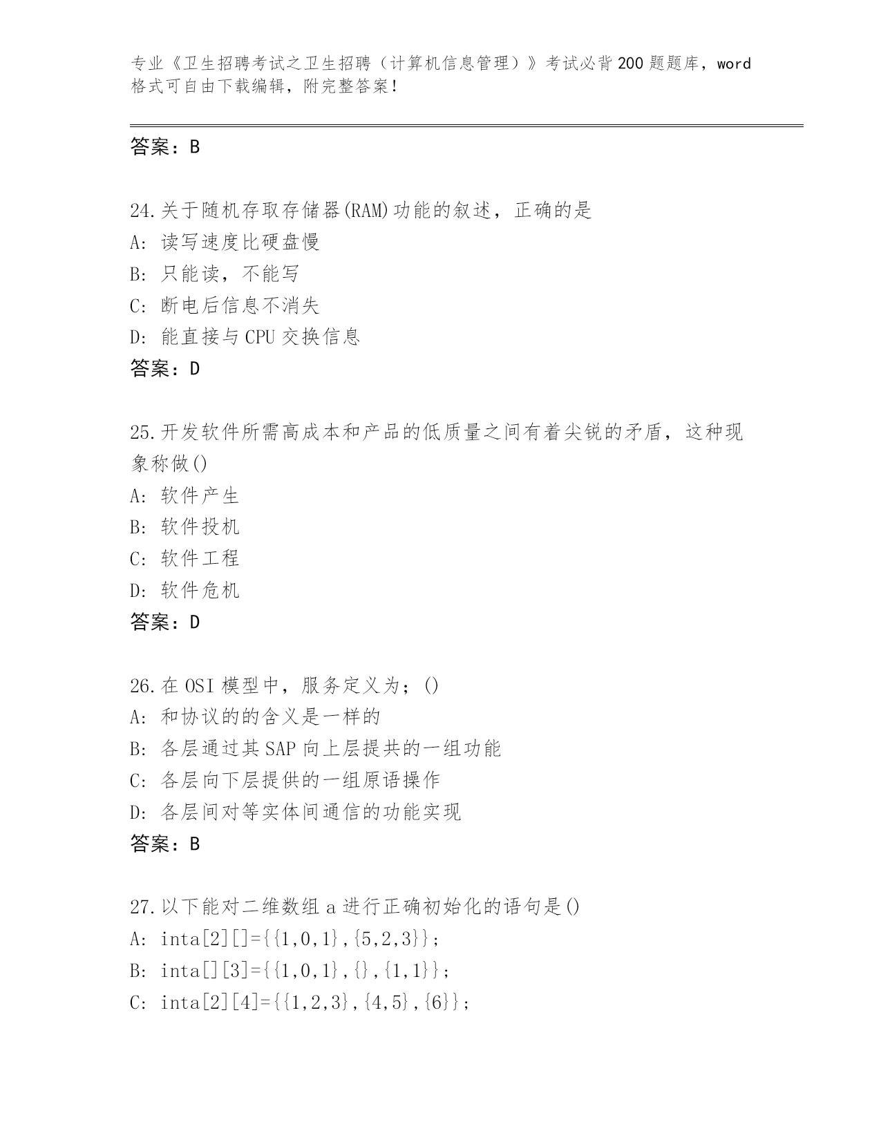 甘肃省2024年《卫生招聘考试之卫生招聘(计算机信息管理)》资格考试必背200题题库大全【培优B卷】