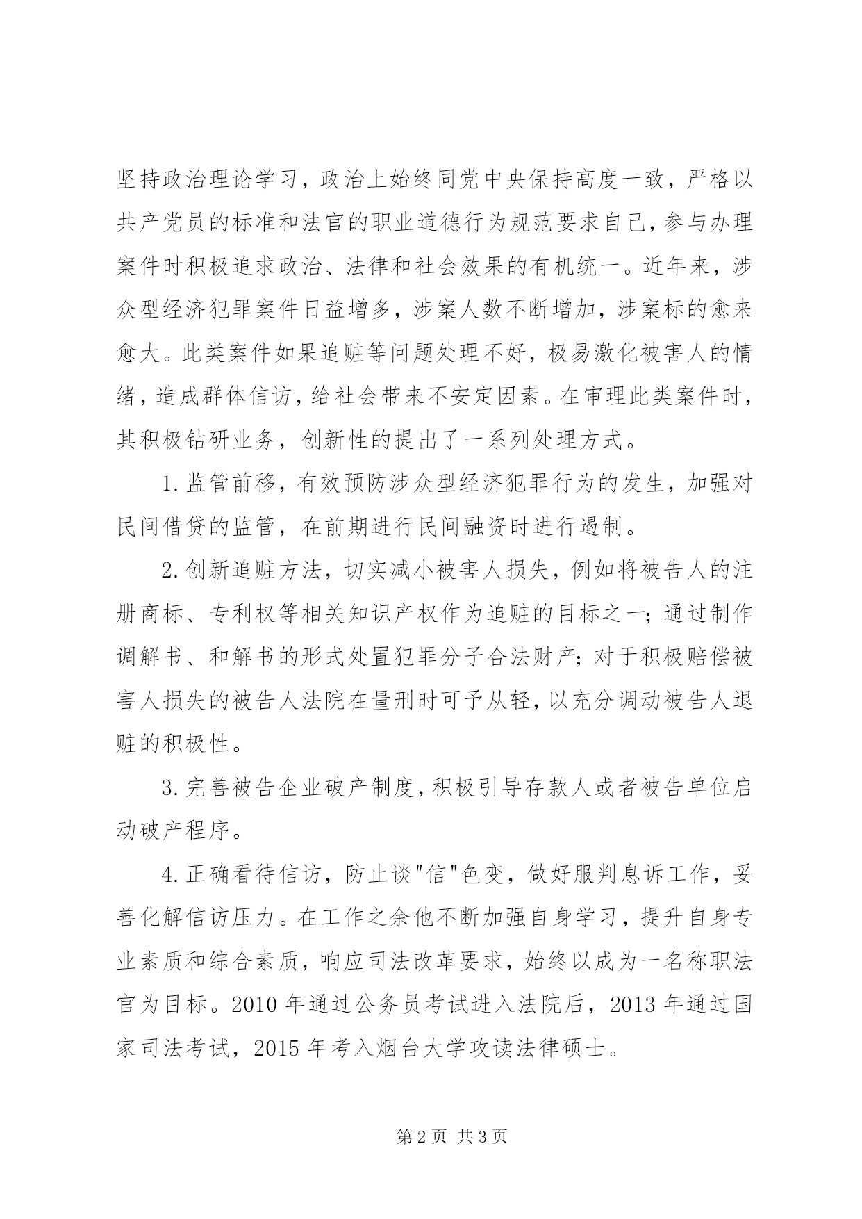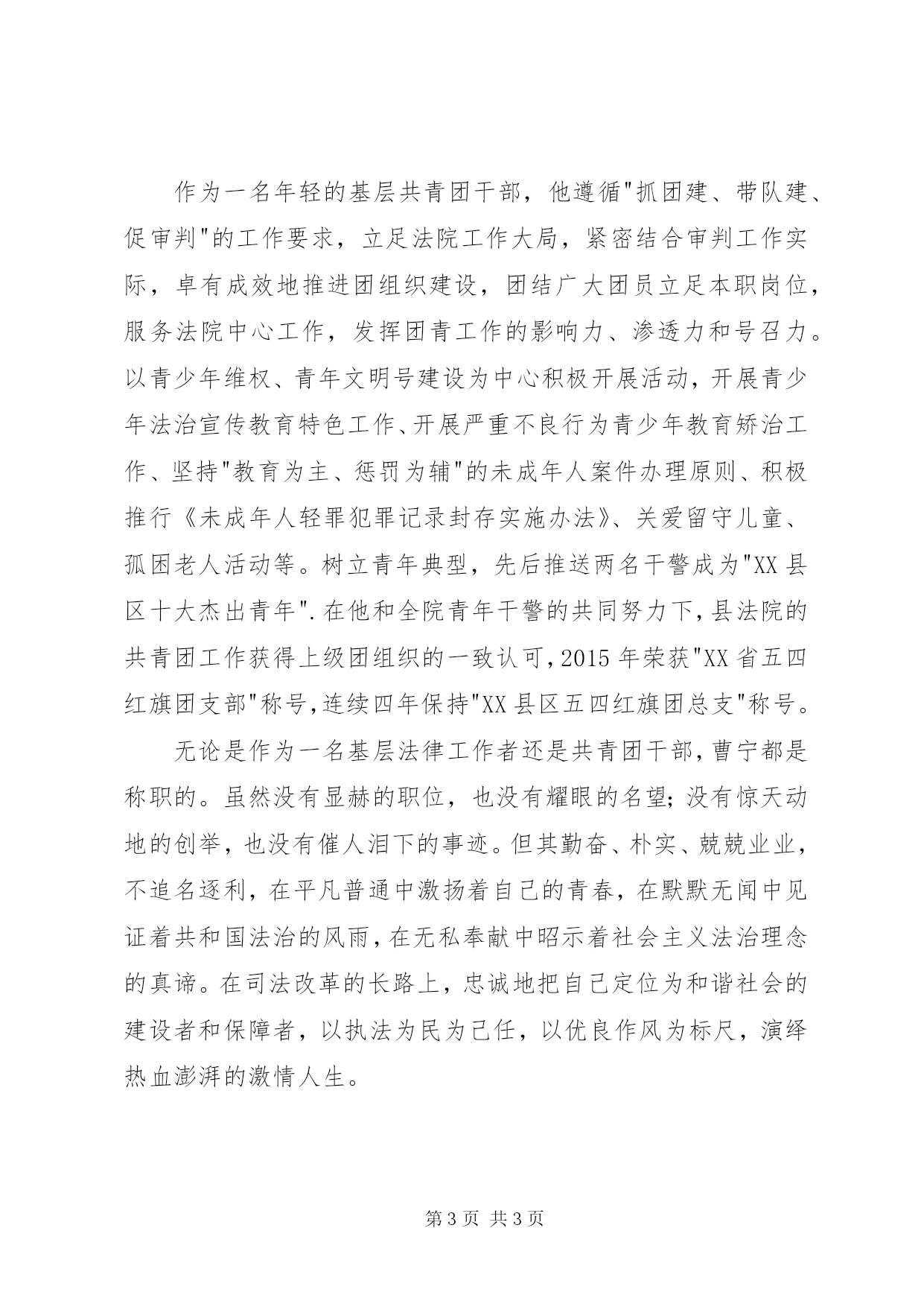 第PAGE\*Arabic\*MERGEFORMAT3页共NUMPAGES\*MERGEFORMAT3页基层司法工作人员事迹材料"齐鲁最美青年"之爱岗敬业好青年候选人曹宁事迹材料曹宁,男,1986年10月出生,中国共产党党员,现任XX县区人民法院团总支书记、刑事审判庭法官助理。该同志自2010年7月在法院工作以来,先后从事信息化建设工作、刑事审判工作、共青团工作。他爱岗敬业、勤勤恳恳、清正廉洁、无私奉献,干一行,爱一行,专一行,不论从事任何工作都能兢兢业业、全身心地投入。其从事信息化工作期间,圆满完成机房改建、内网升级、互联网官方网站、网络oa办公等一系列软硬件建设工作。从事刑事审判工作期间,参与审理刑事案件三百余件,其撰写的案例分析被中院评为优秀案例、入选XX县区人民法院十佳案例、撰写的五十余篇调研宣传文章在《检察日报》、《法治经济观察》、《齐鲁晚报》等刊物发表、参与审理的案件曾被cctv社会与法栏目、齐鲁电视台、山东生活频道等多家单位宣传报导。2013年任XX县区人民法院团总支书记以来,带领青年干警热爱本职、乐于奉献、创新发展、与时俱进,建立了一支"忠于法律、热爱法院、甘为法官"的高素质青年法官队伍,以青年法官为主体的少年家事法庭荣获"国家级优秀青少年维权岗"、孔村法庭荣获"省级青年文明号".作为一名基层司法工作人员,他热爱本职,忘我工作,牢固树立大局意识、公正意识、效率意识、服务意识。在工作中始终坚持政治理论学习,政治上始终同党中央保持高度一致,严格以共产党员的标准和法官的职业道德行为规范要求自己,参与办理案件时积极追求政治、法律和社会效果的有机统一。近年来,涉众型经济犯罪案件日益增多,涉案人数不断增加,涉案标的愈来愈大。此类案件如果追赃等问题处理不好,极易激化被害人的情绪,造成群体信访,给社会带来不安定因素。在审理此类案件时,其积极钻研业务,创新性的提出了一系列处理方式。1.监管前移,有效预防涉众型经济犯罪行为的发生,加强对民间借贷的监管,在前期进行民间融资时进行遏制。2.创新追赃方法,切实减小被害人损失,例如将被告人的注册商标、专利权等相关知识产权作为追赃的目标之一;通过制作调解书、和解书的形式处置犯罪分子合法财产;对于积极赔偿被害人损失的被告人法院在量刑时可予从轻,以充分调动被告人退赃的积极性。3.完善被告企业破产制度,积极引导存款人或者被告单位启动破产程序。4.正确看待信访,防止谈"信"色变,做好服判息诉工作,妥善化解信访压力。在工作之余他不断加强自身学习,提升自身专业素质和综合素质,响应司法改革要求,始终以成为一名称职法官为目标。2010年通过公务员考试进入法院后,2013年通过国家司法考试,2015年考入烟台大学攻读法律硕士。作为一名年轻的基层共青团干部,他遵循"抓团建、带队建、促审判"的工作要求,立足法院工作大局,紧密结合审判工作实际,卓有成效地推进团组织建设,团结广大团员立足本职岗位,服务法院中心工作,发挥团青工作的影响力、渗透力和号召力。以青少年维权、青年文明号建设为中心积极开展活动,开展青少年法治宣传教育特色工作、开展严重不良行为青少年教育矫治工作、坚持"教育为主、惩罚为辅"的未成年人案件办理原则、积极推行《未成年人轻罪犯罪记录封存实施办法》、关爱留守儿童、孤困老人活动等。树立青年典型,先后推送两名干警成为"XX县区十大杰出青年".在他和全院青年干警的共同努力下,县法院的共青团工作获得上级团组织的一致认可,2015年荣获"XX省五四红旗团支部"称号,连续四年保持"XX县区五四红旗团总支"称号。无论是作为一名基层法律工作者还是共青团干部,曹宁都是称职的。虽然没有显赫的职位,也没有耀眼的名望;没有惊天动地的创举,也没有催人泪下的事迹。但其勤奋、朴实、兢兢业业,不追名逐利,在平凡普通中激扬着自己的青春,在默默无闻中见证着共和国法治的风雨,在无私奉献中昭示着社会主义法治理念的真谛。在司法改革的长路上,忠诚地把自己定位为和谐社会的建设者和保障者,以执法为民为己任,以优良作风为标尺,演绎热血澎湃的激情人生。