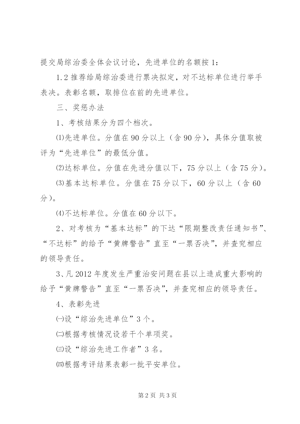 第PAGE\*Arabic\*MERGEFORMAT3页共NUMPAGES\*MERGEFORMAT3页交通局社会治理考核方案2012年度为考核交通系统社会综合治理目标管理完成情况,总结、表彰、查找不足,进一步推动交通系统社会治安综合治理工作。现将《2012年交通系统社会治安综合治理工作要点》和《2012年度县交通局社会治安综合治理责任书》及下发一系列相关社会治安综合治理文件为主要依据,特制订考核方案。一、考核原则1、坚持实事求是、全面衡量,实行考核环节公开、公正、公平的原则。2、统一实施、划块分类考核,实行交叉分散与集中审核相结合的原则。3、尊重事实、量化目标分值,实行定量与定性相结合的原则。4、突出重点、体现职能特色,实行年终考核与职能部门年度工作考核相结合的原则。5、客观公正、列出奖惩对象,实行交通局综治办集中讨论与交通局综治委会议审定相结合的原则。二、考核方法1、由局综治委牵头组织,抽调综治办成员及局股、室、站人员分组深入交通系统各单位考核,对照考核标准进行打分。2、局综治办对定量与定性分进行审核汇总分,将考核情况提交局综治委全体会议讨论,先进单位的名额按1:1.2推荐给局综治委进行票决拟定,对不达标单位进行举手表决。表彰名额,取排位在前的先进单位。三、奖惩办法1、考核结果分为四个档次。⑴先进单位。分值在90分以上(含90分),具体分值取被评为“先进单位”的最低分值。⑵达标单位。分值在先进分值以下,75分以上(含75分)。⑶基本达标单位。分值在75分以下,60分以上(含60分)。⑷不达标单位。分值在60分以下。2、对考核为“基本达标”的下达“限期整改责任通知书”、“不达标”的给予“黄牌警告”直至“一票否决”,并查究相应的领导责任。3、凡2012年度发生严重治安问题在县以上造成重大影响的给予“黄牌警告”直至“一票否决”,并查究相应的领导责任。4、表彰先进㈠设“综治先进单位”3个。㈡根据考核情况设若干个单项奖。㈢设“综治先进工作者”3名。㈣根据考评结果表彰一批平安单位。四、考核内容县直(驻县)单位综治目标管理考核评分标准(100分)。五、组织领导成立交通局综治目标管理考核工作领导小组。为提高目标管理考核的准确性和严肃性,要求:1、局各股、室、站平时涉及数字报表和本年度主要活动进情况应抄送局综治办,各项统计数据从2012年11月21日起至2012年11月20日止。2、考核由局综治考核工作领导小组统一组织,进行考核,并由局综治委负责全面考核工作综合。3、考核时间从12月中旬开始。