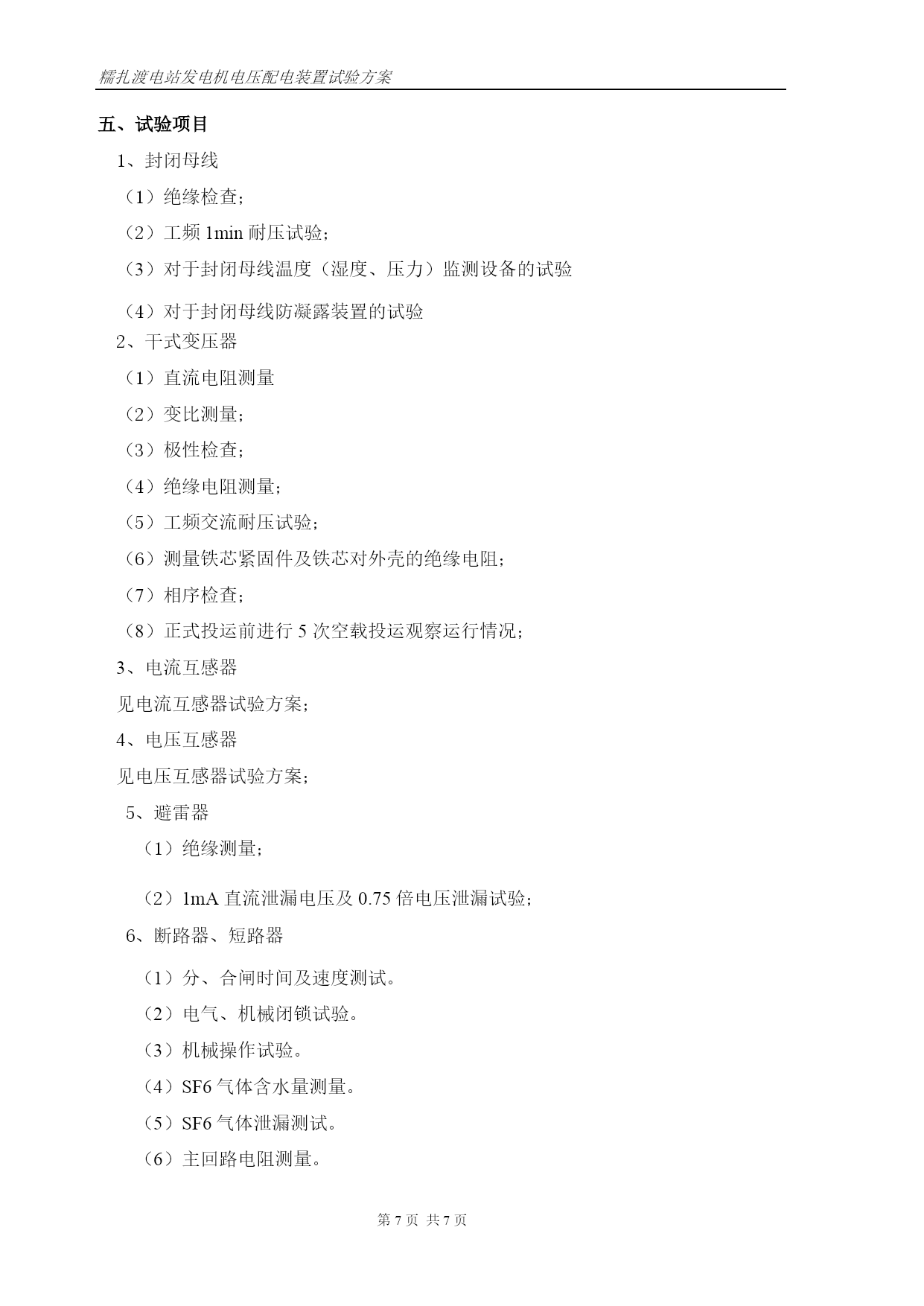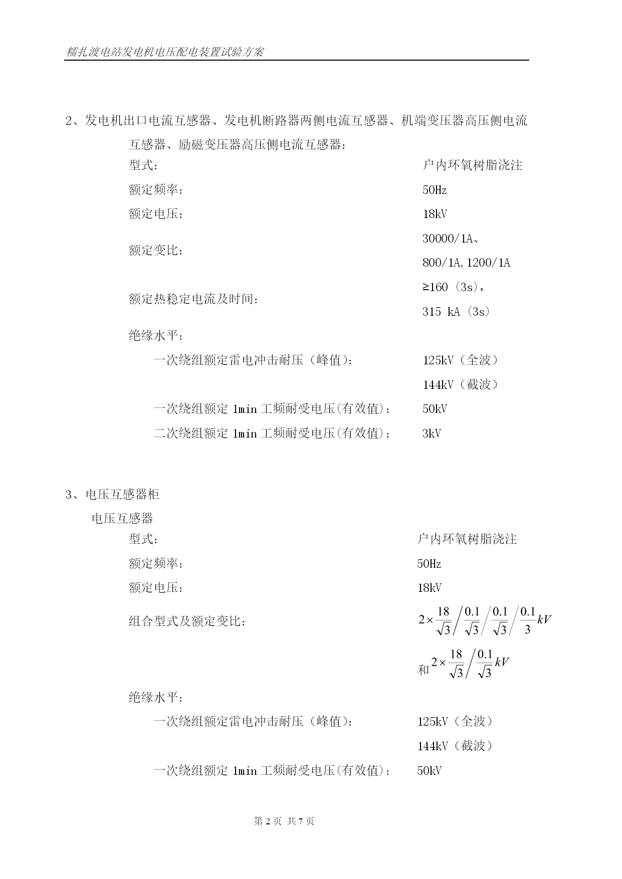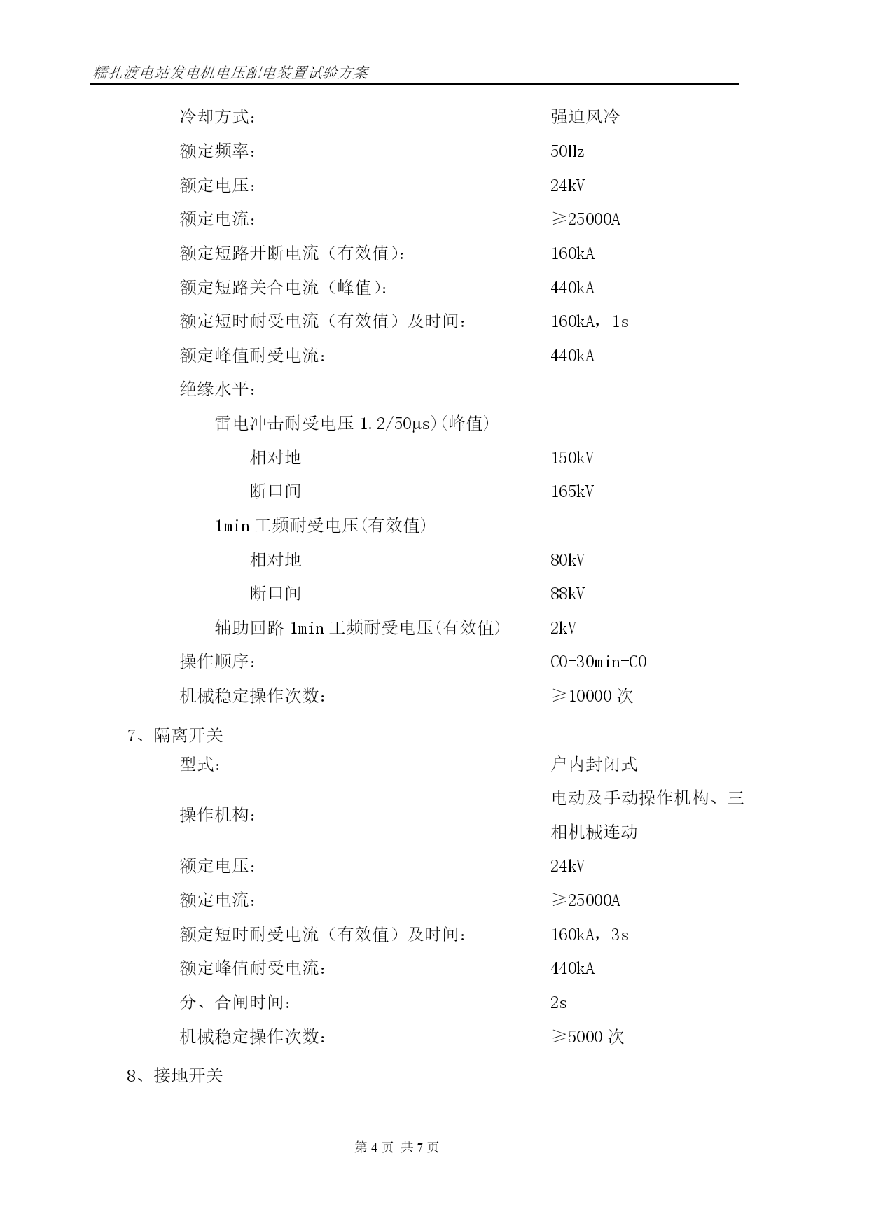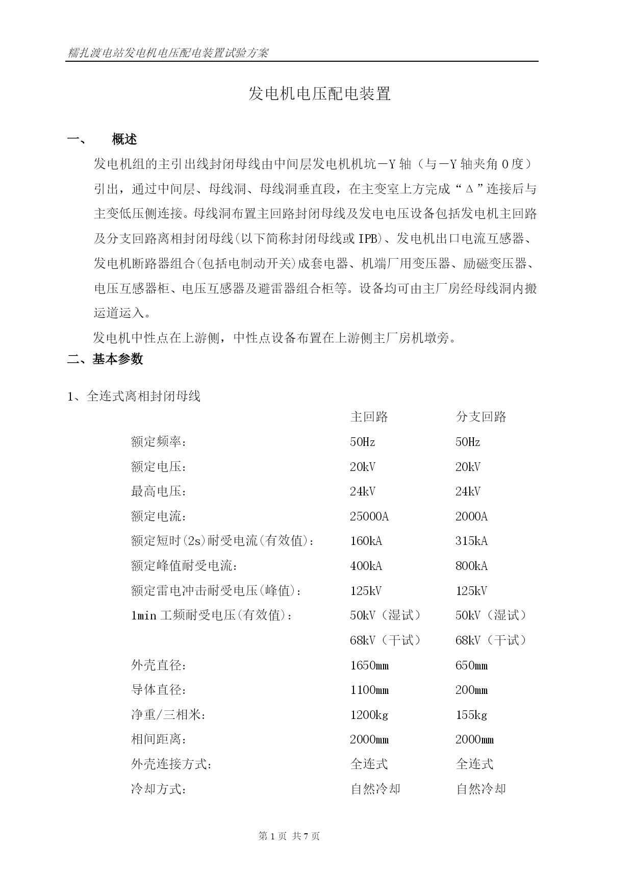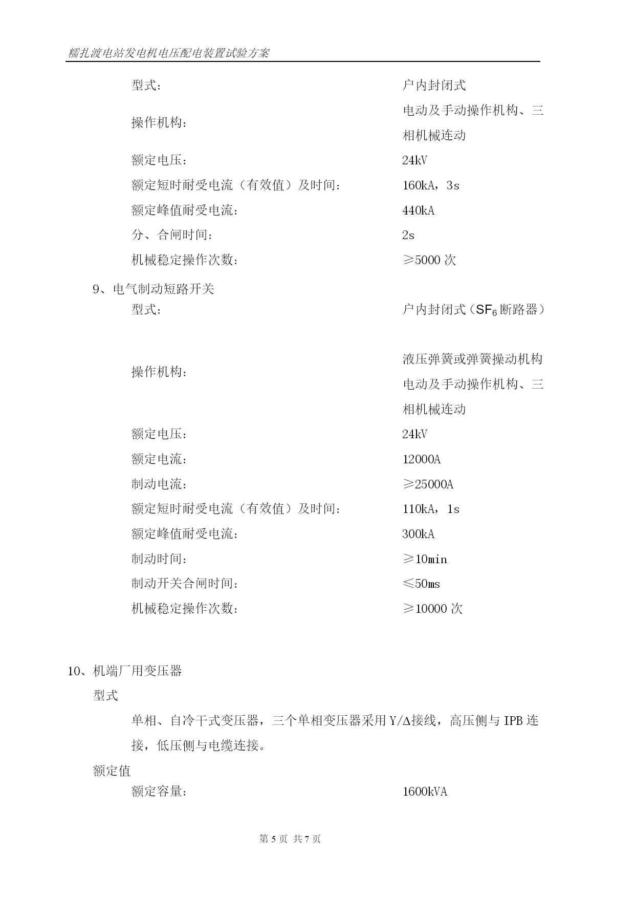 糯扎渡电站发电机电压配电装置试验方案第PAGE13页发电机电压配电装置概述发电机组的主引出线封闭母线由中间层发电机机坑-Y轴(与-Y轴夹角0度)引出,通过中间层、母线洞、母线洞垂直段,在主变室上方完成“Δ”连接后与主变低压侧连接。母线洞布置主回路封闭母线及发电电压设备包括发电机主回路及分支回路离相封闭母线(以下简称封闭母线或IPB)、发电机出口电流互感器、发电机断路器组合(包括电制动开关)成套电器、机端厂用变压器、励磁变压器、电压互感器柜、电压互感器及避雷器组合柜等。设备均可由主厂房经母线洞内搬运道运入。发电机中性点在上游侧,中性点设备布置在上游侧主厂房机墩旁。二、基本参数1、全连式离相封闭母线主回路分支回路额定频率:50Hz50Hz额定电压:20kV20kV最高电压:24kV24kV额定电流:25000A2000A额定短时(2s)耐受电流(有效值):160kA315kA额定峰值耐受电流:400kA800kA额定雷电冲击耐受电压(峰值):125kV125kV1min工频耐受电压(有效值):50kV(湿试)50kV(湿试)68kV(干试)68kV(干试)外壳直径:1650mm650mm导体直径:1100mm200mm净重/三相米:1200kg155kg相间距离:2000mm2000mm外壳连接方式:全连式全连式冷却方式:自然冷却自然冷却2、发电机出口电流互感器、发电机断路器两侧电流互感器、机端变压器高压侧电流互感器、励磁变压器高压侧电流互感器:型式:户内环氧树脂浇注额定频率:50Hz额定电压:18kV额定变比:30000/1A、800/1A,1200/1A额定热稳定电流及时间:≥160(3s),315kA(3s)绝缘水平:一次绕组额定雷电冲击耐压(峰值):125kV(全波)144kV(截波)一次绕组额定1min工频耐受电压(有效值):50kV二次绕组额定1min工频耐受电压(有效值):3kV3、电压互感器柜电压互感器型式:户内环氧树脂浇注额定频率:50Hz额定电压:18kV组合型式及额定变比:和绝缘水平:一次绕组额定雷电冲击耐压(峰值):125kV(全波)144kV(截波)一次绕组额定1min工频耐受电压(有效值):50kV二次绕组额定1min工频耐受电压(有效值):3kV4、电压互感器及避雷器柜电压互感器型式:户内环氧树脂浇注额定频率:50Hz额定电压:18kV额定变比:绝缘水平:一次绕组额定雷电冲击耐压(峰值):125kV(全波)144kV(截波)一次绕组额定1min工频耐受电压(有效值):50kV二次绕组额定1min工频耐受电压(有效值):3kV5、避雷器型式:金属氧化锌额定电压:23kV持续运行电压:18kV直流1mA参考电压:≥31.9kV标称放电电流:5kA标称放电电流下的残压:≤51kV(峰值)陡波冲击残压:≤57.2kV(峰值)操作冲击残压:≤40.8kV(峰值)6、发电机断路器组合成套电器发电机断路器型式:SF6气体绝缘、单相封闭、卧式操作机构:液压弹簧或弹簧操作机构、三相机械联动冷却方式:强迫风冷额定频率:50Hz额定电压:24kV额定电流:≥25000A额定短路开断电流(有效值):160kA额定短路关合电流(峰值):440kA额定短时耐受电流(有效值)及时间:160kA,1s额定峰值耐受电流:440kA绝缘水平:雷电冲击耐受电压1.2/50s)(峰值)相对地150kV断口间165kV1min工频耐受电压(有效值)相对地80kV断口间88kV辅助回路1min工频耐受电压(有效值)2kV操作顺序:CO-30min-CO机械稳定操作次数:≥10000次7、隔离开关型式:户内封闭式操作机构:电动及手动操作机构、三相机械连动额定电压:24kV额定电流:≥25000A额定短时耐受电流(有效值)及时间:160kA,3s额定峰值耐受电流:440kA分、合闸时间:2s机械稳定操作次数:≥5000次8、接地开关型式:户内封闭式操作机构:电动及手动操作机构、三相机械连动额定电压:24kV额定短时耐受电流(有效值)及时间:160kA,3s额定峰值耐受电流:440kA分、合闸时间:2s机械稳定操作次数:≥5000次9、电气制动短路开关型式:户内封闭式(SF6断路器)操作机构:液压弹簧或弹簧操动机构电动及手动操作机构、三相机械连动额定电压:24kV额定电流:12000A制动电流:≥25000A额定短时耐受电流(有效值)及时间:110kA,1s额定峰值耐受电流:300kA制动时间:≥10min制动开关合闸时间:≤50ms机械稳定操作次数:≥10000次10、机端厂用变压器型式单相、自冷干式变压器,三个单相变压器采用Y/接线,高压侧与IPB连接,低压侧与电缆连接。额定