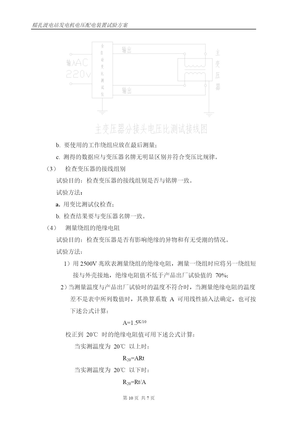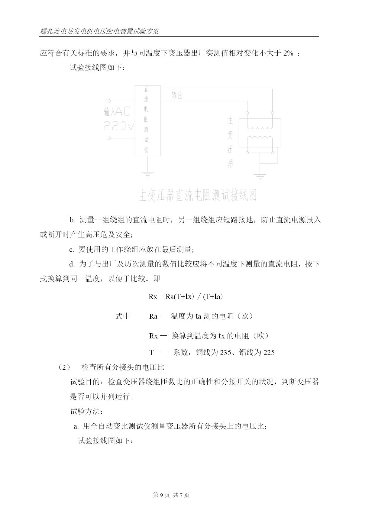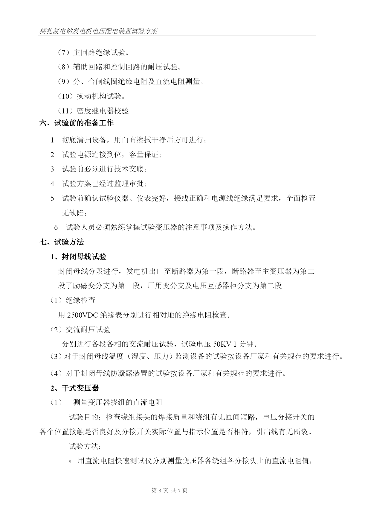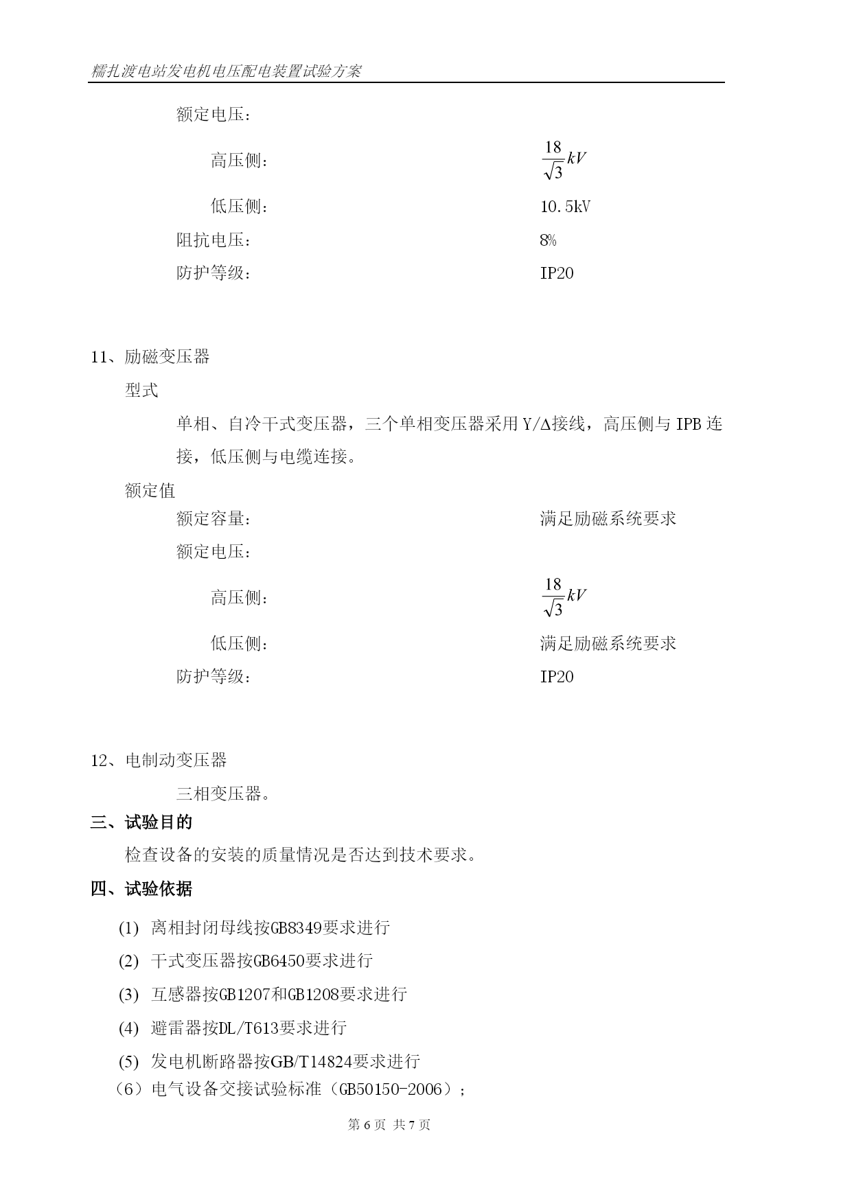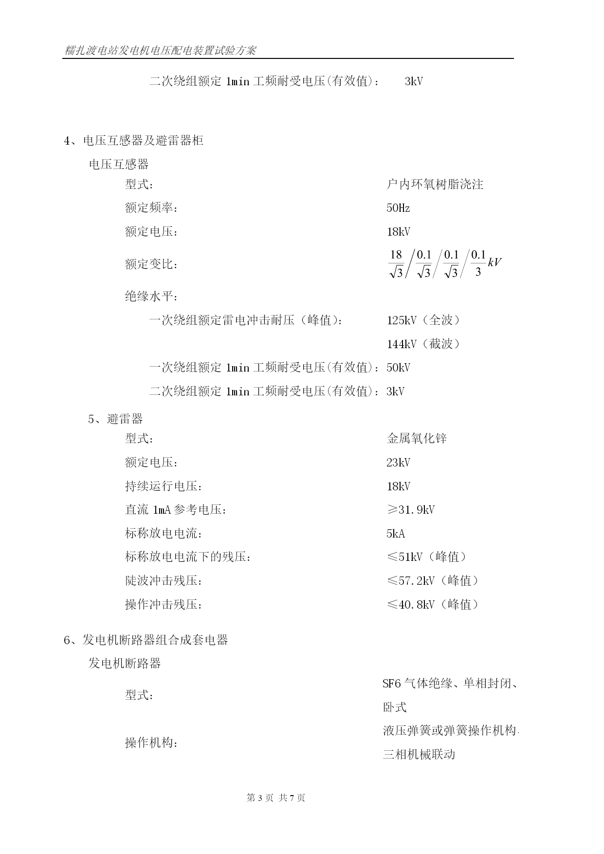 糯扎渡电站发电机电压配电装置试验方案第PAGE13页发电机电压配电装置概述发电机组的主引出线封闭母线由中间层发电机机坑-Y轴(与-Y轴夹角0度)引出,通过中间层、母线洞、母线洞垂直段,在主变室上方完成“Δ”连接后与主变低压侧连接。母线洞布置主回路封闭母线及发电电压设备包括发电机主回路及分支回路离相封闭母线(以下简称封闭母线或IPB)、发电机出口电流互感器、发电机断路器组合(包括电制动开关)成套电器、机端厂用变压器、励磁变压器、电压互感器柜、电压互感器及避雷器组合柜等。设备均可由主厂房经母线洞内搬运道运入。发电机中性点在上游侧,中性点设备布置在上游侧主厂房机墩旁。二、基本参数1、全连式离相封闭母线主回路分支回路额定频率:50Hz50Hz额定电压:20kV20kV最高电压:24kV24kV额定电流:25000A2000A额定短时(2s)耐受电流(有效值):160kA315kA额定峰值耐受电流:400kA800kA额定雷电冲击耐受电压(峰值):125kV125kV1min工频耐受电压(有效值):50kV(湿试)50kV(湿试)68kV(干试)68kV(干试)外壳直径:1650mm650mm导体直径:1100mm200mm净重/三相米:1200kg155kg相间距离:2000mm2000mm外壳连接方式:全连式全连式冷却方式:自然冷却自然冷却2、发电机出口电流互感器、发电机断路器两侧电流互感器、机端变压器高压侧电流互感器、励磁变压器高压侧电流互感器:型式:户内环氧树脂浇注额定频率:50Hz额定电压:18kV额定变比:30000/1A、800/1A,1200/1A额定热稳定电流及时间:≥160(3s),315kA(3s)绝缘水平:一次绕组额定雷电冲击耐压(峰值):125kV(全波)144kV(截波)一次绕组额定1min工频耐受电压(有效值):50kV二次绕组额定1min工频耐受电压(有效值):3kV3、电压互感器柜电压互感器型式:户内环氧树脂浇注额定频率:50Hz额定电压:18kV组合型式及额定变比:和绝缘水平:一次绕组额定雷电冲击耐压(峰值):125kV(全波)144kV(截波)一次绕组额定1min工频耐受电压(有效值):50kV二次绕组额定1min工频耐受电压(有效值):3kV4、电压互感器及避雷器柜电压互感器型式:户内环氧树脂浇注额定频率:50Hz额定电压:18kV额定变比:绝缘水平:一次绕组额定雷电冲击耐压(峰值):125kV(全波)144kV(截波)一次绕组额定1min工频耐受电压(有效值):50kV二次绕组额定1min工频耐受电压(有效值):3kV5、避雷器型式:金属氧化锌额定电压:23kV持续运行电压:18kV直流1mA参考电压:≥31.9kV标称放电电流:5kA标称放电电流下的残压:≤51kV(峰值)陡波冲击残压:≤57.2kV(峰值)操作冲击残压:≤40.8kV(峰值)6、发电机断路器组合成套电器发电机断路器型式:SF6气体绝缘、单相封闭、卧式操作机构:液压弹簧或弹簧操作机构、三相机械联动冷却方式:强迫风冷额定频率:50Hz额定电压:24kV额定电流:≥25000A额定短路开断电流(有效值):160kA额定短路关合电流(峰值):440kA额定短时耐受电流(有效值)及时间:160kA,1s额定峰值耐受电流:440kA绝缘水平:雷电冲击耐受电压1.2/50s)(峰值)相对地150kV断口间165kV1min工频耐受电压(有效值)相对地80kV断口间88kV辅助回路1min工频耐受电压(有效值)2kV操作顺序:CO-30min-CO机械稳定操作次数:≥10000次7、隔离开关型式:户内封闭式操作机构:电动及手动操作机构、三相机械连动额定电压:24kV额定电流:≥25000A额定短时耐受电流(有效值)及时间:160kA,3s额定峰值耐受电流:440kA分、合闸时间:2s机械稳定操作次数:≥5000次8、接地开关型式:户内封闭式操作机构:电动及手动操作机构、三相机械连动额定电压:24kV额定短时耐受电流(有效值)及时间:160kA,3s额定峰值耐受电流:440kA分、合闸时间:2s机械稳定操作次数:≥5000次9、电气制动短路开关型式:户内封闭式(SF6断路器)操作机构:液压弹簧或弹簧操动机构电动及手动操作机构、三相机械连动额定电压:24kV额定电流:12000A制动电流:≥25000A额定短时耐受电流(有效值)及时间:110kA,1s额定峰值耐受电流:300kA制动时间:≥10min制动开关合闸时间:≤50ms机械稳定操作次数:≥10000次10、机端厂用变压器型式单相、自冷干式变压器,三个单相变压器采用Y/接线,高压侧与IPB连接,低压侧与电缆连接。额定