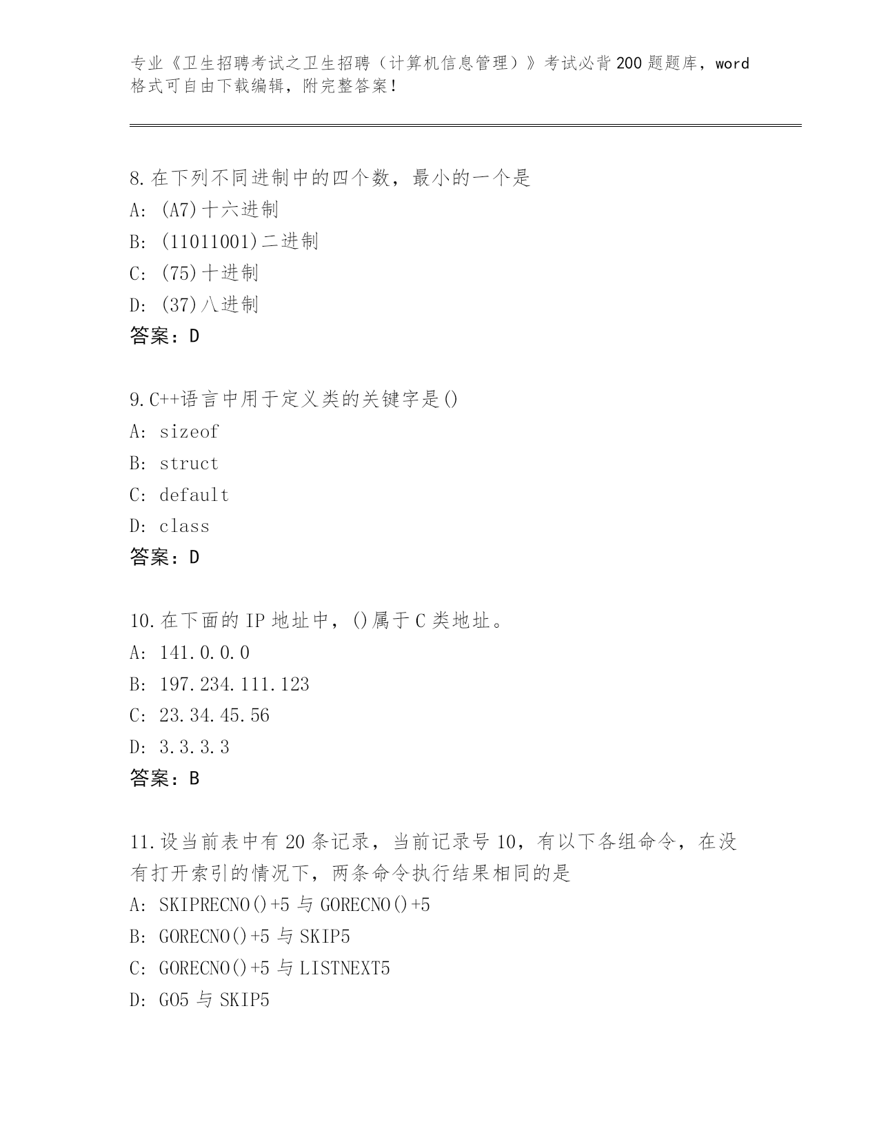 2024年河北省竞秀区《卫生招聘考试之卫生招聘(计算机信息管理)》考试必背200题大全及答案