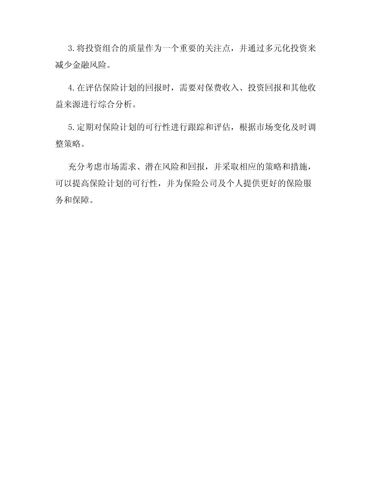 保险可行性分析报告保险可行性分析是评估一项保险计划在实行前后的潜在风险和回报的过程。它对于保险公司、政府部门和个人都是重要的工具,可以帮助他们决定是否购买或提供某种保险。本报告将对保险可行性进行分析,并提供一些有关保险计划的建议。一、市场分析在进行保险可行性分析之前,首先需要对市场进行详细调查和分析。这包括对当前的保险市场和潜在市场的研究。通过了解市场需求、竞争对手和潜在的利润机会,可以为保险计划的可行性提供基础。根据市场调查,我们发现目前市场上存在着不同类型的保险需求,包括人寿保险、车辆保险、财产保险等。对于每一种保险类型,竞争对手较多,但是潜在的市场需求也是相对较大的。因此,从市场的角度来看,保险计划的可行性是有一定基础的。二、风险分析保险行业是一个与风险密切相关的行业。在进行保险可行性分析时,必须充分考虑潜在的风险和挑战。这包括市场风险、操作风险和金融风险等方面。市场风险是指市场需求的波动性和竞争对手的变化。随着市场环境的变化,保险计划的可行性可能会受到一定的影响。操作风险是指在实施保险计划过程中可能面临的各种操作风险,如管理风险、技术风险和法律合规风险等。金融风险是指由于投资组合质量不佳或其他金融因素引起的风险。在进行风险分析时,我们需要充分考虑这些潜在风险,并制定相应的风险管理策略以降低潜在损失。三、收益分析除了考虑潜在的风险外,保险可行性分析还需要评估保险计划可能带来的回报。这包括保费收入、投资回报和其他收益来源。保费收入是保险公司最主要的收入来源。通过对市场需求和价格水平的分析,我们可以预测保费收入的潜力。同时,投资回报也是一个重要的收益来源。保险公司通常会通过投资来增加其资本回报率。此外,其他收益来源还包括保险服务费、政府补贴等。通过对这些收益来源的评估,可以确定保险计划的潜在回报,并为保险决策提供参考。四、建议基于对保险可行性的分析,我们提出以下建议:1.在进入保险市场之前,应对市场进行充分调查和研究。了解市场需求、竞争对手和潜在机会。2.在制定保险计划时,需对潜在风险进行详细评估,并制定相应的风险管理策略。3.将投资组合的质量作为一个重要的关注点,并通过多元化投资来减少金融风险。4.在评估保险计划的回报时,需要对保费收入、投资回报和其他收益来源进行综合分析。5.定期对保险计划的可行性进行跟踪和评估,根据市场变化及时调整策略。充分考虑市场需求、潜在风险和回报,并采取相应的策略和措施,可以提高保险计划的可行性,并为保险公司及个人提供更好的保险服务和保障。