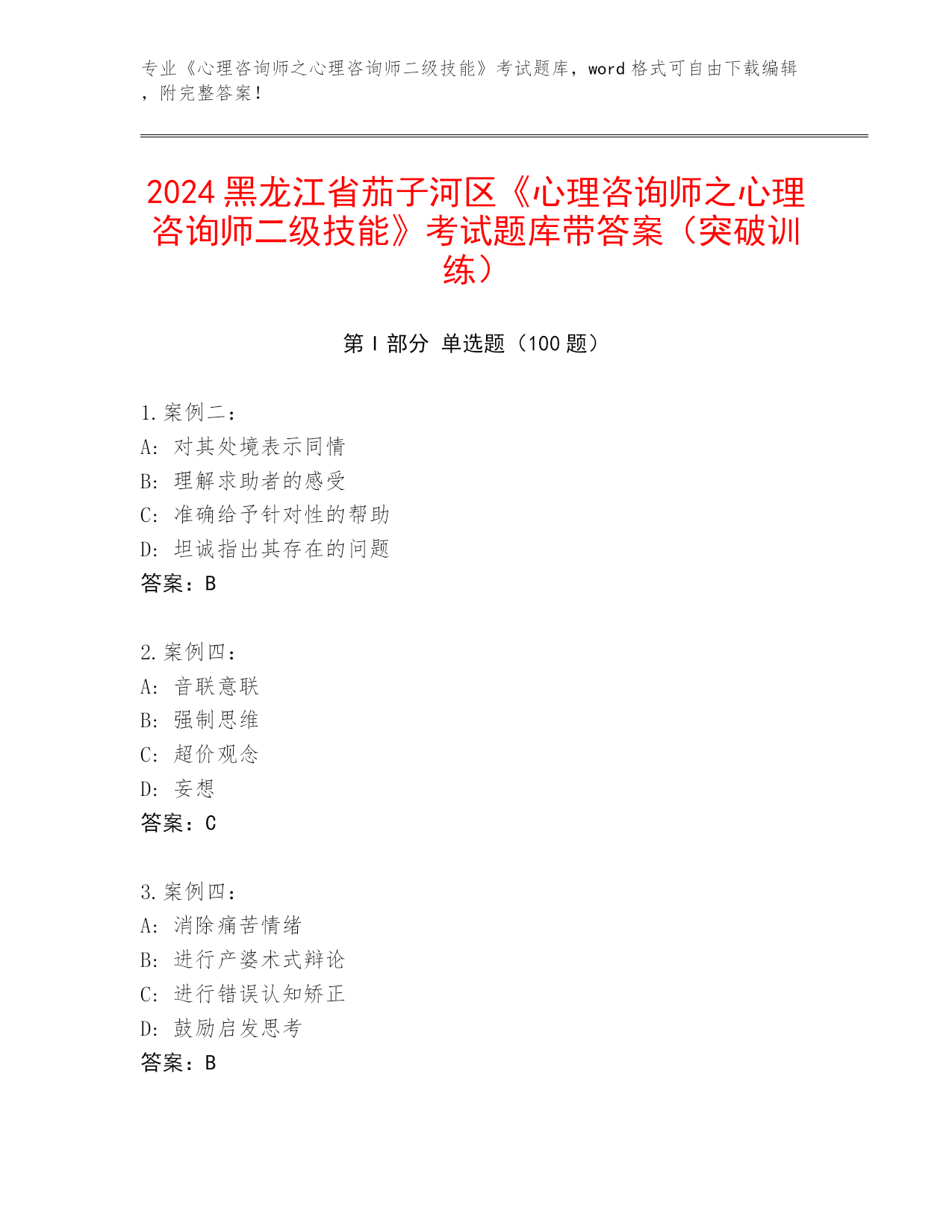 2024年黑龙江省萨尔图区《心理咨询师之心理咨询师二级技能》考试通关秘籍题库带答案(突破训练)