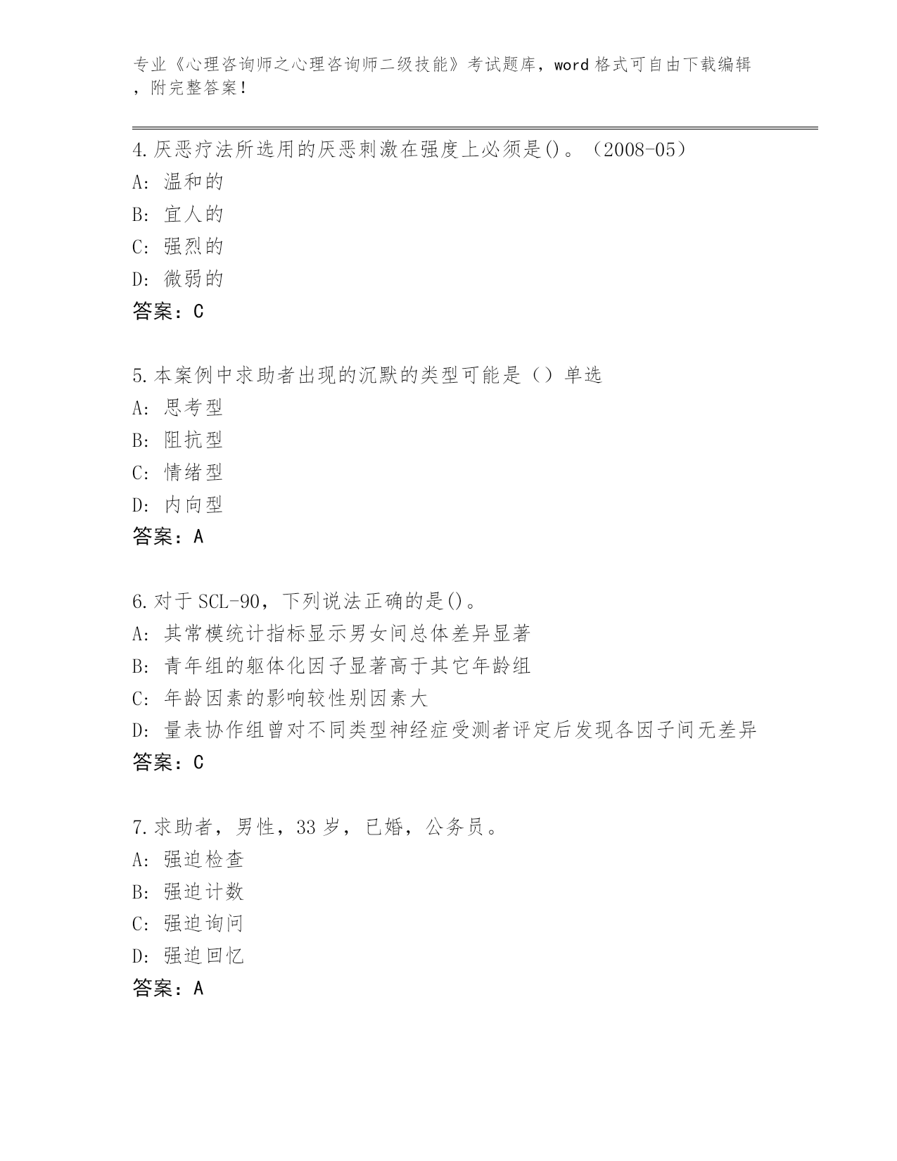 浙江省2024年《心理咨询师之心理咨询师二级技能》考试必刷200题带答案(突破训练)