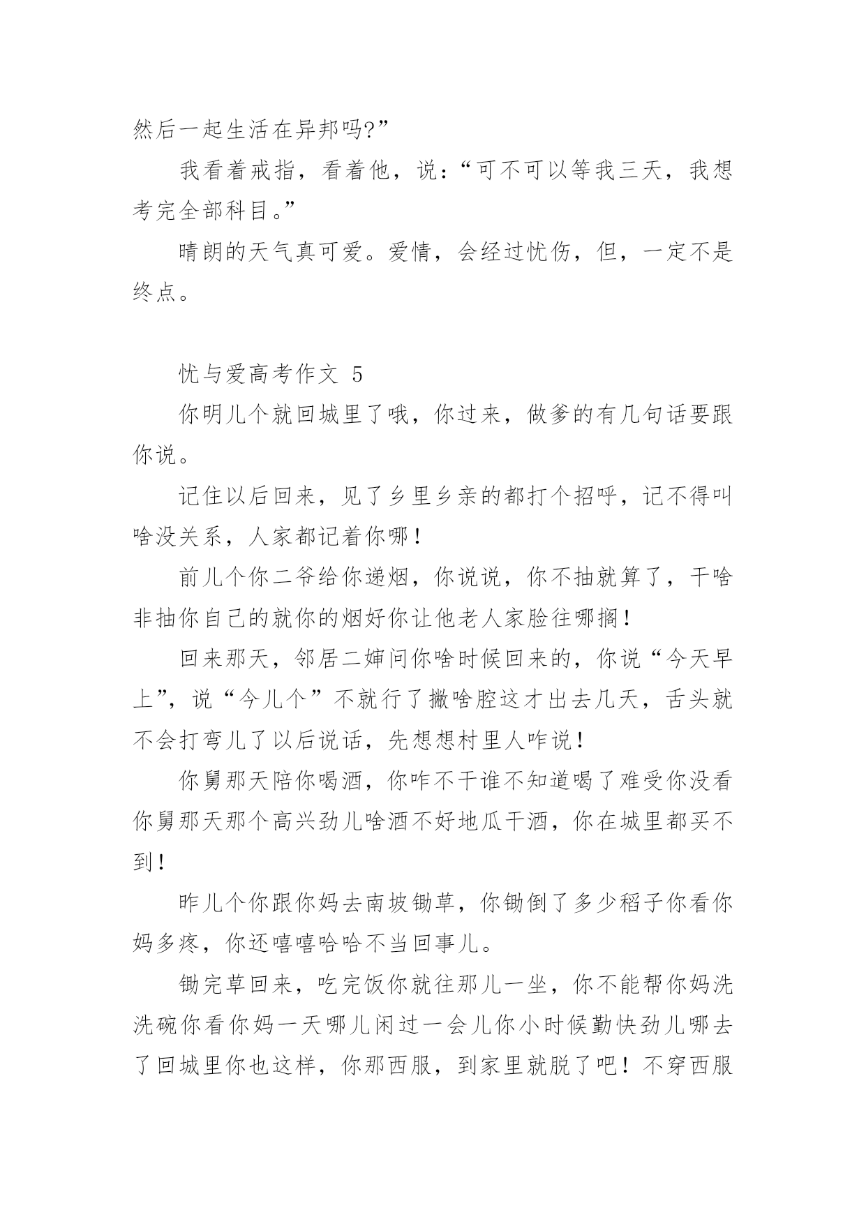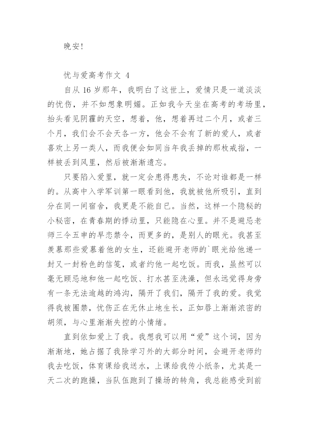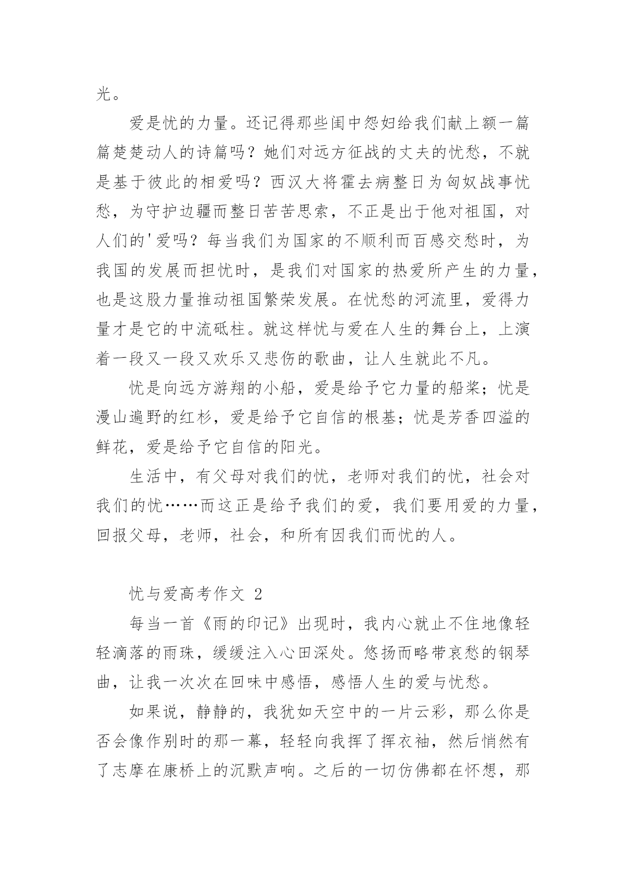 忧与爱高考作文忧与爱高考作文(通用40篇)在平平淡淡的学习、工作、生活中,大家对作文都再熟悉不过了吧,作文根据写作时限的不同可以分为限时作文和非限时作文。相信很多朋友都对写作文感到非常苦恼吧,以下是小编收集整理的忧与爱高考作文,希望对大家有所帮助。忧与爱高考作文1傲视苍穹的雄鹰爱他的小鹰,但她又为小鹰不能展翅翱翔而忧:绿荫遮天的大树爱他的小树,但她又为小树不能茁壮成长而忧;雄心壮志的赤子爱他的祖国,但他又为不能为祖国奉献自我而忧。是啊,每当我们产生爱时,又不由自主的产生一份忧愁,忧与爱总是这样在我们人生中去留,总是让我们在忧与爱的海洋里含着苦水快乐的游翔。忧是爱的表现。《游子吟》中的慈母面对即将远游的游子忧愁无比,担心游子在外的生活,这不就是母爱纯真的表现吗?诗人艾青说过“为什么我的眼里常含泪水,因为我爱这片土地爱得深沉”,诗人面对故土,面对祖国不禁流下了爱的泪水,不禁的忧于这片生他养他的热土,就是他对此爱的流露啊。每一次我们忧愁眼前,忧愁生活是,不正是对生活的无比热爱吗?如果我们不热爱生活,就不会对它有一丝的忧愁,而是游戏人生,得过且过,终将碌碌为无。忧与爱总是这样在人生中闪烁,我们的生活也因由忧与爱而熠熠闪光。爱是忧的力量。还记得那些闺中怨妇给我们献上额一篇篇楚楚动人的诗篇吗?她们对远方征战的丈夫的忧愁,不就是基于彼此的相爱吗?西汉大将霍去病整日为匈奴战事忧愁,为守护边疆而整日苦苦思索,不正是出于他对祖国,对人们的'爱吗?每当我们为国家的不顺利而百感交愁时,为我国的发展而担忧时,是我们对国家的热爱所产生的力量,也是这股力量推动祖国繁荣发展。在忧愁的河流里,爱得力量才是它的中流砥柱。就这样忧与爱在人生的舞台上,上演着一段又一段又欢乐又悲伤的歌曲,让人生就此不凡。忧是向远方游翔的小船,爱是给予它力量的船桨;忧是漫山遍野的红杉,爱是给予它自信的根基;忧是芳香四溢的鲜花,爱是给予它自信的阳光。生活中,有父母对我们的忧,老师对我们的忧,社会对我们的忧……而这正是给予我们的爱,我们要用爱的力量,回报父母,老师,社会,和所有因我们而忧的人。忧与爱高考作文2每当一首《雨的印记》出现时,我内心就止不住地像轻轻滴落的雨珠,缓缓注入心田深处。悠扬而略带哀愁的钢琴曲,让我一次次在回味中感悟,感悟人生的爱与忧愁。如果说,静静的,我犹如天空中的一片云彩,那么你是否会像作别时的那一幕,轻轻向我挥了挥衣袖,然后悄然有了志摩在康桥上的沉默声响。之后的一切仿佛都在怀想,那年,王勃在送杜少府去四川任职的时候,一气写下了“海内存知己,天涯若比邻”,只要还有这么一个知己,就算是天涯海角,仍然就像在身边一样的温暖。又是那天,王维在《送元二使安西》时,写道“劝君更尽一杯酒,西出阳关无故人”,一旦离去,友人走出阳关,便再无友人这样一人,能够听自己弹琴,能够与自己一起和诗。淡淡地,淡淡地,都在瞬间定格,凝聚,就像什么事都从未发生,却一切早已刻骨铭心,这就是份爱。如果说,静静的,我犹如一个丁香般得女子,淡然而哀愁地走在雨巷里,那么你是否也会和我这般地彳亍,徘徊,在这寂静的雨巷。戴望舒的《雨巷》里,始终有个关于忧与爱的影子。就像莎士比亚戏剧《罗密欧与朱丽叶》,“我承认天底下再没有比爱情的惩罚更痛苦的,也没有比服侍它更快乐的'事了。”虽然是个悲剧,但是却不得不承认两人的爱恋深沉,明明爱得海枯石烂,但却逃不过悲剧的命运。我停滞在那里,不能向前,感动着悲伤的结局,却为爱能超越一切,感恩于心:没有忧,哪能体会到爱,没有感悟爱,同样也寻找不到忧愁。不知是什么时候起,我开始喜欢上了这些首淡淡忧伤的钢琴曲,每当没人的时候,我就会悄悄聆听这些曲子。它们让我一次次抚平了心灵的创伤,然后再一遍遍地让我感受到了来自身边那些平凡而伟大的爱。我不能说钢琴曲是能够疗伤的神曲,但是每次接近时,总会感觉人生因为有过一些忧愁,有过一些缺憾才画上了一个完美的句号。亦不知什么时候起,我开始体会到了父母那些唠叨话语,不是简单的“陈词滥调”时,而是那些肺腑之言,甚至我都烂熟于心时,我已经忙碌奔波于学业工作生活之间了。一席光阴间,我已经告别了金色的童年,告别了花一样的季节,又再青春落幕的时候,当我身处外地,无尽的压力袭来,我终于体会到那不是,不是枯燥的“只字片语”,那是带着真情真爱的话语,句句暖心。听着电话那头,感到无人援助的我,顿时变得有了动力,泪水再次喷涌而出。生命中的每一份爱都是珍贵的,但是每一份忧也是同样珍贵的。因为它们,让爱更显深刻。所以不要太过害怕忧虑,命运都是公平的,忧虑与爱也只是暂时的,一切都是为了我们更好地生活。忧与爱高考作文3今年的高考语文题目“忧与爱”,我觉得是一个和好的题目,可是如果让我现在写一篇高考文章,我一定词穷。呵呵,就像张大月说的,高三时,我们还知道三角函数,还记得好多单词,还喜欢红
