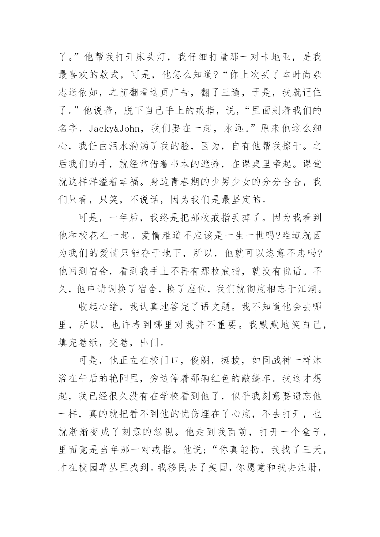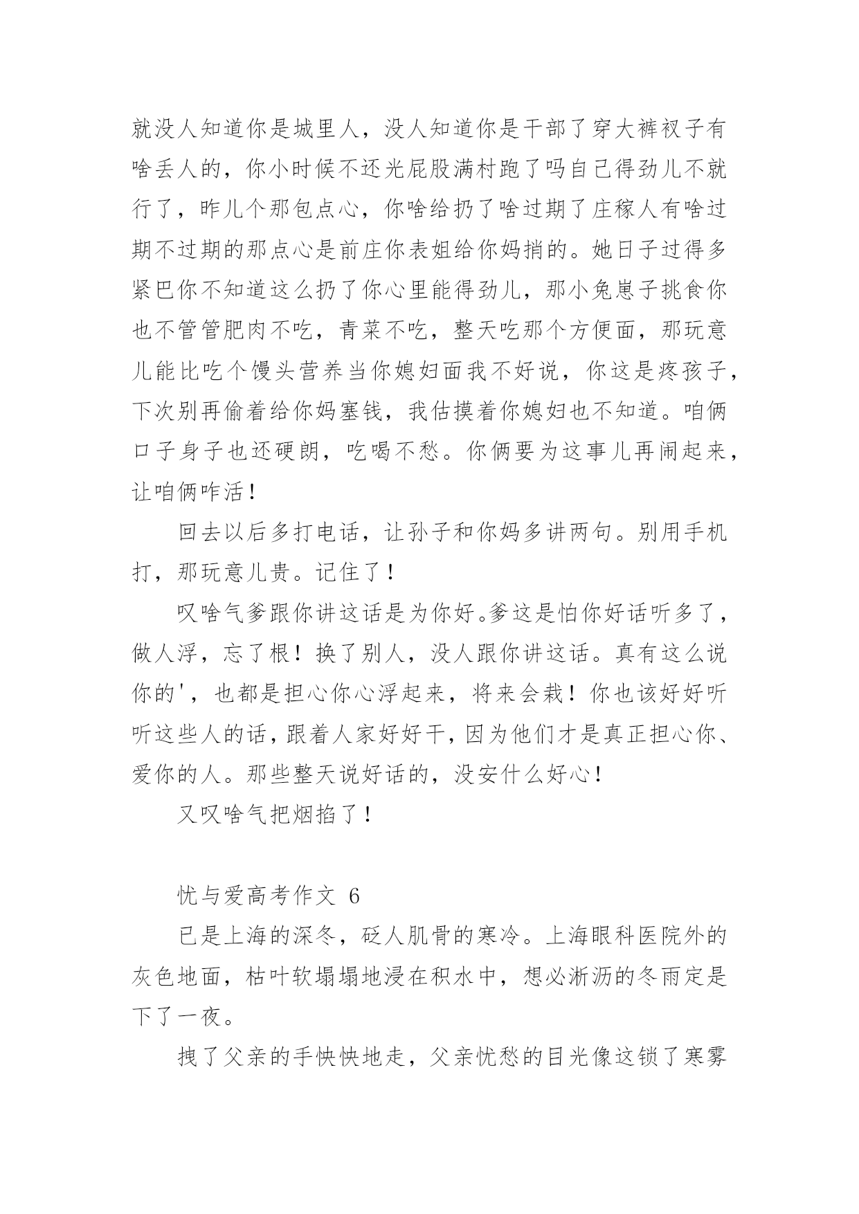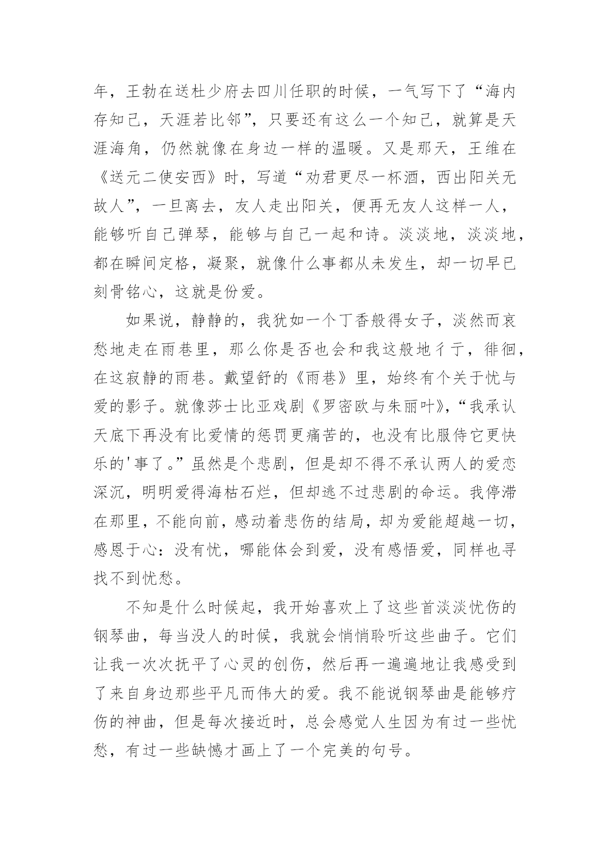 忧与爱高考作文忧与爱高考作文(通用40篇)在平平淡淡的学习、工作、生活中,大家对作文都再熟悉不过了吧,作文根据写作时限的不同可以分为限时作文和非限时作文。相信很多朋友都对写作文感到非常苦恼吧,以下是小编收集整理的忧与爱高考作文,希望对大家有所帮助。忧与爱高考作文1傲视苍穹的雄鹰爱他的小鹰,但她又为小鹰不能展翅翱翔而忧:绿荫遮天的大树爱他的小树,但她又为小树不能茁壮成长而忧;雄心壮志的赤子爱他的祖国,但他又为不能为祖国奉献自我而忧。是啊,每当我们产生爱时,又不由自主的产生一份忧愁,忧与爱总是这样在我们人生中去留,总是让我们在忧与爱的海洋里含着苦水快乐的游翔。忧是爱的表现。《游子吟》中的慈母面对即将远游的游子忧愁无比,担心游子在外的生活,这不就是母爱纯真的表现吗?诗人艾青说过“为什么我的眼里常含泪水,因为我爱这片土地爱得深沉”,诗人面对故土,面对祖国不禁流下了爱的泪水,不禁的忧于这片生他养他的热土,就是他对此爱的流露啊。每一次我们忧愁眼前,忧愁生活是,不正是对生活的无比热爱吗?如果我们不热爱生活,就不会对它有一丝的忧愁,而是游戏人生,得过且过,终将碌碌为无。忧与爱总是这样在人生中闪烁,我们的生活也因由忧与爱而熠熠闪光。爱是忧的力量。还记得那些闺中怨妇给我们献上额一篇篇楚楚动人的诗篇吗?她们对远方征战的丈夫的忧愁,不就是基于彼此的相爱吗?西汉大将霍去病整日为匈奴战事忧愁,为守护边疆而整日苦苦思索,不正是出于他对祖国,对人们的'爱吗?每当我们为国家的不顺利而百感交愁时,为我国的发展而担忧时,是我们对国家的热爱所产生的力量,也是这股力量推动祖国繁荣发展。在忧愁的河流里,爱得力量才是它的中流砥柱。就这样忧与爱在人生的舞台上,上演着一段又一段又欢乐又悲伤的歌曲,让人生就此不凡。忧是向远方游翔的小船,爱是给予它力量的船桨;忧是漫山遍野的红杉,爱是给予它自信的根基;忧是芳香四溢的鲜花,爱是给予它自信的阳光。生活中,有父母对我们的忧,老师对我们的忧,社会对我们的忧……而这正是给予我们的爱,我们要用爱的力量,回报父母,老师,社会,和所有因我们而忧的人。忧与爱高考作文2每当一首《雨的印记》出现时,我内心就止不住地像轻轻滴落的雨珠,缓缓注入心田深处。悠扬而略带哀愁的钢琴曲,让我一次次在回味中感悟,感悟人生的爱与忧愁。如果说,静静的,我犹如天空中的一片云彩,那么你是否会像作别时的那一幕,轻轻向我挥了挥衣袖,然后悄然有了志摩在康桥上的沉默声响。之后的一切仿佛都在怀想,那年,王勃在送杜少府去四川任职的时候,一气写下了“海内存知己,天涯若比邻”,只要还有这么一个知己,就算是天涯海角,仍然就像在身边一样的温暖。又是那天,王维在《送元二使安西》时,写道“劝君更尽一杯酒,西出阳关无故人”,一旦离去,友人走出阳关,便再无友人这样一人,能够听自己弹琴,能够与自己一起和诗。淡淡地,淡淡地,都在瞬间定格,凝聚,就像什么事都从未发生,却一切早已刻骨铭心,这就是份爱。如果说,静静的,我犹如一个丁香般得女子,淡然而哀愁地走在雨巷里,那么你是否也会和我这般地彳亍,徘徊,在这寂静的雨巷。戴望舒的《雨巷》里,始终有个关于忧与爱的影子。就像莎士比亚戏剧《罗密欧与朱丽叶》,“我承认天底下再没有比爱情的惩罚更痛苦的,也没有比服侍它更快乐的'事了。”虽然是个悲剧,但是却不得不承认两人的爱恋深沉,明明爱得海枯石烂,但却逃不过悲剧的命运。我停滞在那里,不能向前,感动着悲伤的结局,却为爱能超越一切,感恩于心:没有忧,哪能体会到爱,没有感悟爱,同样也寻找不到忧愁。不知是什么时候起,我开始喜欢上了这些首淡淡忧伤的钢琴曲,每当没人的时候,我就会悄悄聆听这些曲子。它们让我一次次抚平了心灵的创伤,然后再一遍遍地让我感受到了来自身边那些平凡而伟大的爱。我不能说钢琴曲是能够疗伤的神曲,但是每次接近时,总会感觉人生因为有过一些忧愁,有过一些缺憾才画上了一个完美的句号。亦不知什么时候起,我开始体会到了父母那些唠叨话语,不是简单的“陈词滥调”时,而是那些肺腑之言,甚至我都烂熟于心时,我已经忙碌奔波于学业工作生活之间了。一席光阴间,我已经告别了金色的童年,告别了花一样的季节,又再青春落幕的时候,当我身处外地,无尽的压力袭来,我终于体会到那不是,不是枯燥的“只字片语”,那是带着真情真爱的话语,句句暖心。听着电话那头,感到无人援助的我,顿时变得有了动力,泪水再次喷涌而出。生命中的每一份爱都是珍贵的,但是每一份忧也是同样珍贵的。因为它们,让爱更显深刻。所以不要太过害怕忧虑,命运都是公平的,忧虑与爱也只是暂时的,一切都是为了我们更好地生活。忧与爱高考作文3今年的高考语文题目“忧与爱”,我觉得是一个和好的题目,可是如果让我现在写一篇高考文章,我一定词穷。呵呵,就像张大月说的,高三时,我们还知道三角函数,还记得好多单词,还喜欢红