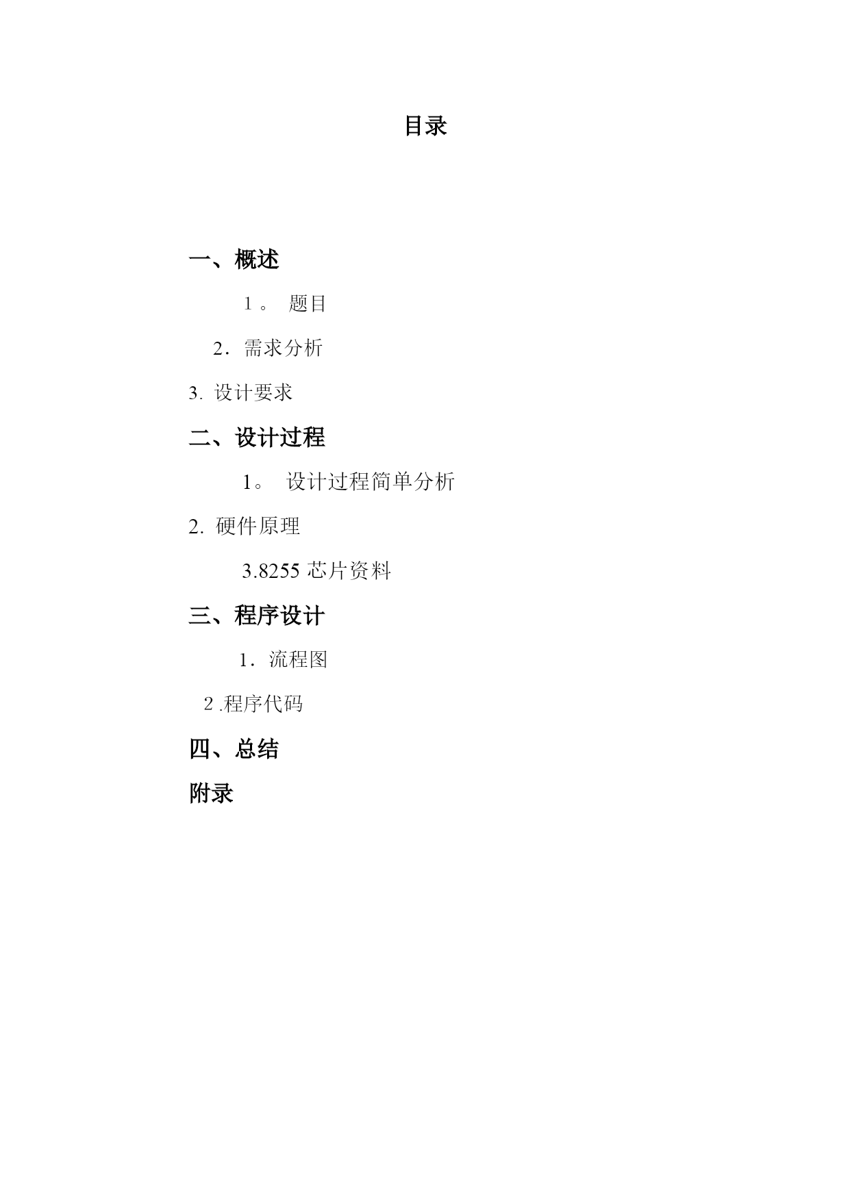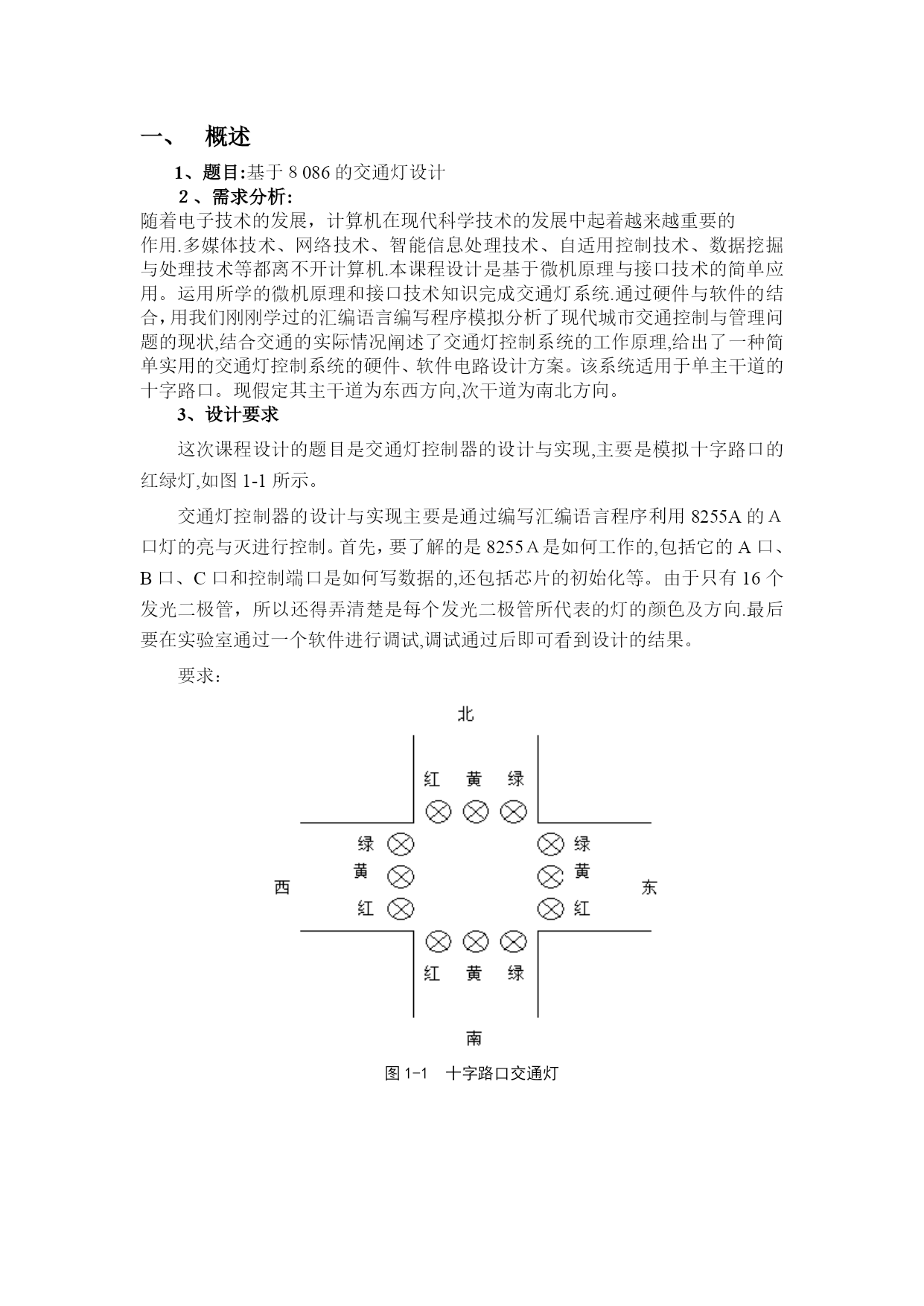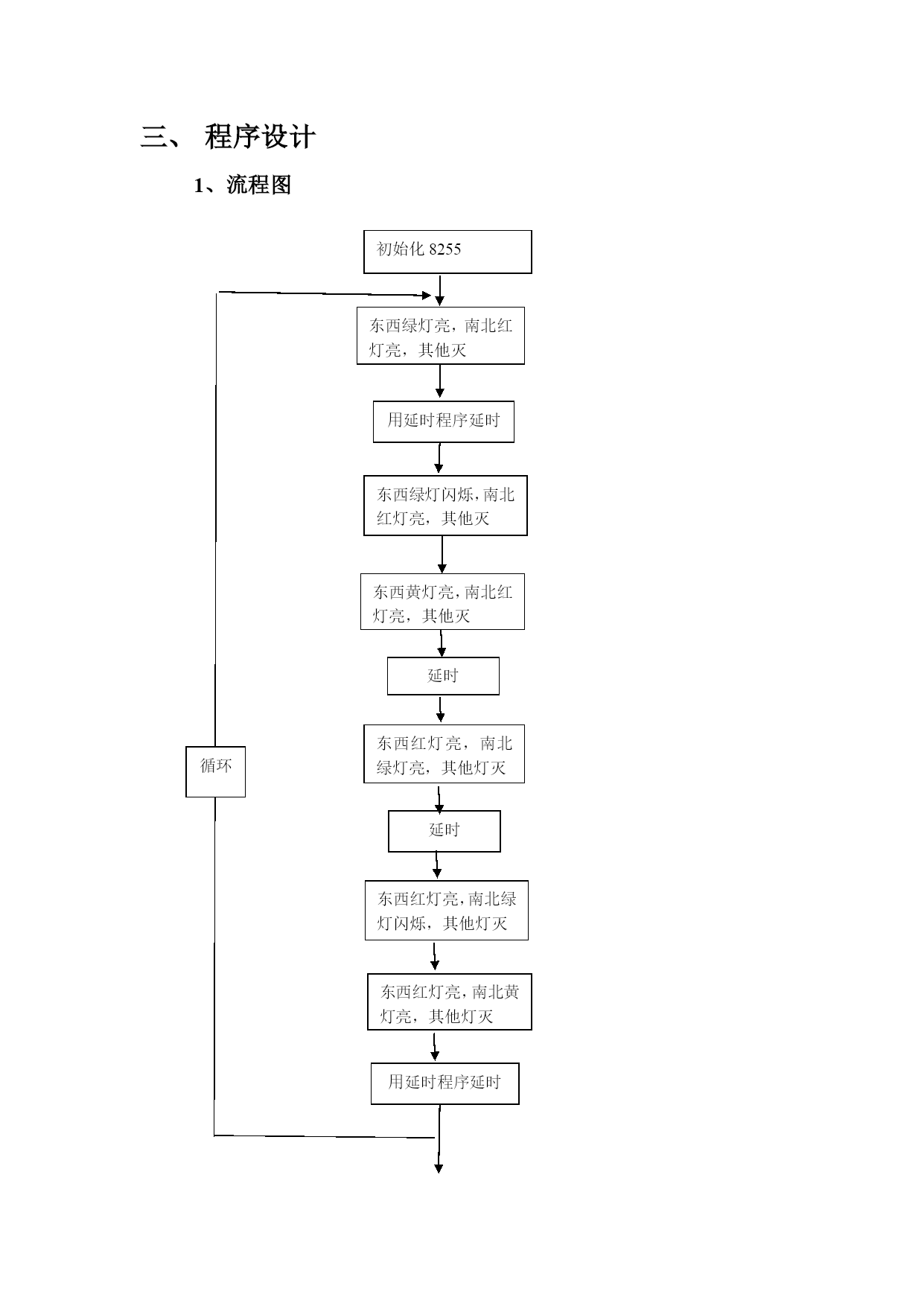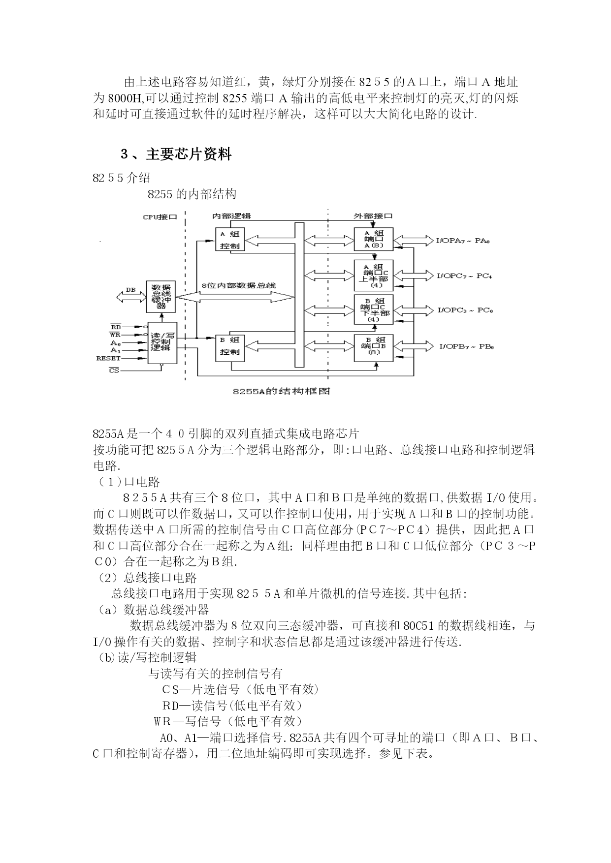 基于的交通灯设计(完整资料)(可以直接使用,可编辑优秀版资料,欢迎下载)《微型计算机原理与应用》课程设计报告班级学生姓名联系电话学号完成日期2013。12.30指导老师目录一、概述1。题目2.需求分析3.设计要求二、设计过程1。设计过程简单分析2.硬件原理3.8255芯片资料三、程序设计1.流程图2.程序代码四、总结附录概述1、题目:基于8086的交通灯设计2、需求分析:随着电子技术的发展,计算机在现代科学技术的发展中起着越来越重要的作用.多媒体技术、网络技术、智能信息处理技术、自适用控制技术、数据挖掘与处理技术等都离不开计算机.本课程设计是基于微机原理与接口技术的简单应用。运用所学的微机原理和接口技术知识完成交通灯系统.通过硬件与软件的结合,用我们刚刚学过的汇编语言编写程序模拟分析了现代城市交通控制与管理问题的现状,结合交通的实际情况阐述了交通灯控制系统的工作原理,给出了一种简单实用的交通灯控制系统的硬件、软件电路设计方案。该系统适用于单主干道的十字路口。现假定其主干道为东西方向,次干道为南北方向。3、设计要求这次课程设计的题目是交通灯控制器的设计与实现,主要是模拟十字路口的红绿灯,如图1-1所示。交通灯控制器的设计与实现主要是通过编写汇编语言程序利用8255A的A口灯的亮与灭进行控制。首先,要了解的是8255A是如何工作的,包括它的A口、B口、C口和控制端口是如何写数据的,还包括芯片的初始化等。由于只有16个发光二极管,所以还得弄清楚是每个发光二极管所代表的灯的颜色及方向.最后要在实验室通过一个软件进行调试,调试通过后即可看到设计的结果。要求:图1-1十字路口交通灯设计过程1、设计过程简单分析红,黄,绿灯可分别接在8255的A口上,灯的亮灭可直接由8255输出0,1控制。延时及闪烁由软件编程实现。2、硬件原理设计电路如下:由上述电路容易知道红,黄,绿灯分别接在8255的A口上,端口A地址为8000H,可以通过控制8255端口A输出的高低电平来控制灯的亮灭,灯的闪烁和延时可直接通过软件的延时程序解决,这样可以大大简化电路的设计.3、主要芯片资料8255介绍8255的内部结构8255A是一个40引脚的双列直插式集成电路芯片按功能可把8255A分为三个逻辑电路部分,即:口电路、总线接口电路和控制逻辑电路.(1)口电路8255A共有三个8位口,其中A口和B口是单纯的数据口,供数据I/O使用。而C口则既可以作数据口,又可以作控制口使用,用于实现A口和B口的控制功能。数据传送中A口所需的控制信号由C口高位部分(PC7~PC4)提供,因此把A口和C口高位部分合在一起称之为A组;同样理由把B口和C口低位部分(PC3~PC0)合在一起称之为B组.(2)总线接口电路总线接口电路用于实现8255A和单片微机的信号连接.其中包括:(a)数据总线缓冲器数据总线缓冲器为8位双向三态缓冲器,可直接和80C51的数据线相连,与I/O操作有关的数据、控制字和状态信息都是通过该缓冲器进行传送.(b)读/写控制逻辑与读写有关的控制信号有CS—片选信号(低电平有效)RD—读信号(低电平有效)WR—写信号(低电平有效)A0、A1—端口选择信号.8255A共有四个可寻址的端口(即A口、B口、C口和控制寄存器),用二位地址编码即可实现选择。参见下表。RESET-复位信号(高电平有效).复位之后,控制寄存器清除,各端口被置为输入方式。读写控制逻辑用于实现8255A的硬件管理:芯片的选择,口的寻址以及规定各端口和单片微机之间的数据传送方向。(c)控制逻辑电路控制逻辑电路包括A组控制和B组控制,合在一起构成8位控制寄存器。用于存放各口的工作方式控制字8255A工作方式及数据I/O操作(1)8255A的工作方式8255A共有三种工作方式,即方式0、方式1、方式2.(a)方式0基本输入/输出方式方式0下,可供使用的是两个8位口(A口和B口)及两个4位口(C口高4位部分和低4位部分)。四个口可以是输入和输出的任何组合。方式0适用于无条件数据传送,也可以把C口的某一位作为状态位,实现查询方式的数据传送.(b)方式1选通输入/输出方式A口和B口分别用于数据的输入/输出.而C口则作为数据传送的联络信号。具体定义见表7–2.可见A口和B口的联络信号都是三个,如果A或B只有一个口按方式1使用,则剩下的另外13位口线仍然可按方式0使用。如果两个口都按方式1使用,则还剩下2位口线,这两位口线仍然可以进行位状态的输入输出。方式1适用于查询或中断方式的数据输入/输出.(c)方式2双向数据