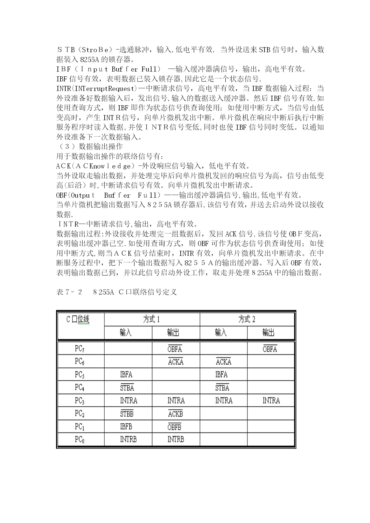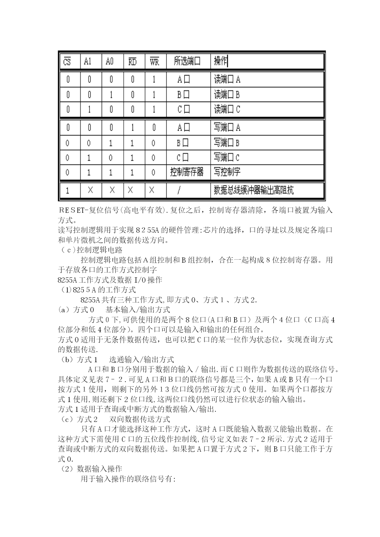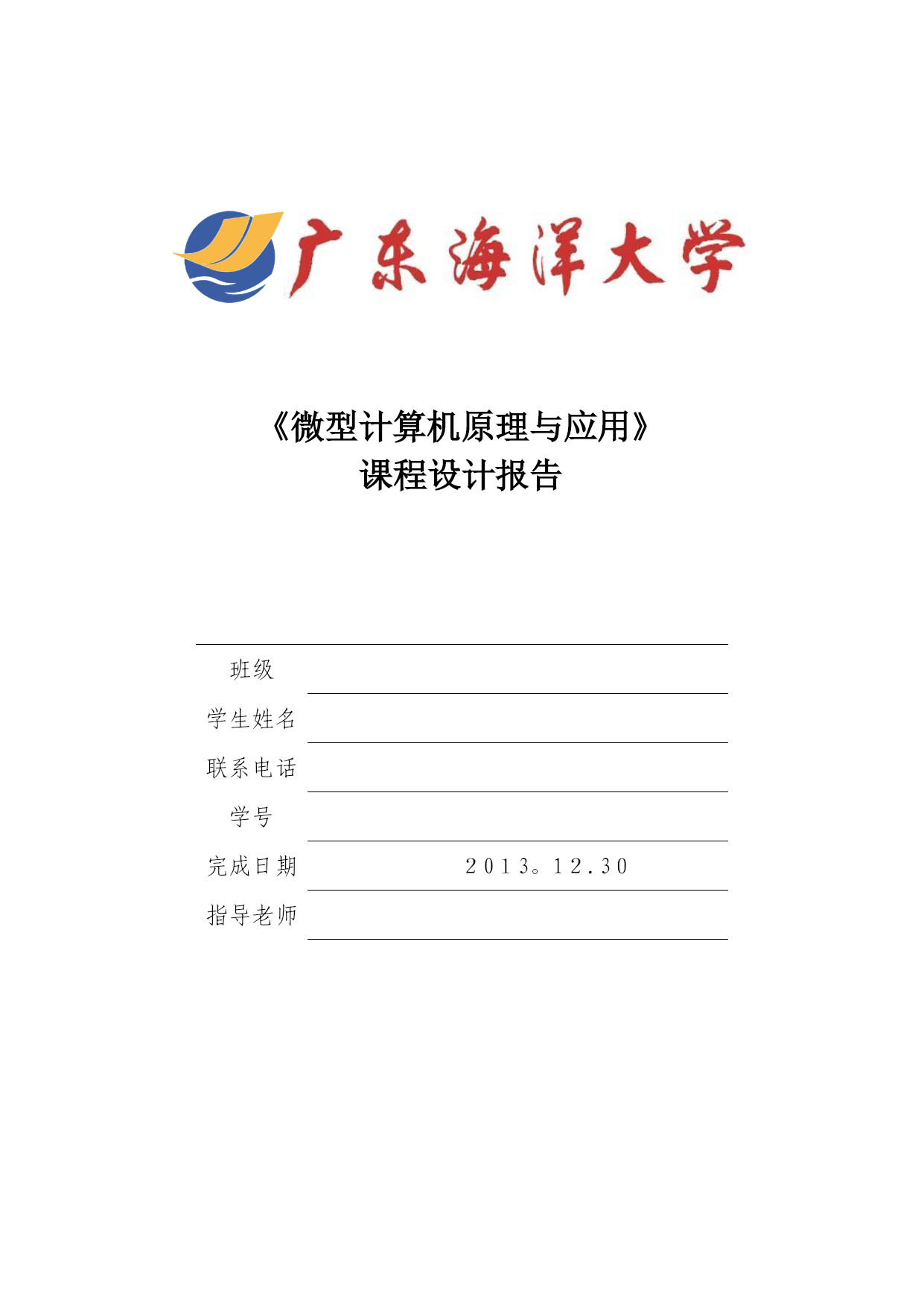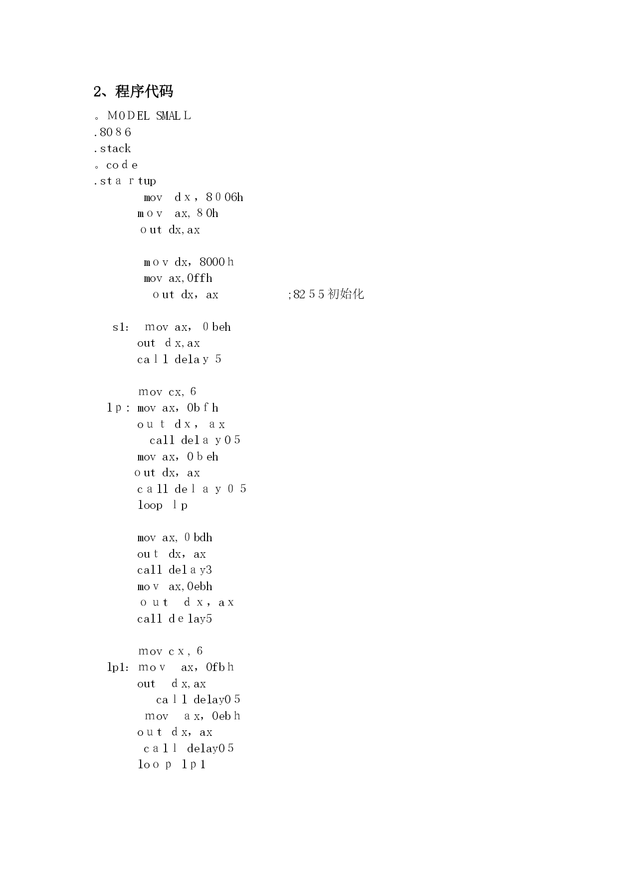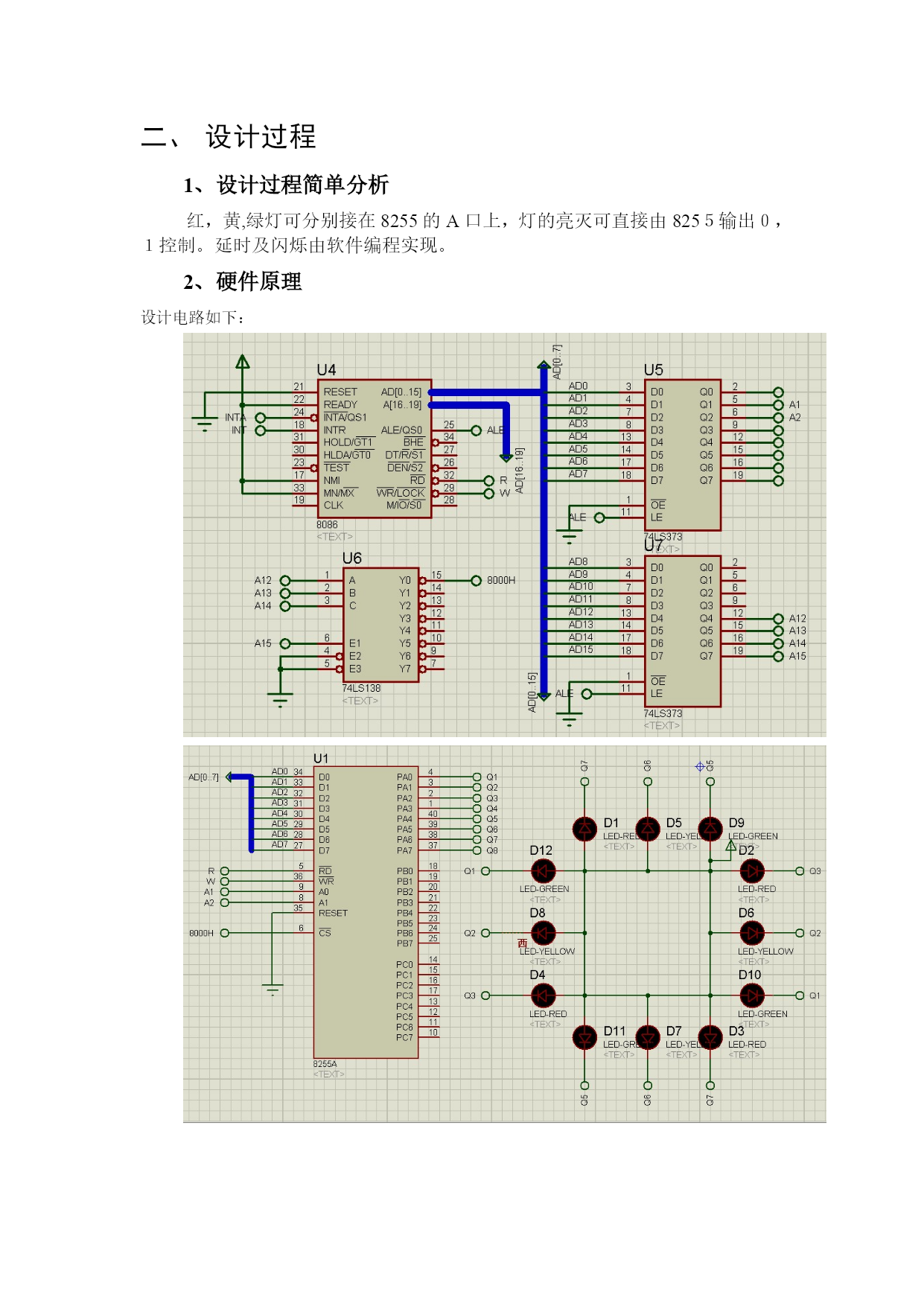 基于的交通灯设计(完整资料)(可以直接使用,可编辑优秀版资料,欢迎下载)《微型计算机原理与应用》课程设计报告班级学生姓名联系电话学号完成日期2013。12.30指导老师目录一、概述1。题目2.需求分析3.设计要求二、设计过程1。设计过程简单分析2.硬件原理3.8255芯片资料三、程序设计1.流程图2.程序代码四、总结附录概述1、题目:基于8086的交通灯设计2、需求分析:随着电子技术的发展,计算机在现代科学技术的发展中起着越来越重要的作用.多媒体技术、网络技术、智能信息处理技术、自适用控制技术、数据挖掘与处理技术等都离不开计算机.本课程设计是基于微机原理与接口技术的简单应用。运用所学的微机原理和接口技术知识完成交通灯系统.通过硬件与软件的结合,用我们刚刚学过的汇编语言编写程序模拟分析了现代城市交通控制与管理问题的现状,结合交通的实际情况阐述了交通灯控制系统的工作原理,给出了一种简单实用的交通灯控制系统的硬件、软件电路设计方案。该系统适用于单主干道的十字路口。现假定其主干道为东西方向,次干道为南北方向。3、设计要求这次课程设计的题目是交通灯控制器的设计与实现,主要是模拟十字路口的红绿灯,如图1-1所示。交通灯控制器的设计与实现主要是通过编写汇编语言程序利用8255A的A口灯的亮与灭进行控制。首先,要了解的是8255A是如何工作的,包括它的A口、B口、C口和控制端口是如何写数据的,还包括芯片的初始化等。由于只有16个发光二极管,所以还得弄清楚是每个发光二极管所代表的灯的颜色及方向.最后要在实验室通过一个软件进行调试,调试通过后即可看到设计的结果。要求:图1-1十字路口交通灯设计过程1、设计过程简单分析红,黄,绿灯可分别接在8255的A口上,灯的亮灭可直接由8255输出0,1控制。延时及闪烁由软件编程实现。2、硬件原理设计电路如下:由上述电路容易知道红,黄,绿灯分别接在8255的A口上,端口A地址为8000H,可以通过控制8255端口A输出的高低电平来控制灯的亮灭,灯的闪烁和延时可直接通过软件的延时程序解决,这样可以大大简化电路的设计.3、主要芯片资料8255介绍8255的内部结构8255A是一个40引脚的双列直插式集成电路芯片按功能可把8255A分为三个逻辑电路部分,即:口电路、总线接口电路和控制逻辑电路.(1)口电路8255A共有三个8位口,其中A口和B口是单纯的数据口,供数据I/O使用。而C口则既可以作数据口,又可以作控制口使用,用于实现A口和B口的控制功能。数据传送中A口所需的控制信号由C口高位部分(PC7~PC4)提供,因此把A口和C口高位部分合在一起称之为A组;同样理由把B口和C口低位部分(PC3~PC0)合在一起称之为B组.(2)总线接口电路总线接口电路用于实现8255A和单片微机的信号连接.其中包括:(a)数据总线缓冲器数据总线缓冲器为8位双向三态缓冲器,可直接和80C51的数据线相连,与I/O操作有关的数据、控制字和状态信息都是通过该缓冲器进行传送.(b)读/写控制逻辑与读写有关的控制信号有CS—片选信号(低电平有效)RD—读信号(低电平有效)WR—写信号(低电平有效)A0、A1—端口选择信号.8255A共有四个可寻址的端口(即A口、B口、C口和控制寄存器),用二位地址编码即可实现选择。参见下表。RESET-复位信号(高电平有效).复位之后,控制寄存器清除,各端口被置为输入方式。读写控制逻辑用于实现8255A的硬件管理:芯片的选择,口的寻址以及规定各端口和单片微机之间的数据传送方向。(c)控制逻辑电路控制逻辑电路包括A组控制和B组控制,合在一起构成8位控制寄存器。用于存放各口的工作方式控制字8255A工作方式及数据I/O操作(1)8255A的工作方式8255A共有三种工作方式,即方式0、方式1、方式2.(a)方式0基本输入/输出方式方式0下,可供使用的是两个8位口(A口和B口)及两个4位口(C口高4位部分和低4位部分)。四个口可以是输入和输出的任何组合。方式0适用于无条件数据传送,也可以把C口的某一位作为状态位,实现查询方式的数据传送.(b)方式1选通输入/输出方式A口和B口分别用于数据的输入/输出.而C口则作为数据传送的联络信号。具体定义见表7–2.可见A口和B口的联络信号都是三个,如果A或B只有一个口按方式1使用,则剩下的另外13位口线仍然可按方式0使用。如果两个口都按方式1使用,则还剩下2位口线,这两位口线仍然可以进行位状态的输入输出。方式1适用于查询或中断方式的数据输入/输出.(c)方式2双向数据