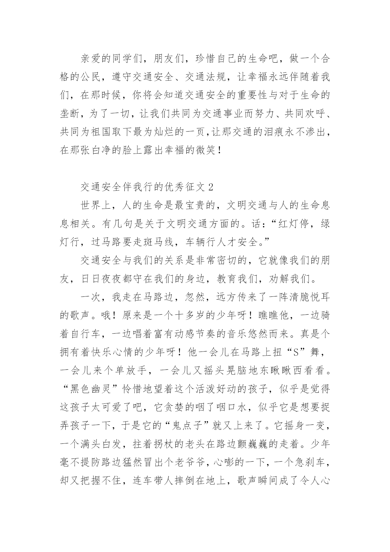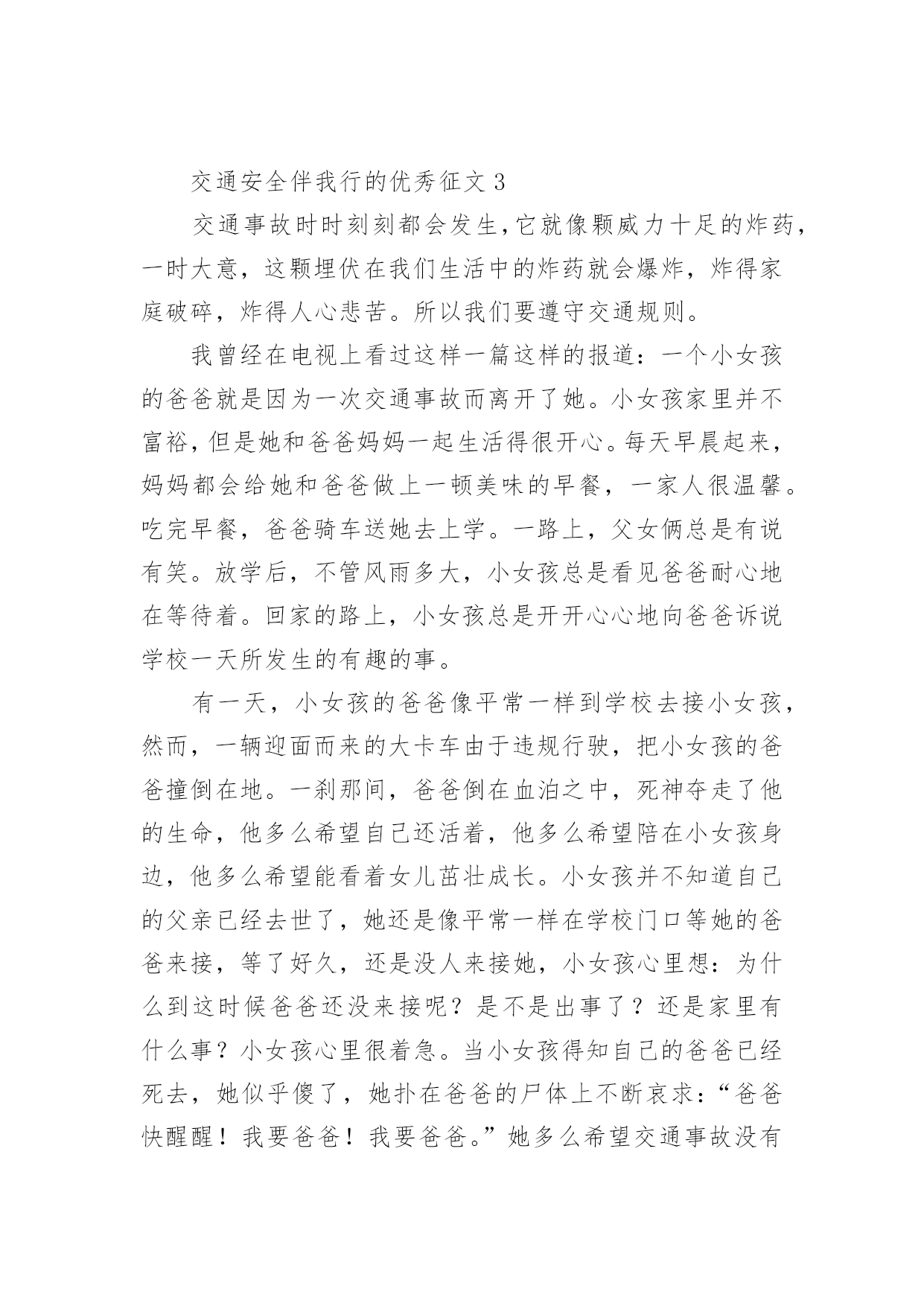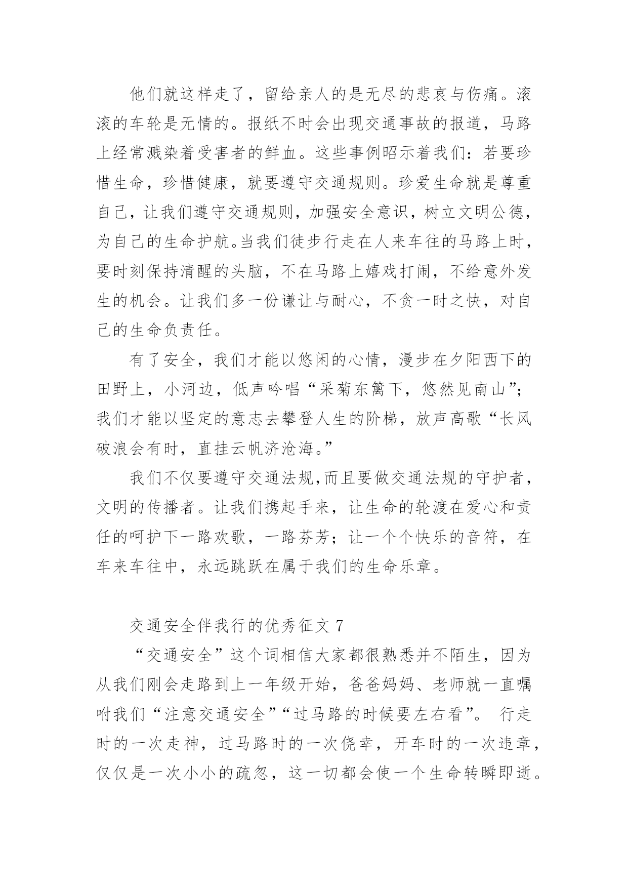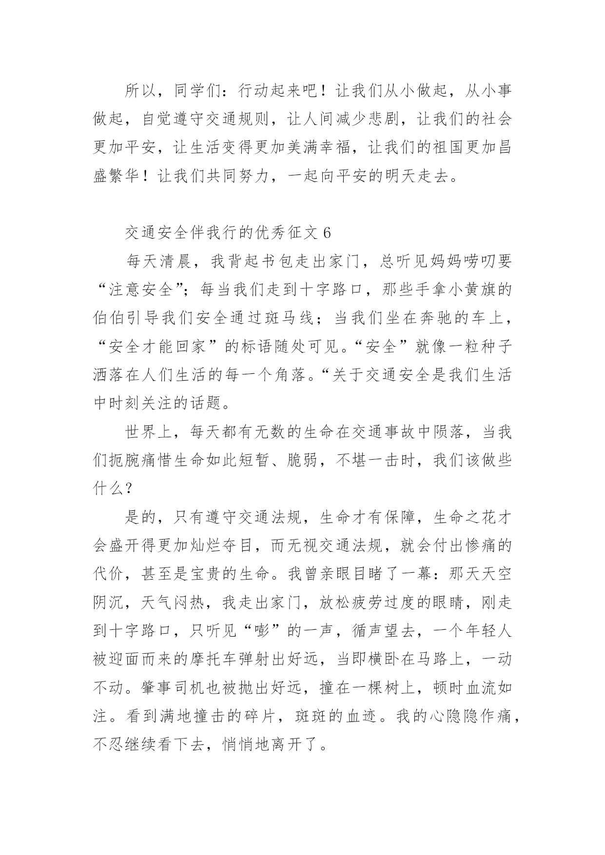 交通安全伴我行的优秀征文交通安全伴我行的优秀征文(精选11篇)在学习、工作乃至生活中,许多人都写过征文吧,借助征文可以提高我们的语言组织能力。你写征文时总是无从下笔?以下是小编整理的交通安全伴我行的优秀征文(精选11篇),欢迎阅读与收藏。交通安全伴我行的优秀征文1科技在不断进步,社会在不断发展;高楼大厦在不断建起,路上的车在不断增多。可在人们生活改善的同时,车祸也伴随而来,频频发生。今天,就让我们一起来谈谈交通安全。许多国家都十分重视交通安全教育,让孩子们从小就很好的吸收交通安全的意识,每个人也严格都按照规章制度出行。例如,在德国,交通管理部门经常组织学龄前儿童举行交通知识大奖赛。德国的街道上,最引人注目的是大街小巷的红绿灯,大的十字路口的红绿灯都是自动装置,中小路口有指示先行或后行的交通牌。在学校、幼儿园或孩子集中的地区,路牌上会印有小孩的图案,提醒司机注意。瑞典的交通规则也是以人为先,行人第一。马路上的信号灯在离地面两米处,与行人的目光高度持平,且周围不准立广告牌或栽树,以避免遮盖信号灯。我国虽然也十分重视交通安全和交通文明,但相比较其他国家做得还远远不够。每天,马路上,不遵守交通规则的行人、自行车、车辆比比皆是。如,非机动车在小型十字路口时遇红灯却越线;在车道上逆行;违法载人载物;行人不走人行道;任意跨越护栏;乱穿机动车道。有的时候我过马路,经常会看见行人无视信号灯闯红灯,或者绿灯时汽车利用交叉路口时间差不顾过马路的行人加速冲过去等情况。我国交通法规明确规定:“车辆行经人行横道,遇有交通信号放行行人通过时,必须停车或减速让行;通过没有信号灯控制的人行横道时,须注意避让来往行人。”在现实生活中,有交通信号的路口还好一些,没有交通信号的路口根本就是一片混乱的景象,车水马龙,互不相让。在我们这个现代社会中,车辆依法行车,行人依法行路,是交通文明的一部分。另外,交通警察依法管理、文明执法,也是交通文明的另一部分。这两部分同时“展现”在马路上,才能构成完整的交通文明。曾经报纸上登过这样一件事:一个小女孩过马路时心爱的小娃娃掉在了地上,刚刚过了马路,她就发现娃娃没了,四处一看,原来娃娃正躺在马路中间睡大觉呢。于是,她连忙去捡,可是她却没有发现现在已经红灯了,一辆汽车疾驰而来。如果她稍微有点儿安全意识,那这场车祸又怎么会发生?如果她稍微有点儿安全意识,哪儿来的她父母的哭喊?遵守交通,注意安全,这是全人类的呼唤,大家没有理由,只有责任,有为全人类生活美满幸福的责任,这便是大家的准则。亲爱的同学们,朋友们,珍惜自己的生命吧,做一个合格的公民,遵守交通安全、交通法规,让幸福永远伴随着我们,在那时候,你将会知道交通安全的重要性与对于生命的垄断,为了一切,让我们共同为交通事业而努力、共同欢呼、共同为祖国取下最为灿烂的一页,让那交通的泪痕永不渗出,在那张白净的脸上露出幸福的微笑!交通安全伴我行的优秀征文2世界上,人的生命是最宝贵的,文明交通与人的生命息息相关。有几句是关于文明交通方面的。话:“红灯停,绿灯行,过马路要走斑马线,车辆行人才安全。”交通安全与我们的关系是非常密切的,它就像我们的朋友,日日夜夜都守在我们的身边,教育我们,劝解我们。一次,我走在马路边,忽然,远方传来了一阵清脆悦耳的歌声。哦!原来是一个十多岁的少年呀!瞧瞧他,一边骑着自行车,一边唱着富有动感节奏的音乐悠然而来。真是个拥有着快乐心情的少年呀!他一会儿在马路上扭“S”舞,一会儿来个单放手,一会儿又摇头晃脑地东瞅瞅西看看。“黑色幽灵”怜惜地望着这个活泼好动的孩子,似乎是觉得这孩子太可爱了吧,它贪婪的咽了咽口水,似乎它是想要捉弄孩子一下,于是它的“鬼点子”就又上来了。它摇身一变,一个满头白发,拄着拐杖的老头在路边颤巍巍的走着。少年毫不提防路边猛然冒出个老爷爷,心嘭的一下,一个急刹车,却又把握不住,连车带人摔倒在地上,歌声瞬间成了令人心碎的呻吟。交通事故随时都有可能发生,它就像一颗威力十足的炸弹,所以当大人们吃饭的时候,千万不万不要让他们喝酒。因为如果喝了酒再开车,随时都有可能发生交通事故。有一位哲学家说过:人生只有昨天,今天和明天。是的,生命在慢慢的离去,生命不在于长短而是在于是否精彩,把握住每一个瞬间,让生命如同璀璨的星群,发光发亮。当我们看到一朵鲜花盛开的时候,我为之高兴;可是,当我看着一朵朵花儿慢慢凋谢,不免有些伤感。我的定义中,花开就是生命的开始,花谢就是生命的结束,人的一生中可以看到多少个花开花谢呢?每你看一回时间,时间久悄悄溜走了一次。我不禁感叹一句——生命如此短暂!所以说,上帝是吝啬的,也是公平的,他只给每一个人一次生命,让我们都明白生命只有一次要好好珍惜,还让我们明白了校园的安全是不可以忽略的。交通安全,我们应当牢记在心。更主要的,是要知道交通安全常识:首先,行