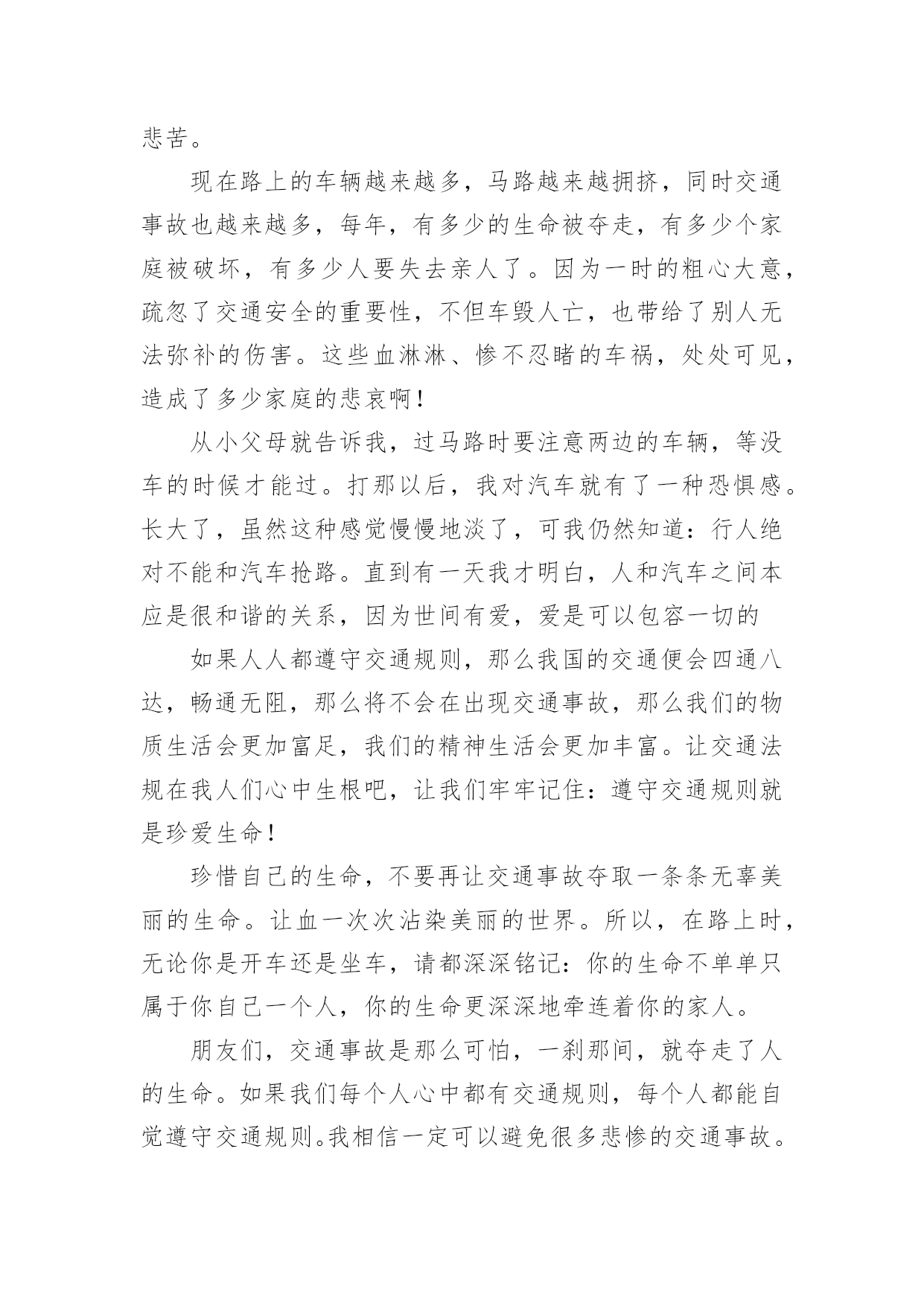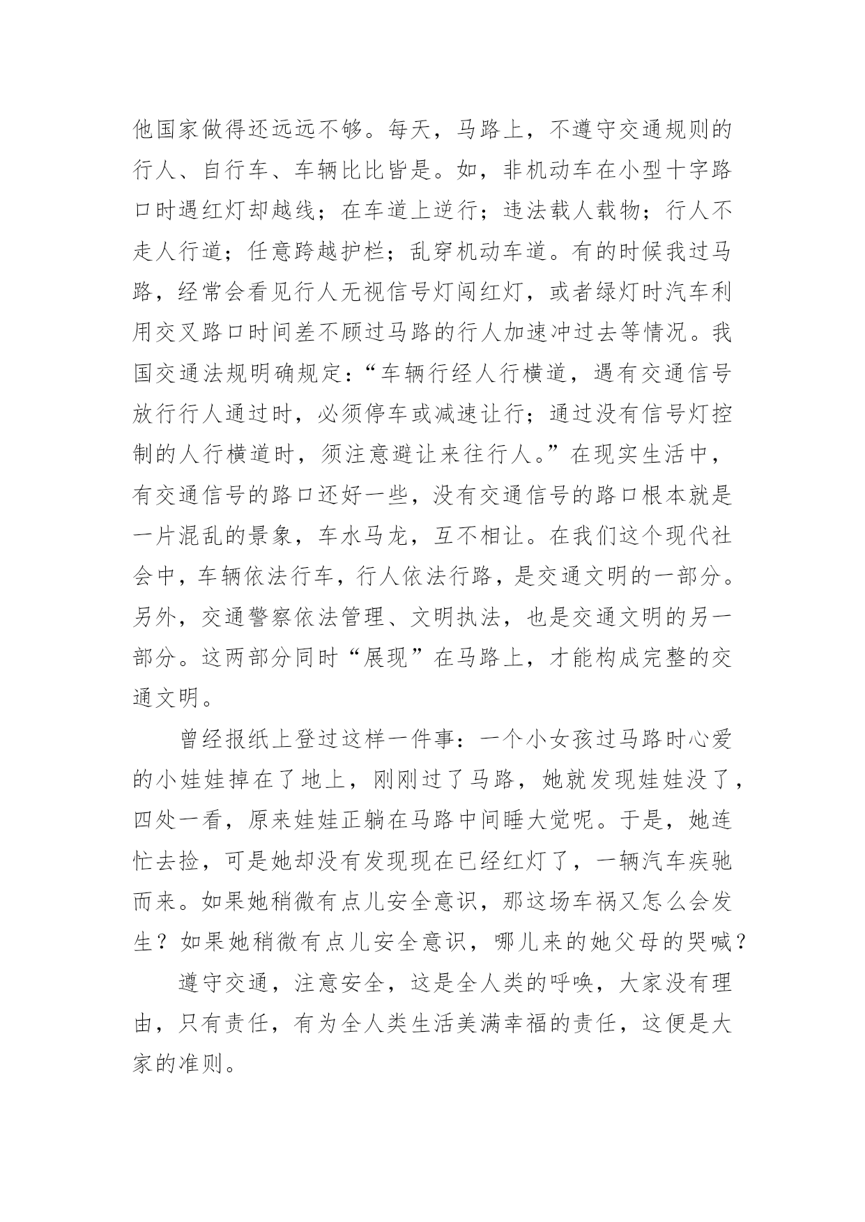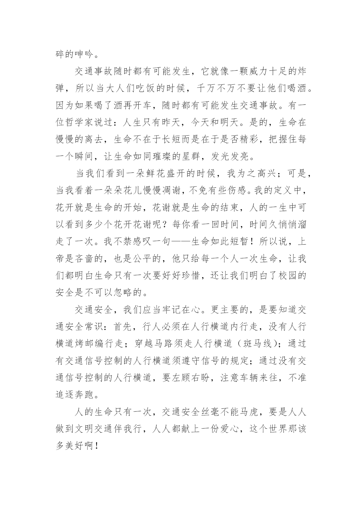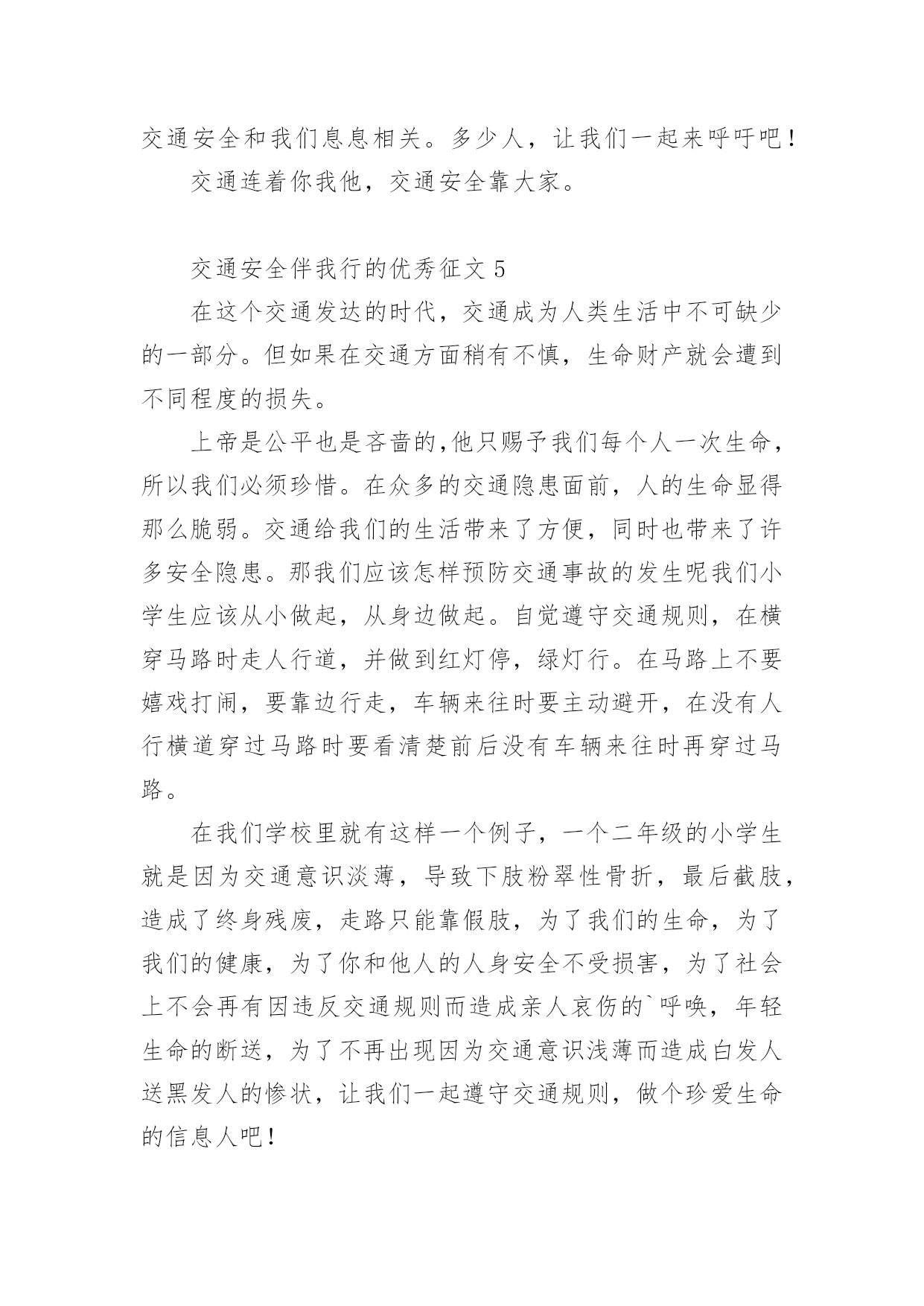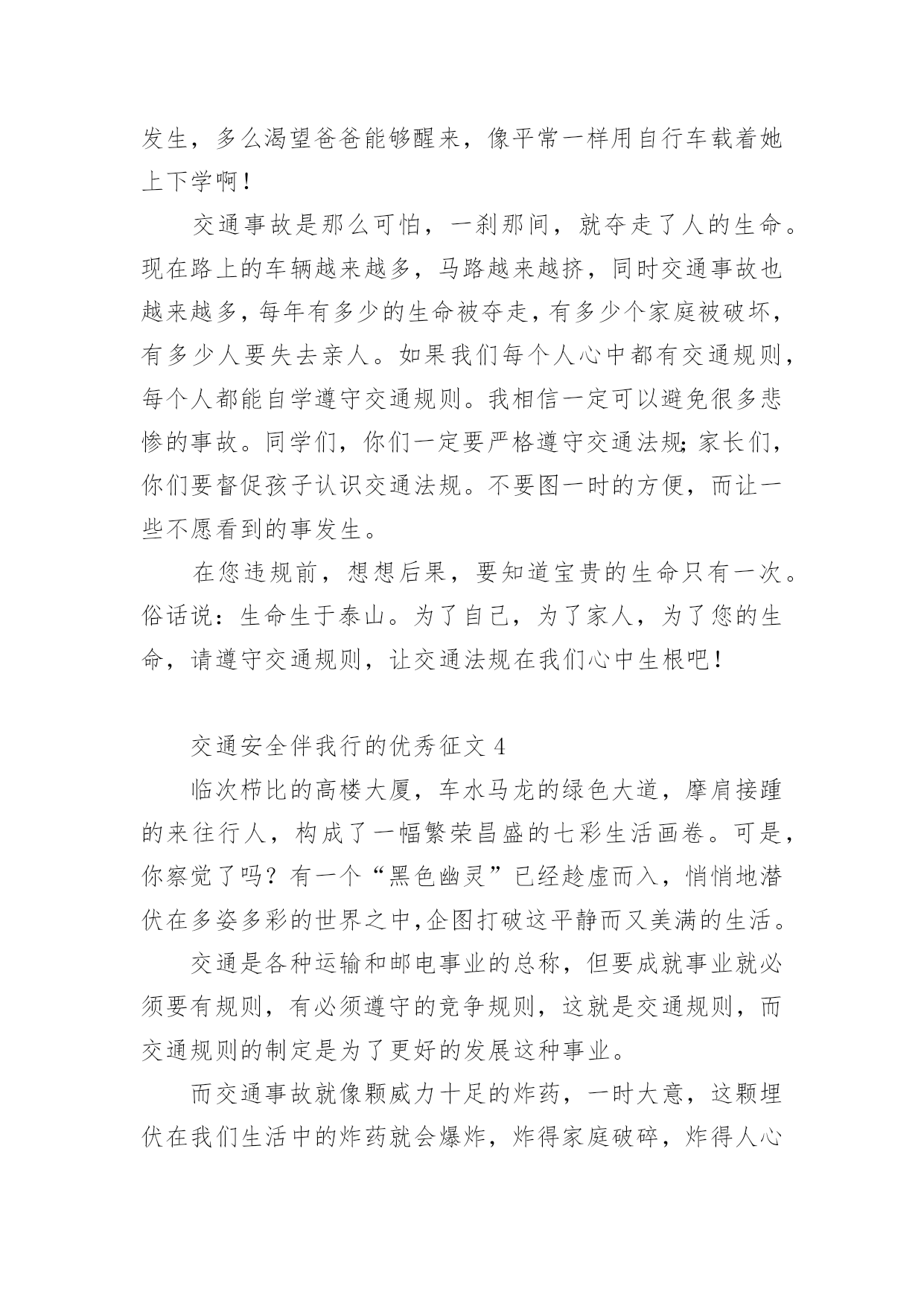 交通安全伴我行的优秀征文交通安全伴我行的优秀征文(精选11篇)在学习、工作乃至生活中,许多人都写过征文吧,借助征文可以提高我们的语言组织能力。你写征文时总是无从下笔?以下是小编整理的交通安全伴我行的优秀征文(精选11篇),欢迎阅读与收藏。交通安全伴我行的优秀征文1科技在不断进步,社会在不断发展;高楼大厦在不断建起,路上的车在不断增多。可在人们生活改善的同时,车祸也伴随而来,频频发生。今天,就让我们一起来谈谈交通安全。许多国家都十分重视交通安全教育,让孩子们从小就很好的吸收交通安全的意识,每个人也严格都按照规章制度出行。例如,在德国,交通管理部门经常组织学龄前儿童举行交通知识大奖赛。德国的街道上,最引人注目的是大街小巷的红绿灯,大的十字路口的红绿灯都是自动装置,中小路口有指示先行或后行的交通牌。在学校、幼儿园或孩子集中的地区,路牌上会印有小孩的图案,提醒司机注意。瑞典的交通规则也是以人为先,行人第一。马路上的信号灯在离地面两米处,与行人的目光高度持平,且周围不准立广告牌或栽树,以避免遮盖信号灯。我国虽然也十分重视交通安全和交通文明,但相比较其他国家做得还远远不够。每天,马路上,不遵守交通规则的行人、自行车、车辆比比皆是。如,非机动车在小型十字路口时遇红灯却越线;在车道上逆行;违法载人载物;行人不走人行道;任意跨越护栏;乱穿机动车道。有的时候我过马路,经常会看见行人无视信号灯闯红灯,或者绿灯时汽车利用交叉路口时间差不顾过马路的行人加速冲过去等情况。我国交通法规明确规定:“车辆行经人行横道,遇有交通信号放行行人通过时,必须停车或减速让行;通过没有信号灯控制的人行横道时,须注意避让来往行人。”在现实生活中,有交通信号的路口还好一些,没有交通信号的路口根本就是一片混乱的景象,车水马龙,互不相让。在我们这个现代社会中,车辆依法行车,行人依法行路,是交通文明的一部分。另外,交通警察依法管理、文明执法,也是交通文明的另一部分。这两部分同时“展现”在马路上,才能构成完整的交通文明。曾经报纸上登过这样一件事:一个小女孩过马路时心爱的小娃娃掉在了地上,刚刚过了马路,她就发现娃娃没了,四处一看,原来娃娃正躺在马路中间睡大觉呢。于是,她连忙去捡,可是她却没有发现现在已经红灯了,一辆汽车疾驰而来。如果她稍微有点儿安全意识,那这场车祸又怎么会发生?如果她稍微有点儿安全意识,哪儿来的她父母的哭喊?遵守交通,注意安全,这是全人类的呼唤,大家没有理由,只有责任,有为全人类生活美满幸福的责任,这便是大家的准则。亲爱的同学们,朋友们,珍惜自己的生命吧,做一个合格的公民,遵守交通安全、交通法规,让幸福永远伴随着我们,在那时候,你将会知道交通安全的重要性与对于生命的垄断,为了一切,让我们共同为交通事业而努力、共同欢呼、共同为祖国取下最为灿烂的一页,让那交通的泪痕永不渗出,在那张白净的脸上露出幸福的微笑!交通安全伴我行的优秀征文2世界上,人的生命是最宝贵的,文明交通与人的生命息息相关。有几句是关于文明交通方面的。话:“红灯停,绿灯行,过马路要走斑马线,车辆行人才安全。”交通安全与我们的关系是非常密切的,它就像我们的朋友,日日夜夜都守在我们的身边,教育我们,劝解我们。一次,我走在马路边,忽然,远方传来了一阵清脆悦耳的歌声。哦!原来是一个十多岁的少年呀!瞧瞧他,一边骑着自行车,一边唱着富有动感节奏的音乐悠然而来。真是个拥有着快乐心情的少年呀!他一会儿在马路上扭“S”舞,一会儿来个单放手,一会儿又摇头晃脑地东瞅瞅西看看。“黑色幽灵”怜惜地望着这个活泼好动的孩子,似乎是觉得这孩子太可爱了吧,它贪婪的咽了咽口水,似乎它是想要捉弄孩子一下,于是它的“鬼点子”就又上来了。它摇身一变,一个满头白发,拄着拐杖的老头在路边颤巍巍的走着。少年毫不提防路边猛然冒出个老爷爷,心嘭的一下,一个急刹车,却又把握不住,连车带人摔倒在地上,歌声瞬间成了令人心碎的呻吟。交通事故随时都有可能发生,它就像一颗威力十足的炸弹,所以当大人们吃饭的时候,千万不万不要让他们喝酒。因为如果喝了酒再开车,随时都有可能发生交通事故。有一位哲学家说过:人生只有昨天,今天和明天。是的,生命在慢慢的离去,生命不在于长短而是在于是否精彩,把握住每一个瞬间,让生命如同璀璨的星群,发光发亮。当我们看到一朵鲜花盛开的时候,我为之高兴;可是,当我看着一朵朵花儿慢慢凋谢,不免有些伤感。我的定义中,花开就是生命的开始,花谢就是生命的结束,人的一生中可以看到多少个花开花谢呢?每你看一回时间,时间久悄悄溜走了一次。我不禁感叹一句——生命如此短暂!所以说,上帝是吝啬的,也是公平的,他只给每一个人一次生命,让我们都明白生命只有一次要好好珍惜,还让我们明白了校园的安全是不可以忽略的。交通安全,我们应当牢记在心。更主要的,是要知道交通安全常识:首先,行