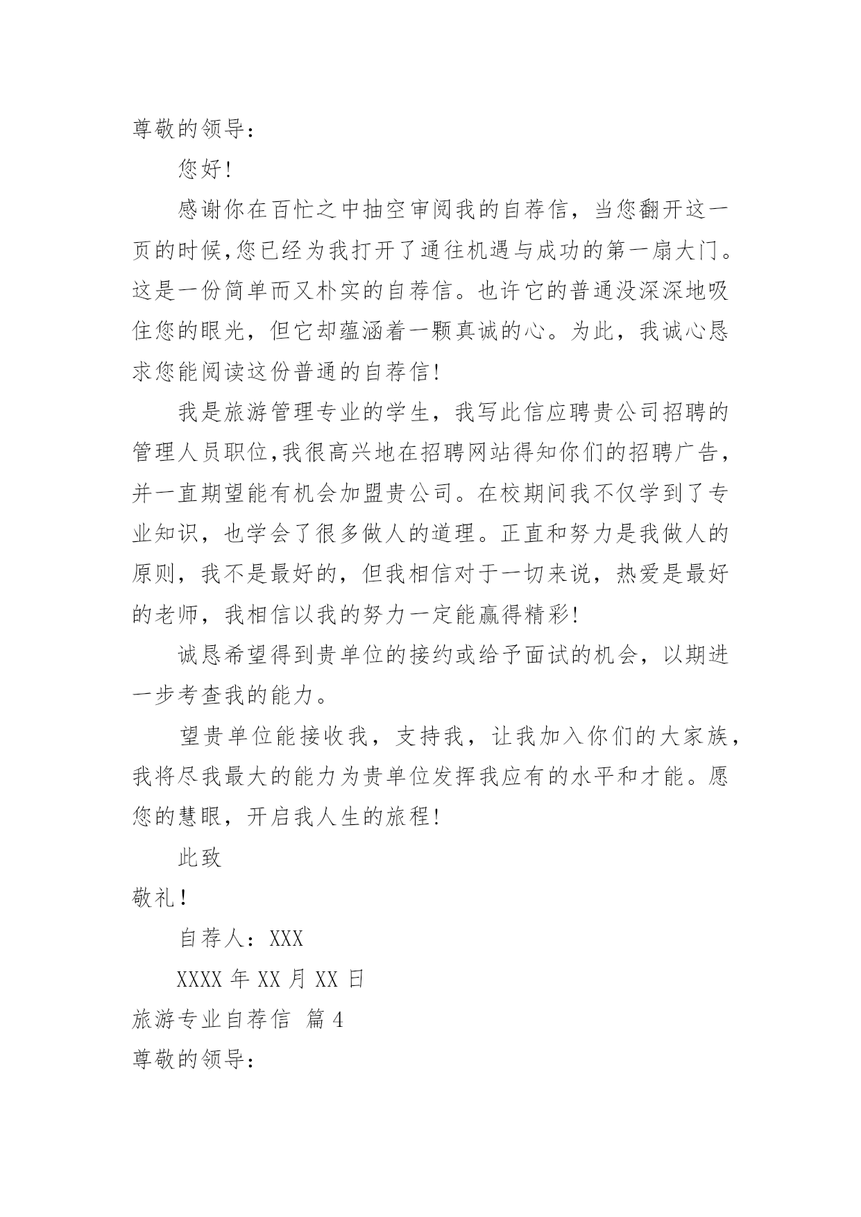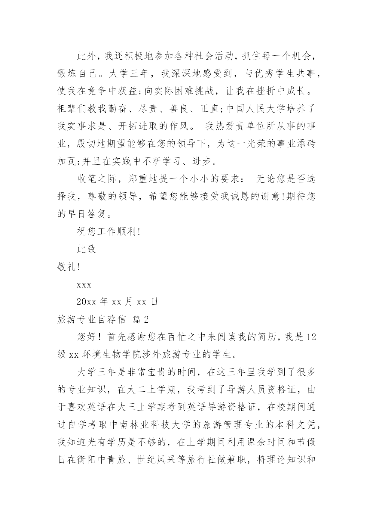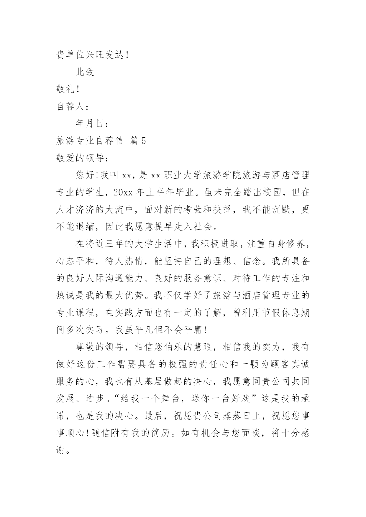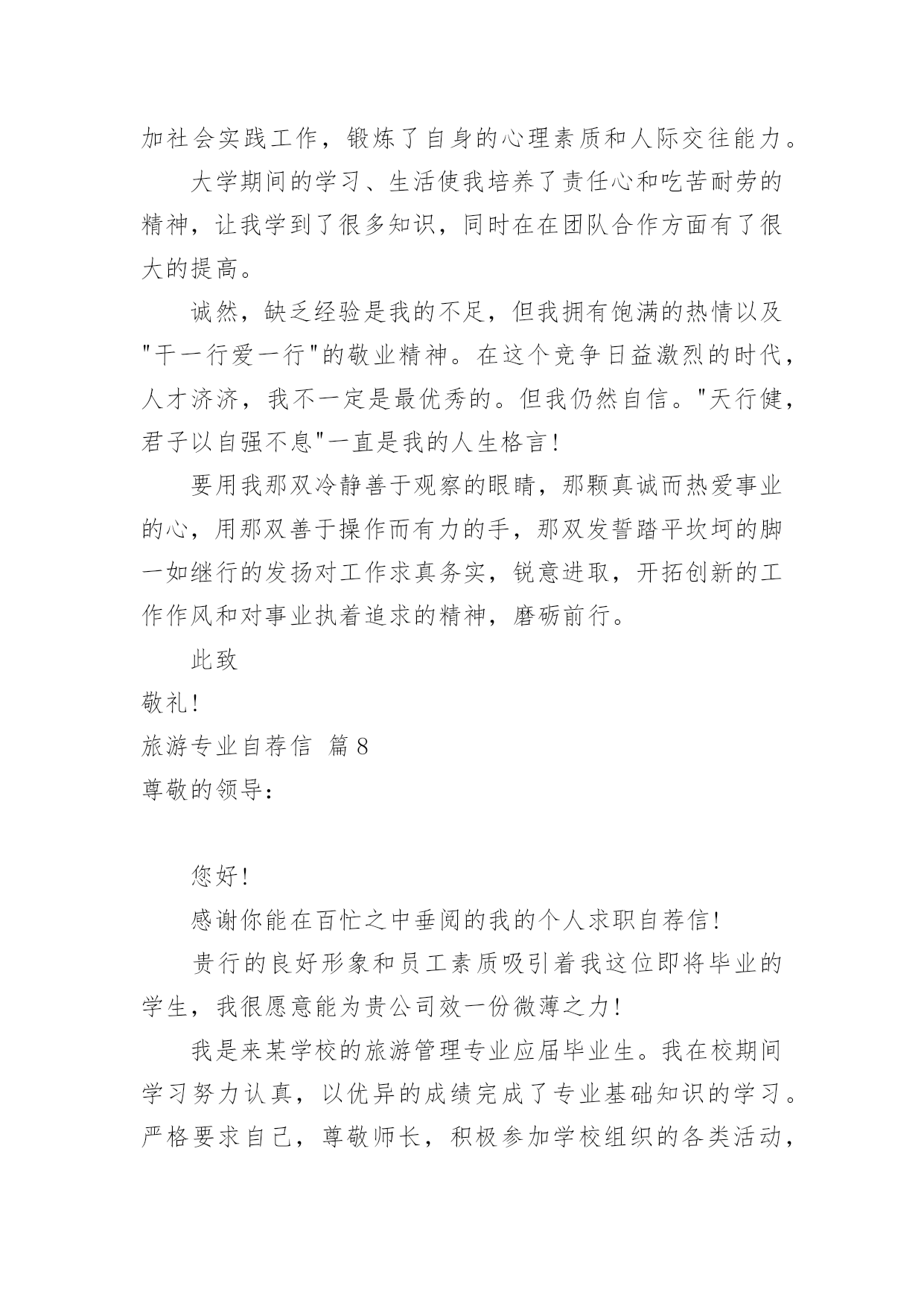 旅游专业自荐信旅游专业自荐信范文八篇在当今中国社会,自荐信对我们的作用越来越大,自荐信能突出个人的特征,让他人看到自己的优势。那么什么样的自荐信才是有效的呢?以下是小编为大家整理的旅游专业自荐信9篇,供大家参考借鉴,希望可以帮助到有需要的朋友。旅游专业自荐信篇1尊敬的xxx公司领导:您好!我叫xxx,是xx航海职业技术学院旅游系旅游管理一班的一名学生,即将面临毕业。感谢您在百忙之中抽空阅读我的求职信,我希望在您公司谋求一份职业。xxx海职业技术学院是一所环境优美,师资力量雄厚的综合性大学,具有悠久的历史(教学案例,试卷,课件,教案)和优良的传统,在这样素以治学严谨、育人有方而著称的学校栽培下,无论是在知识能力,还是在个人素质修养方面,我都受益匪浅。在校期间,我们开了以下课程,旅游法规,旅游学概论,导游义务,湖北导游基础知识,全国导游基础知识等课程。以及计算机和普通话培训。这不但充实了自己,也培养了自己多方面的技能。更重要的是,严谨的学风和端正的学习态度塑造了我朴实、稳重、创新的性格特点。此外,我还积极地参加各种社会活动,抓住每一个机会,锻炼自己。大学三年,我深深地感受到,与优秀学生共事,使我在竞争中获益;向实际困难挑战,让我在挫折中成长。祖辈们教我勤奋、尽责、善良、正直;中国人民大学培养了我实事求是、开拓进取的作风。我热爱贵单位所从事的事业,殷切地期望能够在您的领导下,为这一光荣的事业添砖加瓦;并且在实践中不断学习、进步。收笔之际,郑重地提一个小小的要求:无论您是否选择我,尊敬的领导,希望您能够接受我诚恳的谢意!期待您的早日答复。祝您工作顺利!此致敬礼!xxx20xx年xx月xx日旅游专业自荐信篇2您好!首先感谢您在百忙之中来阅读我的简历,我是12级xx环境生物学院涉外旅游专业的学生。大学三年是非常宝贵的时间,在这三年里我学到了很多的专业知识,在大二上学期,我考到了导游人员资格证,由于喜欢英语在大三上学期考到英语导游资格证,在校期间通过自学考取中南林业科技大学的旅游管理专业的本科文凭,我知道光有学历是不够的,在上学期间利用课余时间和节假日在衡阳中青旅、世纪风采等旅行社做兼职,将理论知识和实践操作结合起来,得到了进一步的锻炼。XX年5月份,进入湖南国泰假期旅行社做导游,学到很多知识,面试的考官一般都喜欢问“为什么离开原先的单位”或者“是单位抛弃了你还是你抛弃了单位?"等这样的问题,我认为这是个价值取向的问题,就我而言,国泰假期旅行社挺好的,很是佩服李总,她是个女强人,从她的身上学到了很多的东西,我感谢国泰给了我一个锻炼的平台,可是我想更好的实现自己的目标,我想进入一家国际旅行社,不断挑战自己锻炼自己,我知道华天国旅是个非常好的旅行社,对导游的要求也高,有了高要求才有更好的进步,有了进步才能为公司获得效益,如今导游人员多,供过于求,旅行社选择导游,导游选择旅行社彼此都需要磨合,希望领导您看我我的简历之后觉得我还可以话能给我一个机会,我很希望自己能成为华天国旅一员,向前辈们学习。也许贵公司招聘导游要求有两年或三年以上的经验,我深知经验是永远学不完的,我只能一步步的把事情做好,带团的突发事件是不可预料的,我只能细心的考虑周全,我喜欢旅游这个行业,也非常热爱导游这份工作,会尽力做好自己的工作。再次对您抽出时间阅读我的简历表示感谢,我静候您的回音。此致敬礼!自荐人:旅游专业自荐信篇3尊敬的领导:您好!感谢你在百忙之中抽空审阅我的自荐信,当您翻开这一页的时候,您已经为我打开了通往机遇与成功的第一扇大门。这是一份简单而又朴实的自荐信。也许它的普通没深深地吸住您的眼光,但它却蕴涵着一颗真诚的心。为此,我诚心恳求您能阅读这份普通的自荐信!我是旅游管理专业的学生,我写此信应聘贵公司招聘的管理人员职位,我很高兴地在招聘网站得知你们的招聘广告,并一直期望能有机会加盟贵公司。在校期间我不仅学到了专业知识,也学会了很多做人的道理。正直和努力是我做人的原则,我不是最好的,但我相信对于一切来说,热爱是最好的老师,我相信以我的努力一定能赢得精彩!诚恳希望得到贵单位的接约或给予面试的机会,以期进一步考查我的能力。望贵单位能接收我,支持我,让我加入你们的大家族,我将尽我最大的能力为贵单位发挥我应有的水平和才能。愿您的慧眼,开启我人生的旅程!此致敬礼!自荐人:XXXXXXX年XX月XX日旅游专业自荐信篇4尊敬的领导:请您在百忙之中抽出时间,阅读我的这份求职材料,非常感谢您给我一次迈向成功的机遇和挑战。本人名叫XXX,XX人,XX学院旅游系旅游管理××××年本科毕业生。在大学的学习生活中,系统学习了旅游管理方面的专业知识,积极参加旅行社实践、兼职导游工作和正规的专业实习,使我初步具备了一名管理者的素质和职业技能。在学习本专业课的.同时,还辅修了法律专业,对法律方面也