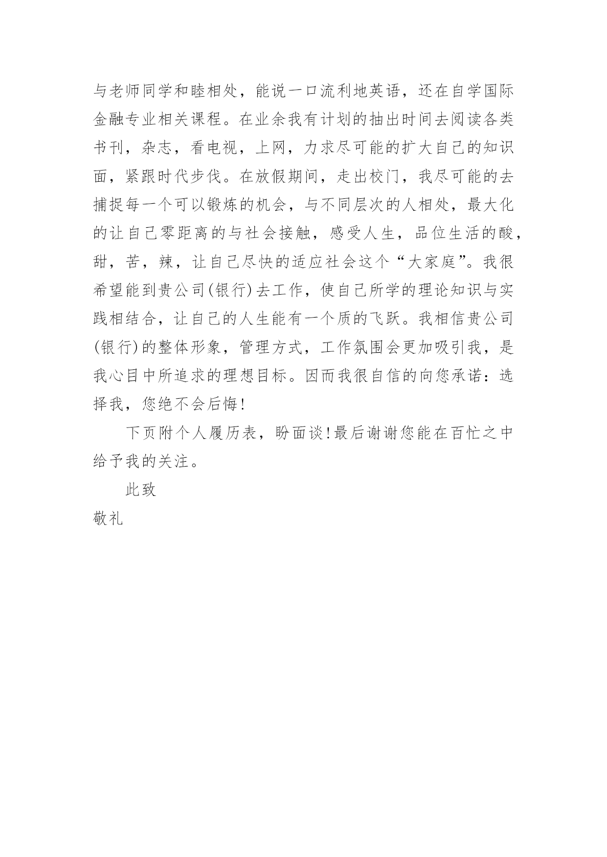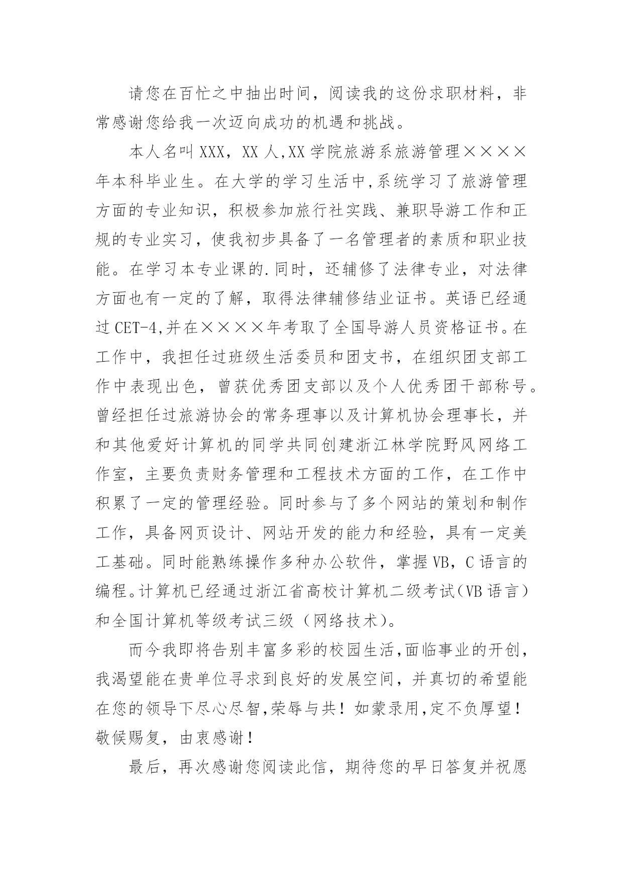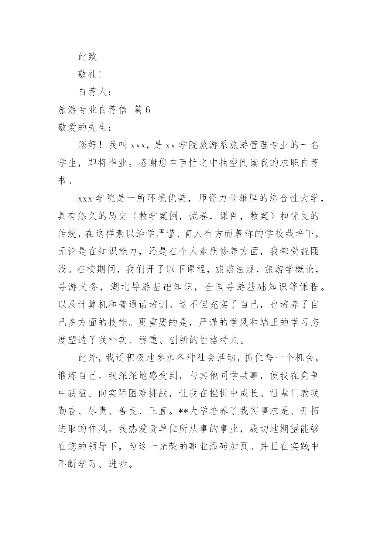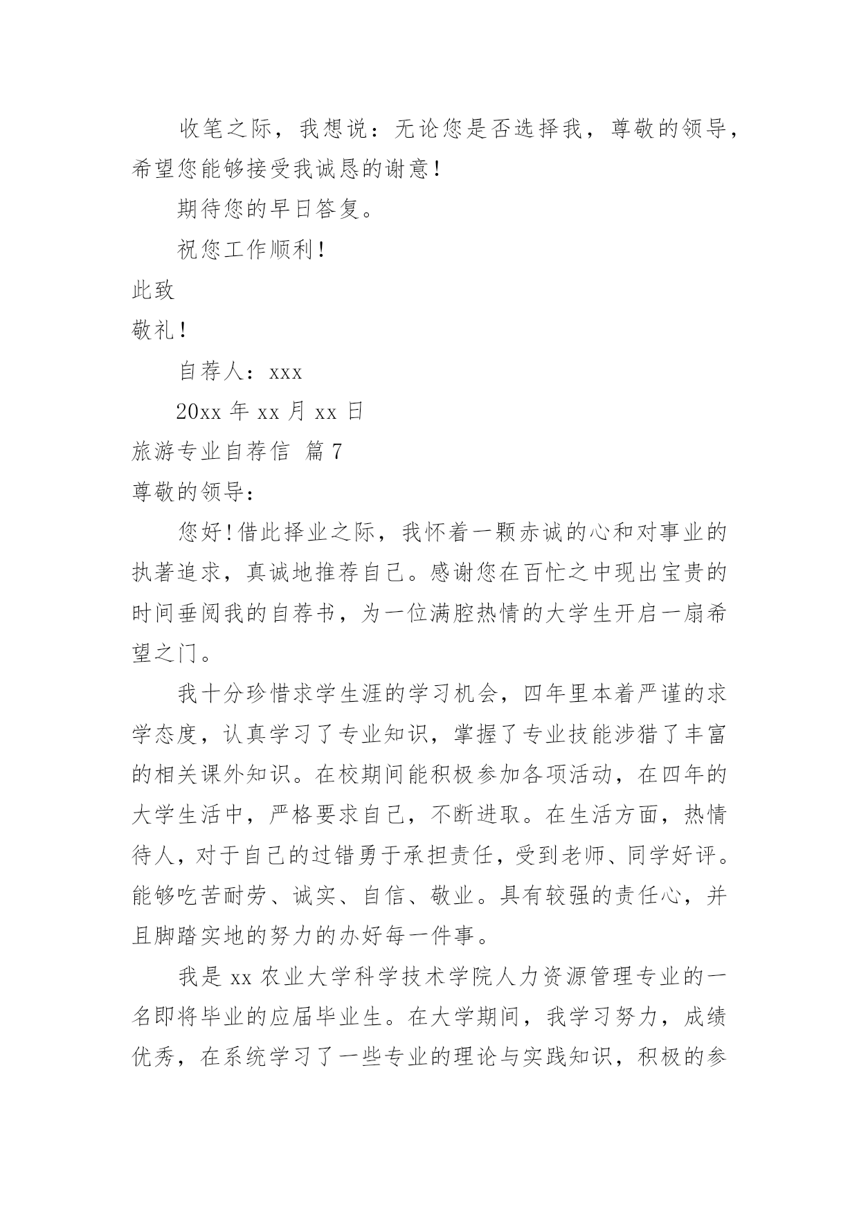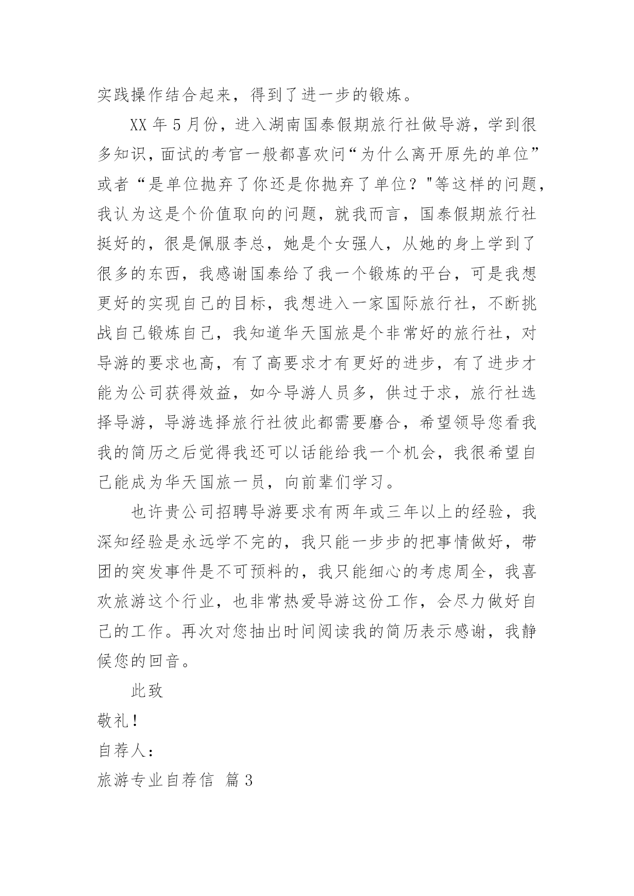 旅游专业自荐信旅游专业自荐信范文八篇在当今中国社会,自荐信对我们的作用越来越大,自荐信能突出个人的特征,让他人看到自己的优势。那么什么样的自荐信才是有效的呢?以下是小编为大家整理的旅游专业自荐信9篇,供大家参考借鉴,希望可以帮助到有需要的朋友。旅游专业自荐信篇1尊敬的xxx公司领导:您好!我叫xxx,是xx航海职业技术学院旅游系旅游管理一班的一名学生,即将面临毕业。感谢您在百忙之中抽空阅读我的求职信,我希望在您公司谋求一份职业。xxx海职业技术学院是一所环境优美,师资力量雄厚的综合性大学,具有悠久的历史(教学案例,试卷,课件,教案)和优良的传统,在这样素以治学严谨、育人有方而著称的学校栽培下,无论是在知识能力,还是在个人素质修养方面,我都受益匪浅。在校期间,我们开了以下课程,旅游法规,旅游学概论,导游义务,湖北导游基础知识,全国导游基础知识等课程。以及计算机和普通话培训。这不但充实了自己,也培养了自己多方面的技能。更重要的是,严谨的学风和端正的学习态度塑造了我朴实、稳重、创新的性格特点。此外,我还积极地参加各种社会活动,抓住每一个机会,锻炼自己。大学三年,我深深地感受到,与优秀学生共事,使我在竞争中获益;向实际困难挑战,让我在挫折中成长。祖辈们教我勤奋、尽责、善良、正直;中国人民大学培养了我实事求是、开拓进取的作风。我热爱贵单位所从事的事业,殷切地期望能够在您的领导下,为这一光荣的事业添砖加瓦;并且在实践中不断学习、进步。收笔之际,郑重地提一个小小的要求:无论您是否选择我,尊敬的领导,希望您能够接受我诚恳的谢意!期待您的早日答复。祝您工作顺利!此致敬礼!xxx20xx年xx月xx日旅游专业自荐信篇2您好!首先感谢您在百忙之中来阅读我的简历,我是12级xx环境生物学院涉外旅游专业的学生。大学三年是非常宝贵的时间,在这三年里我学到了很多的专业知识,在大二上学期,我考到了导游人员资格证,由于喜欢英语在大三上学期考到英语导游资格证,在校期间通过自学考取中南林业科技大学的旅游管理专业的本科文凭,我知道光有学历是不够的,在上学期间利用课余时间和节假日在衡阳中青旅、世纪风采等旅行社做兼职,将理论知识和实践操作结合起来,得到了进一步的锻炼。XX年5月份,进入湖南国泰假期旅行社做导游,学到很多知识,面试的考官一般都喜欢问“为什么离开原先的单位”或者“是单位抛弃了你还是你抛弃了单位?"等这样的问题,我认为这是个价值取向的问题,就我而言,国泰假期旅行社挺好的,很是佩服李总,她是个女强人,从她的身上学到了很多的东西,我感谢国泰给了我一个锻炼的平台,可是我想更好的实现自己的目标,我想进入一家国际旅行社,不断挑战自己锻炼自己,我知道华天国旅是个非常好的旅行社,对导游的要求也高,有了高要求才有更好的进步,有了进步才能为公司获得效益,如今导游人员多,供过于求,旅行社选择导游,导游选择旅行社彼此都需要磨合,希望领导您看我我的简历之后觉得我还可以话能给我一个机会,我很希望自己能成为华天国旅一员,向前辈们学习。也许贵公司招聘导游要求有两年或三年以上的经验,我深知经验是永远学不完的,我只能一步步的把事情做好,带团的突发事件是不可预料的,我只能细心的考虑周全,我喜欢旅游这个行业,也非常热爱导游这份工作,会尽力做好自己的工作。再次对您抽出时间阅读我的简历表示感谢,我静候您的回音。此致敬礼!自荐人:旅游专业自荐信篇3尊敬的领导:您好!感谢你在百忙之中抽空审阅我的自荐信,当您翻开这一页的时候,您已经为我打开了通往机遇与成功的第一扇大门。这是一份简单而又朴实的自荐信。也许它的普通没深深地吸住您的眼光,但它却蕴涵着一颗真诚的心。为此,我诚心恳求您能阅读这份普通的自荐信!我是旅游管理专业的学生,我写此信应聘贵公司招聘的管理人员职位,我很高兴地在招聘网站得知你们的招聘广告,并一直期望能有机会加盟贵公司。在校期间我不仅学到了专业知识,也学会了很多做人的道理。正直和努力是我做人的原则,我不是最好的,但我相信对于一切来说,热爱是最好的老师,我相信以我的努力一定能赢得精彩!诚恳希望得到贵单位的接约或给予面试的机会,以期进一步考查我的能力。望贵单位能接收我,支持我,让我加入你们的大家族,我将尽我最大的能力为贵单位发挥我应有的水平和才能。愿您的慧眼,开启我人生的旅程!此致敬礼!自荐人:XXXXXXX年XX月XX日旅游专业自荐信篇4尊敬的领导:请您在百忙之中抽出时间,阅读我的这份求职材料,非常感谢您给我一次迈向成功的机遇和挑战。本人名叫XXX,XX人,XX学院旅游系旅游管理××××年本科毕业生。在大学的学习生活中,系统学习了旅游管理方面的专业知识,积极参加旅行社实践、兼职导游工作和正规的专业实习,使我初步具备了一名管理者的素质和职业技能。在学习本专业课的.同时,还辅修了法律专业,对法律方面也