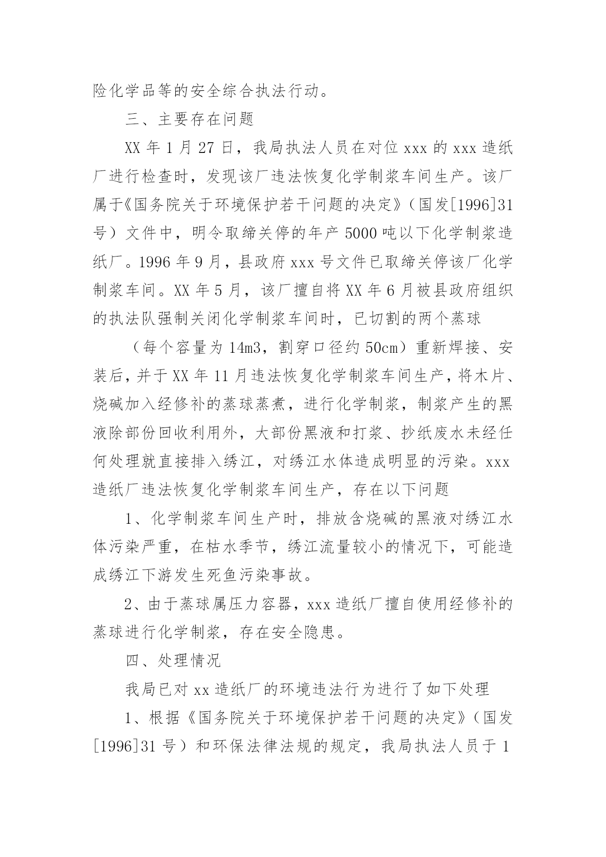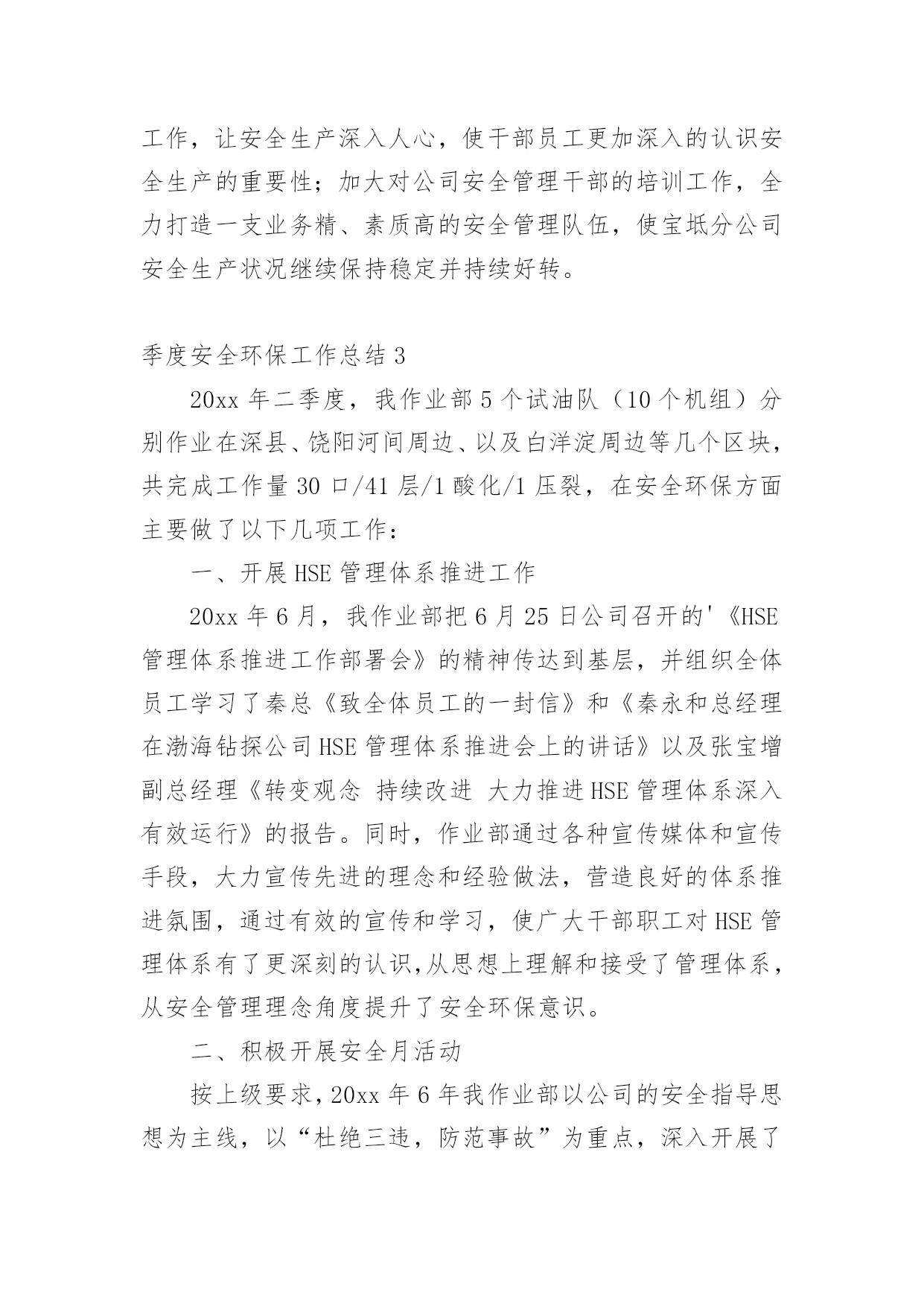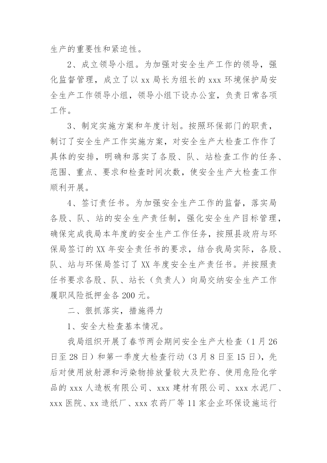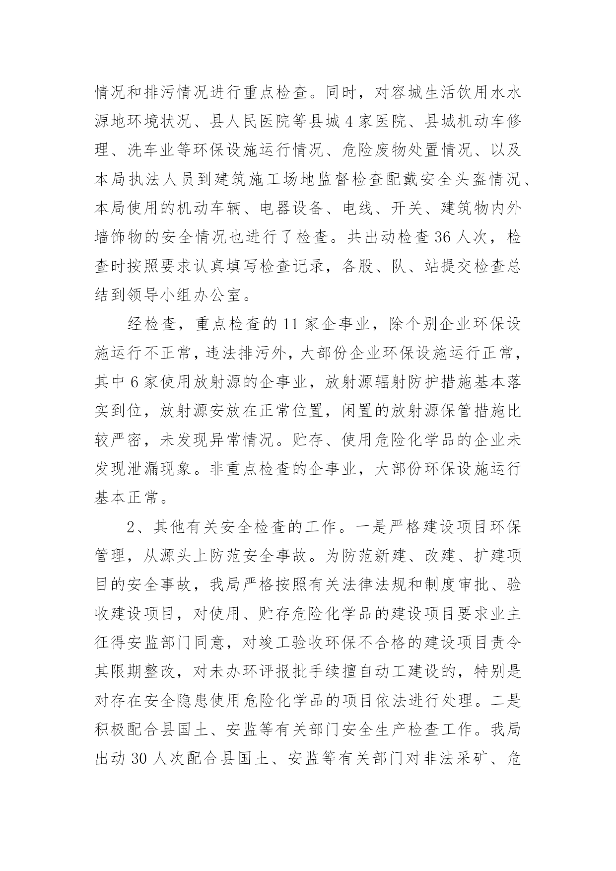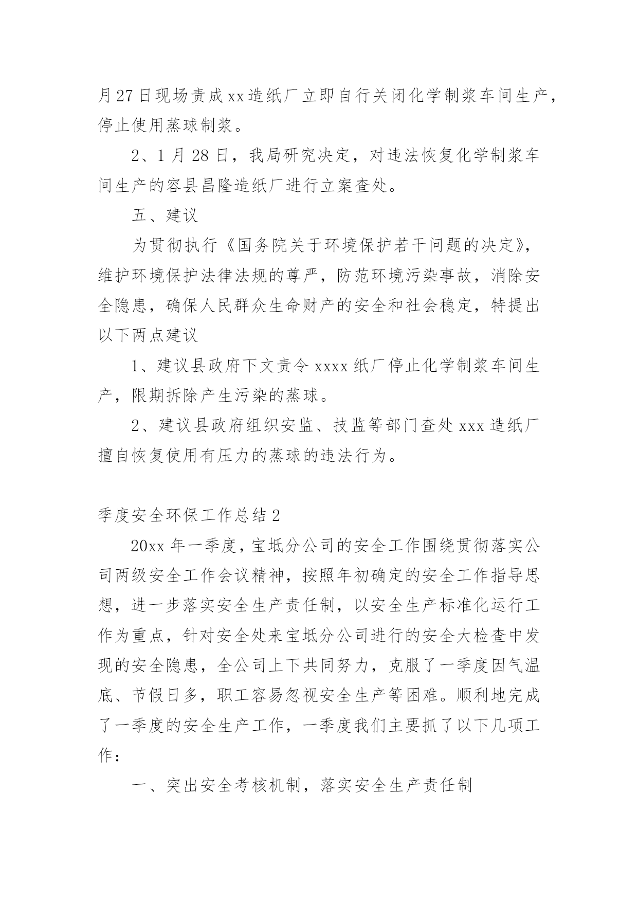 季度安全环保工作总结总结就是把一个时间段取得的成绩、存在的问题及得到的经验和教训进行一次全面系统的总结的书面材料,它可使零星的、肤浅的、表面的感性认知上升到全面的、系统的、本质的理性认识上来,不如立即行动起来写一份总结吧。你所见过的总结应该是什么样的?以下是小编为大家整理的季度安全环保工作总结,仅供参考,大家一起来看看吧。季度安全环保工作总结1为全面贯彻落实《安全生产法》、《国务院关于进一步加强安全生产工作的决定》,根据全国、全区、全市安全生产电视会议和xxXX年四季度防范重特大安全事故工作会议及《xx人民政府办公室关于立即开展XX年春季安全大检查的通知》的精神,确保春节、两会期间和春季人民群众的生命财产安全和社会稳定,防范发生环境污染和安全事故,杜绝发生重特大环境污染和安全事故。现将我局今年第一季度开展安全生产检查工作总结一、领导重视、精心组织1、提高认识,迅速传达有关会议文件精神。于1月4日和1月26日召开专题会议,传达县XX年四季度防范重特大安全事故工作会议和全国、全区、全市安全生产电视电话会议及文件精神,布置春节两会期间和第一季度安全生产大检查工作,使干部职工提高了对安全生产的认识,增强安全生产的重要性和紧迫性。2、成立领导小组。为加强对安全生产工作的领导,强化监督管理,成立了以xx局长为组长的xxx环境保护局安全生产工作领导小组,领导小组下设办公室,负责日常各项工作。3、制定实施方案和年度计划。按照环保部门的职责,制订了安全生产工作实施方案,对安全生产大检查工作作了具体的安排,明确和落实了各股、队、站检查工作的任务、范围、重点、要求和检查时间次数,使安全生产大检查工作顺利开展。4、签订责任书。为加强安全生产工作的监督,落实局各股、队、站的安全生产责任制,强化安全生产目标管理,确保完成我局本年度的安全生产工作任务,按照县政府与环保局签订的XX年安全责任书的要求,结合我局实际,各股、队、站与环保局签订了XX年度安全生产责任书。并按照责任书要求各股、队、站长(负责人)向局交纳安全生产工作履职风险抵押金各200元。二、狠抓落实,措施得力1、安全大检查基本情况。我局组织开展了春节两会期间安全生产大检查(1月26日至28日)和第一季度大检查行动(3月8日至15日),先后对使用放射源和污染物排放量较大及贮存、使用危险化学品的xxx人造板有限公司、xxx建材有限公司、xxx水泥厂、xxx医院、xx造纸厂、xxx农药厂等11家企业环保设施运行情况和排污情况进行重点检查。同时,对容城生活饮用水水源地环境状况、县人民医院等县城4家医院、县城机动车修理、洗车业等环保设施运行情况、危险废物处置情况、以及本局执法人员到建筑施工场地监督检查配戴安全头盔情况、本局使用的机动车辆、电器设备、电线、开关、建筑物内外墙饰物的安全情况也进行了检查。共出动检查36人次,检查时按照要求认真填写检查记录,各股、队、站提交检查总结到领导小组办公室。经检查,重点检查的11家企事业,除个别企业环保设施运行不正常,违法排污外,大部份企业环保设施运行正常,其中6家使用放射源的企事业,放射源辐射防护措施基本落实到位,放射源安放在正常位置,闲置的放射源保管措施比较严密,未发现异常情况。贮存、使用危险化学品的企业未发现泄漏现象。非重点检查的企事业,大部份环保设施运行基本正常。2、其他有关安全检查的工作。一是严格建设项目环保管理,从源头上防范安全事故。为防范新建、改建、扩建项目的安全事故,我局严格按照有关法律法规和制度审批、验收建设项目,对使用、贮存危险化学品的建设项目要求业主征得安监部门同意,对竣工验收环保不合格的建设项目责令其限期整改,对未办环评报批手续擅自动工建设的,特别是对存在安全隐患使用危险化学品的项目依法进行处理。二是积极配合县国土、安监等有关部门安全生产检查工作。我局出动30人次配合县国土、安监等有关部门对非法采矿、危险化学品等的安全综合执法行动。三、主要存在问题XX年1月27日,我局执法人员在对位xxx的xxx造纸厂进行检查时,发现该厂违法恢复化学制浆车间生产。该厂属于《国务院关于环境保护若干问题的决定》(国发[1996]31号)文件中,明令取缔关停的年产5000吨以下化学制浆造纸厂。1996年9月,县政府xxx号文件已取缔关停该厂化学制浆车间。XX年5月,该厂擅自将XX年6月被县政府组织的执法队强制关闭化学制浆车间时,已切割的两个蒸球(每个容量为14m3,割穿口径约50cm)重新焊接、安装后,并于XX年11月违法恢复化学制浆车间生产,将木片、烧碱加入经修补的蒸球蒸煮,进行化学制浆,制浆产生的黑液除部份回收利用外,大部份黑液和打浆、抄纸废水未经任何处理就直接排入绣江,对绣江水体造成明显的污染。xxx造纸厂违法恢复化学制浆车间生产,存在以下问题1、化学制浆车间生