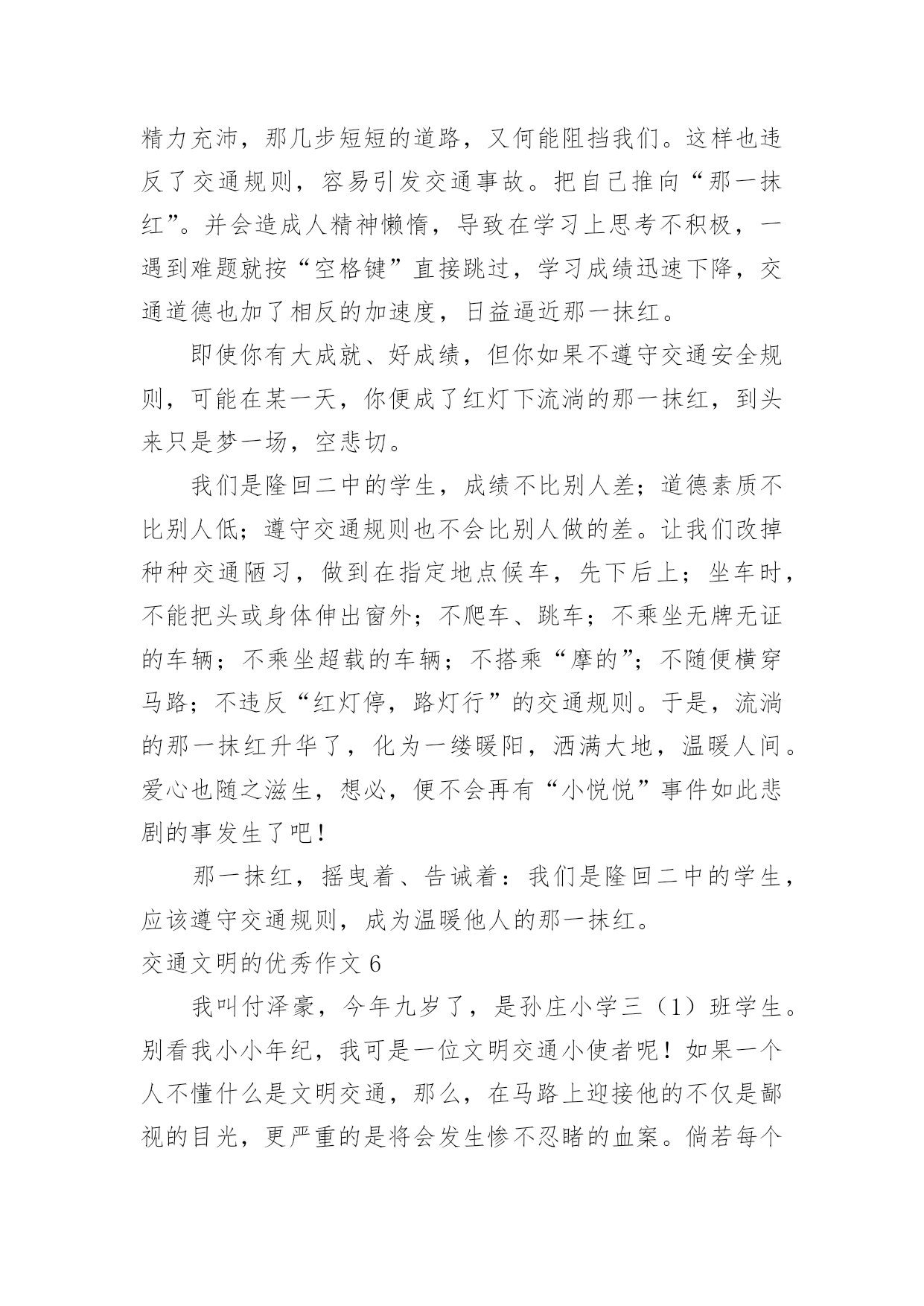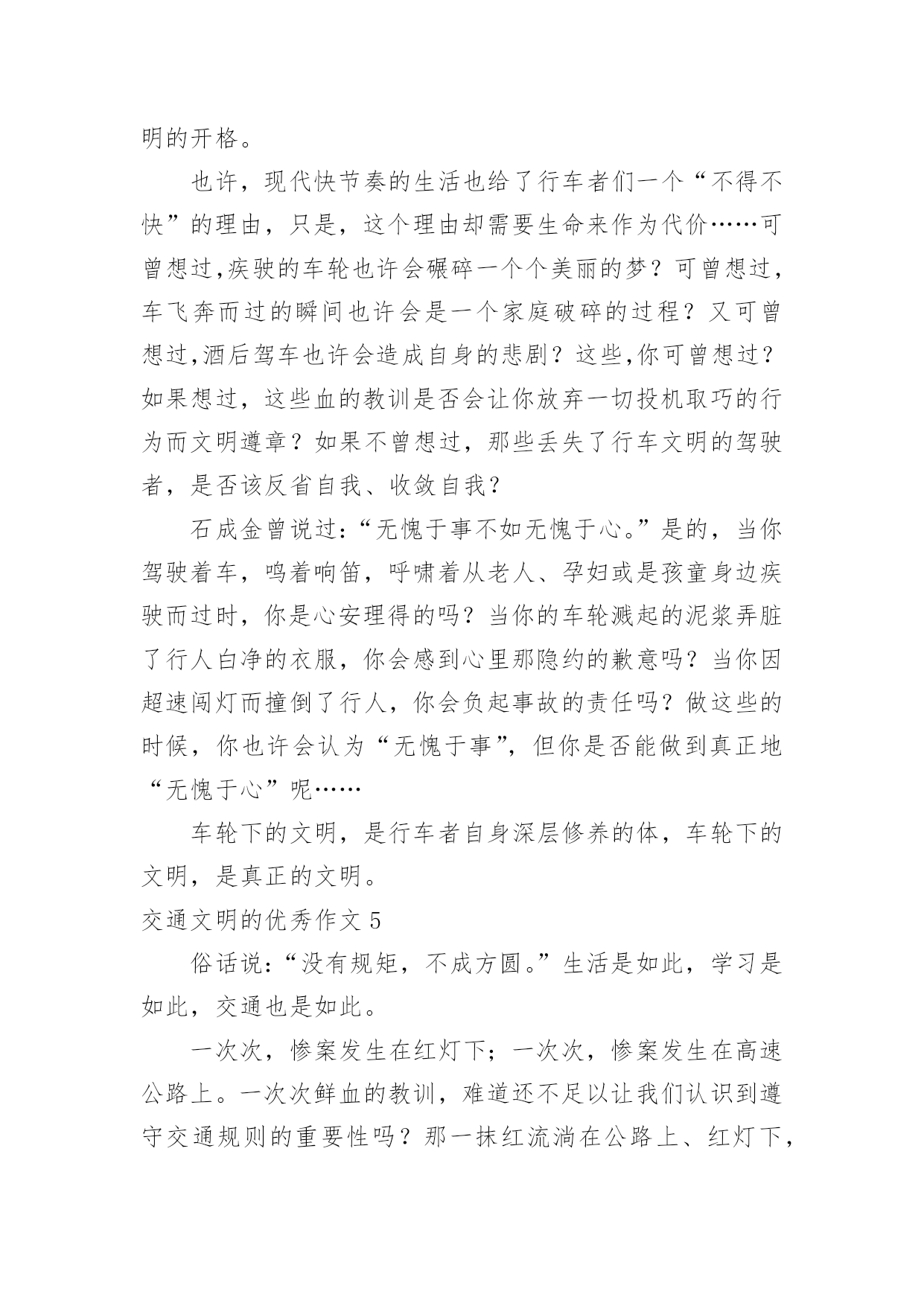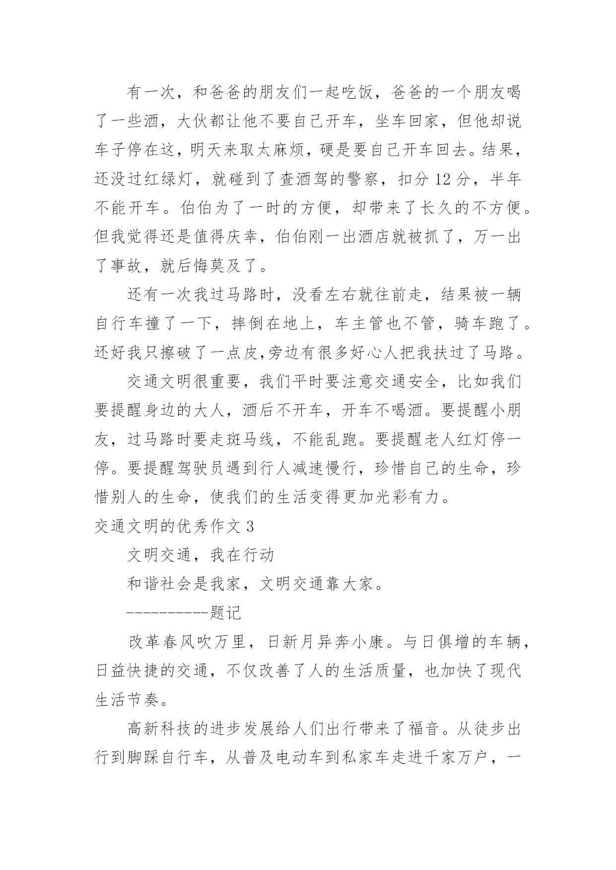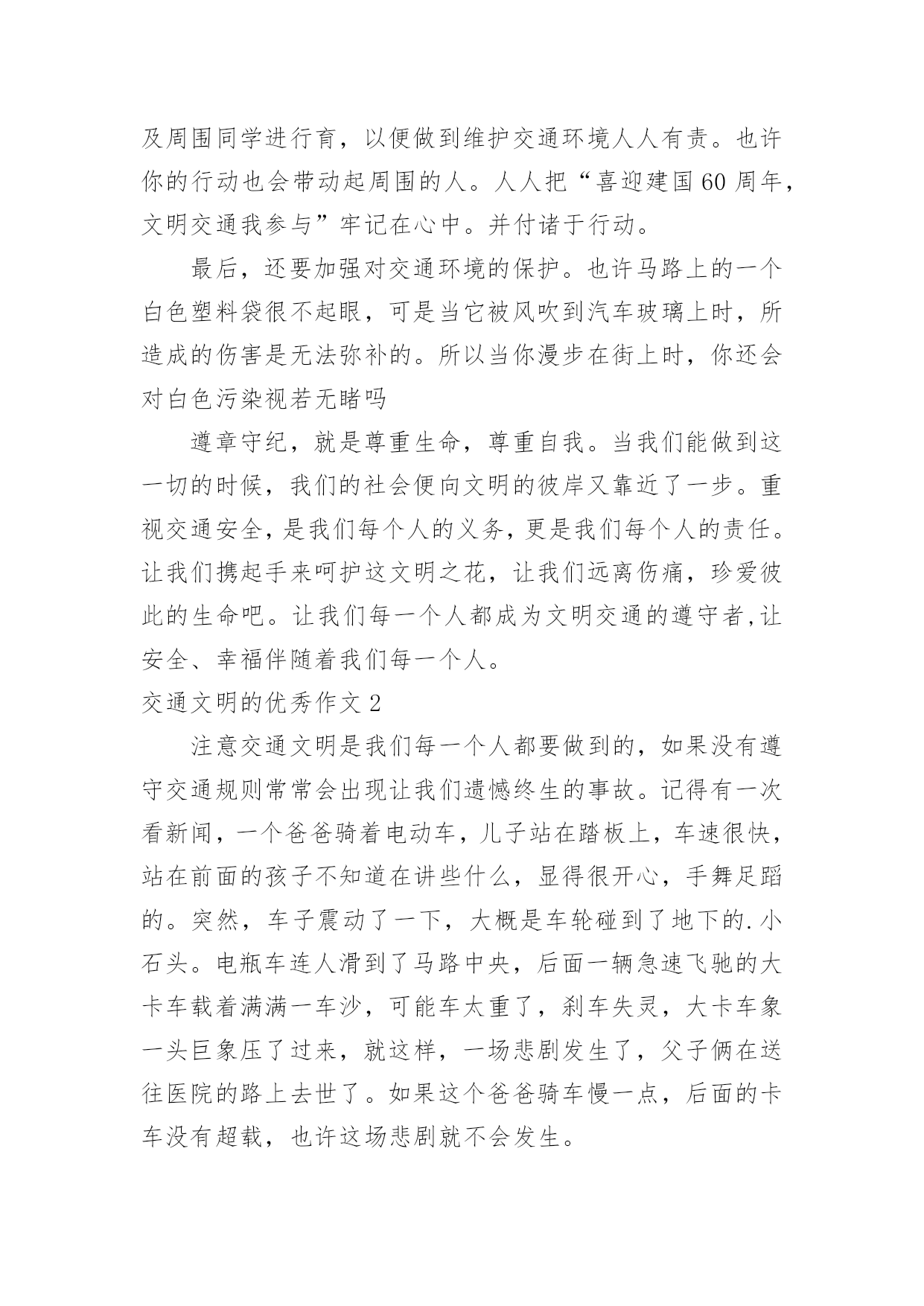 交通文明的优秀作文交通文明的优秀作文无论是在学校还是在社会中,大家都尝试过写作文吧,借助作文可以提高我们的语言组织能力。那要怎么写好作文呢?下面是小编帮大家整理的交通文明的优秀作文,仅供参考,大家一起来看看吧。交通文明的优秀作文1据资料记载,上个世纪80年代末至今,我国交通事故死亡人数已经连续十余年位居世界第一。根据全球各交通和警察部门的统计,去年全世界交通事故死亡人数为50万人!其中,中国交通事故死亡人数为10.4万人。在我们生活生活周围这些血淋淋的教训,警示我们“安全----生命之保障”。安全,就是生命之影,生命之血,生命之根,生命之魂。只要我们大家都牢固树立安全意识,那么在我们身边就不会有那么多触目惊心的事故发了。安全意识说大了,对社会来说关系到社会的发展,关系到社会的安定团结;说小了,对于个人家庭来说,关系到生命的延续,关系到家庭的美满、幸福。因此,每个人的安全意识关系到社会的安定团结;关系到生命的延续,关系到家庭的美满、幸福。交通是为“人”服务的,而交通事故的发生又让人们清楚地看到了“人”对交通法规忽视的结果。交通事故死亡人数在各项非正常死亡人数中高居榜首。交通事故导致人员伤亡的血淋淋的事实告诉人们要全面加强社会管理,告别违章,告别事故,维持有秩序的`交通,才是人车畅通和安全的前提条件。交通是文明的窗口。交通状况的好坏,直接反映一个地区的发展水平和市民素质的高低。交通环境的好坏,关系到社会经济的可持续发展和对外开放的形象,关系到我们的工作、学习和生活的质量。交通连着你我他,安全畅通靠大家。改善交通环境离不开大家的努力,只有广大市民从我做起,自觉遵守交通规则,革除交通陋习,树立文明新风,一个有序、安全、畅通的城区交通环境,才会呈现在我们面前,惠及广大市民百姓。作为中学生的我们,则更应该尽一份力:首先,我们应身体力行,以身作则,用实际行动参与交通环境建设,尽量杜绝交通事故的发生。在日常的生活中,应严格遵守交通规则,珍惜生命,安全出行,每天上下学过马路时应注意看红绿灯及走斑马线,不要因为图一两秒中的便利而造成不必要的损失与过错。一分钟的时间在红灯前是那么的短暂,驻足停留是最佳的选择;快步如飞所带来的遗憾将会是终生的。其次,我们要做好宣传工作。作为一名初中生,已具有清醒的头脑和较强的社交能力。所以,我们要在自身基础上,认真学习交通安全知识并努力贯彻实施,在自己家所在的社区或村委会进行宣传。同时,也要向所在学校,宣传教班级及周围同学进行育,以便做到维护交通环境人人有责。也许你的行动也会带动起周围的人。人人把“喜迎建国60周年,文明交通我参与”牢记在心中。并付诸于行动。最后,还要加强对交通环境的保护。也许马路上的一个白色塑料袋很不起眼,可是当它被风吹到汽车玻璃上时,所造成的伤害是无法弥补的。所以当你漫步在街上时,你还会对白色污染视若无睹吗遵章守纪,就是尊重生命,尊重自我。当我们能做到这一切的时候,我们的社会便向文明的彼岸又靠近了一步。重视交通安全,是我们每个人的义务,更是我们每个人的责任。让我们携起手来呵护这文明之花,让我们远离伤痛,珍爱彼此的生命吧。让我们每一个人都成为文明交通的遵守者,让安全、幸福伴随着我们每一个人。交通文明的优秀作文2注意交通文明是我们每一个人都要做到的,如果没有遵守交通规则常常会出现让我们遗憾终生的事故。记得有一次看新闻,一个爸爸骑着电动车,儿子站在踏板上,车速很快,站在前面的孩子不知道在讲些什么,显得很开心,手舞足蹈的。突然,车子震动了一下,大概是车轮碰到了地下的.小石头。电瓶车连人滑到了马路中央,后面一辆急速飞驰的大卡车载着满满一车沙,可能车太重了,刹车失灵,大卡车象一头巨象压了过来,就这样,一场悲剧发生了,父子俩在送往医院的路上去世了。如果这个爸爸骑车慢一点,后面的卡车没有超载,也许这场悲剧就不会发生。有一次,和爸爸的朋友们一起吃饭,爸爸的一个朋友喝了一些酒,大伙都让他不要自己开车,坐车回家,但他却说车子停在这,明天来取太麻烦,硬是要自己开车回去。结果,还没过红绿灯,就碰到了查酒驾的警察,扣分12分,半年不能开车。伯伯为了一时的方便,却带来了长久的不方便。但我觉得还是值得庆幸,伯伯刚一出酒店就被抓了,万一出了事故,就后悔莫及了。还有一次我过马路时,没看左右就往前走,结果被一辆自行车撞了一下,摔倒在地上,车主管也不管,骑车跑了。还好我只擦破了一点皮,旁边有很多好心人把我扶过了马路。交通文明很重要,我们平时要注意交通安全,比如我们要提醒身边的大人,酒后不开车,开车不喝酒。要提醒小朋友,过马路时要走斑马线,不能乱跑。要提醒老人红灯停一停。要提醒驾驶员遇到行人减速慢行,珍惜自己的生命,珍惜别人的生命,使我们的生活变得更加光彩有力。交通文明的优秀作文3文明交通,我在行动和谐社会是我家,文明交通靠大家。--