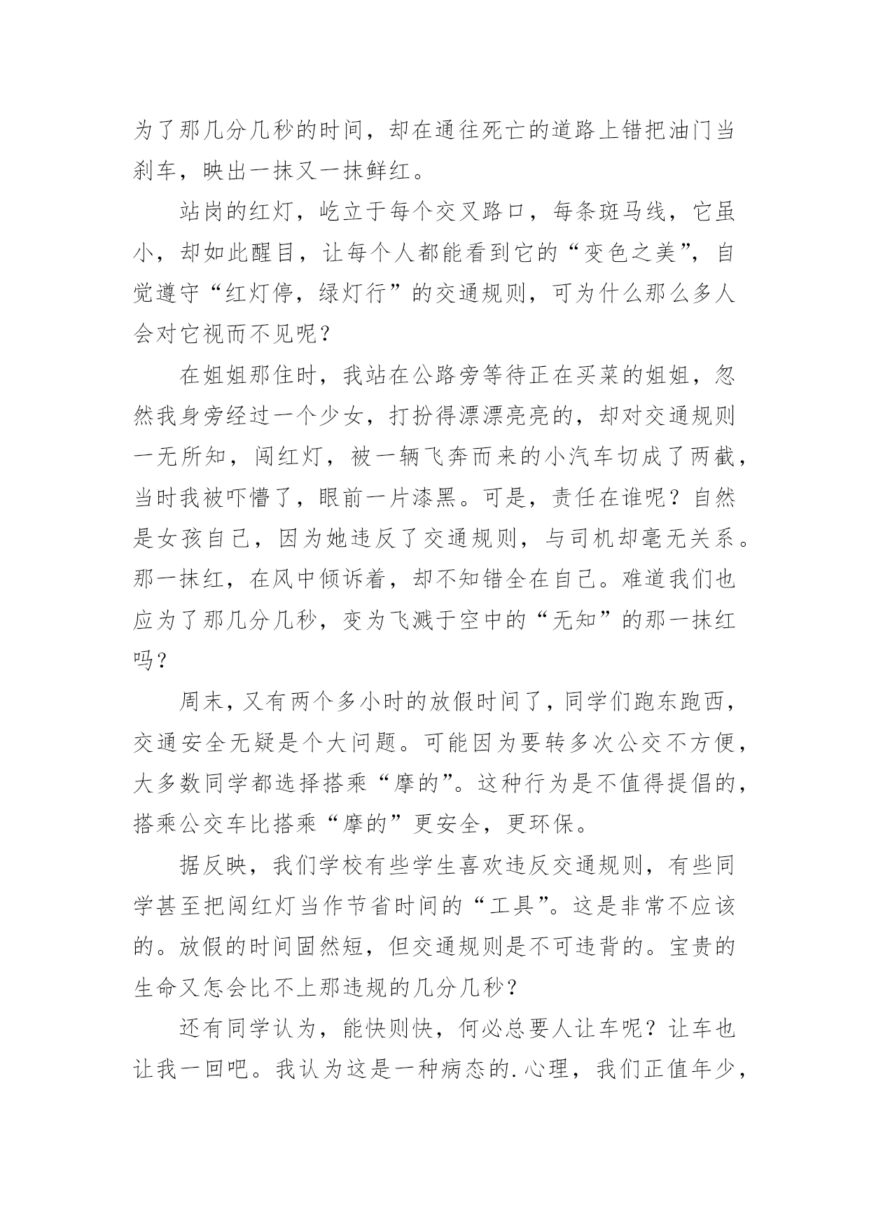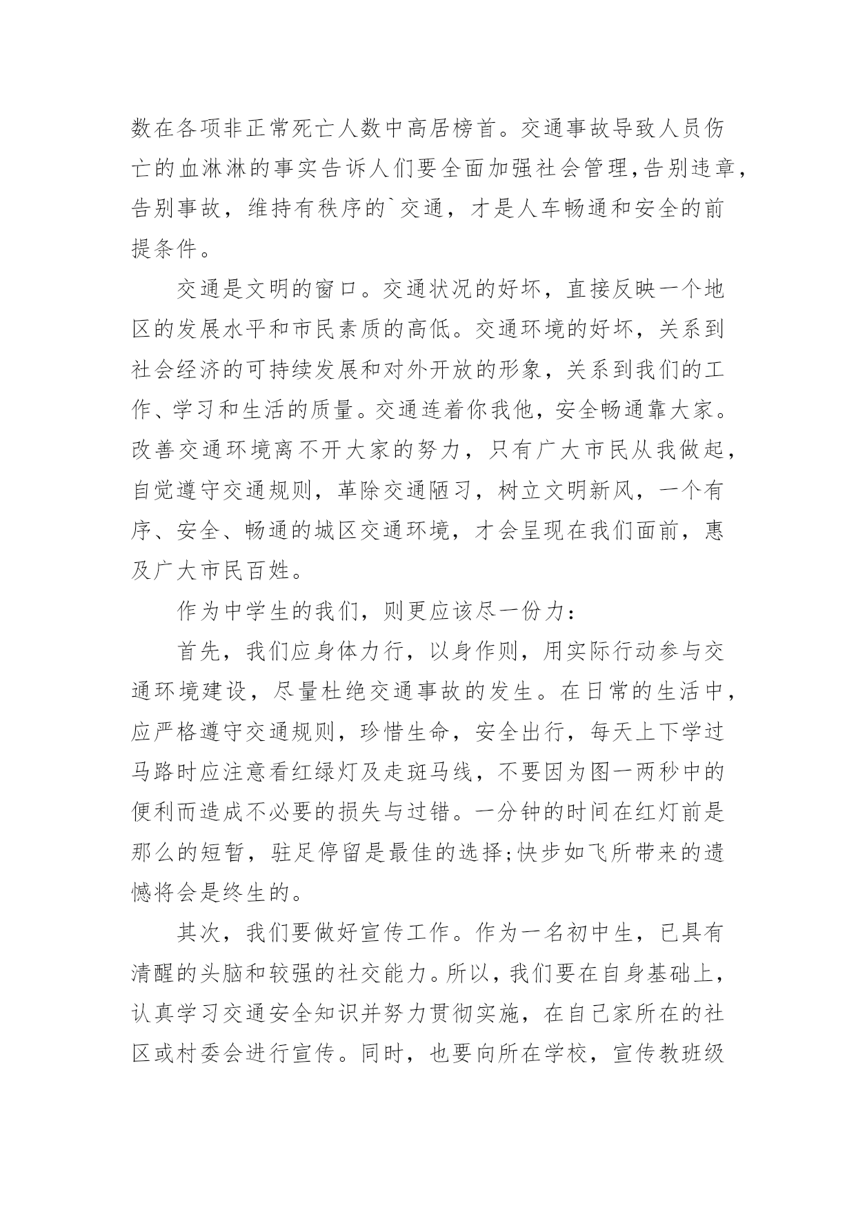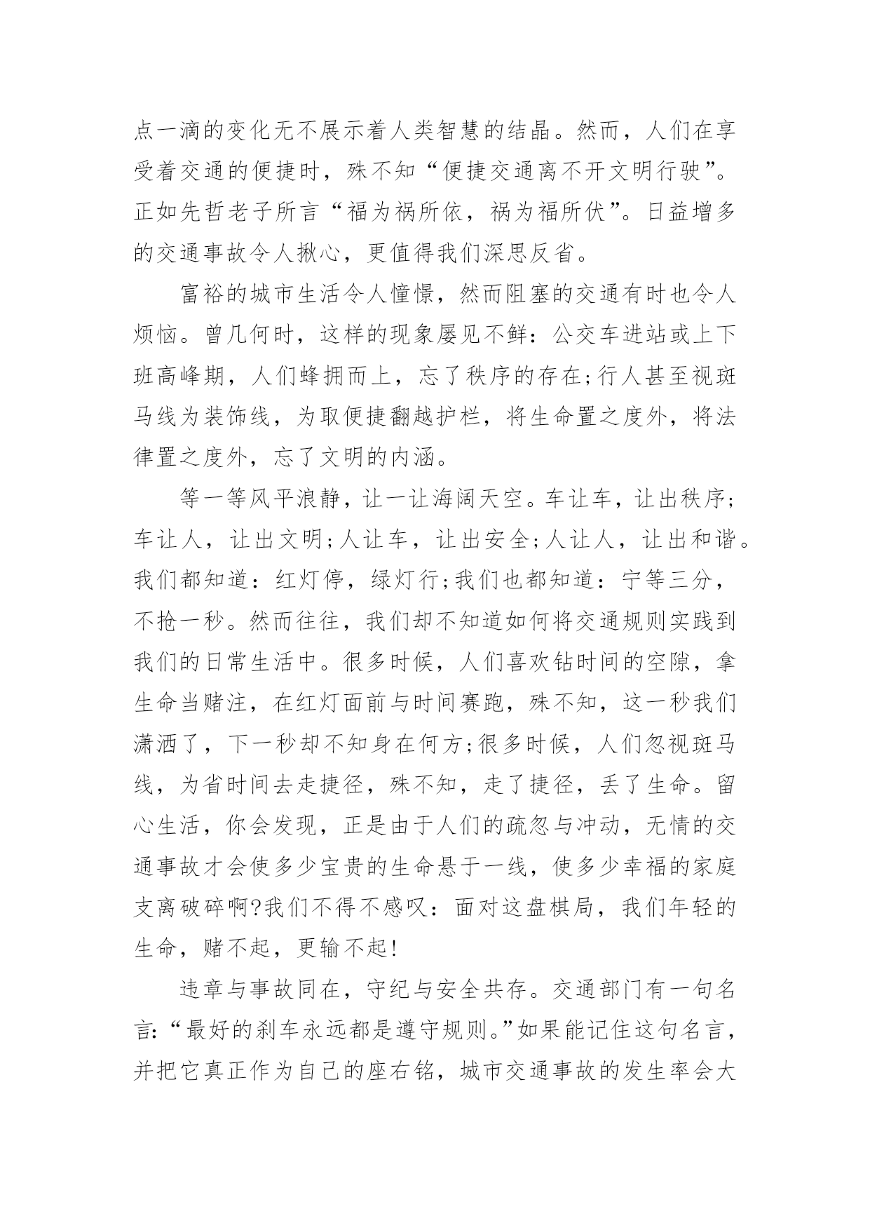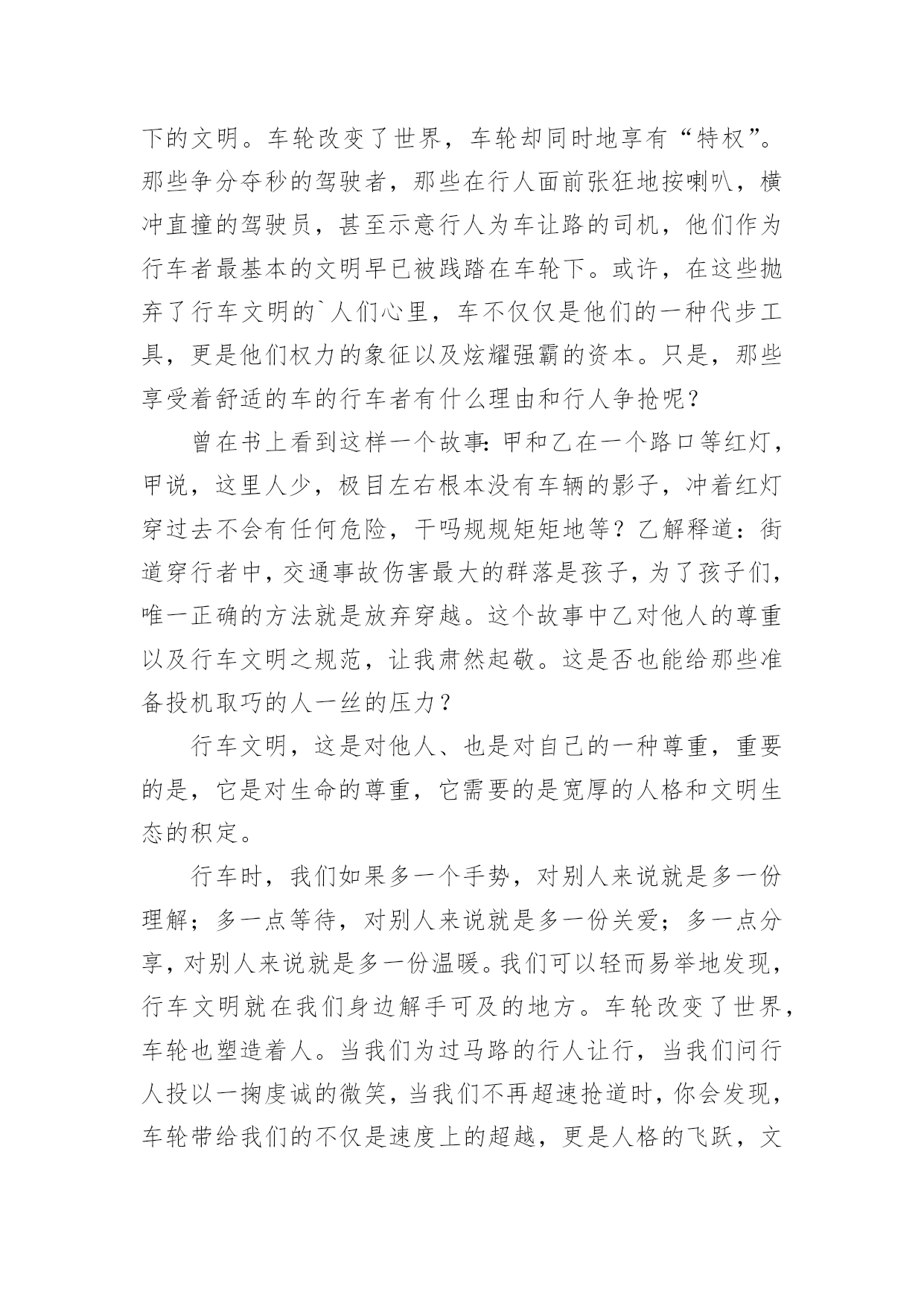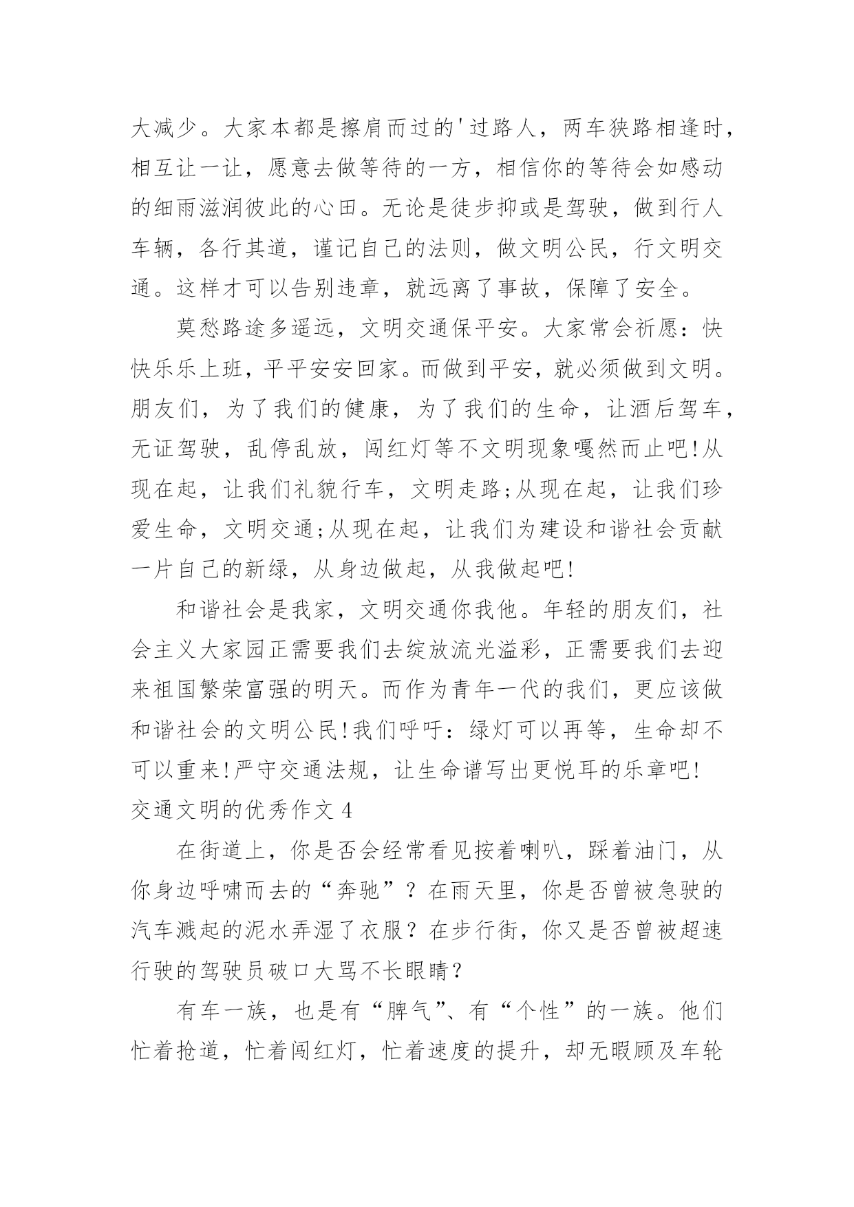 交通文明的优秀作文交通文明的优秀作文无论是在学校还是在社会中,大家都尝试过写作文吧,借助作文可以提高我们的语言组织能力。那要怎么写好作文呢?下面是小编帮大家整理的交通文明的优秀作文,仅供参考,大家一起来看看吧。交通文明的优秀作文1据资料记载,上个世纪80年代末至今,我国交通事故死亡人数已经连续十余年位居世界第一。根据全球各交通和警察部门的统计,去年全世界交通事故死亡人数为50万人!其中,中国交通事故死亡人数为10.4万人。在我们生活生活周围这些血淋淋的教训,警示我们“安全----生命之保障”。安全,就是生命之影,生命之血,生命之根,生命之魂。只要我们大家都牢固树立安全意识,那么在我们身边就不会有那么多触目惊心的事故发了。安全意识说大了,对社会来说关系到社会的发展,关系到社会的安定团结;说小了,对于个人家庭来说,关系到生命的延续,关系到家庭的美满、幸福。因此,每个人的安全意识关系到社会的安定团结;关系到生命的延续,关系到家庭的美满、幸福。交通是为“人”服务的,而交通事故的发生又让人们清楚地看到了“人”对交通法规忽视的结果。交通事故死亡人数在各项非正常死亡人数中高居榜首。交通事故导致人员伤亡的血淋淋的事实告诉人们要全面加强社会管理,告别违章,告别事故,维持有秩序的`交通,才是人车畅通和安全的前提条件。交通是文明的窗口。交通状况的好坏,直接反映一个地区的发展水平和市民素质的高低。交通环境的好坏,关系到社会经济的可持续发展和对外开放的形象,关系到我们的工作、学习和生活的质量。交通连着你我他,安全畅通靠大家。改善交通环境离不开大家的努力,只有广大市民从我做起,自觉遵守交通规则,革除交通陋习,树立文明新风,一个有序、安全、畅通的城区交通环境,才会呈现在我们面前,惠及广大市民百姓。作为中学生的我们,则更应该尽一份力:首先,我们应身体力行,以身作则,用实际行动参与交通环境建设,尽量杜绝交通事故的发生。在日常的生活中,应严格遵守交通规则,珍惜生命,安全出行,每天上下学过马路时应注意看红绿灯及走斑马线,不要因为图一两秒中的便利而造成不必要的损失与过错。一分钟的时间在红灯前是那么的短暂,驻足停留是最佳的选择;快步如飞所带来的遗憾将会是终生的。其次,我们要做好宣传工作。作为一名初中生,已具有清醒的头脑和较强的社交能力。所以,我们要在自身基础上,认真学习交通安全知识并努力贯彻实施,在自己家所在的社区或村委会进行宣传。同时,也要向所在学校,宣传教班级及周围同学进行育,以便做到维护交通环境人人有责。也许你的行动也会带动起周围的人。人人把“喜迎建国60周年,文明交通我参与”牢记在心中。并付诸于行动。最后,还要加强对交通环境的保护。也许马路上的一个白色塑料袋很不起眼,可是当它被风吹到汽车玻璃上时,所造成的伤害是无法弥补的。所以当你漫步在街上时,你还会对白色污染视若无睹吗遵章守纪,就是尊重生命,尊重自我。当我们能做到这一切的时候,我们的社会便向文明的彼岸又靠近了一步。重视交通安全,是我们每个人的义务,更是我们每个人的责任。让我们携起手来呵护这文明之花,让我们远离伤痛,珍爱彼此的生命吧。让我们每一个人都成为文明交通的遵守者,让安全、幸福伴随着我们每一个人。交通文明的优秀作文2注意交通文明是我们每一个人都要做到的,如果没有遵守交通规则常常会出现让我们遗憾终生的事故。记得有一次看新闻,一个爸爸骑着电动车,儿子站在踏板上,车速很快,站在前面的孩子不知道在讲些什么,显得很开心,手舞足蹈的。突然,车子震动了一下,大概是车轮碰到了地下的.小石头。电瓶车连人滑到了马路中央,后面一辆急速飞驰的大卡车载着满满一车沙,可能车太重了,刹车失灵,大卡车象一头巨象压了过来,就这样,一场悲剧发生了,父子俩在送往医院的路上去世了。如果这个爸爸骑车慢一点,后面的卡车没有超载,也许这场悲剧就不会发生。有一次,和爸爸的朋友们一起吃饭,爸爸的一个朋友喝了一些酒,大伙都让他不要自己开车,坐车回家,但他却说车子停在这,明天来取太麻烦,硬是要自己开车回去。结果,还没过红绿灯,就碰到了查酒驾的警察,扣分12分,半年不能开车。伯伯为了一时的方便,却带来了长久的不方便。但我觉得还是值得庆幸,伯伯刚一出酒店就被抓了,万一出了事故,就后悔莫及了。还有一次我过马路时,没看左右就往前走,结果被一辆自行车撞了一下,摔倒在地上,车主管也不管,骑车跑了。还好我只擦破了一点皮,旁边有很多好心人把我扶过了马路。交通文明很重要,我们平时要注意交通安全,比如我们要提醒身边的大人,酒后不开车,开车不喝酒。要提醒小朋友,过马路时要走斑马线,不能乱跑。要提醒老人红灯停一停。要提醒驾驶员遇到行人减速慢行,珍惜自己的生命,珍惜别人的生命,使我们的生活变得更加光彩有力。交通文明的优秀作文3文明交通,我在行动和谐社会是我家,文明交通靠大家。--