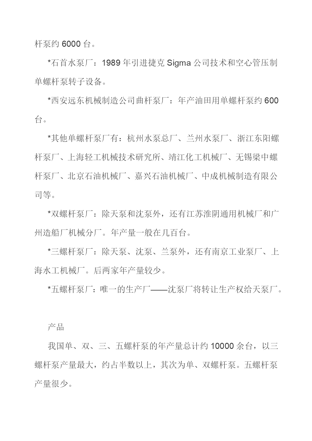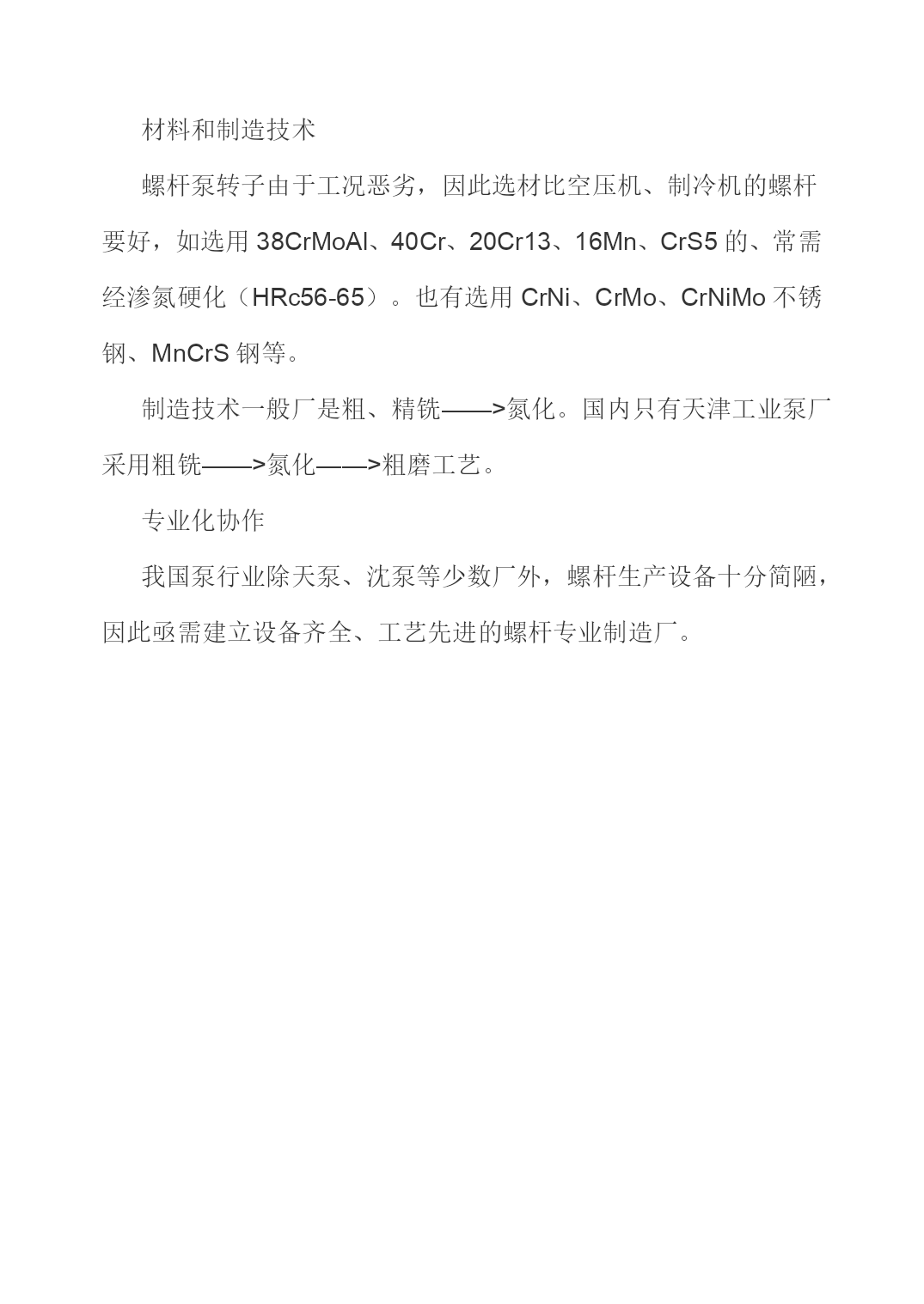 我国螺杆泵产品制造技术发展过程及现状发展史单螺杆泵是1932年由法国工程师Moineau发明,并由德国PCM泵公司制成产品。三螺杆泵是1931年由瑞典IMO公司发明并制造的。我国天津市工业泵厂于60年代初研制成功船用高压小流量三螺杆泵,并扩展为单、双、三螺杆泵专业厂。沈阳水泵厂于60年代中期研制生产双、三螺杆泵,70年代研制成功五螺杆泵。天津工业泵厂于1984年引进德国Allweiler公司的制造技术和英国Holroyd公司的2AC螺杆铣床和配套设备后,我国才开始批量生产螺杆泵。比国外整整落后了20年。企业经过1984年以来十多年的发展,我国目前已有螺杆泵专业厂近30家。主要厂家有:*天津市工业泵厂:1984年引进Allweiler公司制造技术、英Holroyd公司2AC螺杆铣床一台及其配套设备,1993年引进德国Bornemann公司技术、奥地利Linsinger公司数控螺杆旋风铣床一台、和2AC——L,5AC螺杆铣床各一台,1998年引进德国Klingelnberg公司HNC35SL全部控高精度螺杆磨床一台。年产单、双、三螺杆泵约6000台。*石首水泵厂:1989年引进捷克Sigma公司技术和空心管压制单螺杆泵转子设备。*西安远东机械制造公司曲杆泵厂:年产油田用单螺杆泵约600台。*其他单螺杆泵厂有:杭州水泵总厂、兰州水泵厂、浙江东阳螺杆泵厂、上海轻工机械技术研究所、靖江化工机械厂、无锡梁中螺杆泵厂、北京石油机械厂、嘉兴石油机械厂、中成机械制造有限公司等。*双螺杆泵厂:除天泵和沈泵外,还有江苏淮阴通用机械厂和广州造船厂机械分厂。年产量一般在几百台。*三螺杆泵厂:除天泵、沈泵、兰泵外,还有南京工业泵厂、上海水工机械厂。后两家年产量较少。*五螺杆泵厂:唯一的生产厂——沈泵厂将转让生产权给天泵厂。产品我国单、双、三、五螺杆泵的年产量总计约10000余台,以三螺杆泵产量最大,约占半数以上,其次为单、双螺杆泵。五螺杆泵产量很少。材料和制造技术螺杆泵转子由于工况恶劣,因此选材比空压机、制冷机的螺杆要好,如选用38CrMoAl、40Cr、20Cr13、16Mn、CrS5的、常需经渗氮硬化(HRc56-65)。也有选用CrNi、CrMo、CrNiMo不锈钢、MnCrS钢等。制造技术一般厂是粗、精铣——>氮化。国内只有天津工业泵厂采用粗铣——>氮化——>粗磨工艺。专业化协作我国泵行业除天泵、沈泵等少数厂外,螺杆生产设备十分简陋,因此亟需建立设备齐全、工艺先进的螺杆专业制造厂。