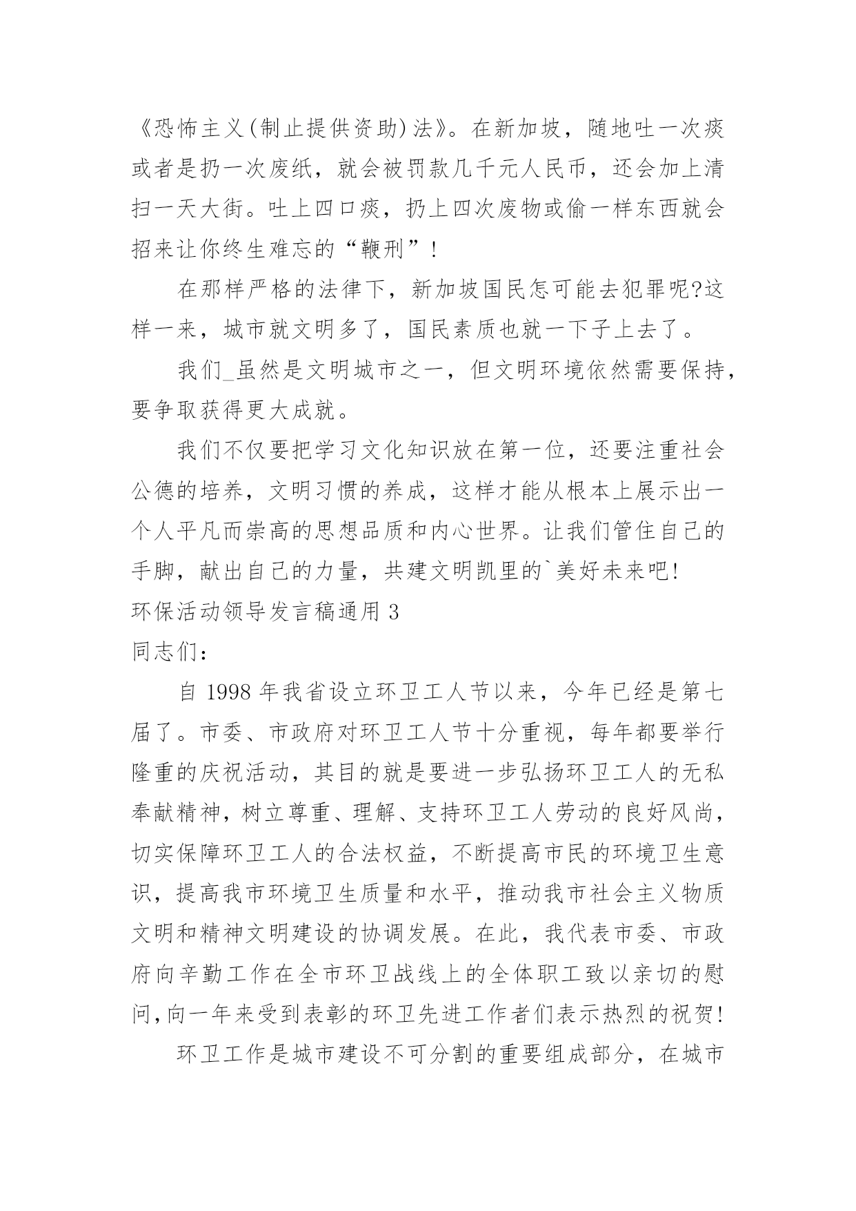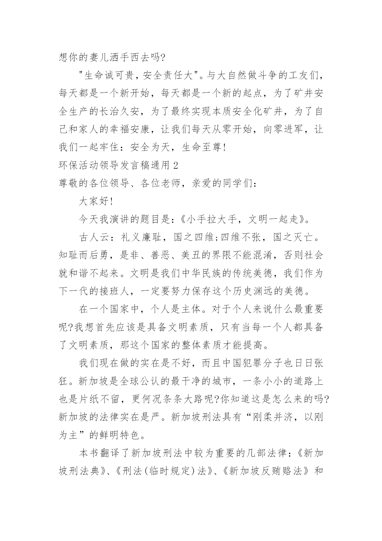 环保活动领导发言稿环保活动领导发言稿通用在社会一步步向前发展的今天,需要使用发言稿的事情愈发增多,发言稿特别注重结构清楚,层次简明。怎样写发言稿才能更好地发挥其做用呢?以下是小编整理的环保活动领导发言稿通用,希望对大家有所帮助。环保活动领导发言稿通用1尊敬的各位领导,各位员工:大家好!朋友,当您每天上下班的时候,您的心中是否惦记着安全呢?当您即将坐在人力车上奔往工作面的时候,您是否想到了今天我要安全生产呢?当您在工作岗位上违章的一刹那,您是否会想到因为我的一个小小的、小小的违章,会导致事故的发生而使自己或者工友的生命受到伤害呢?如果,您还没有,那请让我提醒您,时刻牢记"安全为天,生命至尊"。人的生命只有一次,每一个人都想笑语长在,每一个家庭都愿幸福美满,每一个企业都愿兴旺发达,然而这一切都离不开安全,安全是企业发展的永恒主题,是我们煤矿企业的天字号大事,更是我们矿工的生命。没有了安全就谈不上我们企业的稳定发展,没有了安全也就更谈不上我们职工的幸福生活。然而由于我们安全理念没有深入人心,部分干群不重视安全、不讲安全、不懂安全、不要安全;由于我们少数干群安全意识淡薄,对安全工作,说起来重要、干起来次要、忙起来不要,违章指挥、违章操作;由于我们的作业规程和安全规程不能在现场真正的落实等等,等等的一些原因,安全事故就象苞米花一样接二连三,一起又一起的发生,吞噬着我们的生命,毁坏着我们的幸福。"前车之鉴,后事之师",安全工作永远是"从零开始,向零进军"。曾经的苦难和屈辱,更加坚定了我们对安全工作的决心,在艰难而又曲折的道路中,我们从积极建设企业的安全文化建设、提高职工安全意识入手,从争做本质安全型矿工做起;我们从精细化管理、落实安全生产责任制着手,从创建标准化区队、标准化班组、标准化岗位做起,我们用"猛药"治"三违",用"重锤"砸"隐患",我们要用行动告诉大家:杜绝三违,远离事故。我们的目标是:让安全成为一种习惯,让行为变得更安全。我们脚踏实地,我们信心百倍,因为我们心中永远有一个不变的理念"安全为天、生命至尊"。安全伴随着家庭的稳定,社会的繁荣、发展和进步,安全是人民生存和发展最基本的条件,一个企业如果连起码的安全生产都不能保障,还谈什么效益,一个人如果没有生命,就谈不上生活,对自己、对家人更谈得上什么生活幸福。朋友,生命对于每个人来说只有仅仅的一次,我们没有理由不珍爱自己的生命呀?难道你真的就愿意愧对那日夜翘首盼你平安归来的老父老母?难道你真的就忍心撇下那爱你、疼你、想你的妻儿洒手西去吗?"生命诚可贵,安全责任大"。与大自然做斗争的工友们,每天都是一个新开始,每天都是一个新的起点,为了矿井安全生产的长治久安,为了最终实现本质安全化矿井,为了自己和家人的幸福安康,让我们每天从零开始,向零进军,让我们一起牢住:安全为天,生命至尊!环保活动领导发言稿通用2尊敬的各位领导、各位老师,亲爱的同学们:大家好!今天我演讲的题目是:《小手拉大手,文明一起走》。古人云:礼义廉耻,国之四维;四维不张,国之灭亡。知耻而后勇,是非、善恶、美丑的界限不能混淆,否则社会就和谐不起来。文明是我们中华民族的传统美德,我们作为下一代的接班人,一定要努力保存这个历史渊远的美德。在一个国家中,个人是主体。对于个人来说什么最重要呢?我想首先应该是具备文明素质,只有当每一个人都具备了文明素质,那这个国家的整体素质才能提高。我们现在做的实在是不好,而且中国犯罪分子也日日张狂。新加坡是全球公认的最干净的城市,一条小小的道路上也是片纸不留,更何况条条大路呢?你知道这是怎么来的吗?新加坡的法律实在是严。新加坡刑法具有“刚柔并济,以刚为主”的鲜明特色。本书翻译了新加坡刑法中较为重要的几部法律:《新加坡刑法典》、《刑法(临时规定)法》、《新加坡反贿赂法》和《恐怖主义(制止提供资助)法》。在新加坡,随地吐一次痰或者是扔一次废纸,就会被罚款几千元人民币,还会加上清扫一天大街。吐上四口痰,扔上四次废物或偷一样东西就会招来让你终生难忘的“鞭刑”!在那样严格的法律下,新加坡国民怎可能去犯罪呢?这样一来,城市就文明多了,国民素质也就一下子上去了。我们_虽然是文明城市之一,但文明环境依然需要保持,要争取获得更大成就。我们不仅要把学习文化知识放在第一位,还要注重社会公德的培养,文明习惯的养成,这样才能从根本上展示出一个人平凡而崇高的思想品质和内心世界。让我们管住自己的手脚,献出自己的力量,共建文明凯里的`美好未来吧!环保活动领导发言稿通用3同志们:自1998年我省设立环卫工人节以来,今年已经是第七届了。市委、市政府对环卫工人节十分重视,每年都要举行隆重的庆祝活动,其目的就是要进一步弘扬环卫工人的无私奉献精神,树立尊重、理解、支持环卫工人劳动的良好风尚,切实保障环卫工人的合法权益,不断提高市民的环境