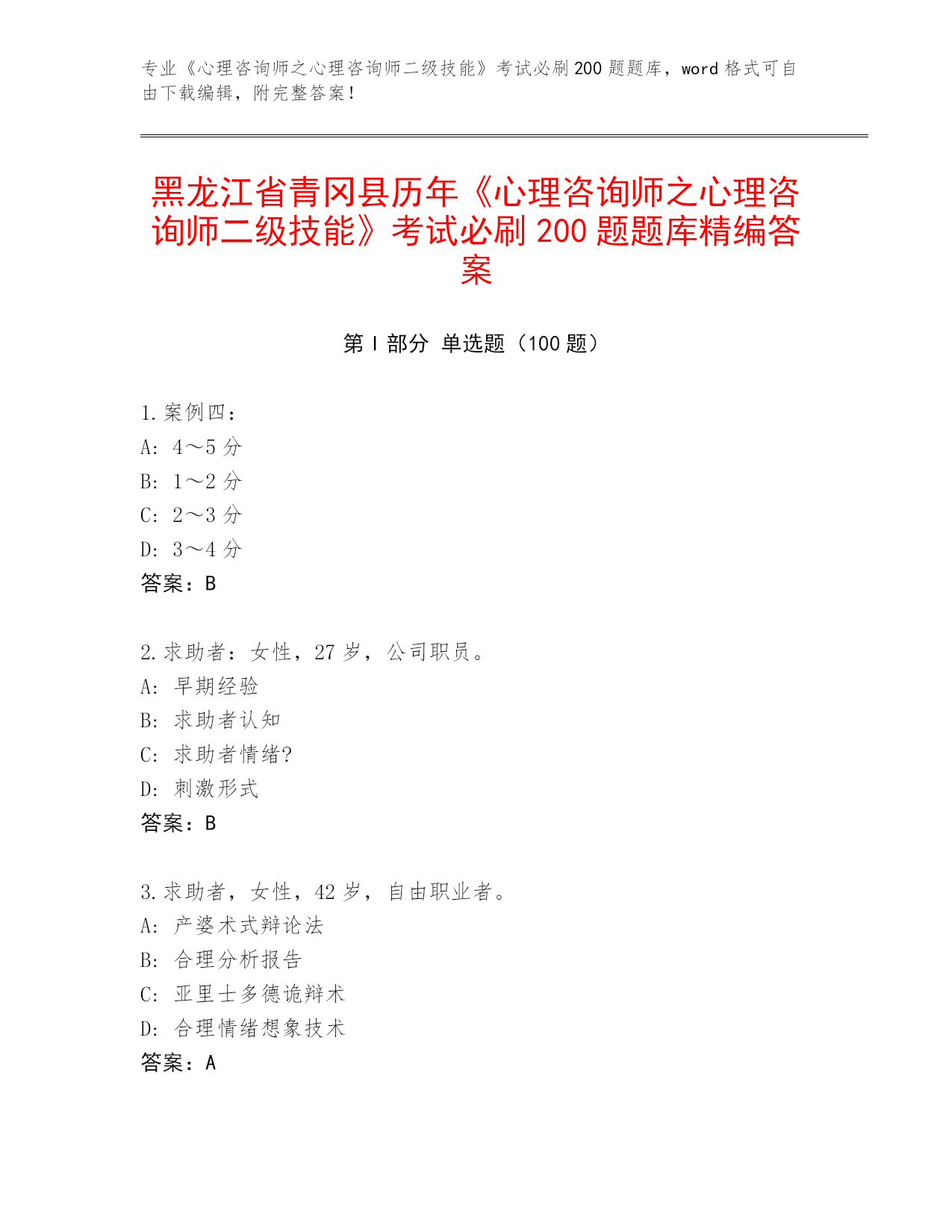 黑龙江省青冈县历年《心理咨询师之心理咨询师二级技能》考试必刷200题题库精编答案