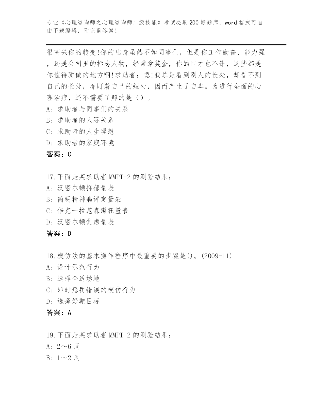 黑龙江省历年《心理咨询师之心理咨询师二级技能》资格考试必刷200题题库及答案()