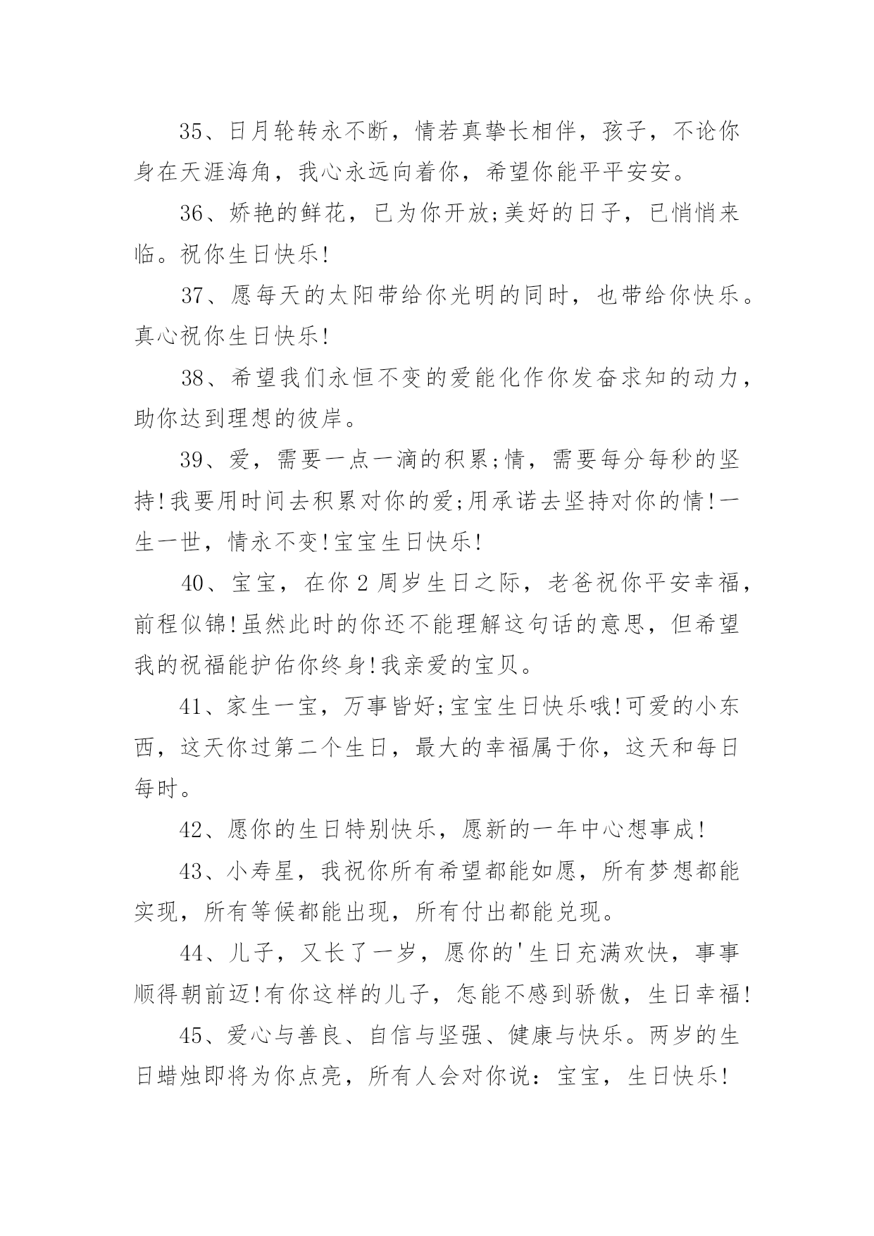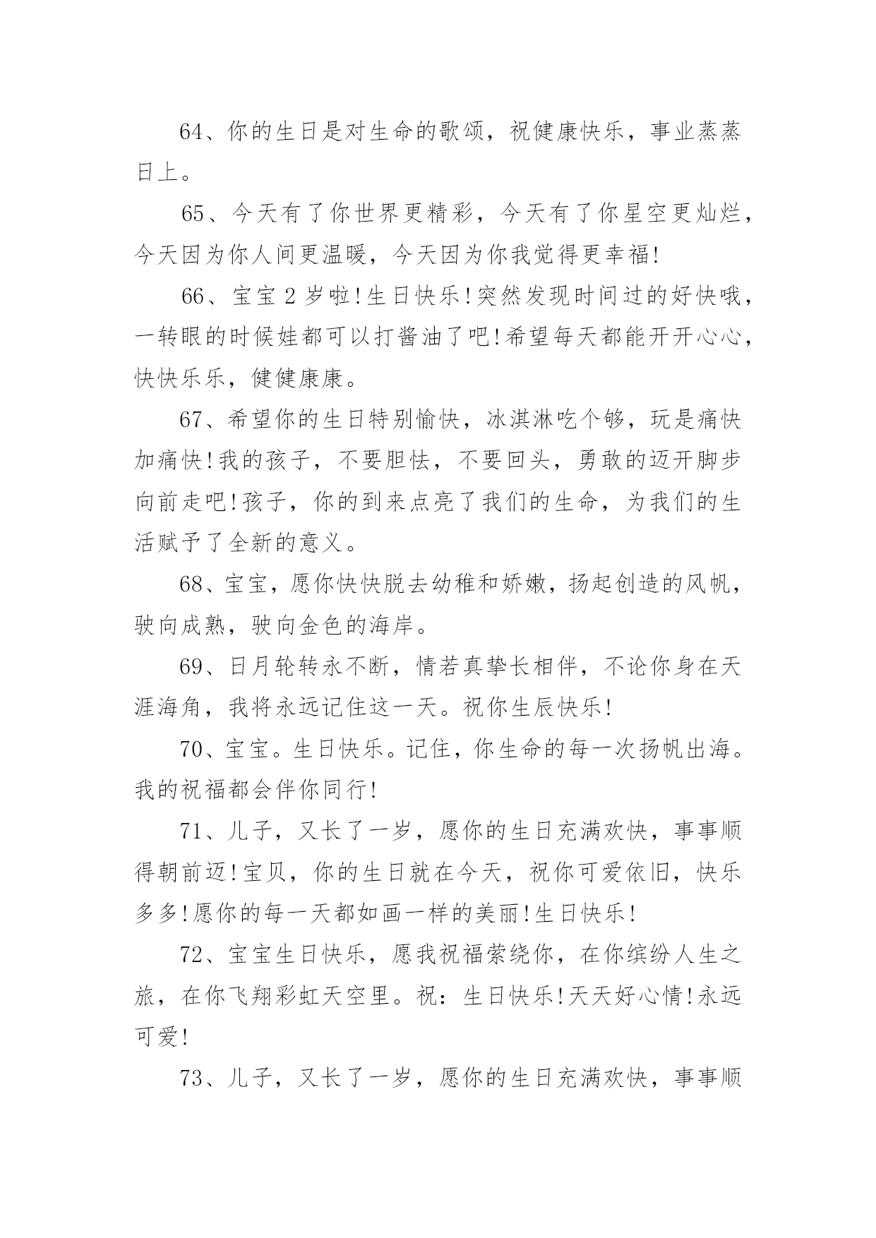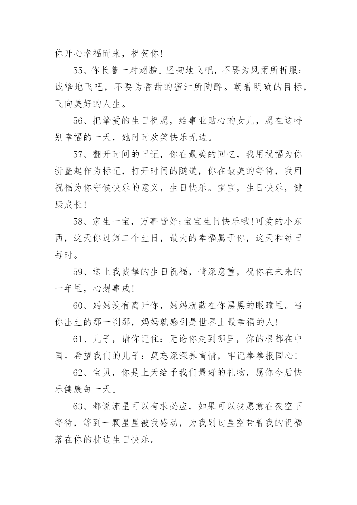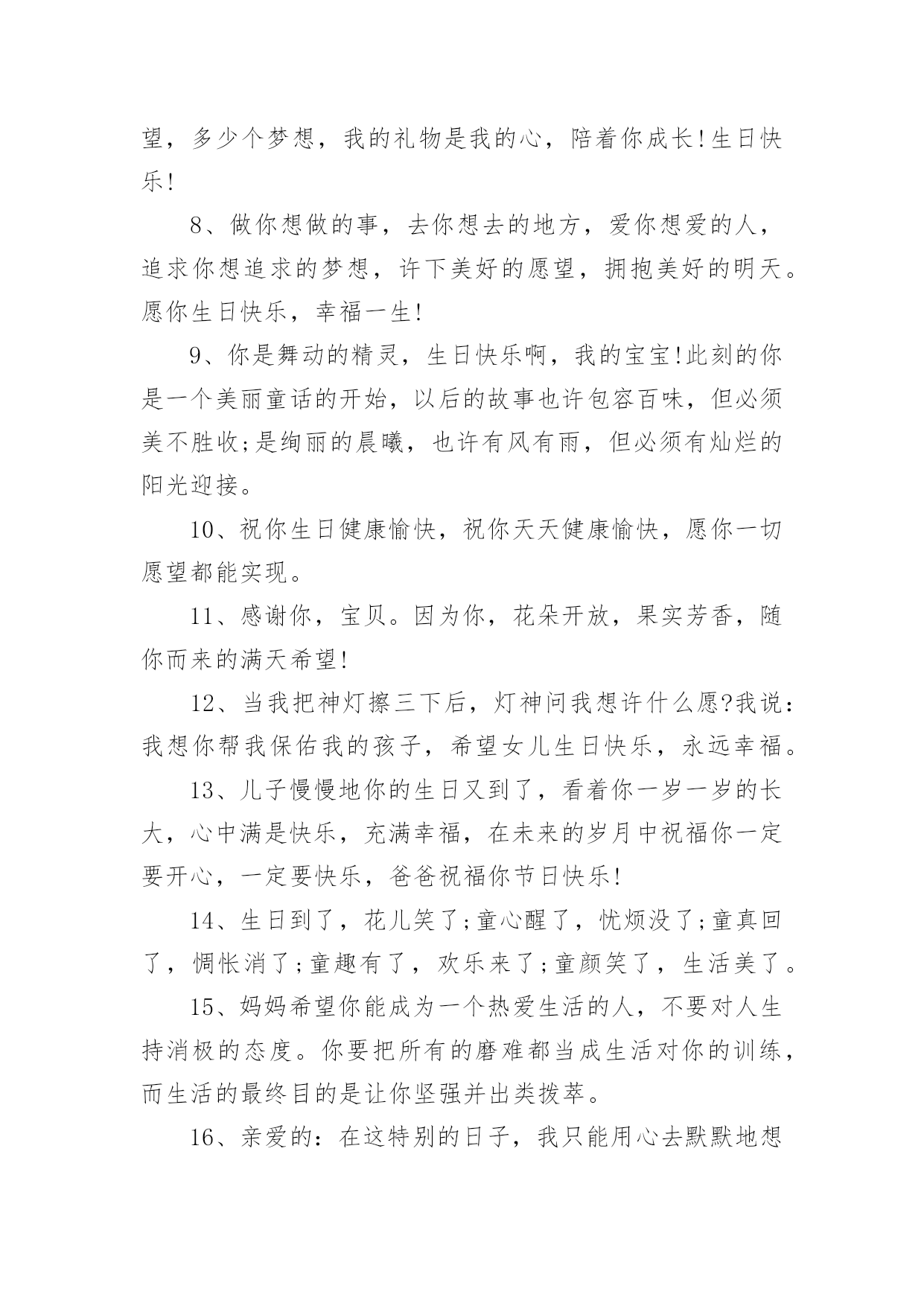 生日祝福文案生日祝福文案9篇随着社交网络和信息技术的飞速发展,越来越多人钟情于在社交平台上发布文案,文案用于跟亲朋好友分享个人生活情况。那什么样的文案才算得上是经典呢?以下是小编整理的生日祝福文案,仅供参考,大家一起来看看吧。生日祝福文案11、让我为你祝福,让我为你欢笑,因为在你生日的今天我的内心也跟你一样的欢腾、快乐!祝你生日快乐!2、宝贝,你的生日就在今天,祝你可爱依旧,快乐多多!3、希望你能成为一个有学识,有思想。有主见,有爱心的孩子。没有什么祝愿比我们的更温馨!4、生日快乐小天使,愿给你一个灿烂的阳光,每天为你带来幸福。5、恭祝你们喜得千金,从今以后,千斤的幸福将压在你们身上,千斤的快乐将伴随在你们身旁,愿可爱的小千金每天健康成长!6、宝贝,现在的你是一个美丽童话的开始,以后的故事也许包容百味,但一定美不胜收;是绚丽的晨曦,也许有风有雨,但一定有灿烂的阳光迎接;宝贝,你幸福所以我幸福!7、每个生日都有礼物,都有祝福,无论你有多少个愿望,多少个梦想,我的礼物是我的心,陪着你成长!生日快乐!8、做你想做的事,去你想去的地方,爱你想爱的人,追求你想追求的梦想,许下美好的愿望,拥抱美好的明天。愿你生日快乐,幸福一生!9、你是舞动的精灵,生日快乐啊,我的宝宝!此刻的你是一个美丽童话的开始,以后的故事也许包容百味,但必须美不胜收;是绚丽的晨曦,也许有风有雨,但必须有灿烂的阳光迎接。10、祝你生日健康愉快,祝你天天健康愉快,愿你一切愿望都能实现。11、感谢你,宝贝。因为你,花朵开放,果实芳香,随你而来的满天希望!12、当我把神灯擦三下后,灯神问我想许什么愿?我说:我想你帮我保佑我的孩子,希望女儿生日快乐,永远幸福。13、儿子慢慢地你的生日又到了,看着你一岁一岁的长大,心中满是快乐,充满幸福,在未来的岁月中祝福你一定要开心,一定要快乐,爸爸祝福你节日快乐!14、生日到了,花儿笑了;童心醒了,忧烦没了;童真回了,惆怅消了;童趣有了,欢乐来了;童颜笑了,生活美了。15、妈妈希望你能成为一个热爱生活的人,不要对人生持消极的态度。你要把所有的磨难都当成生活对你的训练,而生活的最终目的是让你坚强并出类拨萃。16、亲爱的:在这特别的日子,我只能用心去默默地想你爱你。只想告诉你:永远深爱着你,你的一切都在牵动着我。17、儿子,到你长大成人,爸爸妈妈已经满脸皱纹,爸爸妈妈希望你有一个健康的体魄,有一个健全的心理,有一颗善良的心,将来能成为一个堂堂正正的男子汉,我们坚信;你一定会的!18、生日送你宝马车,成功路上乐悠悠。生日送你依波表,真情无限到永久。生日送你派克笔,温文尔雅写传奇。生日送你红牡丹,富贵吉祥没有头!19、家生一宝,万事皆好;宝宝生日快乐哦!可爱的小东西,这天你过第二个生日,的幸福属于你,这天和每日每时。20、希望孩子虚心的学习,有特长之处加强学,不断上进,不足之处要加强学习,力争具有高尚的道德情操,良好的文化素养。21、宝宝,你知道吗?妈妈对你的爱岂能三言二语只言片语说的完。今天是你的生日,妈妈不想太啰嗦,只想默默地为你送上祝福。22、你的每一步成长我都在见证,看着你一步一个脚印的往前走,我觉得好欣慰。23、希望你身体强壮,快快长大,越长越可爱哦。孩子,你的到来点亮了我们的生命,为我们的生活赋予了全新的意义。以后也要开开心心哦,生日快乐。24、你每天坚持按时到学校,这很好。在学校里,你也能团结同学,遵守纪律。可学习是自己的事情,得靠自己的努力才行。天底下没有不劳而获的,只有付出,才会有收获。加油啊,把学习赶上去。25、的幸福属于你,今天和每日每时。愿生日带给你的欢乐中蕴涵着一切美好!26、宝宝,看到你快乐成长,我们由衷感到:无论我们经历了多少艰辛,都是值得的。生日快乐,健健康康!27、爸爸妈妈的两颗心乘起来等于翅膀,我们会用全部的爱为你护航,不管世界有多少漫长的路,愿你放梦想到处飞扬!28、把挚爱的生日祝愿,给事业贴心的女儿,愿在这特别幸福的一天,她时时欢笑快乐无边。生日快乐!29、女儿,又长了一岁,愿你的生日充满欢快,事事顺得朝前迈!30、希望长大一岁的你能够越来越勇敢,表现越来越棒!祝生日快乐!31、愿所有的幸福都陪伴着,仰首是春,俯首是秋;愿所有的欢乐都追随着,月圆是诗,月缺是画!32、时光飞逝,今天又是你的生日,愿今天你拥有一切美丽,来年生日更美好,一年更胜一年。祝女儿生日快乐!33、我认为健康和快乐是人生最重要的两件东西,如果它们可以转让,我愿意把我的那一份都给你。我的宝贝,生日快乐!34、宝贝,祝你生日快乐!愿生日带给你的欢乐中蕴涵着一切美好!35、日月轮转永不断,情若真挚长相伴,孩子,不论你身在天涯海角,我心永远向着你,希望你能平平安安。36、娇艳的鲜花,已为你开放;美好的日子,已悄悄来临。祝你生日快乐!37、愿每天的