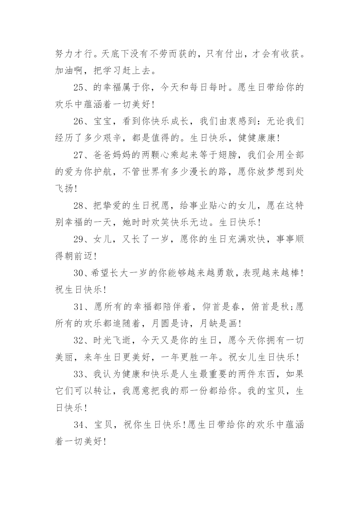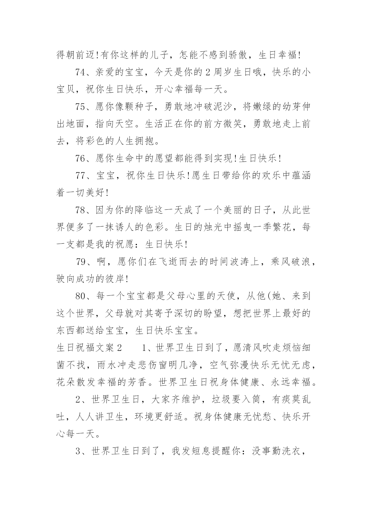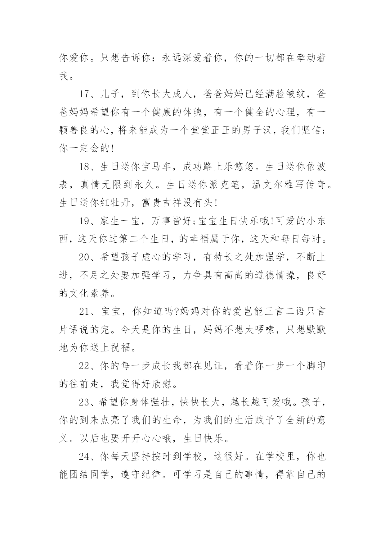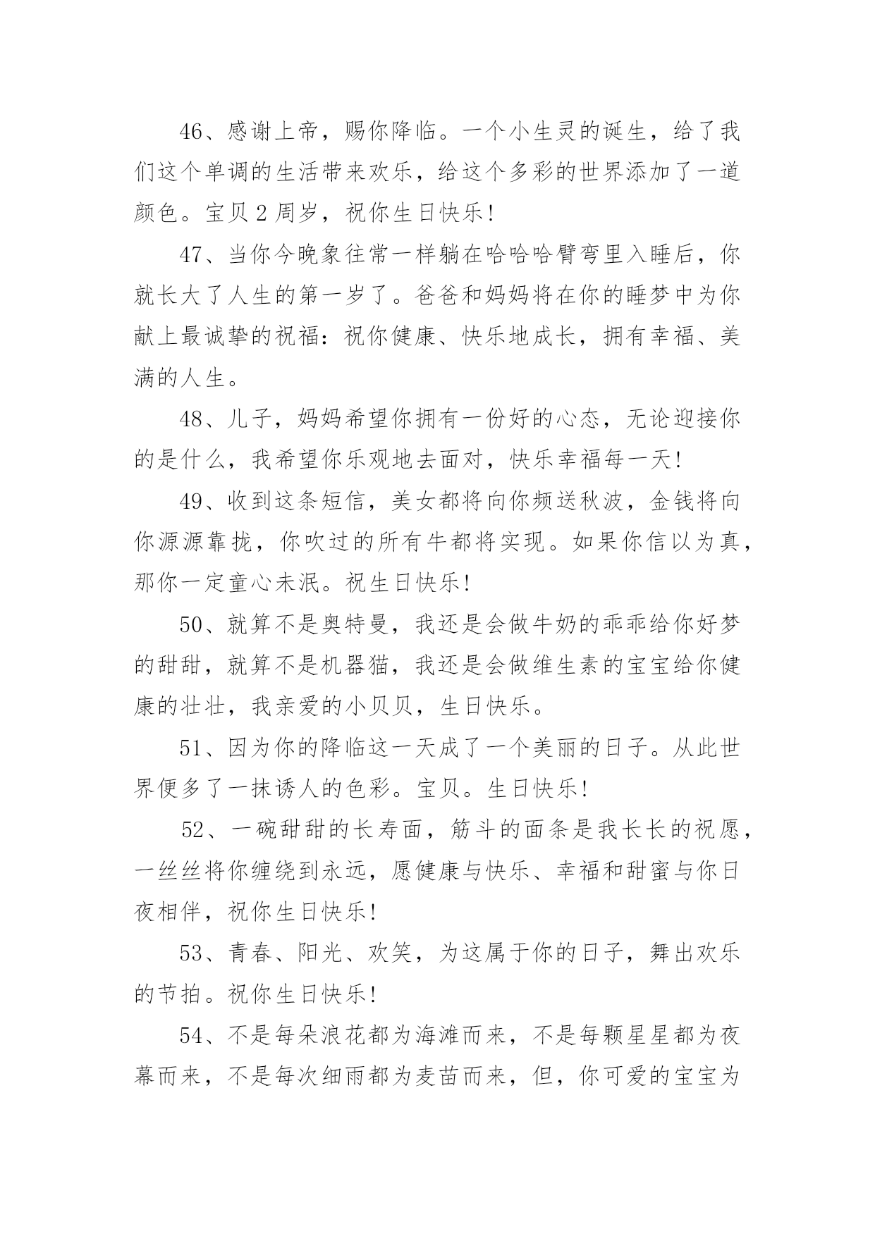 生日祝福文案生日祝福文案9篇随着社交网络和信息技术的飞速发展,越来越多人钟情于在社交平台上发布文案,文案用于跟亲朋好友分享个人生活情况。那什么样的文案才算得上是经典呢?以下是小编整理的生日祝福文案,仅供参考,大家一起来看看吧。生日祝福文案11、让我为你祝福,让我为你欢笑,因为在你生日的今天我的内心也跟你一样的欢腾、快乐!祝你生日快乐!2、宝贝,你的生日就在今天,祝你可爱依旧,快乐多多!3、希望你能成为一个有学识,有思想。有主见,有爱心的孩子。没有什么祝愿比我们的更温馨!4、生日快乐小天使,愿给你一个灿烂的阳光,每天为你带来幸福。5、恭祝你们喜得千金,从今以后,千斤的幸福将压在你们身上,千斤的快乐将伴随在你们身旁,愿可爱的小千金每天健康成长!6、宝贝,现在的你是一个美丽童话的开始,以后的故事也许包容百味,但一定美不胜收;是绚丽的晨曦,也许有风有雨,但一定有灿烂的阳光迎接;宝贝,你幸福所以我幸福!7、每个生日都有礼物,都有祝福,无论你有多少个愿望,多少个梦想,我的礼物是我的心,陪着你成长!生日快乐!8、做你想做的事,去你想去的地方,爱你想爱的人,追求你想追求的梦想,许下美好的愿望,拥抱美好的明天。愿你生日快乐,幸福一生!9、你是舞动的精灵,生日快乐啊,我的宝宝!此刻的你是一个美丽童话的开始,以后的故事也许包容百味,但必须美不胜收;是绚丽的晨曦,也许有风有雨,但必须有灿烂的阳光迎接。10、祝你生日健康愉快,祝你天天健康愉快,愿你一切愿望都能实现。11、感谢你,宝贝。因为你,花朵开放,果实芳香,随你而来的满天希望!12、当我把神灯擦三下后,灯神问我想许什么愿?我说:我想你帮我保佑我的孩子,希望女儿生日快乐,永远幸福。13、儿子慢慢地你的生日又到了,看着你一岁一岁的长大,心中满是快乐,充满幸福,在未来的岁月中祝福你一定要开心,一定要快乐,爸爸祝福你节日快乐!14、生日到了,花儿笑了;童心醒了,忧烦没了;童真回了,惆怅消了;童趣有了,欢乐来了;童颜笑了,生活美了。15、妈妈希望你能成为一个热爱生活的人,不要对人生持消极的态度。你要把所有的磨难都当成生活对你的训练,而生活的最终目的是让你坚强并出类拨萃。16、亲爱的:在这特别的日子,我只能用心去默默地想你爱你。只想告诉你:永远深爱着你,你的一切都在牵动着我。17、儿子,到你长大成人,爸爸妈妈已经满脸皱纹,爸爸妈妈希望你有一个健康的体魄,有一个健全的心理,有一颗善良的心,将来能成为一个堂堂正正的男子汉,我们坚信;你一定会的!18、生日送你宝马车,成功路上乐悠悠。生日送你依波表,真情无限到永久。生日送你派克笔,温文尔雅写传奇。生日送你红牡丹,富贵吉祥没有头!19、家生一宝,万事皆好;宝宝生日快乐哦!可爱的小东西,这天你过第二个生日,的幸福属于你,这天和每日每时。20、希望孩子虚心的学习,有特长之处加强学,不断上进,不足之处要加强学习,力争具有高尚的道德情操,良好的文化素养。21、宝宝,你知道吗?妈妈对你的爱岂能三言二语只言片语说的完。今天是你的生日,妈妈不想太啰嗦,只想默默地为你送上祝福。22、你的每一步成长我都在见证,看着你一步一个脚印的往前走,我觉得好欣慰。23、希望你身体强壮,快快长大,越长越可爱哦。孩子,你的到来点亮了我们的生命,为我们的生活赋予了全新的意义。以后也要开开心心哦,生日快乐。24、你每天坚持按时到学校,这很好。在学校里,你也能团结同学,遵守纪律。可学习是自己的事情,得靠自己的努力才行。天底下没有不劳而获的,只有付出,才会有收获。加油啊,把学习赶上去。25、的幸福属于你,今天和每日每时。愿生日带给你的欢乐中蕴涵着一切美好!26、宝宝,看到你快乐成长,我们由衷感到:无论我们经历了多少艰辛,都是值得的。生日快乐,健健康康!27、爸爸妈妈的两颗心乘起来等于翅膀,我们会用全部的爱为你护航,不管世界有多少漫长的路,愿你放梦想到处飞扬!28、把挚爱的生日祝愿,给事业贴心的女儿,愿在这特别幸福的一天,她时时欢笑快乐无边。生日快乐!29、女儿,又长了一岁,愿你的生日充满欢快,事事顺得朝前迈!30、希望长大一岁的你能够越来越勇敢,表现越来越棒!祝生日快乐!31、愿所有的幸福都陪伴着,仰首是春,俯首是秋;愿所有的欢乐都追随着,月圆是诗,月缺是画!32、时光飞逝,今天又是你的生日,愿今天你拥有一切美丽,来年生日更美好,一年更胜一年。祝女儿生日快乐!33、我认为健康和快乐是人生最重要的两件东西,如果它们可以转让,我愿意把我的那一份都给你。我的宝贝,生日快乐!34、宝贝,祝你生日快乐!愿生日带给你的欢乐中蕴涵着一切美好!35、日月轮转永不断,情若真挚长相伴,孩子,不论你身在天涯海角,我心永远向着你,希望你能平平安安。36、娇艳的鲜花,已为你开放;美好的日子,已悄悄来临。祝你生日快乐!37、愿每天的