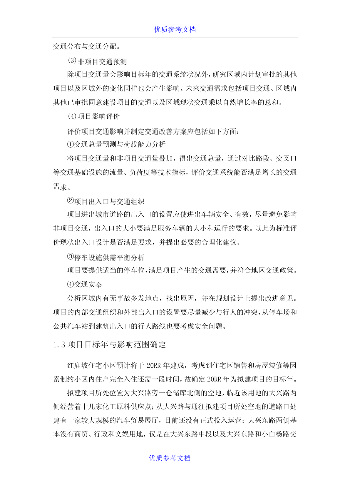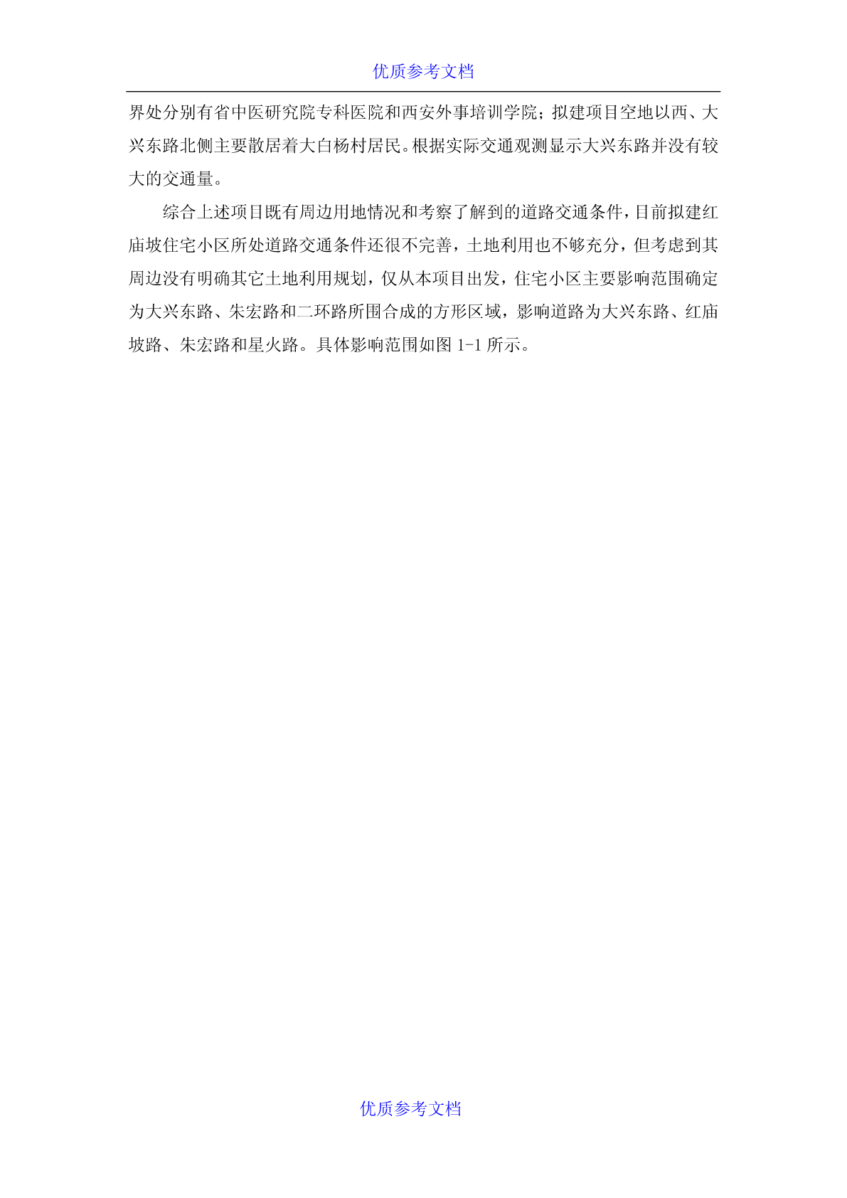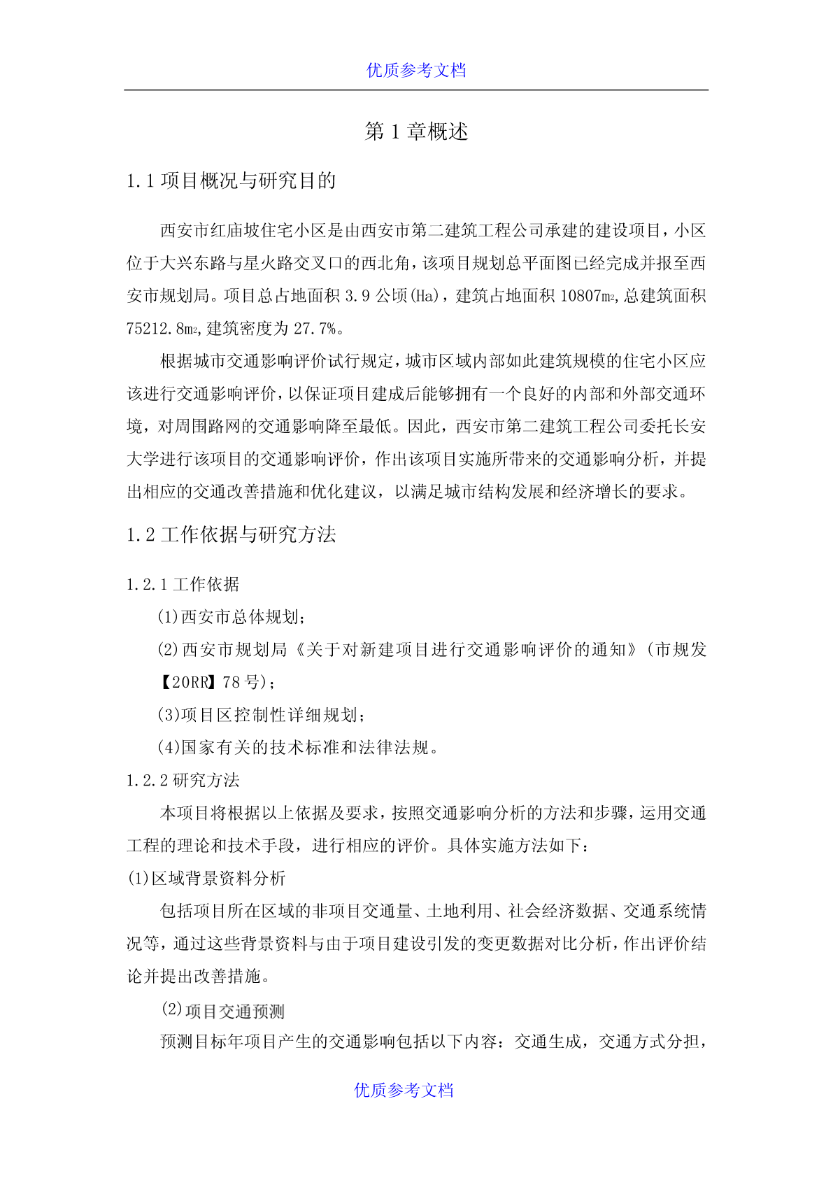 优质参考文档长安大学简介长安大学直属国家教育部,是国家“211工程”重点建设大学。学校以工为主,理工结合,兼有经济、管理、人文多种学科,以培养公路交通、国土资源与环境、建筑工程等专业人才为办学特色。现设有15个学院,2个博士后科研流动站,2个一级学科博士学位授权点,13个二级学科博士学位授权点,41个硕士学位授权点;59个本科专业及专业方向,专业设置覆盖了公路交通、国土资源与环境、建筑工程的绝大部分领域。学校教学设施完善,科研设备先进。现有2个国家级重点学科、8个省部级重点学科、10个省部级重点实验室;具备国家甲级的交通土建工程设计、城市规划、交通评价等资质。长安大学拥有一批包括中国工程院院士、“长江学者奖励计划”特聘教授、博士、硕士生导师在内的学术水平高、在国内外享有盛誉的专家、学者。长安大学交通规划研究独树一帜,处于国内领先地位。获省部级科研成果奖6项,多项科研成果达到国际或国内领先水平。近年来承担的有国家科技部十R五攻关项目、国家西部交通建设项目、美国能源基金会资助项目、霍英东基金资助项目等。具有研究交通规划和城市交通的雄厚基础,交通规划软件齐全,拥有具有国际先进水平的交通规划主流软件EMME/2、TRIPS、TRANSCAD,并具有相应软件的开发能力。实验室具有世界先进的试验设备,如英国ADR数据采集系统、Autoscope交通流量监测系统、Tramble车辆轨迹定位系统、GPS/GIS数据采集和维护系统,为规划工作提供了良好条件。长安大学BRT研究中心是以公交优先研究为重点,兼有城市交通政策、城市交通设施设计、城市交通影响分析等方面工作的专业研究机构该。中心目前承担有美国能源基金会资助项目霍英东基金、资助项目等重大课题在西。安市从事过西安市高架路交通经济研究、西安市社会停车场规划、西安市快速路体系规划、城市交通战略规划、城市轻轨客流量预测、城市BRT发展战略研究等大量交通研究项目,建立有城市交通活动模型。该研究中心拥有研究人40员名,有国外兼职教授指导,并有博士、硕士研究生等专业工作人员30余名。优质参考文档优质参考文档目录第1章概述………………………………………………………………………11.1项目概况与研究目的……………………………………………………11.2工作依据与研究方法……………………………………………………11.3项目目标年与影响范围确定……………………………………………2第2章项目建设背景与现状交通分析………………………………………52.1项目周边土地利用状况…………………………………………………52.2项目周边道路交通系统现状与规划……………………………………52.3项目周边道路交通特征…………………………………………………62.4项目周边交通现状评价…………………………………………………10第3章交通需求预测…………………………………………………………113.1背景交通量预测…………………………………………………………113.2拟建项目交通量预测……………………………………………………12第4章项目交通影响评价……………………………………………………154.1交通系统服务水平影响分析……………………………………………154.2公共交通影响分析………………………………………………………174.3非机动车影响分析………………………………………………………18第5章项目配套设施分析……………………………………………………195.1项目影响区规划道路条件分析…………………………………………195.2项目区内停车设施供需分析……………………………………………195.3住宅区交通组织分析……………………………………………………19第6章结论与建议……………………………………………………………216.1分析结论…………………………………………………………………216.2相关建议…………………………………………………………………21优质参考文档优质参考文档第1章概述1.1项目概况与研究目的西安市红庙坡住宅小区是由西安市第二建筑工程公司承建的建设项目,小区位于大兴东路与星火路交叉口的西北角,该项目规划总平面图已经完成并报至西安市规划局。项目总占地面积3.9公顷(Ha),建筑占地面积10807m2,总建筑面积75212.8m2,建筑密度为27.7%。根据城市交通影响评价试行规定,城市区域内部如此建筑规模的住宅小区应该进行交通影响评价,以保证项目建成后能够拥有一个良好的内部和外部交通环境,对周围路网的交通影响降至最低。因此