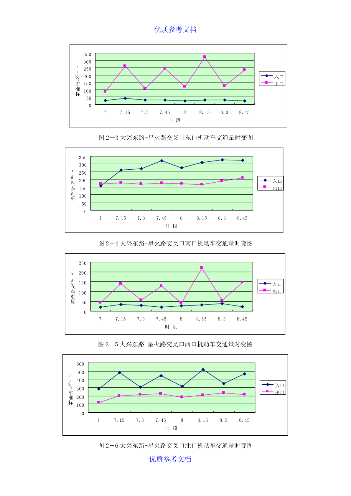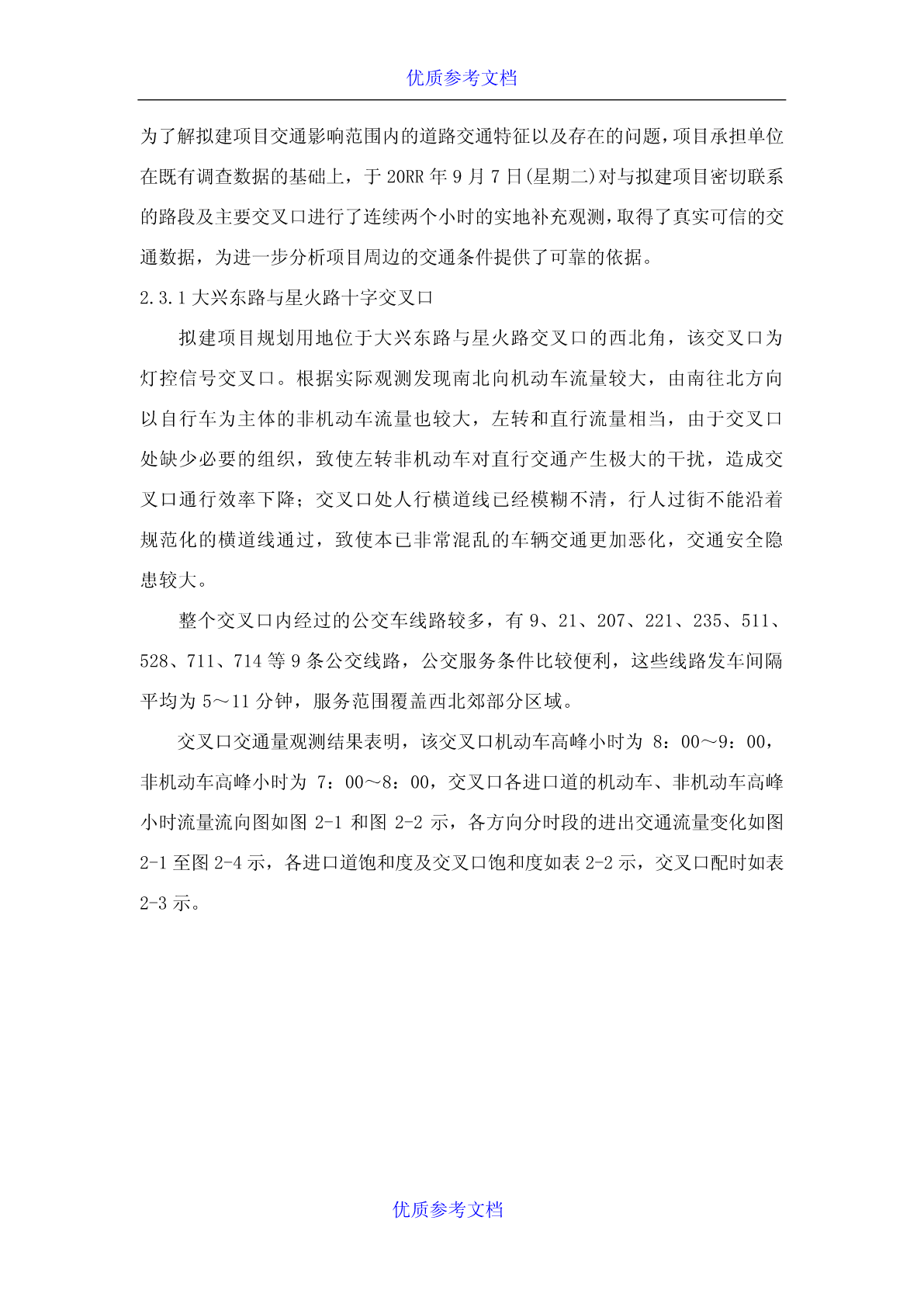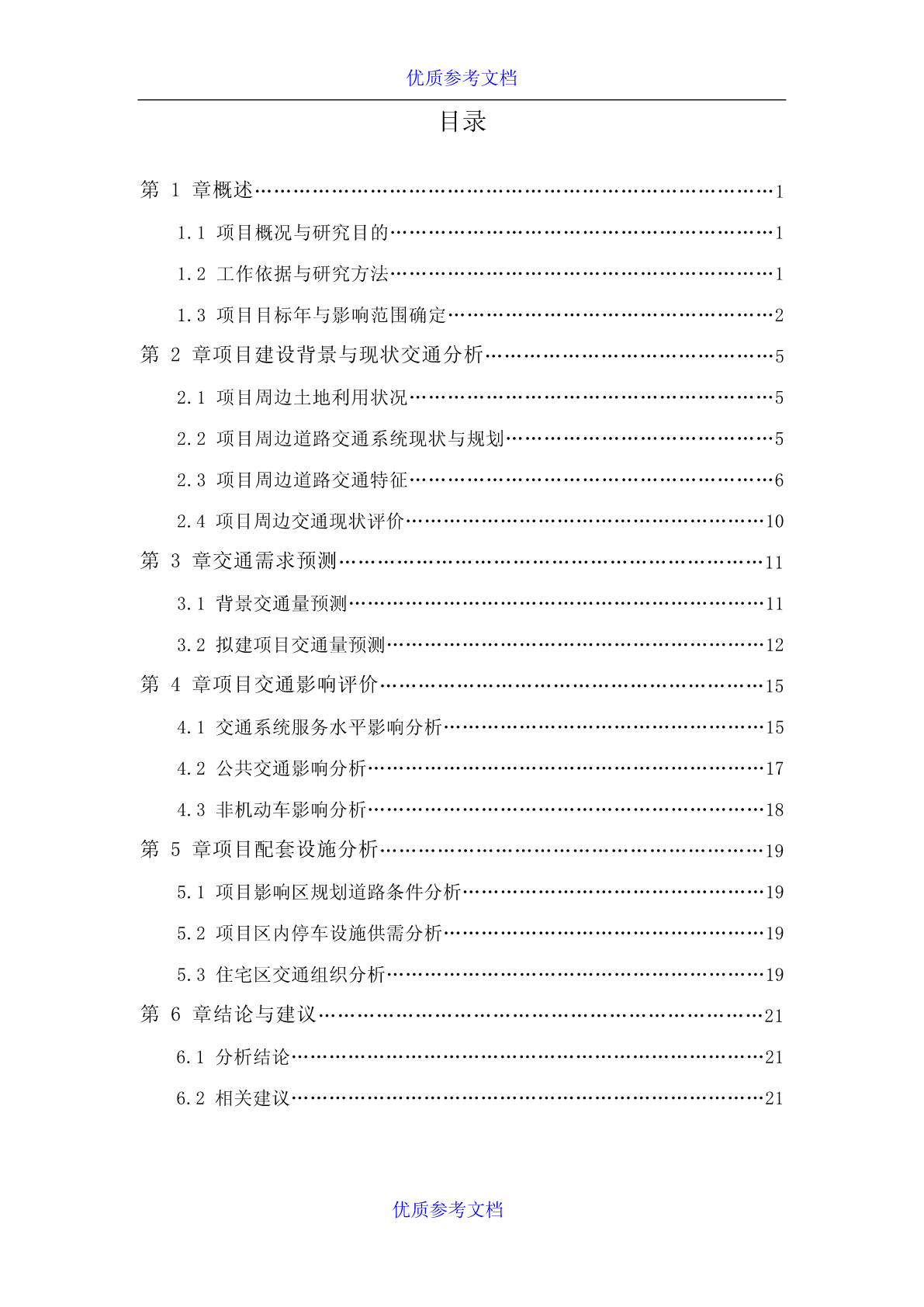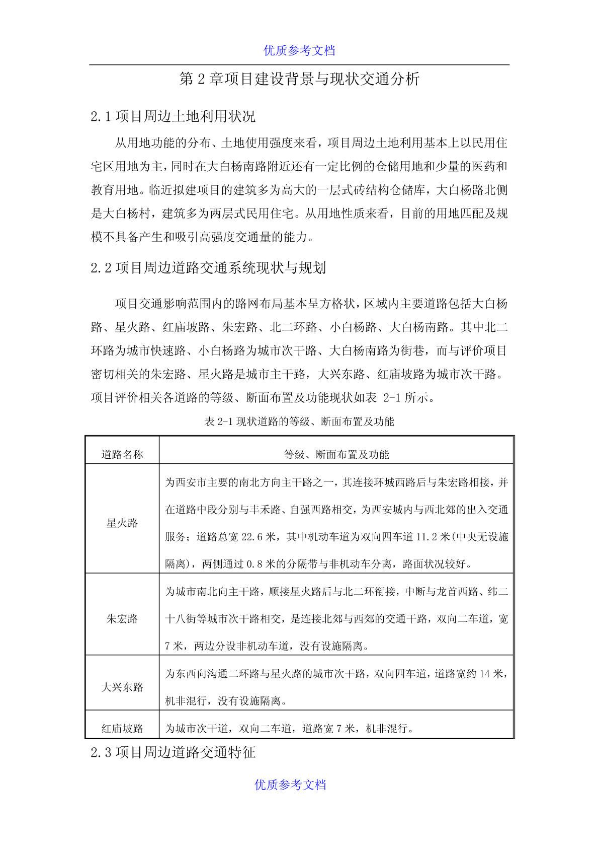 优质参考文档长安大学简介长安大学直属国家教育部,是国家“211工程”重点建设大学。学校以工为主,理工结合,兼有经济、管理、人文多种学科,以培养公路交通、国土资源与环境、建筑工程等专业人才为办学特色。现设有15个学院,2个博士后科研流动站,2个一级学科博士学位授权点,13个二级学科博士学位授权点,41个硕士学位授权点;59个本科专业及专业方向,专业设置覆盖了公路交通、国土资源与环境、建筑工程的绝大部分领域。学校教学设施完善,科研设备先进。现有2个国家级重点学科、8个省部级重点学科、10个省部级重点实验室;具备国家甲级的交通土建工程设计、城市规划、交通评价等资质。长安大学拥有一批包括中国工程院院士、“长江学者奖励计划”特聘教授、博士、硕士生导师在内的学术水平高、在国内外享有盛誉的专家、学者。长安大学交通规划研究独树一帜,处于国内领先地位。获省部级科研成果奖6项,多项科研成果达到国际或国内领先水平。近年来承担的有国家科技部十R五攻关项目、国家西部交通建设项目、美国能源基金会资助项目、霍英东基金资助项目等。具有研究交通规划和城市交通的雄厚基础,交通规划软件齐全,拥有具有国际先进水平的交通规划主流软件EMME/2、TRIPS、TRANSCAD,并具有相应软件的开发能力。实验室具有世界先进的试验设备,如英国ADR数据采集系统、Autoscope交通流量监测系统、Tramble车辆轨迹定位系统、GPS/GIS数据采集和维护系统,为规划工作提供了良好条件。长安大学BRT研究中心是以公交优先研究为重点,兼有城市交通政策、城市交通设施设计、城市交通影响分析等方面工作的专业研究机构该。中心目前承担有美国能源基金会资助项目霍英东基金、资助项目等重大课题在西。安市从事过西安市高架路交通经济研究、西安市社会停车场规划、西安市快速路体系规划、城市交通战略规划、城市轻轨客流量预测、城市BRT发展战略研究等大量交通研究项目,建立有城市交通活动模型。该研究中心拥有研究人40员名,有国外兼职教授指导,并有博士、硕士研究生等专业工作人员30余名。优质参考文档优质参考文档目录第1章概述………………………………………………………………………11.1项目概况与研究目的……………………………………………………11.2工作依据与研究方法……………………………………………………11.3项目目标年与影响范围确定……………………………………………2第2章项目建设背景与现状交通分析………………………………………52.1项目周边土地利用状况…………………………………………………52.2项目周边道路交通系统现状与规划……………………………………52.3项目周边道路交通特征…………………………………………………62.4项目周边交通现状评价…………………………………………………10第3章交通需求预测…………………………………………………………113.1背景交通量预测…………………………………………………………113.2拟建项目交通量预测……………………………………………………12第4章项目交通影响评价……………………………………………………154.1交通系统服务水平影响分析……………………………………………154.2公共交通影响分析………………………………………………………174.3非机动车影响分析………………………………………………………18第5章项目配套设施分析……………………………………………………195.1项目影响区规划道路条件分析…………………………………………195.2项目区内停车设施供需分析……………………………………………195.3住宅区交通组织分析……………………………………………………19第6章结论与建议……………………………………………………………216.1分析结论…………………………………………………………………216.2相关建议…………………………………………………………………21优质参考文档优质参考文档第1章概述1.1项目概况与研究目的西安市红庙坡住宅小区是由西安市第二建筑工程公司承建的建设项目,小区位于大兴东路与星火路交叉口的西北角,该项目规划总平面图已经完成并报至西安市规划局。项目总占地面积3.9公顷(Ha),建筑占地面积10807m2,总建筑面积75212.8m2,建筑密度为27.7%。根据城市交通影响评价试行规定,城市区域内部如此建筑规模的住宅小区应该进行交通影响评价,以保证项目建成后能够拥有一个良好的内部和外部交通环境,对周围路网的交通影响降至最低。因此