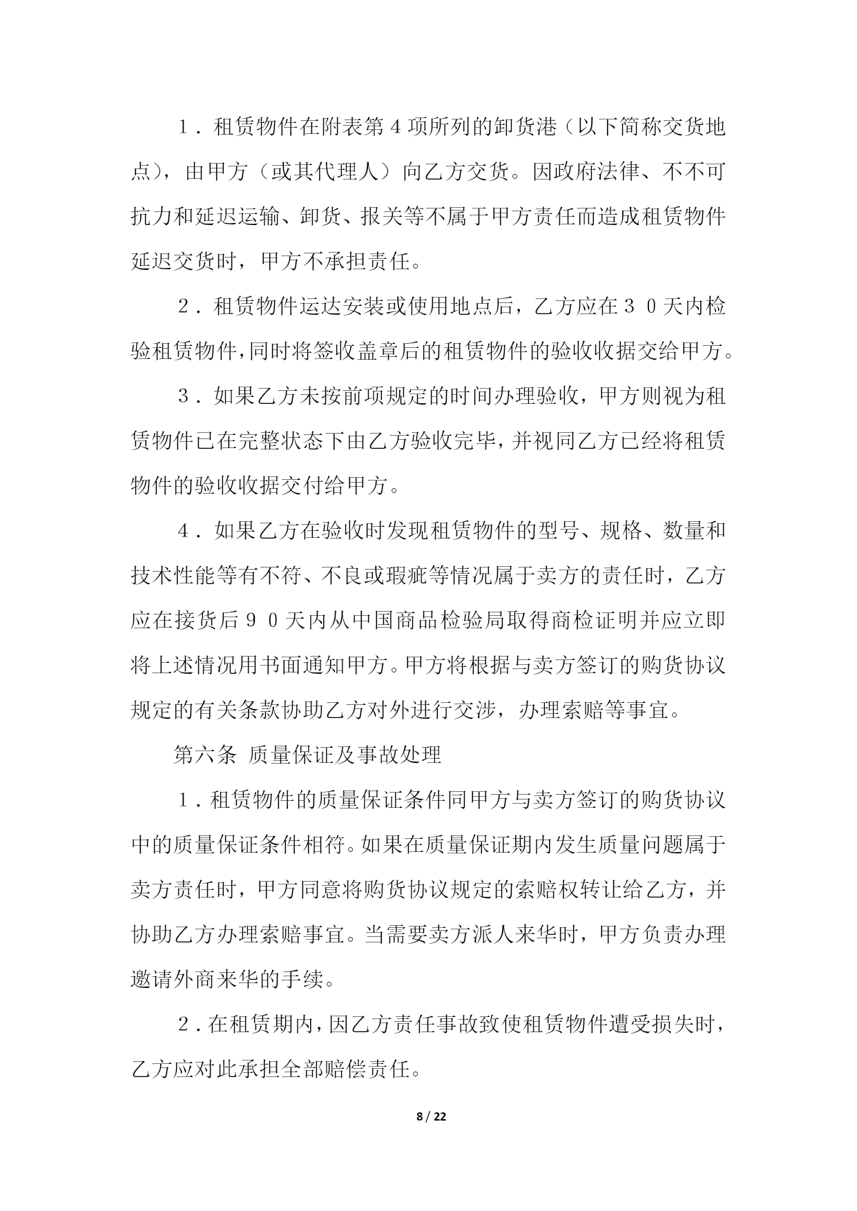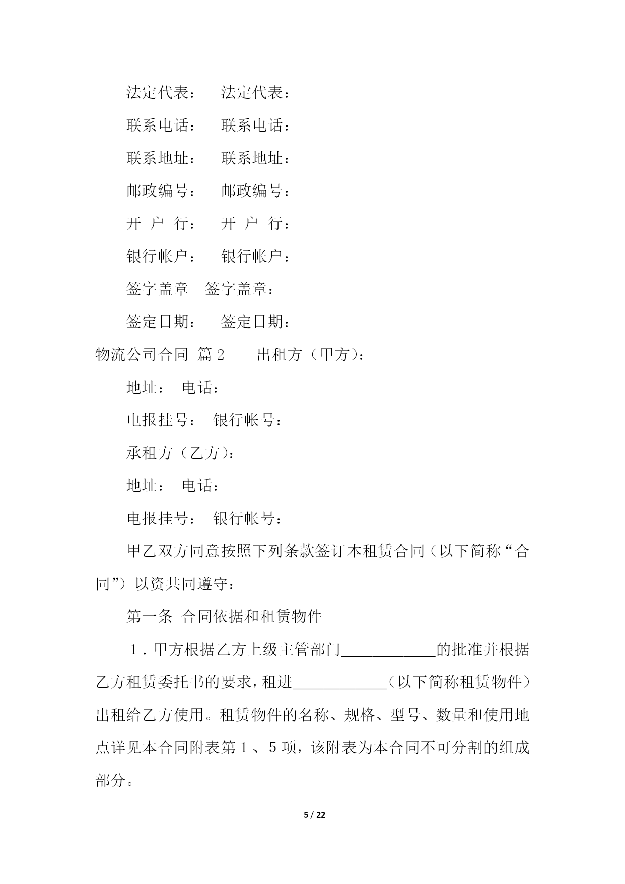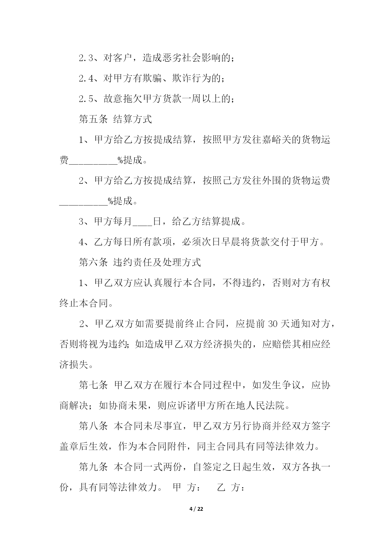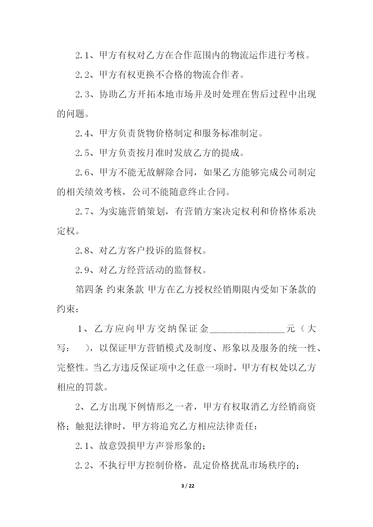 PAGE22/NUMPAGES22物流公司合同4篇物流公司合同篇1甲方:酒泉桑奥快运物流公司乙方:甲乙双方本着互利互惠、共同发展的原则,在平等协商的基础上,经过双方充分协商,现达成如下协议:第一条协议项目乙方在甲方指定区域内经营桑奥快运的相关事宜,乙方负责该区域内的服务、售后和市场开发等。第二条协议期限甲乙双方合作期限从__________年__________月__________日开始到__________年__________月__________日止,在此期间内,甲乙双方联合协作经营。第三条甲乙双方的权利和义务1、乙方权利和义务:1.1、乙方及其下属完全拥护桑奥快运物流公司的任何决策并且认真履行。1.2、乙方无条件完全维护企业形象,力争树立嘉峪关物流行业新标准。1.3、乙方负责桑奥快运在嘉峪关的一切相关事宜,包括广告宣传、服务等。1.4、乙方愿意接受桑奥快运物流对乙方的物流运作进行绩效考核,如不能完成相关考核,愿意接受相应的经济处罚。1.5、乙方负责购买桑奥快运嘉峪关站的各类保险。1.6、乙方负责清点到嘉峪关的货物数量,一旦签字确认,如有货物丢失,均有乙方负责。1.7、乙方无条件执行由公司制定的货物派收价格和服务标准。1.8、乙方不能无理拒绝和擅自停止、更改物流服务内容,也不能更改产品的所有权性质。1.9、乙方只对客户商品的外包装负责,即在外包装完好的情况下,已经证明我方实现了物流服务的标准。1.10、乙方在不知情的情况下,对产品的合法性和交易的合法性不负责。1.11、乙方负责将所有货款于次日早晨缴纳给公司。1.12、乙方如果没有收取客户代收款而放货,相关经济损失,均有乙方负责。1.13、乙方只对签收后的货物承担相关责任,不对在酒泉至嘉峪关路线上运输中的意外事故负责。1.14、因为乙方原因,造成货损和丢失的,乙方要负责赔偿。赔偿方式是乙方先上报公司,然后向客户或者供应商协商赔偿事宜。2、甲方权利和义务:2.1、甲方有权对乙方在合作范围内的物流运作进行考核。2.2、甲方有权更换不合格的物流合作者。2.3、协助乙方开拓本地市场并及时处理在售后过程中出现的问题。2.4、甲方负责货物价格制定和服务标准制定。2.5、甲方负责按月准时发放乙方的提成。2.6、甲方不能无故解除合同,如果乙方能够完成公司制定的相关绩效考核,公司不能随意终止合同。2.7、为实施营销策划,有营销方案决定权利和价格体系决定权。2.8、对乙方客户投诉的监督权。2.9、对乙方经营活动的监督权。第四条约束条款甲方在乙方授权经销期限内受如下条款的约束:1、乙方应向甲方交纳保证金________________元(大写:),以保证甲方营销模式及制度、形象以及服务的统一性、完整性。当乙方违反保证项中之任意一项时,甲方有权处以乙方相应的罚款。2、乙方出现下例情形之一者,甲方有权取消乙方经销商资格;触犯法律时,甲方将追究乙方相应法律责任:2.1、故意毁损甲方声誉形象的;2.2、不执行甲方控制价格,乱定价格扰乱市场秩序的;2.3、对客户,造成恶劣社会影响的;2.4、对甲方有欺骗、欺诈行为的;2.5、故意拖欠甲方货款一周以上的;第五条结算方式1、甲方给乙方按提成结算,按照甲方发往嘉峪关的货物运费__________%提成。2、甲方给乙方按提成结算,按照己方发往外围的货物运费__________%提成。3、甲方每月____日,给乙方结算提成。4、乙方每日所有款项,必须次日早晨将货款交付于甲方。第六条违约责任及处理方式1、甲乙双方应认真履行本合同,不得违约,否则对方有权终止本合同。2、甲乙双方如需要提前终止合同,应提前30天通知对方,否则将视为违约;如造成甲乙双方经济损失的,应赔偿其相应经济损失。第七条甲乙双方在履行本合同过程中,如发生争议,应协商解决;如协商未果,则应诉诸甲方所在地人民法院。第八条本合同未尽事宜,甲乙双方另行协商并经双方签字盖章后生效,作为本合同附件,同主合同具有同等法律效力。第九条本合同一式两份,自签定之日起生效,双方各执一份,具有同等法律效力。甲方:乙方:法定代表:法定代表:联系电话:联系电话:联系地址:联系地址:邮政编号:邮政编号:开户行:开户行:银行帐户:银行帐户:签字盖章签字盖章:签定日期:签定日期:物流公司合同篇2出租方(甲方):地址:电话:电报挂号:银行帐号:承租方(乙方):地址:电话:电报挂号:银行帐号:甲乙双方同意按照下列条款签订本租赁合同(以下简称“合同”)以资共同遵守:第一条合同依据和租赁物件1.甲方根据乙方上级主管部门______的批准并根据乙方租赁委托书的要求,租进______(以下简称租赁物件)出租给乙方使用。租赁物件的名称、规格、型号、数量和使用地点详见本合同附表第1、5项,该附表为本合同不可分割的组成部分。第二条