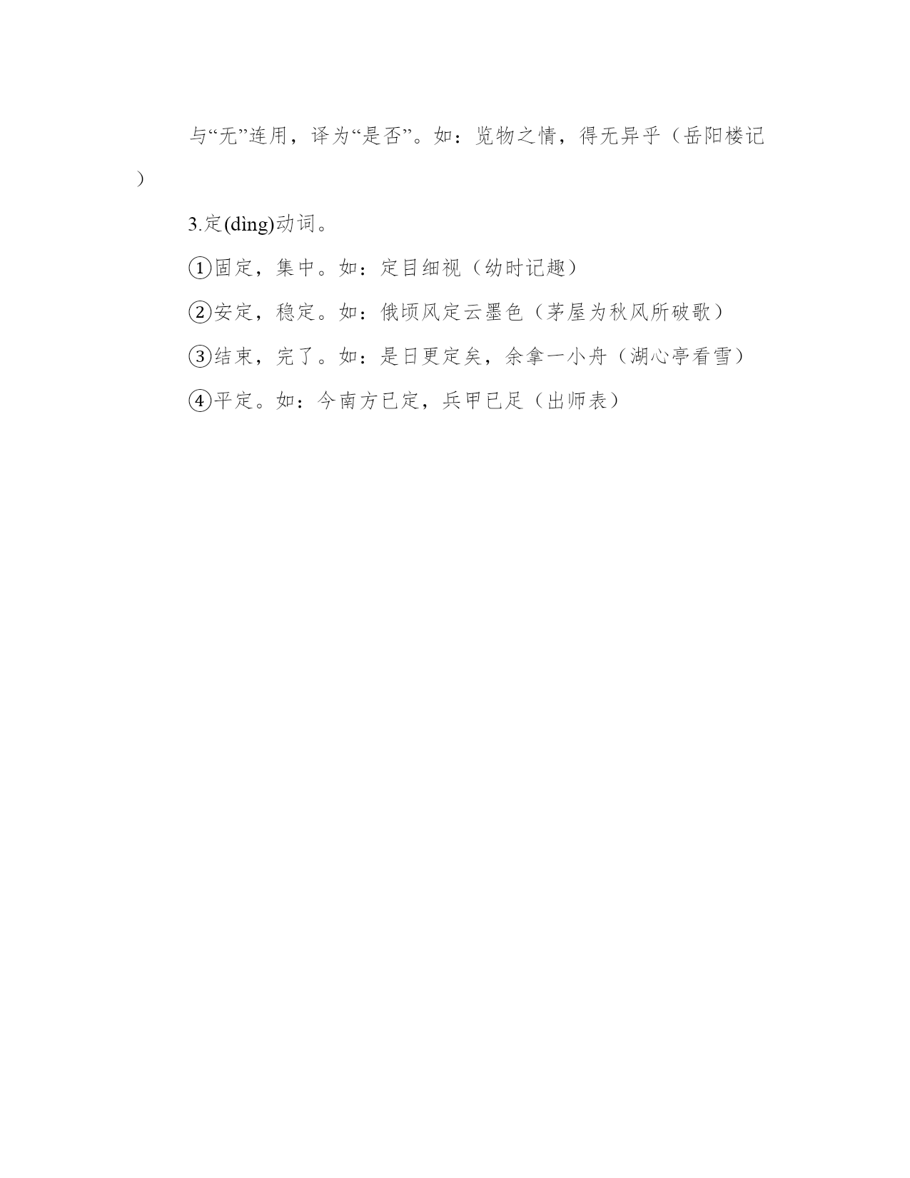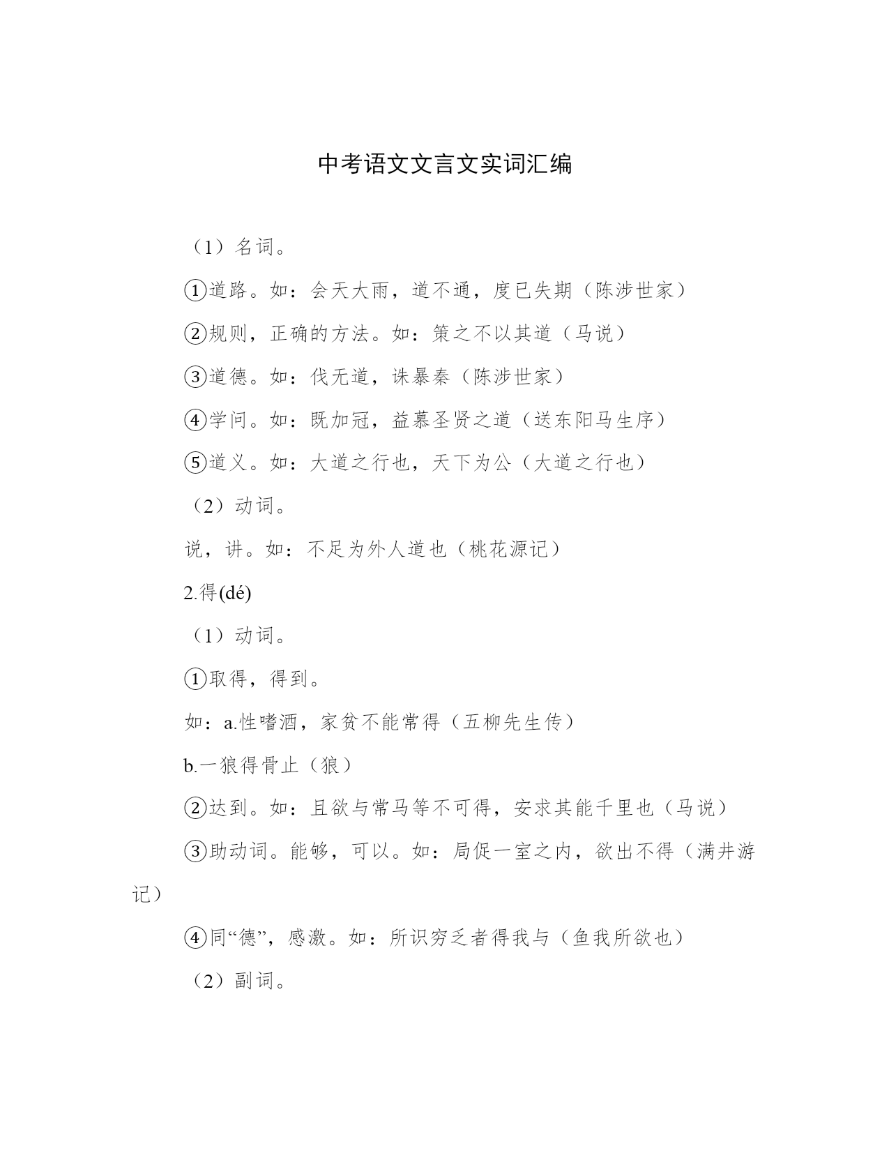 中考语文文言文实词汇编(1)名词。①道路。如:会天大雨,道不通,度已失期(陈涉世家)②规则,正确的方法。如:策之不以其道(马说)③道德。如:伐无道,诛暴秦(陈涉世家)④学问。如:既加冠,益慕圣贤之道(送东阳马生序)⑤道义。如:大道之行也,天下为公(大道之行也)(2)动词。说,讲。如:不足为外人道也(桃花源记)2.得(dé)(1)动词。①取得,得到。如:a.性嗜酒,家贫不能常得(五柳先生传)b.一狼得骨止(狼)②达到。如:且欲与常马等不可得,安求其能千里也(马说)③助动词。能够,可以。如:局促一室之内,欲出不得(满井游记)④同“德”,感激。如:所识穷乏者得我与(鱼我所欲也)(2)副词。与“无”连用,译为“是否”。如:览物之情,得无异乎(岳阳楼记)3.定(dìng)动词。①固定,集中。如:定目细视(幼时记趣)②安定,稳定。如:俄顷风定云墨色(茅屋为秋风所破歌)③结束,完了。如:是日更定矣,余拿一小舟(湖心亭看雪)④平定。如:今南方已定,兵甲已足(出师表)
