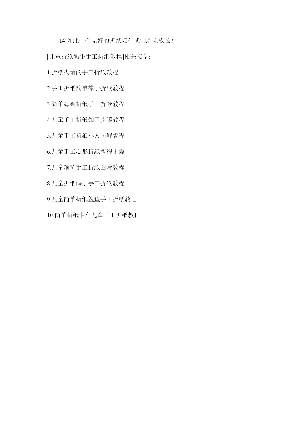 儿童折纸奶牛手工折纸教程儿童折纸奶牛手工折纸教程关键词:折纸,奶牛,手工,儿童,教程儿童折纸奶牛手工折纸教程介绍:奶牛关于小朋友的身体健康但是有着特别直截了当的阻碍的,要明白,小朋友每天早晨喝的牛奶都是来源于奶牛哦!因此今天制造这个简单手工折纸奶牛相信小朋友们本身也会特别的认确实,毕竟每天看到这个手工折纸的奶牛,小朋友们在喝牛奶的时候就应该明白珍惜,同时也要学会奶牛的奉献精神。1.首先将方形纸张的顶角和底角进展儿童折纸奶牛手工折纸教程详情:奶牛关于小朋友的身体健康但是有着特别直截了当的阻碍的,要明白,小朋友每天早晨喝的牛奶都是来源于奶牛哦!因此今天制造这个简单手工折纸奶牛相信小朋友们本身也会特别的认确实,毕竟每天看到这个手工折纸的奶牛,小朋友们在喝牛奶的时候就应该明白珍惜,同时也要学会奶牛的奉献精神。1.首先将方形纸张的顶角和底角进展对折,然后展开在中间留下一条水平的折痕。2.再将顶角和底角向中间的水平折痕进展折叠。3.然后将前一步操作的两个角分别向上下两个方向折叠。4.这个时候要在四个向内的小角那儿制造一些折痕,主要操作细节。5.按照前一步的折痕,将四个小角所对的边向内进展折叠。6.如今将左边的角向中间折叠。7.再将左边上下的两个角也分别向中间进展折叠。8.这个时候按照图中所示,将折纸模型左边靠中间的部分进展一次连续的折叠。9.如今再将折纸模型左右两个小角向内进展折叠。10.然后将折纸模型上半部分向下折叠。11.将此事折纸模型右边的角向内进展压折。12.这个时候需要略微借助一下剪刀,将上部的一个小角剪开。13.然后将剪开的部分向上竖起,如此就制造出了折纸奶牛的耳朵,而背面也按照一样的方式进展操作。14.如此一个完好的折纸奶牛就制造完成啦![儿童折纸奶牛手工折纸教程]相关文章:1.折纸火箭的手工折纸教程2.手工折纸简单橡子折纸教程3.简单海狗折纸手工折纸教程4.儿童手工折纸知了步骤教程5.儿童手工折纸小人图解教程6.儿童手工心形折纸教程步骤7.儿童项链手工折纸图片教程8.儿童折纸鸽子手工折纸教程9.儿童简单折纸鲨鱼手工折纸教程10.简单折纸卡车儿童手工折纸教程
