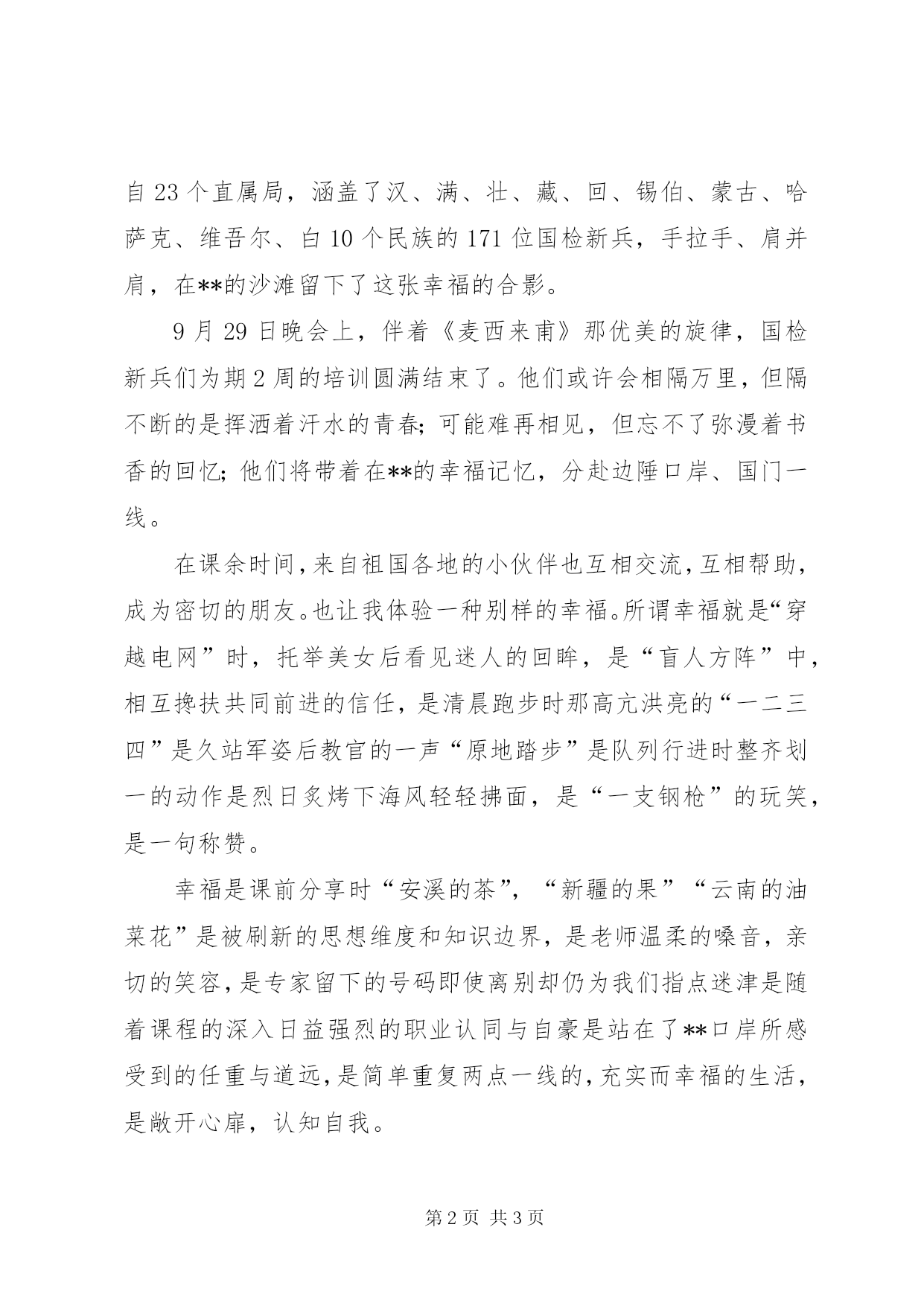 第PAGE\*Arabic\*MERGEFORMAT3页共NUMPAGES\*MERGEFORMAT3页公务员初任培训学习心得金秋九月,秋风送爽,我们按照总局的培训要求,全国23个直属局的国检新兵相聚质检总局**培训中心进行为期半个月的初任培训。培训期间不但请到总局各办的专业老师为我们讲解我们的精湛的业务知识,同时又请到山海关边防士官为我们做军事训练的教官,每天清晨天不亮就会听到起床哨声,成为我们那段时间最美好的回忆。为了增强我们的体质,每天增加了晨跑,让我们感受到了锻炼不仅能增强体魄同时也增强了毅力,可谓意义深远。专业知识的讲解层层递进,步步深入,让我们耳目一新,同时也深知肩上的使命神圣,我在心中暗自告诫自己:一定要不辜负组织的信任,勇于担当自己的责任,努力完成自己的工作,为质检人增光添彩。总局不但为我们请来了专业老师,还请来了在心理方面的专家,为我们排解心理上的烦恼,还有唐老师的组织的自我认知分享活动,让我们看到了大家精彩的人生,不禁感叹,这个组织卧虎藏龙,每个人都有大家学习的地方,看着大家丰富多彩的业余文化生活也是我们的人生境界和追求有所提升,在未来的道路上我们还需要不断地成长和完善自己。在忙碌的学习之余,我们也会适当的放松。9月29日,来自23个直属局,涵盖了汉、满、壮、藏、回、锡伯、蒙古、哈萨克、维吾尔、白10个民族的171位国检新兵,手拉手、肩并肩,在**的沙滩留下了这张幸福的合影。9月29日晚会上,伴着《麦西来甫》那优美的旋律,国检新兵们为期2周的培训圆满结束了。他们或许会相隔万里,但隔不断的是挥洒着汗水的青春;可能难再相见,但忘不了弥漫着书香的回忆;他们将带着在**的幸福记忆,分赴边陲口岸、国门一线。在课余时间,来自祖国各地的小伙伴也互相交流,互相帮助,成为密切的朋友。也让我体验一种别样的幸福。所谓幸福就是“穿越电网”时,托举美女后看见迷人的回眸,是“盲人方阵”中,相互搀扶共同前进的信任,是清晨跑步时那高亢洪亮的“一二三四”是久站军姿后教官的一声“原地踏步”是队列行进时整齐划一的动作是烈日炙烤下海风轻轻拂面,是“一支钢枪”的玩笑,是一句称赞。幸福是课前分享时“安溪的茶”,“新疆的果”“云南的油菜花”是被刷新的思想维度和知识边界,是老师温柔的嗓音,亲切的笑容,是专家留下的号码即使离别却仍为我们指点迷津是随着课程的深入日益强烈的职业认同与自豪是站在了**口岸所感受到的任重与道远,是简单重复两点一线的,充实而幸福的生活,是敞开心扉,认知自我。幸福,是当我正想跟你攀谈时你正好对我报以迷人微笑;是我们一起迎来朝霞晨曦一起告别云幕月亮是你唱我跳;你说我笑共同准备一台晚会是忙里偷闲约三五好友漫步沙滩一起听海;是你来到我的展板前倾听我的故事是通讯录中不断拉长的好友列表;是神秘的小伙伴儿如约而至的礼物是你给我的掌声我送你的拥抱。时光荏苒,从开始到结束,两周时间,也就一瞬这间,课表满满,在疾书的笔墨声中看到了幸福,雨雾漫漫,在淋湿的作训服中触到了幸福,队列长长,在传递的碗筷声中听到了幸福突然明白,原来幸福都是在不经意间展现......