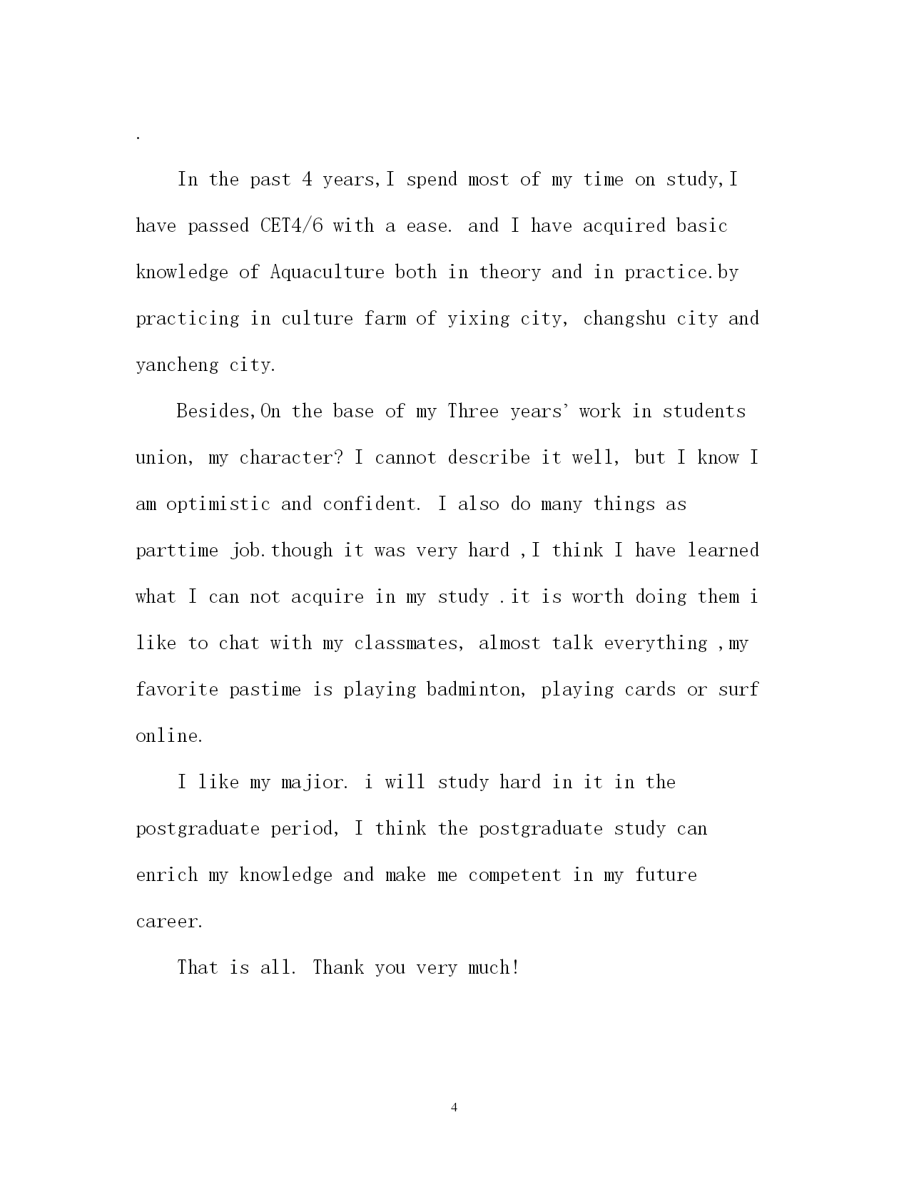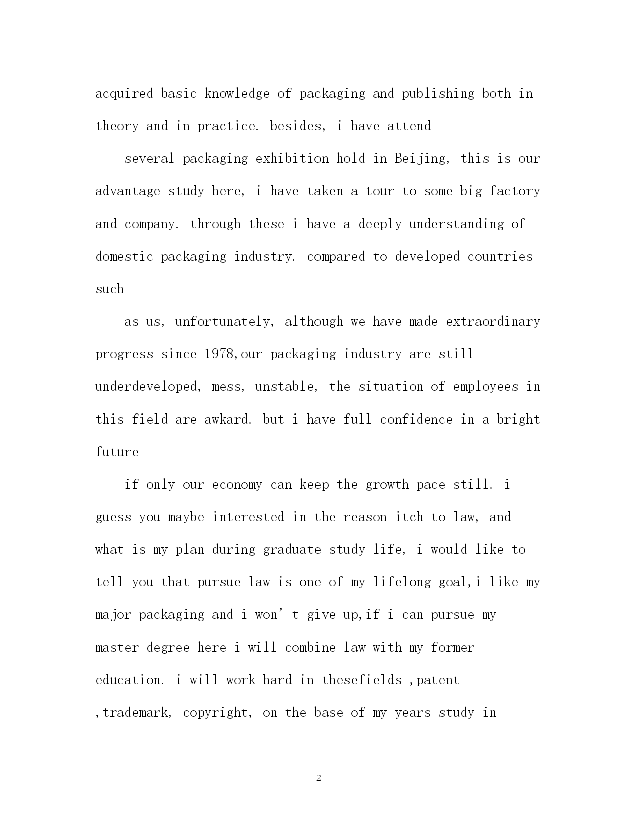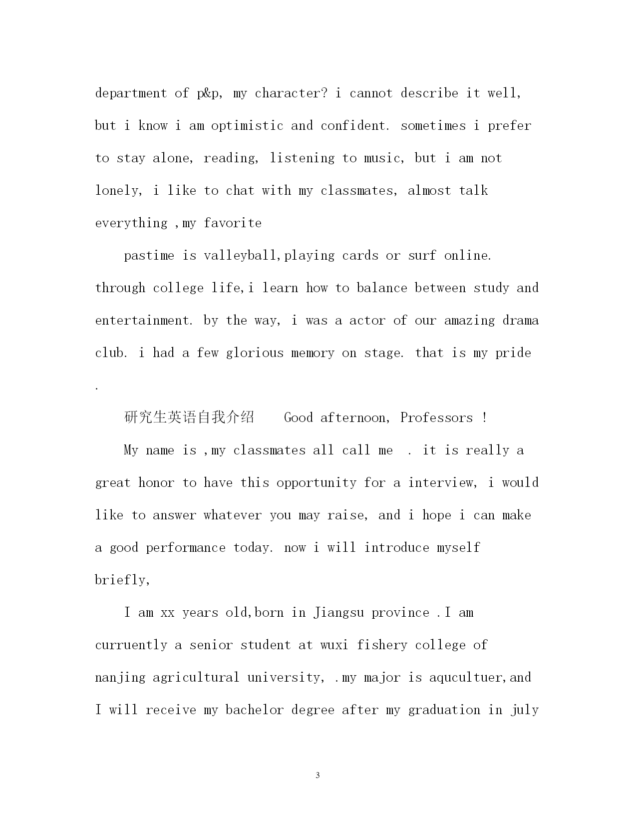 此资料由网络收集而来,如有侵权请告知上传者立即删除。资料共分享,我们负责传递知识。PAGEPAGE4研究生英语自我介绍2018研究生英语自我介绍研究生复试自我介绍分为两种:一种是中文介绍,一种是英文介绍。下面,应届毕业生网为大家整理了2018研究生的面试英语自我介绍,供大家参考,希望可以帮助到大家。研究生英语自我介绍goodmorning,mynameisjack,itisreallyagreathonortohavethisopportunityforainterview,iwouldliketoanswerwhateveryoumayraise,andihopeicanmakeagoodperformancetoday,eventuallyenrollinthisprestigiousuniversityinseptember.nowiwillintroducemyselfbriefly,iam21yearsold,borninheilongjiangprovince,northeastofchina,andiamcurruentlyaseniorstudentatbeijingXXuni.mymajorispackagingengineering.andiwillreceivemybachelordegreeaftermygraduationinjune.inthepast4years,ispendmostofmytimeonstudy,ihavepassedCET4/6withaease.andihaveacquiredbasicknowledgeofpackagingandpublishingbothintheoryandinpractice.besides,ihaveattendseveralpackagingexhibitionholdinBeijing,thisisouradvantagestudyhere,ihavetakenatourtosomebigfactoryandcompany.throughtheseihaveadeeplyunderstandingofdomesticpackagingindustry.comparedtodevelopedcountriessuchasus,unfortunately,althoughwehavemadeextraordinaryprogresssince1978,ourpackagingindustryarestillunderdeveloped,mess,unstable,thesituationofemployeesinthisfieldareawkard.butihavefullconfidenceinabrightfutureifonlyoureconomycankeepthegrowthpacestill.iguessyoumaybeinterestedinthereasonitchtolaw,andwhatismyplanduringgraduatestudylife,iwouldliketotellyouthatpursuelawisoneofmylifelonggoal,ilikemymajorpackagingandiwon’tgiveup,ificanpursuemymasterdegreehereiwillcombinelawwithmyformereducation.iwillworkhardinthesefields,patent,trademark,copyright,onthebaseofmyyearsstudyindepartmentofp&p,mycharacter?icannotdescribeitwell,butiknowiamoptimisticandconfident.sometimesiprefertostayalone,reading,listeningtomusic,butiamnotlonely,iliketochatwithmyclassmates,almosttalkeverything,myfavoritepastimeisvalleyball,playingcardsorsurfonline.throughcollegelife,ilearnhowtobalancebetweenstudyandentertainment.bytheway,iwasaactorofouramazingdramaclub.ihadafewgloriousmemoryonstage.thatismypride.研究生英语自我介绍Goodafternoon,Professors!M