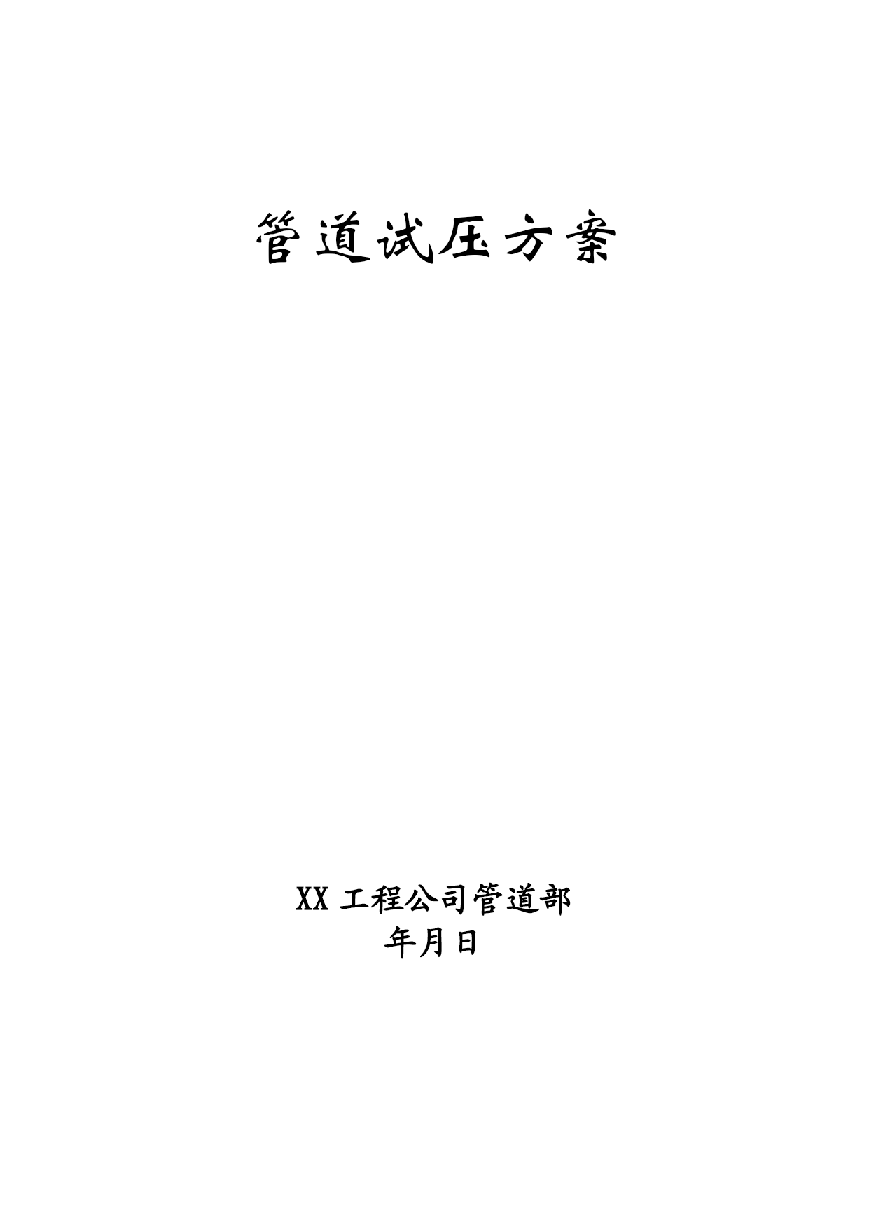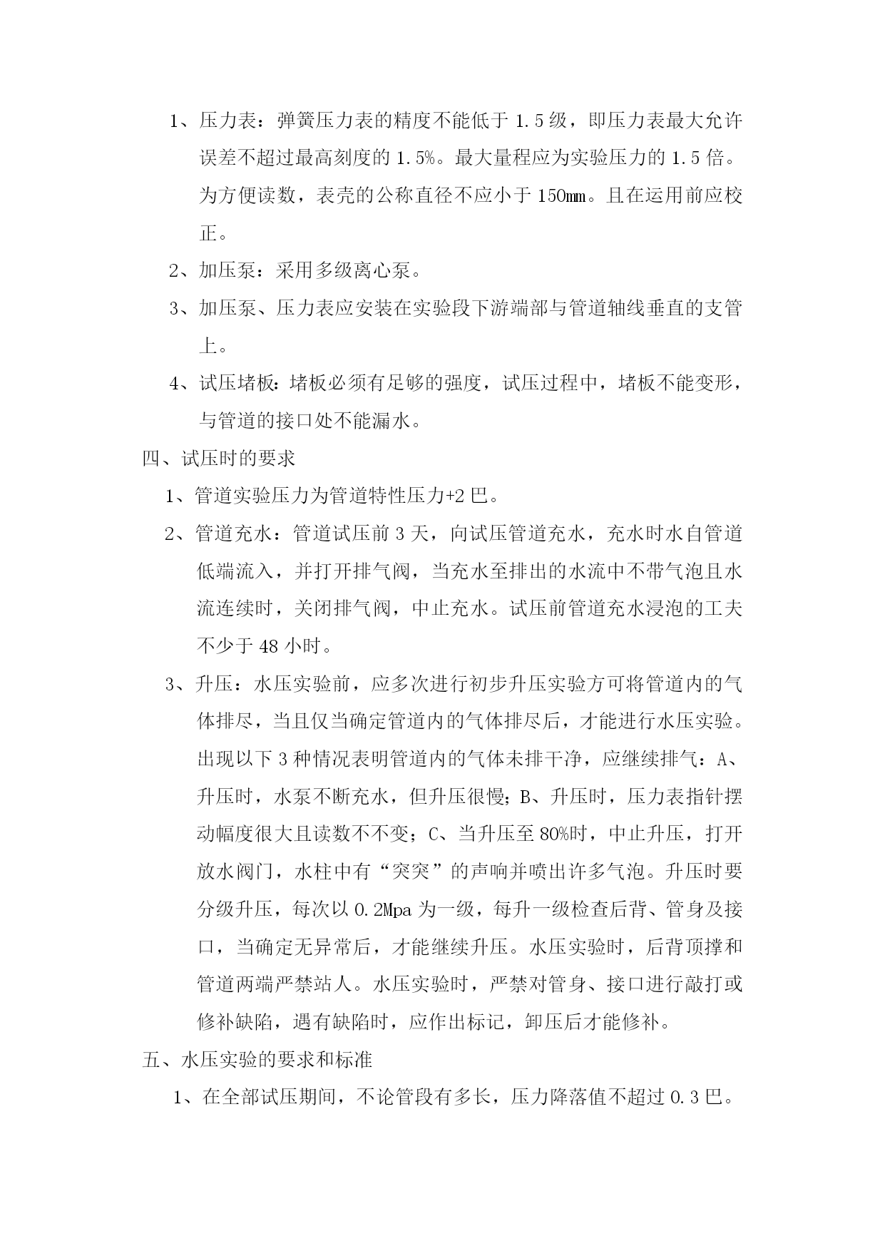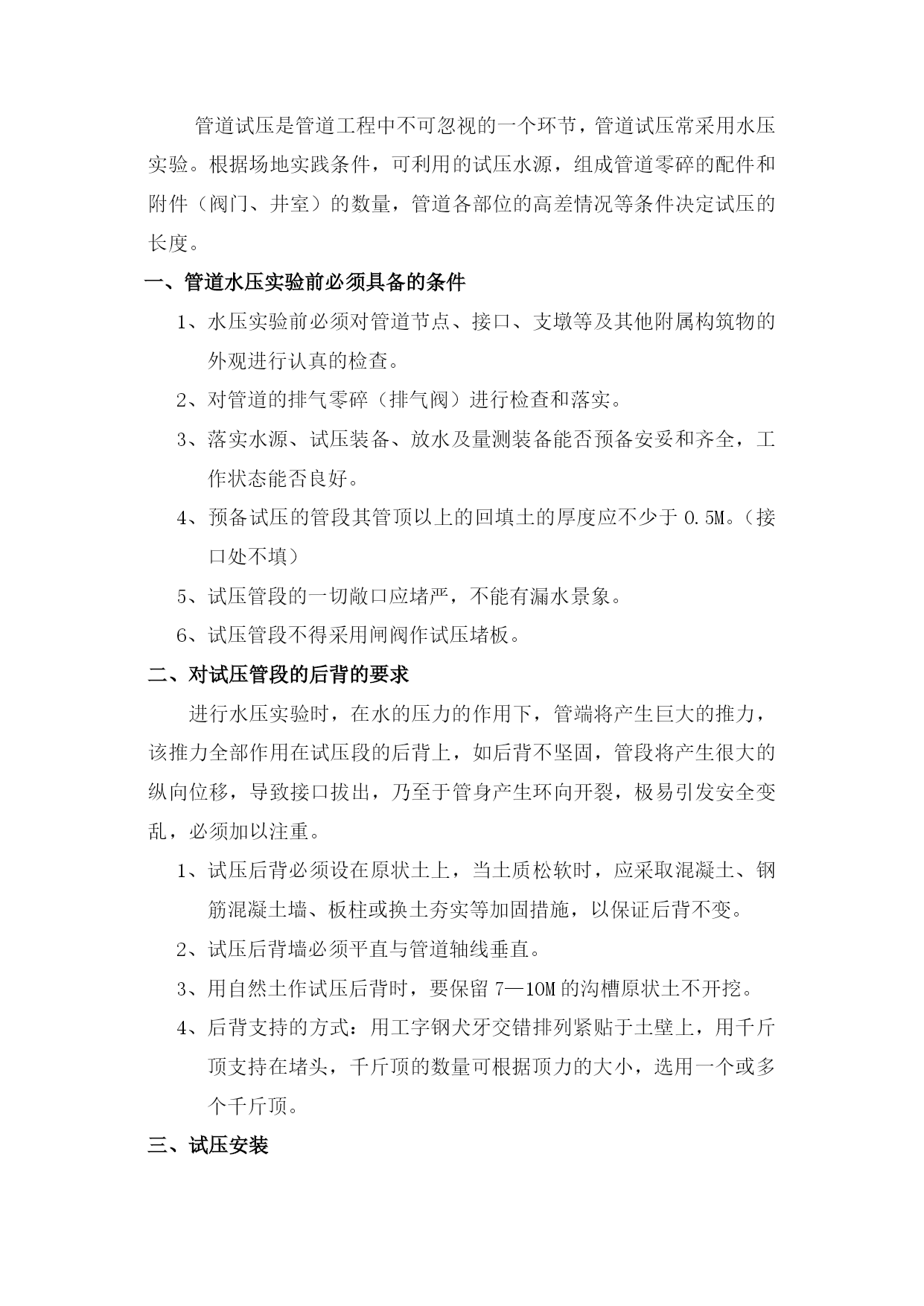 管道试压方案XX工程公司管道部年月日管道试压是管道工程中不可忽视的一个环节,管道试压常采用水压实验。根据场地实践条件,可利用的试压水源,组成管道零碎的配件和附件(阀门、井室)的数量,管道各部位的高差情况等条件决定试压的长度。一、管道水压实验前必须具备的条件1、水压实验前必须对管道节点、接口、支墩等及其他附属构筑物的外观进行认真的检查。2、对管道的排气零碎(排气阀)进行检查和落实。3、落实水源、试压装备、放水及量测装备能否预备安妥和齐全,工作状态能否良好。4、预备试压的管段其管顶以上的回填土的厚度应不少于0.5M。(接口处不填)5、试压管段的一切敞口应堵严,不能有漏水景象。6、试压管段不得采用闸阀作试压堵板。二、对试压管段的后背的要求进行水压实验时,在水的压力的作用下,管端将产生巨大的推力,该推力全部作用在试压段的后背上,如后背不坚固,管段将产生很大的纵向位移,导致接口拔出,乃至于管身产生环向开裂,极易引发安全变乱,必须加以注重。1、试压后背必须设在原状土上,当土质松软时,应采取混凝土、钢筋混凝土墙、板柱或换土夯实等加固措施,以保证后背不变。2、试压后背墙必须平直与管道轴线垂直。3、用自然土作试压后背时,要保留7—10M的沟槽原状土不开挖。4、后背支持的方式:用工字钢犬牙交错排列紧贴于土壁上,用千斤顶支持在堵头,千斤顶的数量可根据顶力的大小,选用一个或多个千斤顶。三、试压安装1、压力表:弹簧压力表的精度不能低于1.5级,即压力表最大允许误差不超过最高刻度的1.5%。最大量程应为实验压力的1.5倍。为方便读数,表壳的公称直径不应小于150mm。且在运用前应校正。2、加压泵:采用多级离心泵。3、加压泵、压力表应安装在实验段下游端部与管道轴线垂直的支管上。4、试压堵板:堵板必须有足够的强度,试压过程中,堵板不能变形,与管道的接口处不能漏水。四、试压时的要求1、管道实验压力为管道特性压力+2巴。2、管道充水:管道试压前3天,向试压管道充水,充水时水自管道低端流入,并打开排气阀,当充水至排出的水流中不带气泡且水流连续时,关闭排气阀,中止充水。试压前管道充水浸泡的工夫不少于48小时。3、升压:水压实验前,应多次进行初步升压实验方可将管道内的气体排尽,当且仅当确定管道内的气体排尽后,才能进行水压实验。出现以下3种情况表明管道内的气体未排干净,应继续排气:A、升压时,水泵不断充水,但升压很慢;B、升压时,压力表指针摆动幅度很大且读数不不变;C、当升压至80%时,中止升压,打开放水阀门,水柱中有“突突”的声响并喷出许多气泡。升压时要分级升压,每次以0.2Mpa为一级,每升一级检查后背、管身及接口,当确定无异常后,才能继续升压。水压实验时,后背顶撑和管道两端严禁站人。水压实验时,严禁对管身、接口进行敲打或修补缺陷,遇有缺陷时,应作出标记,卸压后才能修补。五、水压实验的要求和标准1、在全部试压期间,不论管段有多长,压力降落值不超过0.3巴。2、在实验压力下,管段不得出现裂缝、变色、渗漏等景象。六、试压报告每次试压必须出具业主和承包商认可的报告。包括以下内容:1、试压日期,编号。2、试压管段的精确地位。3、试压草图,标明管道安装按次、接头、阀门、仪器的数量和特性。4、试压持续工夫、压力、结论。5、补缀的决定。