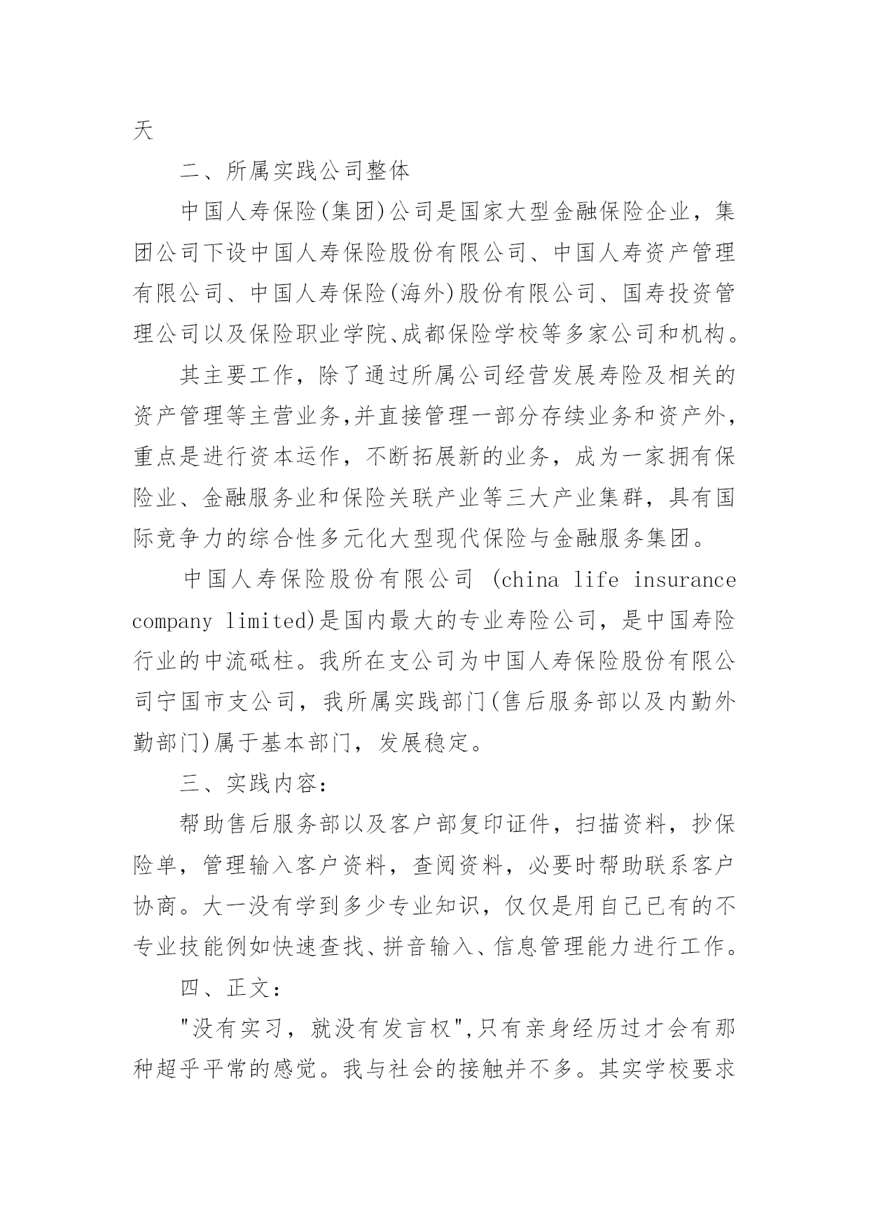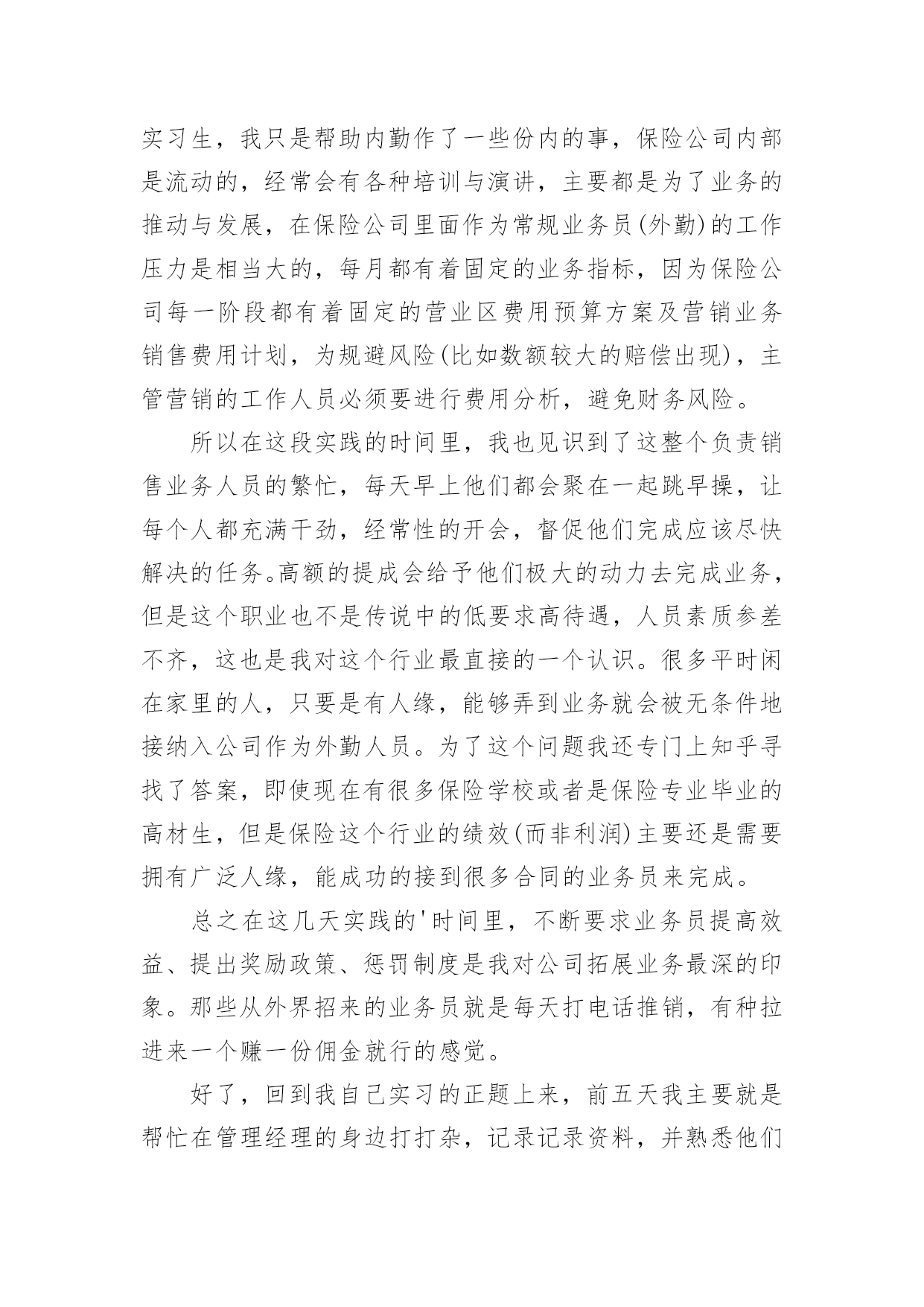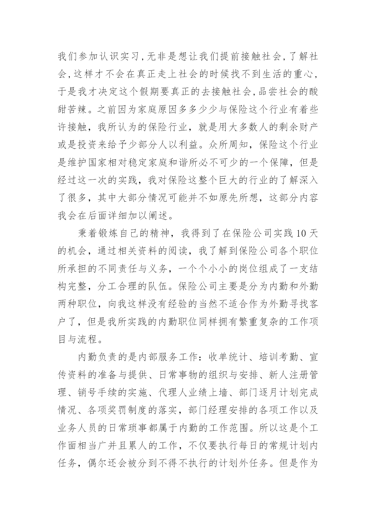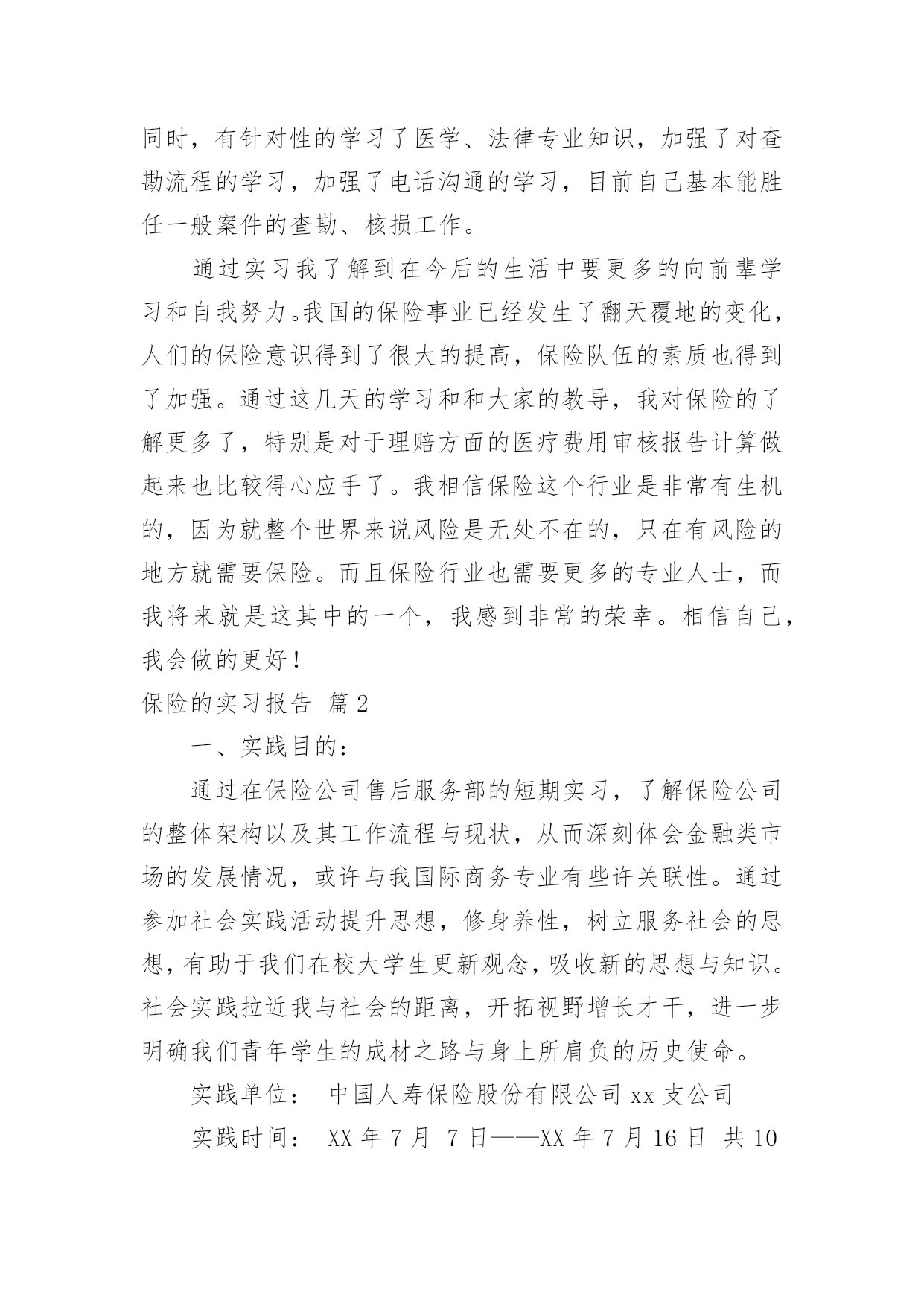保险的实习报告有关保险的实习报告集锦十篇随着个人的文明素养不断提升,报告使用的次数愈发增长,报告具有语言陈述性的特点。你知道怎样写报告才能写的好吗?下面是小编整理的保险的实习报告10篇,仅供参考,希望能够帮助到大家。保险的实习报告篇1时间一晃而过,到太保工作已经一个月了,在这段时间里领导同事都给予了我足够的宽容、支持和帮助,让我充分感受到了太保“诚信天下,稳健经营,追求卓越”的品质,也体会到了作为理赔人的专业和辛勤。在对您们肃然起敬的同时,也为我有机会成为太保的一份子而惊喜万分。在这一个月的时间里,领导对我们工作学习进度有着细致的安排,一至二周主要学习理论知识,辅以简单案例的学习,二至三周则以实例案件学习为重心,理论联系实际,加强之前的理论学习,三至四周开始实际处理一些简单案例并学习系统的录入,第四周则开始了医院查勘工作。在领导和同事们的悉心关怀和指导下,通过自身的不懈努力,各方面均取得了一定的进步,现将我的工作情况作如下汇报。一、通过学习和日常工作积累使我对太保有了较为深刻的认识记得初到太保时,在和领导的第一次谈话时就注意到,太保是一家非常重视员工感受的公司,公司的规章制度都非常的人性化,尽量为大家营造出轻松的工作氛围。但是,这并没有影响到公司运作的专业和严谨性。我想,作为一个分公司的理赔人员,对单个案件的处理的确只是基本技能,更重要的是对流程的把握,这也应该是自己工作学习的重心。二、坚持保险理论学习让我的理赔理论素养得到提高在太保工作的前两周,领导并没有安排给我们具体的'工作任务,而是要求我们学习公司的条款,学习保险法,学习相关的法律法规,学习总公司的人伤理赔指导手册,或许有的理论我们暂时并不会用上,但是,不懂战术的士兵不会是一个好兵,没有这些理论知识作为基础,今后在在遇到复杂一点理赔案例时,我们可能就会束手无侧。在之后的案例学习中自己也发现,之前的理论并没有空学,很多案件都需要理论的支撑,扎实的理论知识让自己在实践工作中受益匪浅。我想,理论知识的学习在任何时候都不会是浪费时间。三、认真学习岗位职能,工作能力得到了一定的提高根据岗位职责的要求,分公司人伤核损员的主要工作任务是(1)人伤案件的查勘工作;(2)人伤案件各项费用的审核;(3)人伤诉讼案件赔偿的建议;(4)分公司人伤理赔工作情况的分析;(5)领导交办的其他工作。通过完成上述工作,使我认识到一个称职的人伤核损员应当具有专业的医学知识和法律知识、良好的沟通能力、理赔数据的分析报告能力、理赔流程的检视能力。虽然之前对理赔工作有一定的接触,但实际工作中发现自己在许多方面都还存在着不足,案件的处理上还时常会有这样或那样的遗漏,在日常工作的同时,有针对性的学习了医学、法律专业知识,加强了对查勘流程的学习,加强了电话沟通的学习,目前自己基本能胜任一般案件的查勘、核损工作。通过实习我了解到在今后的生活中要更多的向前辈学习和自我努力。我国的保险事业已经发生了翻天覆地的变化,人们的保险意识得到了很大的提高,保险队伍的素质也得到了加强。通过这几天的学习和和大家的教导,我对保险的了解更多了,特别是对于理赔方面的医疗费用审核报告计算做起来也比较得心应手了。我相信保险这个行业是非常有生机的,因为就整个世界来说风险是无处不在的,只在有风险的地方就需要保险。而且保险行业也需要更多的专业人士,而我将来就是这其中的一个,我感到非常的荣幸。相信自己,我会做的更好!保险的实习报告篇2一、实践目的:通过在保险公司售后服务部的短期实习,了解保险公司的整体架构以及其工作流程与现状,从而深刻体会金融类市场的发展情况,或许与我国际商务专业有些许关联性。通过参加社会实践活动提升思想,修身养性,树立服务社会的思想,有助于我们在校大学生更新观念,吸收新的思想与知识。社会实践拉近我与社会的距离,开拓视野增长才干,进一步明确我们青年学生的成材之路与身上所肩负的历史使命。实践单位:中国人寿保险股份有限公司xx支公司实践时间:XX年7月7日——XX年7月16日共10天二、所属实践公司整体中国人寿保险(集团)公司是国家大型金融保险企业,集团公司下设中国人寿保险股份有限公司、中国人寿资产管理有限公司、中国人寿保险(海外)股份有限公司、国寿投资管理公司以及保险职业学院、成都保险学校等多家公司和机构。其主要工作,除了通过所属公司经营发展寿险及相关的资产管理等主营业务,并直接管理一部分存续业务和资产外,重点是进行资本运作,不断拓展新的业务,成为一家拥有保险业、金融服务业和保险关联产业等三大产业集群,具有国际竞争力的综合性多元化大型现代保险与金融服务集团。中国人寿保险股份有限公司(chinalifeinsurancecompanylimited)是国内最大的专业寿险公司,是中国寿险行业的中流砥柱。我所在支公司为中国人寿保险股份有限公司