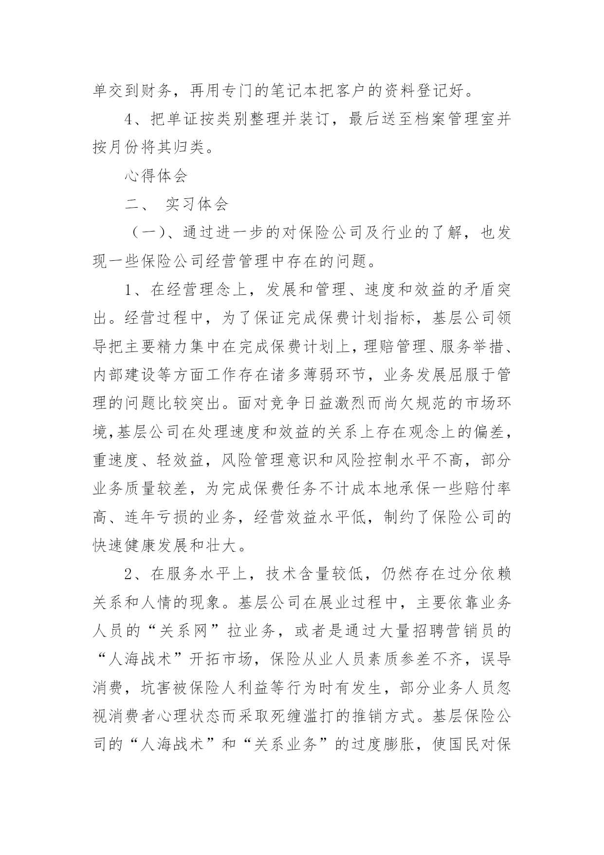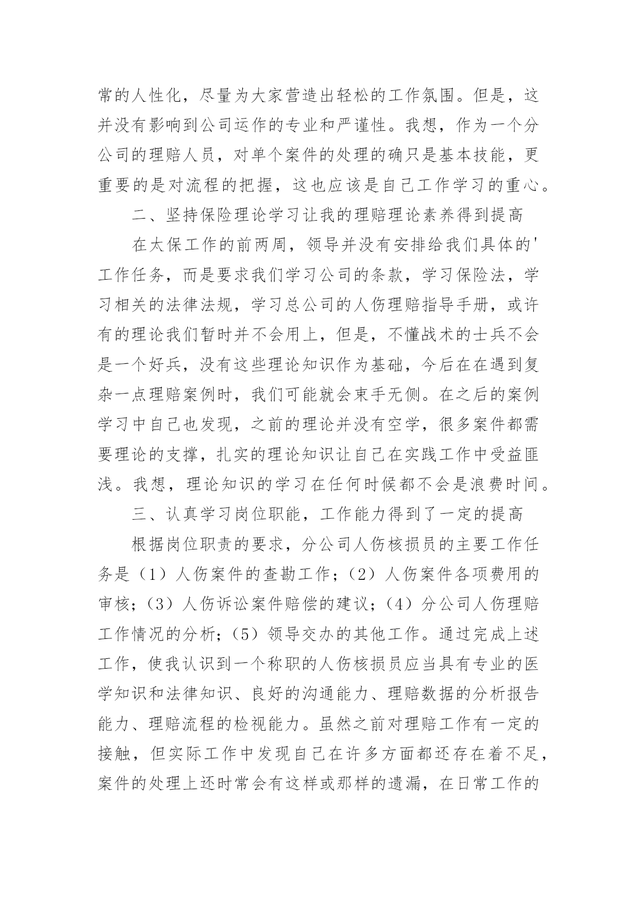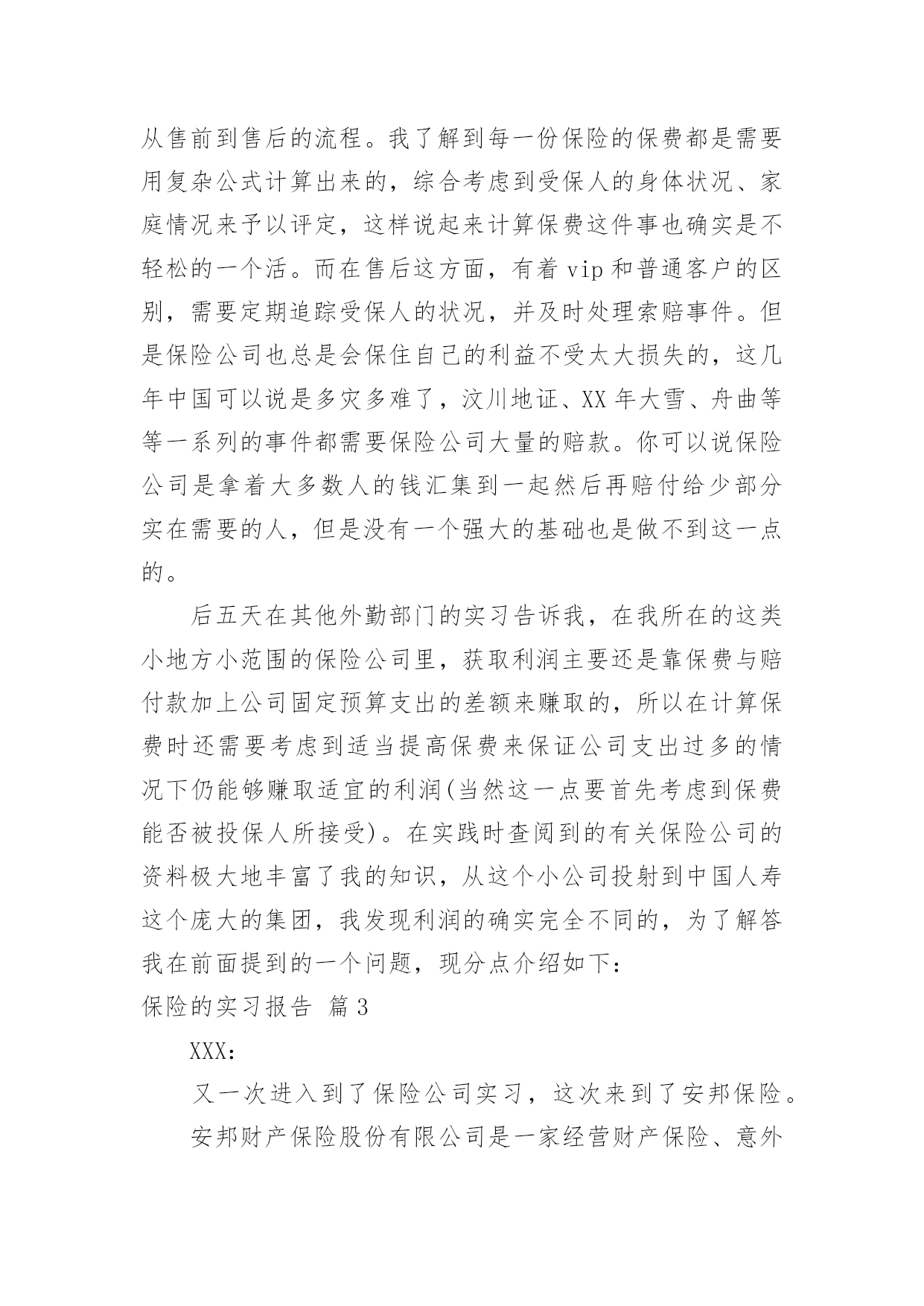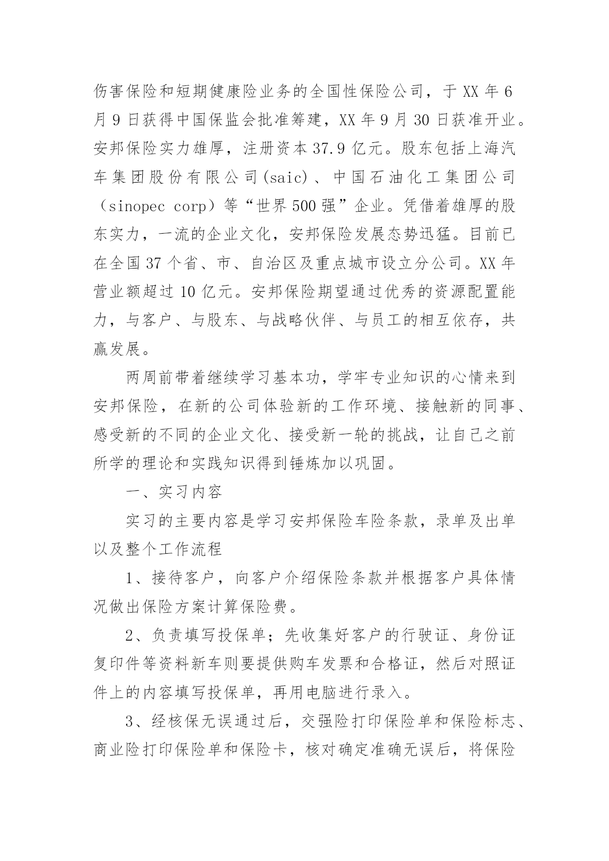 保险的实习报告有关保险的实习报告集锦十篇随着个人的文明素养不断提升,报告使用的次数愈发增长,报告具有语言陈述性的特点。你知道怎样写报告才能写的好吗?下面是小编整理的保险的实习报告10篇,仅供参考,希望能够帮助到大家。保险的实习报告篇1时间一晃而过,到太保工作已经一个月了,在这段时间里领导同事都给予了我足够的宽容、支持和帮助,让我充分感受到了太保“诚信天下,稳健经营,追求卓越”的品质,也体会到了作为理赔人的专业和辛勤。在对您们肃然起敬的同时,也为我有机会成为太保的一份子而惊喜万分。在这一个月的时间里,领导对我们工作学习进度有着细致的安排,一至二周主要学习理论知识,辅以简单案例的学习,二至三周则以实例案件学习为重心,理论联系实际,加强之前的理论学习,三至四周开始实际处理一些简单案例并学习系统的录入,第四周则开始了医院查勘工作。在领导和同事们的悉心关怀和指导下,通过自身的不懈努力,各方面均取得了一定的进步,现将我的工作情况作如下汇报。一、通过学习和日常工作积累使我对太保有了较为深刻的认识记得初到太保时,在和领导的第一次谈话时就注意到,太保是一家非常重视员工感受的公司,公司的规章制度都非常的人性化,尽量为大家营造出轻松的工作氛围。但是,这并没有影响到公司运作的专业和严谨性。我想,作为一个分公司的理赔人员,对单个案件的处理的确只是基本技能,更重要的是对流程的把握,这也应该是自己工作学习的重心。二、坚持保险理论学习让我的理赔理论素养得到提高在太保工作的前两周,领导并没有安排给我们具体的'工作任务,而是要求我们学习公司的条款,学习保险法,学习相关的法律法规,学习总公司的人伤理赔指导手册,或许有的理论我们暂时并不会用上,但是,不懂战术的士兵不会是一个好兵,没有这些理论知识作为基础,今后在在遇到复杂一点理赔案例时,我们可能就会束手无侧。在之后的案例学习中自己也发现,之前的理论并没有空学,很多案件都需要理论的支撑,扎实的理论知识让自己在实践工作中受益匪浅。我想,理论知识的学习在任何时候都不会是浪费时间。三、认真学习岗位职能,工作能力得到了一定的提高根据岗位职责的要求,分公司人伤核损员的主要工作任务是(1)人伤案件的查勘工作;(2)人伤案件各项费用的审核;(3)人伤诉讼案件赔偿的建议;(4)分公司人伤理赔工作情况的分析;(5)领导交办的其他工作。通过完成上述工作,使我认识到一个称职的人伤核损员应当具有专业的医学知识和法律知识、良好的沟通能力、理赔数据的分析报告能力、理赔流程的检视能力。虽然之前对理赔工作有一定的接触,但实际工作中发现自己在许多方面都还存在着不足,案件的处理上还时常会有这样或那样的遗漏,在日常工作的同时,有针对性的学习了医学、法律专业知识,加强了对查勘流程的学习,加强了电话沟通的学习,目前自己基本能胜任一般案件的查勘、核损工作。通过实习我了解到在今后的生活中要更多的向前辈学习和自我努力。我国的保险事业已经发生了翻天覆地的变化,人们的保险意识得到了很大的提高,保险队伍的素质也得到了加强。通过这几天的学习和和大家的教导,我对保险的了解更多了,特别是对于理赔方面的医疗费用审核报告计算做起来也比较得心应手了。我相信保险这个行业是非常有生机的,因为就整个世界来说风险是无处不在的,只在有风险的地方就需要保险。而且保险行业也需要更多的专业人士,而我将来就是这其中的一个,我感到非常的荣幸。相信自己,我会做的更好!保险的实习报告篇2一、实践目的:通过在保险公司售后服务部的短期实习,了解保险公司的整体架构以及其工作流程与现状,从而深刻体会金融类市场的发展情况,或许与我国际商务专业有些许关联性。通过参加社会实践活动提升思想,修身养性,树立服务社会的思想,有助于我们在校大学生更新观念,吸收新的思想与知识。社会实践拉近我与社会的距离,开拓视野增长才干,进一步明确我们青年学生的成材之路与身上所肩负的历史使命。实践单位:中国人寿保险股份有限公司xx支公司实践时间:XX年7月7日——XX年7月16日共10天二、所属实践公司整体中国人寿保险(集团)公司是国家大型金融保险企业,集团公司下设中国人寿保险股份有限公司、中国人寿资产管理有限公司、中国人寿保险(海外)股份有限公司、国寿投资管理公司以及保险职业学院、成都保险学校等多家公司和机构。其主要工作,除了通过所属公司经营发展寿险及相关的资产管理等主营业务,并直接管理一部分存续业务和资产外,重点是进行资本运作,不断拓展新的业务,成为一家拥有保险业、金融服务业和保险关联产业等三大产业集群,具有国际竞争力的综合性多元化大型现代保险与金融服务集团。中国人寿保险股份有限公司(chinalifeinsurancecompanylimited)是国内最大的专业寿险公司,是中国寿险行业的中流砥柱。我所在支公司为中国人寿保险股份有限公司