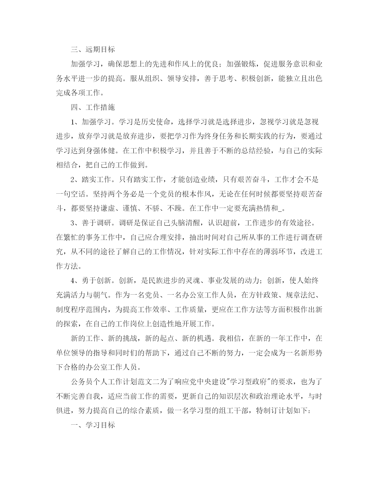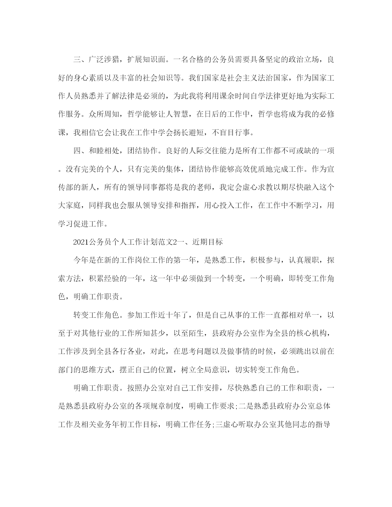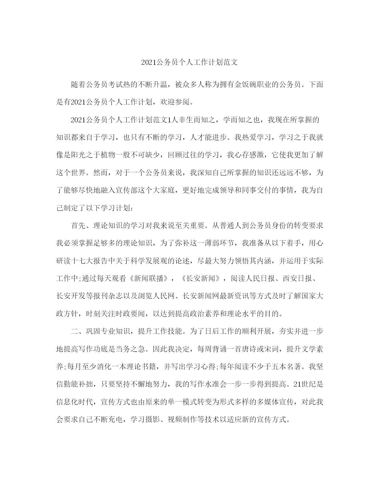 公务员个人工作计划范本(完整版)文档资料可直接使用,可编辑,欢迎下载2021公务员个人工作计划范文随着公务员考试热的不断升温,被众多人称为拥有金饭碗职业的公务员。下面是有2021公务员个人工作计划,欢迎参阅。2021公务员个人工作计划范文1人非生而知之,学而知之也,我现在所掌握的知识都来自于学习,也只有不断的学习,人才能进步。我热爱学习,学习之于我就像是阳光之于植物一般不可缺少,回顾过往的学习,我心存感激,它使我更加了解这个世界。然而,对于一个公务员来说,我深知自己所掌握的知识还远远不够,为了能够尽快地融入宣传部这个大家庭,更好地完成领导和同事交付的事情,我为自己制定了以下学习计划:首先、理论知识的学习对我来说至关重要。从普通人到公务员身份的转变要求我必须掌握足够多的理论知识,为了弥补这一薄弱环节,我准备从以下着手,用心研读十七大报告中关于科学发展观的论述,尽最大努力领悟其内涵,并运用于实际工作中;通过每天观看《新闻联播》,《长安新闻》,阅读人民日报、西安日报、长安开发等报刊杂志以及浏览人民网、长安新闻网最新资讯等方式及时了解国家大政方针,时刻关注时政要闻,以达到提高政治素养和理论水平的目的。二、巩固专业知识,提升工作技能。为了日后工作的顺利开展,夯实并进一步地提高写作功底是当务之急。因此我决定,每周背诵一首唐诗或宋词,提升文学素养;每月至少消化一本理论书籍,并写出学习心得;每年阅读不少于五本名著。我坚信勤能补拙,只要坚持不懈地努力,我的写作水准会一步一步得到提高。21世纪是信息化时代,宣传方式也由原来的单一模式转变为形式多样的多媒体宣传,对此我会要求自己不断充电,学习摄影、视频制作等技术以适应新的宣传方式。三、广泛涉猎,扩展知识面。一名合格的公务员需要具备坚定的政治立场,良好的身心素质以及丰富的社会知识等。我们国家是社会主义法治国家,作为国家工作人员熟悉并了解法律是必须的,为此我将利用课余时间自学法律更好地为实际工作服务。众所周知,哲学能够让人智慧,在日后的工作中,哲学也将成为我的必修课,我相信它会让我在工作中学会扬长避短,不盲目行事。四、和睦相处,团结协作。良好的人际交往能力是所有工作都不可或缺的一项。没有完美的个人,只有完美的集体,团结协作能够高效优质地完成工作。作为宣传部的新人,所有的领导同事都将是我的老师,我定会虚心求教以期尽快融入这个大家庭,同样我也会服从领导安排和指挥,用心投入工作,在工作中不断学习,用学习促进工作。2021公务员个人工作计划范文2一、近期目标今年是在新的工作岗位工作的第一年,是熟悉工作,积极参与,认真履职,探索方法,积累经验的一年,这一年中必须做到一个转变,一个明确,即转变工作角色,明确工作职责。转变工作角色。参加工作近十年了,但是自己从事的工作一直都相对单一,以至于对其他行业的工作所知甚少,以至陌生,县政府办公室作为全县的核心机构,工作涉及到全县各行各业,对此,在思考问题以及做事情的时候,必须跳出以前在部门的思维方式,摆正自己的位置,树立全局意识,切实转变工作角色。明确工作职责。按照办公室对自己工作安排,尽快熟悉自己的工作和职责,一是熟悉县政府办公室的各项规章制度,明确工作要求;二是熟悉县政府办公室总体工作及相关业务年初工作目标,明确工作任务;三虚心听取办公室其他同志的指导,善于学习,不断的提高自己的业务水平,明确工作的运行和处理问题的程序;四要认真与科室其他同志总结前期工作,明确工作努力方向。二、中期目标在明确工作职责、工作任务,熟悉工作方的前提下,明年,必须进一步加强自身锤炼,做到政治素质、业务能力、工作绩效三个提升。提升政治素质。一是要善于从政治角度看问题。无论面临的情况多么复杂,要坚持从政治角度分析判断问题,保持清醒头脑。二要保持政治敏锐性。密切关注时事、了解时事,通过网络、报刊、电视等,敏锐把握各项方针政策动向,保持工作的主动性。提升业务能力。一是提升写作能力。加强理论学习,注重平时公文写作中的锻炼,注意办公室其他同志撰写材料的学习,能较好完成交办的新文件拟稿任务。二是提升语言表达能力。加强说话训练,做到汇报工作准确、简洁、清楚。提升工作绩效。虚心听取领导、同志、部门等对自己工作的意见和建议,总结经验教训,提高工作效率,优质的完成各项工作。认真做好调研、信息报送等工作,能超额完成办公室下达的工作目标。三、远期目标加强学习,确保思想上的先进和作风上的优良;加强锻炼,促进服务意识和业务水平进一步的提高。服从组织、领导安排,善于思考、积极创新,能独立且出色完成各项工作。四、工作措施1、加强学习。学习是历史使命,选择学习就是选择进步,忽视学习就是忽视进步,放弃学习就是放弃进步,要把学习作为终身任务和长期实践的行为,要通过学习达到身强体健。在工作中积极