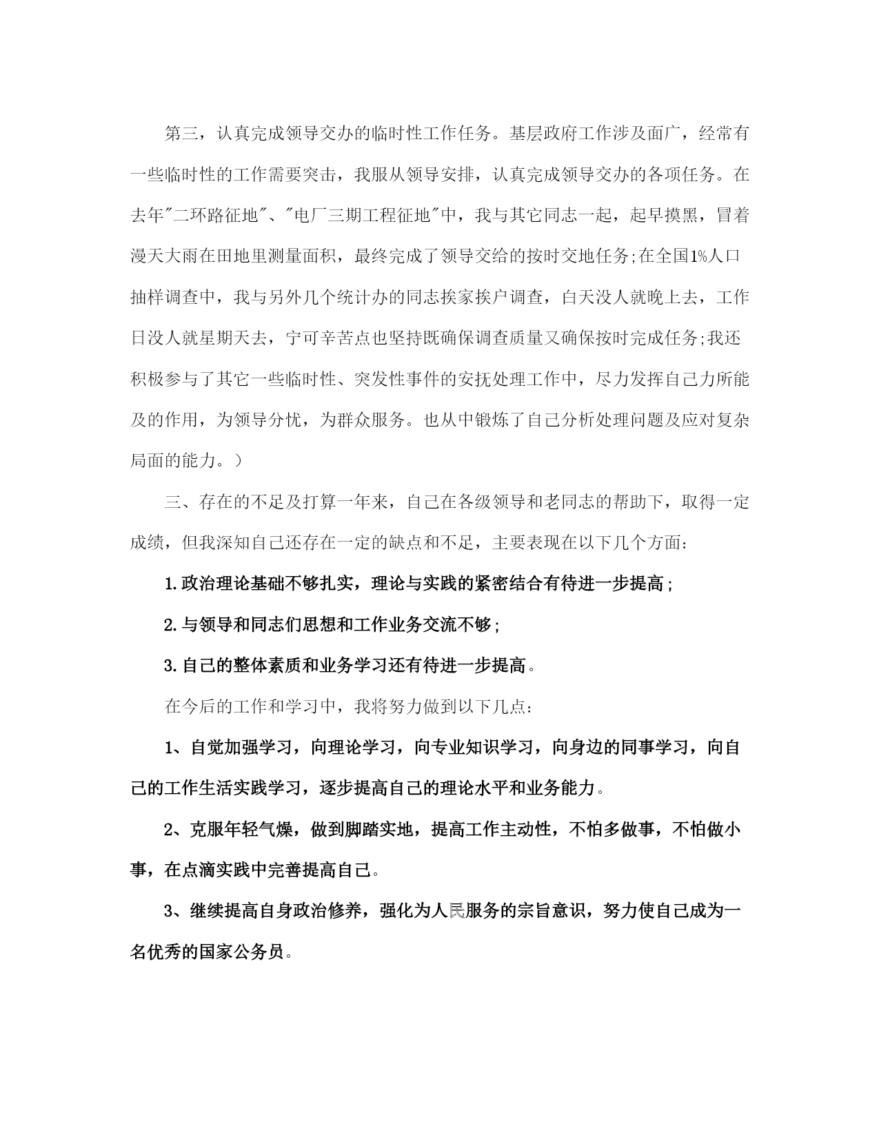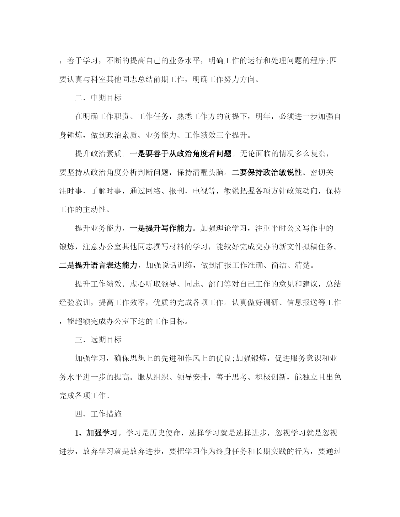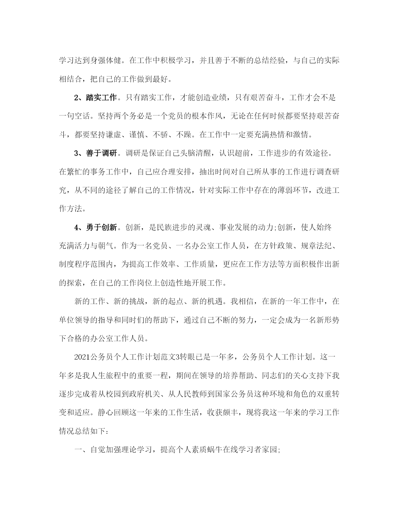公务员个人工作计划范本(完整版)文档资料可直接使用,可编辑,欢迎下载2021公务员个人工作计划范文随着公务员考试热的不断升温,被众多人称为拥有金饭碗职业的公务员。下面是有2021公务员个人工作计划,欢迎参阅。2021公务员个人工作计划范文1人非生而知之,学而知之也,我现在所掌握的知识都来自于学习,也只有不断的学习,人才能进步。我热爱学习,学习之于我就像是阳光之于植物一般不可缺少,回顾过往的学习,我心存感激,它使我更加了解这个世界。然而,对于一个公务员来说,我深知自己所掌握的知识还远远不够,为了能够尽快地融入宣传部这个大家庭,更好地完成领导和同事交付的事情,我为自己制定了以下学习计划:首先、理论知识的学习对我来说至关重要。从普通人到公务员身份的转变要求我必须掌握足够多的理论知识,为了弥补这一薄弱环节,我准备从以下着手,用心研读十七大报告中关于科学发展观的论述,尽最大努力领悟其内涵,并运用于实际工作中;通过每天观看《新闻联播》,《长安新闻》,阅读人民日报、西安日报、长安开发等报刊杂志以及浏览人民网、长安新闻网最新资讯等方式及时了解国家大政方针,时刻关注时政要闻,以达到提高政治素养和理论水平的目的。二、巩固专业知识,提升工作技能。为了日后工作的顺利开展,夯实并进一步地提高写作功底是当务之急。因此我决定,每周背诵一首唐诗或宋词,提升文学素养;每月至少消化一本理论书籍,并写出学习心得;每年阅读不少于五本名著。我坚信勤能补拙,只要坚持不懈地努力,我的写作水准会一步一步得到提高。21世纪是信息化时代,宣传方式也由原来的单一模式转变为形式多样的多媒体宣传,对此我会要求自己不断充电,学习摄影、视频制作等技术以适应新的宣传方式。三、广泛涉猎,扩展知识面。一名合格的公务员需要具备坚定的政治立场,良好的身心素质以及丰富的社会知识等。我们国家是社会主义法治国家,作为国家工作人员熟悉并了解法律是必须的,为此我将利用课余时间自学法律更好地为实际工作服务。众所周知,哲学能够让人智慧,在日后的工作中,哲学也将成为我的必修课,我相信它会让我在工作中学会扬长避短,不盲目行事。四、和睦相处,团结协作。良好的人际交往能力是所有工作都不可或缺的一项。没有完美的个人,只有完美的集体,团结协作能够高效优质地完成工作。作为宣传部的新人,所有的领导同事都将是我的老师,我定会虚心求教以期尽快融入这个大家庭,同样我也会服从领导安排和指挥,用心投入工作,在工作中不断学习,用学习促进工作。2021公务员个人工作计划范文2一、近期目标今年是在新的工作岗位工作的第一年,是熟悉工作,积极参与,认真履职,探索方法,积累经验的一年,这一年中必须做到一个转变,一个明确,即转变工作角色,明确工作职责。转变工作角色。参加工作近十年了,但是自己从事的工作一直都相对单一,以至于对其他行业的工作所知甚少,以至陌生,县政府办公室作为全县的核心机构,工作涉及到全县各行各业,对此,在思考问题以及做事情的时候,必须跳出以前在部门的思维方式,摆正自己的位置,树立全局意识,切实转变工作角色。明确工作职责。按照办公室对自己工作安排,尽快熟悉自己的工作和职责,一是熟悉县政府办公室的各项规章制度,明确工作要求;二是熟悉县政府办公室总体工作及相关业务年初工作目标,明确工作任务;三虚心听取办公室其他同志的指导,善于学习,不断的提高自己的业务水平,明确工作的运行和处理问题的程序;四要认真与科室其他同志总结前期工作,明确工作努力方向。二、中期目标在明确工作职责、工作任务,熟悉工作方的前提下,明年,必须进一步加强自身锤炼,做到政治素质、业务能力、工作绩效三个提升。提升政治素质。一是要善于从政治角度看问题。无论面临的情况多么复杂,要坚持从政治角度分析判断问题,保持清醒头脑。二要保持政治敏锐性。密切关注时事、了解时事,通过网络、报刊、电视等,敏锐把握各项方针政策动向,保持工作的主动性。提升业务能力。一是提升写作能力。加强理论学习,注重平时公文写作中的锻炼,注意办公室其他同志撰写材料的学习,能较好完成交办的新文件拟稿任务。二是提升语言表达能力。加强说话训练,做到汇报工作准确、简洁、清楚。提升工作绩效。虚心听取领导、同志、部门等对自己工作的意见和建议,总结经验教训,提高工作效率,优质的完成各项工作。认真做好调研、信息报送等工作,能超额完成办公室下达的工作目标。三、远期目标加强学习,确保思想上的先进和作风上的优良;加强锻炼,促进服务意识和业务水平进一步的提高。服从组织、领导安排,善于思考、积极创新,能独立且出色完成各项工作。四、工作措施1、加强学习。学习是历史使命,选择学习就是选择进步,忽视学习就是忽视进步,放弃学习就是放弃进步,要把学习作为终身任务和长期实践的行为,要通过学习达到身强体健。在工作中积极