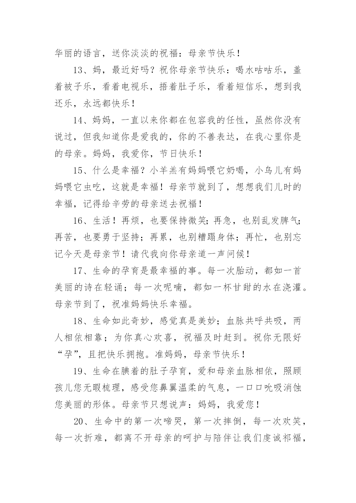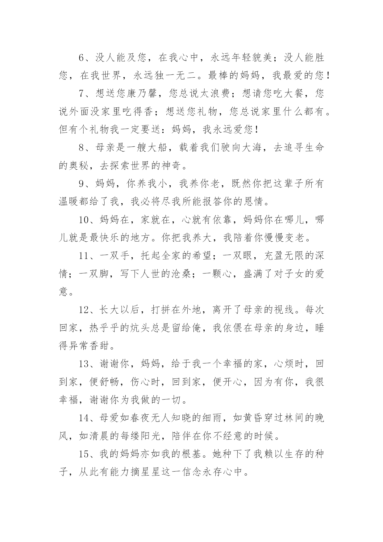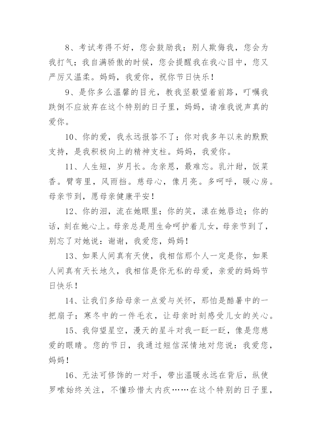 母亲节孩子送礼物文案母亲节孩子送礼物文案随着社交网络的快速发展,大家最不陌生的就是文案了吧,文案用于分享自己的生活态度和人生感悟。那发什么样的文案才不会烂大街呢?以下是小编为大家收集的母亲节孩子送礼物文案,欢迎阅读与收藏。母亲节孩子送礼物文案11、走遍千山万水,看过潮起潮落,历经风吹雨打,尝尽酸甜苦辣,始终觉得您的怀抱最温暖!不论我走多远,心中永远眷恋。祝妈妈母亲节快乐!2、今天是母亲节,愿你永远健康,美丽;一切事情都顺心,如意。没有鲜花,没有礼物,只有我深深的祝福!3、母亲您给了我生命,而我则成了您永远的牵挂。在我无法陪伴左右的日子里,愿妈妈您每一天都平安快乐。4、妈妈,我无法用言语表达我对你的爱,因为我知道这世界上最无私最伟大的就是母爱,从小到大,您一直我的骄傲,就像是我的导师一样,什么事情都是您帮我处理好,您为我操劳了太多太多了,妈妈,我爱你,母亲节快乐!5、我的时光是您的白发,我快快长大,你慢慢变老。6、生我,那是撕心裂肺的痛苦,养我,那是殚精竭虑的付出,育我,那是废寝忘食的白头,圣洁的节日最诚挚的祝福,送给最伟大的您,祝你节日快乐。7、妈妈,在今天的母亲节里,我想对您说:您是我母亲、知己和朋友的完美结合。8、考试考得不好,您会鼓励我;别人欺侮我,您会为我打气;我自满骄傲的时候,您会提醒我在我心目中,您又严厉又温柔。妈妈,我爱你,祝你节日快乐!9、是你多么温馨的目光,教我坚毅望着前路,叮嘱我跌倒不应放弃在这个特别的日子里,妈妈,请准我说声真的爱你。10、你的爱,我永远报答不了;你对我多年以来的默默支持,是我积极向上的精神支柱。妈妈,我爱你。11、人生短,岁月长。念亲恩,最难忘。乳汁甜,饭菜香。臂弯里,风雨挡。慈母心,像月亮。多呵呼,暖心房。母亲节到,愿母亲健康平安!12、你的泪,流在她眼里;你的笑,漾在她唇边;你的话,刻在她心上。母亲总是用生命呵护着儿女,母亲节到了,别忘了对她说:谢谢,我爱您,妈妈!13、如果人间真有天使,我相信那个人一定是你,如果人间真有天长地久,我相信是你无私的母爱,亲爱的妈妈节日快乐!14、让我们多给母亲一点爱与关怀,那怕是酷暑中的一把扇子;寒冬中的一件毛衣,让母亲时刻感受儿女的关心。15、我仰望星空,漫天的星斗对我一眨一眨,像是您慈爱的眼睛。您的节日,我通过短信深情地对您说:我爱您,妈妈!16、无法可修饰的一对手,带出温暖永远在背后,纵使罗嗦始终关注,不懂珍惜太内疚……在这个特别的日子里,妈妈,请准我说声真的爱你。17、母亲节,我的祝福送妈妈:祝福您平平安安一辈子,祝福您幸幸福福一辈子,祝福您快快乐乐一辈子,我会爱您一辈子!祝妈妈节日快乐!18、得意的时候,母亲不一定能在我的身边和我一起分享成功的喜悦。但她那淳淳教诲总能让我不再迷失自己。失意的时候,母亲一定能在我的身边。她的鼓励及安慰,总能让我在逆境中找到自我。19、爸爸妈妈,今天是感恩节,我最需要感谢的人就是您们,谢谢您们给了我生命,并教导我成长!20、妈:为了我您的黑发变白,费尽心血。今天是您的节日。妈,谢谢您!您辛苦了!儿会尽我所能报答您我最亲的妈妈!21、您亭亭的身姿不见了,满头的乌发化作银丝,皱纹爬满了您的鬓角……这些都是为了我的成长,感谢您,妈妈,愿您健康长寿,福如东海。22、心灵烙印着母亲的爱,成长寄存着母亲的牵挂,行程链接着母亲的思念。母亲是回家的渴望,母亲是心灵的航向。愿天下母亲节日快乐!23、母亲的关爱,穿过时空的距离,一直珍藏在心底;母亲的视线,跨越万水千山,一直照耀我的前方。母亲节到了,祝妈妈节日快乐,永远健康。24、今天是母亲节。但,并不是只有在母亲节这天才要特别去关心您,365天里,每一天都是母亲节。希望您能天天快乐,日日幸福!25、世间没有一种爱能超越您的爱,没有一种花能比您美丽,没有一种面容比您的慈祥,您还有一个世界上最听的名字:妈妈!dear妈妈:这十几年来你辛苦了!希望在这特别的日子送上我特别的问候!祝:母亲节快乐!妈妈我永远爱你!26、想送您康乃馨,您总说太浪费;想请您吃大餐,您说外面没家里吃的香;想送您礼物,您总说家里什么都有。但有个礼物我一定要送:妈妈,我永远爱你!27、您是一棵大树,春天倚着您幻想,夏天倚着你繁茂,秋天倚着您成熟,冬天倚着您沉思。亲爱的妈妈,感谢给予我的一切,祝福您节日快乐!母亲节孩子送礼物文案21、母亲节到了,愿妈妈永远身体健康,天天开心,青春常在,甜蜜幸福,万事如意。发条短信,送给妈妈,想深深地对您说:妈妈我爱你,节日快乐!2、母亲节到了祝:微笑永驻你脸庞,健康永驻你身体,甜蜜永驻你心房,平安永驻你生活,美丽永驻你容颜。妈妈,母亲节快乐!3、母亲节到了祝以下这五样永远驻在妈妈身上:微笑永驻你脸庞,健康永驻你身体,甜蜜永驻你心房,平安永驻你生活,美丽永驻你容颜。妈妈,母亲节快乐