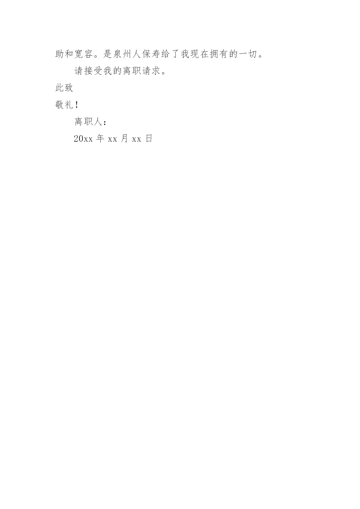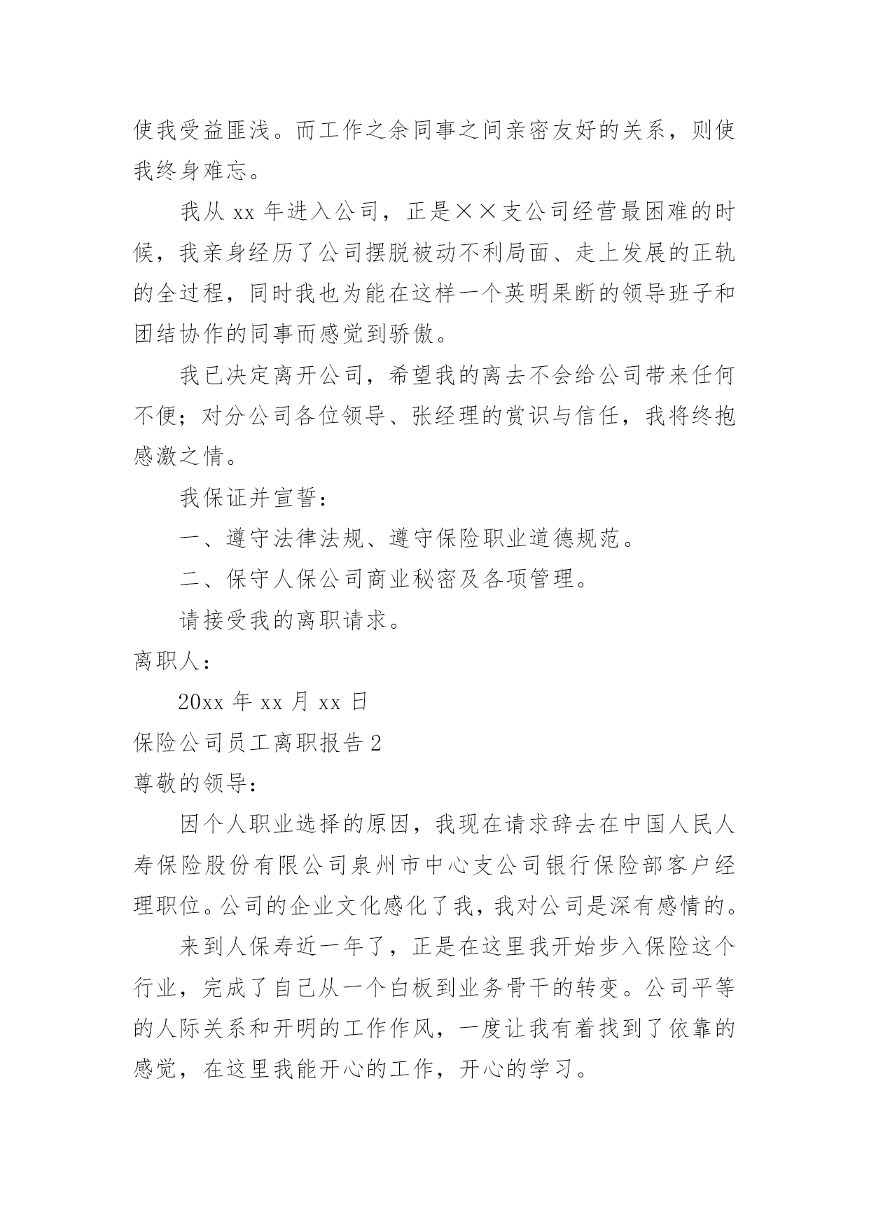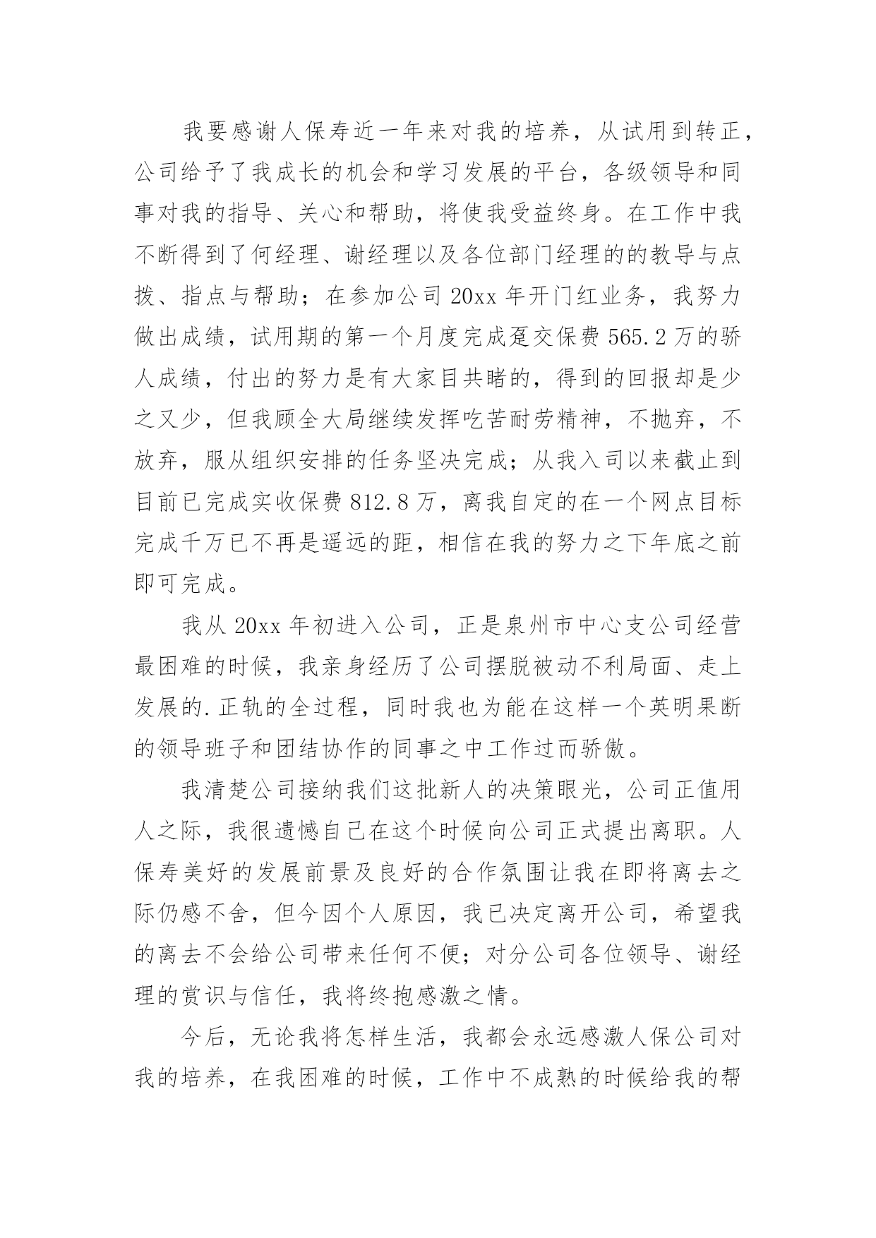 保险公司员工离职报告保险公司员工离职报告我们眼下的社会,报告有着举足轻重的地位,报告根据用途的不同也有着不同的类型。一听到写报告马上头昏脑涨?以下是小编帮大家整理的保险公司员工离职报告,希望能够帮助到大家。保险公司员工离职报告1分公司领导:因个人职业选择的原因,我现在请求辞去在人保财险××支公司的职位。公司的企业文化感化了我,我对公司是深有感情的。来到人保公司两年了,正是在这里我开始踏上了社会,完成了自己从一个学生到社会人的转变。公司平等的人际关系和开明的工作作风,一度让我有着找到了依靠的`感觉,在这里我在即将离去之际作,开心的学习。我要感谢人保公司两年来对我的培养,从试用到转正,公司给予了我成长的机会和学习发展的平台。各级领导和同事对我的指导、关心和帮助,将使我受益终身。在工作中我不断得到了张经理、汪经理以及各位部门经理的的教导与点拨、指点与帮助;在参加监护人责任险、学幼险承保时,团队合作中得到同事的帮助与协同;这些都使我受益匪浅。而工作之余同事之间亲密友好的关系,则使我终身难忘。我从xx年进入公司,正是××支公司经营最困难的时候,我亲身经历了公司摆脱被动不利局面、走上发展的正轨的全过程,同时我也为能在这样一个英明果断的领导班子和团结协作的同事而感觉到骄傲。我已决定离开公司,希望我的离去不会给公司带来任何不便;对分公司各位领导、张经理的赏识与信任,我将终抱感激之情。我保证并宣誓:一、遵守法律法规、遵守保险职业道德规范。二、保守人保公司商业秘密及各项管理。请接受我的离职请求。离职人:20xx年xx月xx日保险公司员工离职报告2尊敬的领导:因个人职业选择的原因,我现在请求辞去在中国人民人寿保险股份有限公司泉州市中心支公司银行保险部客户经理职位。公司的企业文化感化了我,我对公司是深有感情的。来到人保寿近一年了,正是在这里我开始步入保险这个行业,完成了自己从一个白板到业务骨干的转变。公司平等的人际关系和开明的工作作风,一度让我有着找到了依靠的感觉,在这里我能开心的工作,开心的学习。我要感谢人保寿近一年来对我的培养,从试用到转正,公司给予了我成长的机会和学习发展的平台,各级领导和同事对我的指导、关心和帮助,将使我受益终身。在工作中我不断得到了何经理、谢经理以及各位部门经理的的教导与点拨、指点与帮助;在参加公司20xx年开门红业务,我努力做出成绩,试用期的第一个月度完成趸交保费565.2万的骄人成绩,付出的努力是有大家目共睹的,得到的回报却是少之又少,但我顾全大局继续发挥吃苦耐劳精神,不抛弃,不放弃,服从组织安排的任务坚决完成;从我入司以来截止到目前已完成实收保费812.8万,离我自定的在一个网点目标完成千万已不再是遥远的距,相信在我的努力之下年底之前即可完成。我从20xx年初进入公司,正是泉州市中心支公司经营最困难的时候,我亲身经历了公司摆脱被动不利局面、走上发展的.正轨的全过程,同时我也为能在这样一个英明果断的领导班子和团结协作的同事之中工作过而骄傲。我清楚公司接纳我们这批新人的决策眼光,公司正值用人之际,我很遗憾自己在这个时候向公司正式提出离职。人保寿美好的发展前景及良好的合作氛围让我在即将离去之际仍感不舍,但今因个人原因,我已决定离开公司,希望我的离去不会给公司带来任何不便;对分公司各位领导、谢经理的赏识与信任,我将终抱感激之情。今后,无论我将怎样生活,我都会永远感激人保公司对我的培养,在我困难的时候,工作中不成熟的时候给我的帮助和宽容。是泉州人保寿给了我现在拥有的一切。请接受我的离职请求。此致敬礼!离职人:20xx年xx月xx日