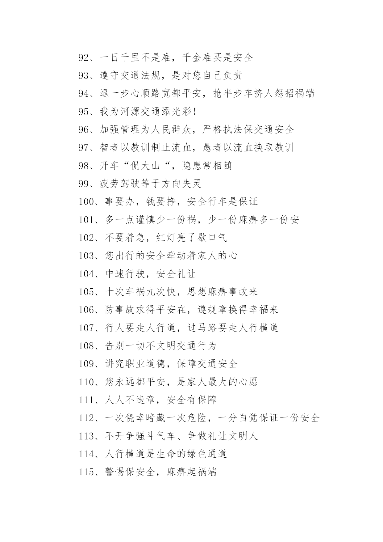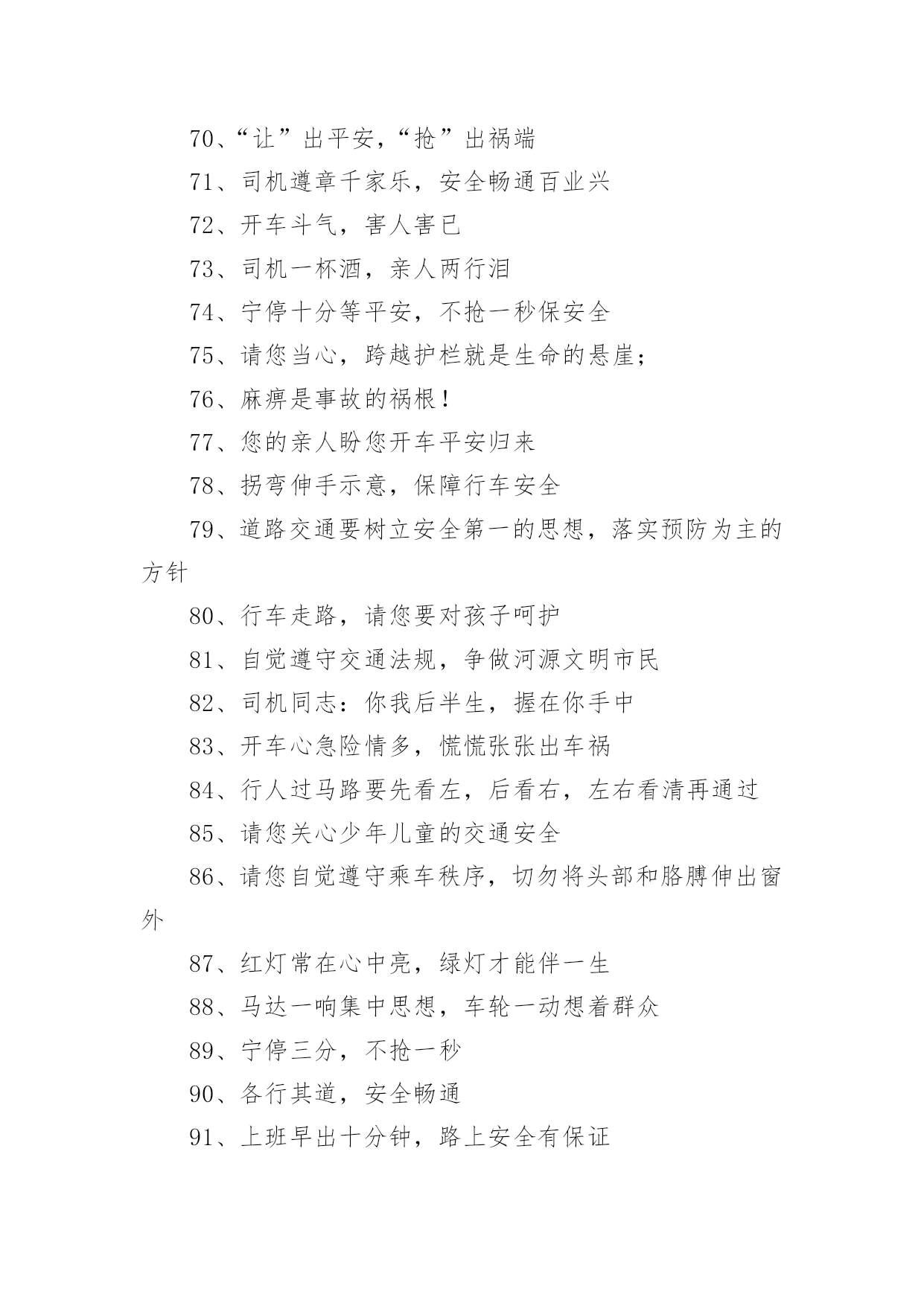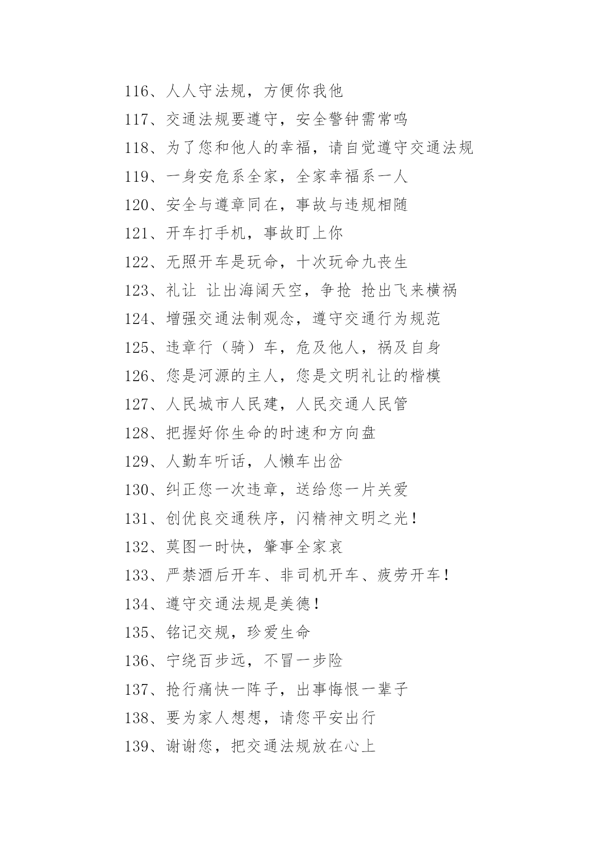 交通安全的宣传口号1、行车慎为本,开车礼当先2、铁路道口险情多,停车、了望再通过!3、让一让道路通畅,让一让安全有保障,让一让心情更舒畅4、进一步将受到谴责,退一步将得到尊重5、交通法规在心中,交通安全在手中6、人行横道车让人,各种车道人让车7、祝您一路平安!8、要遵守交规,不要乱行乱停9、恪守交规,法律为您生命护航10、要做英雄人,不开“英雄”车11、珍爱生命不要翻越护栏12、谨慎驾驶,保证安全13、多拉快跑,凶多吉少14、不长眼,你凶他就险15、出行时,切记系上交通法规这条安全带16、各行其道,安全可靠17、创造良好交通环境。18、行人过马路不能斜穿、也勿猛跑19、挣金山,挣银山,交通安全是靠山20、安全开车是大事,文明走路非小节21、骑车上路别着急,争、超、抢道不安全22、不开带病车上路23、行人一生平安,行车一路平安24、遵章守规连你我,道路畅通有保障25、交通法规是您生命之友!26、骑好车、走好路、安全伴您每一步27、遵守交通信号,遵守交通标志,遵守交通标线28、树立文明意识,搞好交通秩序29、违规是的祸根,侥幸是的隐患30、良药苦口利于病,交通规则利于行31、路好车好安全最好,慢行快行平安才行32、讲究交通公德,遵守交通法规33、车铃车闸齐全,维系您的安全34、遵守交规得平安,道路畅通保安全35、骑车抢行一秒,危险增加十分36、交通安全抛脑后,在前头37、您保持车况良好,车容整洁38、交通安全在我心中!39、加强综合治理,保障交通安全40、学龄前儿童上街要有成年人带领41、穿马路,跨护栏,少公德,多危险42、上有老,下有小,出了不得了43、宣传交通法规,提高交通文明意识44、最大的浪费是事故,最大的节约是安全45、行横道是您横过马路的安全带!46、人行道车莫占,车行道人莫钻47、您是河源的客人,您是遵章守规的楷模48、酒后开车,危险万分!49、行经路口要观望,拐弯示意要礼让50、勿以快慢论英雄,安全行车最光荣51、我礼你让,道路通畅52、交通畅通有序,管理科学高效,执法文明严格53、安全为了生产,生产必须安全54、多一些谨慎,多一些安全55、迎世博,为河源争光56、请您关心老年人的交通安全57、交通法规关系着您和家人的安全与幸福58、“保险”赔钱不赔命59、一人出事故,全家受痛苦60、侥幸躲过千次,出事就在一次61、三躲不如一停62、维护良好乘车秩序,争做申城文明乘客63、开车多一份小心,家人多十分安心64、见了违章严批评,道是无情却有情65、不超速、不抢行,中速行驶保安宁66、交通安全系万家,平平安安是幸福67、交通肇事祸及自身、危及他人68、弯道莫停车,停车危险多69、叫响一个口号,达到三个遵守70、“让”出平安,“抢”出祸端71、司机遵章千家乐,安全畅通百业兴72、开车斗气,害人害已73、司机一杯酒,亲人两行泪74、宁停十分等平安,不抢一秒保安全75、请您当心,跨越护栏就是生命的悬崖;76、麻痹是事故的祸根!77、您的亲人盼您开车平安归来78、拐弯伸手示意,保障行车安全79、道路交通要树立安全第一的思想,落实预防为主的方针80、行车走路,请您要对孩子呵护81、自觉遵守交通法规,争做河源文明市民82、司机同志:你我后半生,握在你手中83、开车心急险情多,慌慌张张出车祸84、行人过马路要先看左,后看右,左右看清再通过85、请您关心少年儿童的交通安全86、请您自觉遵守乘车秩序,切勿将头部和胳膊伸出窗外87、红灯常在心中亮,绿灯才能伴一生88、马达一响集中思想,车轮一动想着群众89、宁停三分,不抢一秒90、各行其道,安全畅通91、上班早出十分钟,路上安全有保证92、一日千里不是难,千金难买是安全93、遵守交通法规,是对您自己负责94、退一步心顺路宽都平安,抢半步车挤人怨招祸端95、我为河源交通添光彩!96、加强管理为人民群众,严格执法保交通安全97、智者以教训制止流血,愚者以流血换取教训98、开车“侃大山“,隐患常相随99、疲劳驾驶等于方向失灵100、事要办,钱要挣,安全行车是保证101、多一点谨慎少一份祸,少一份麻痹多一份安102、不要着急,红灯亮了歇口气103、您出行的安全牵动着家人的心104、中速行驶,安全礼让105、十次车祸九次快,思想麻痹事故来106、防事故求得平安在,遵规章换得幸福来107、行人要走人行道,过马路要走人行横道108、告别一切不文明交通行为109、讲究职业道德,保障交通安全110、您永远都平安,是家人最大的心愿111、人人不违章,安全有保障112、一次侥幸暗藏一次危险,一分自觉保证一份安全113、不开争强斗气车、争做礼让文明人114、人行横道是生命的绿色通道115、警惕保安全,麻痹起祸端116、人人守法规,方便你我他117、交通法规要遵守,安全警钟需常鸣118、为了您和他人的幸福,请自觉