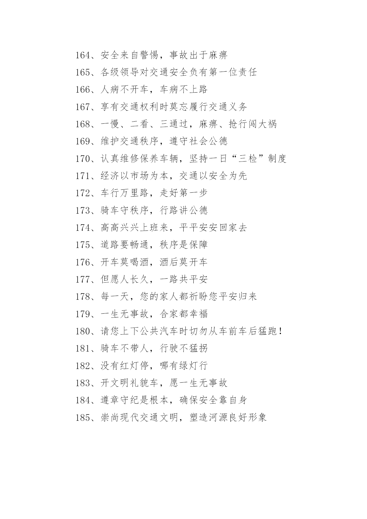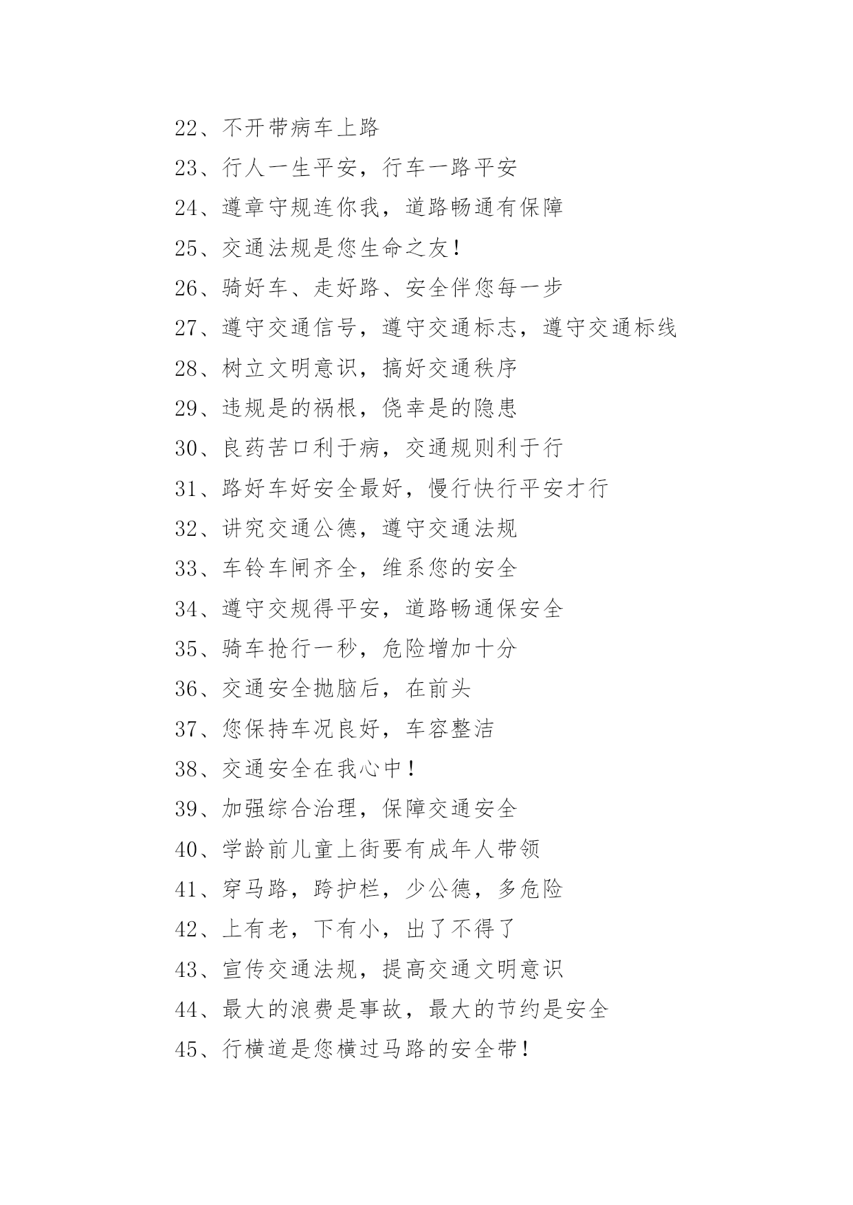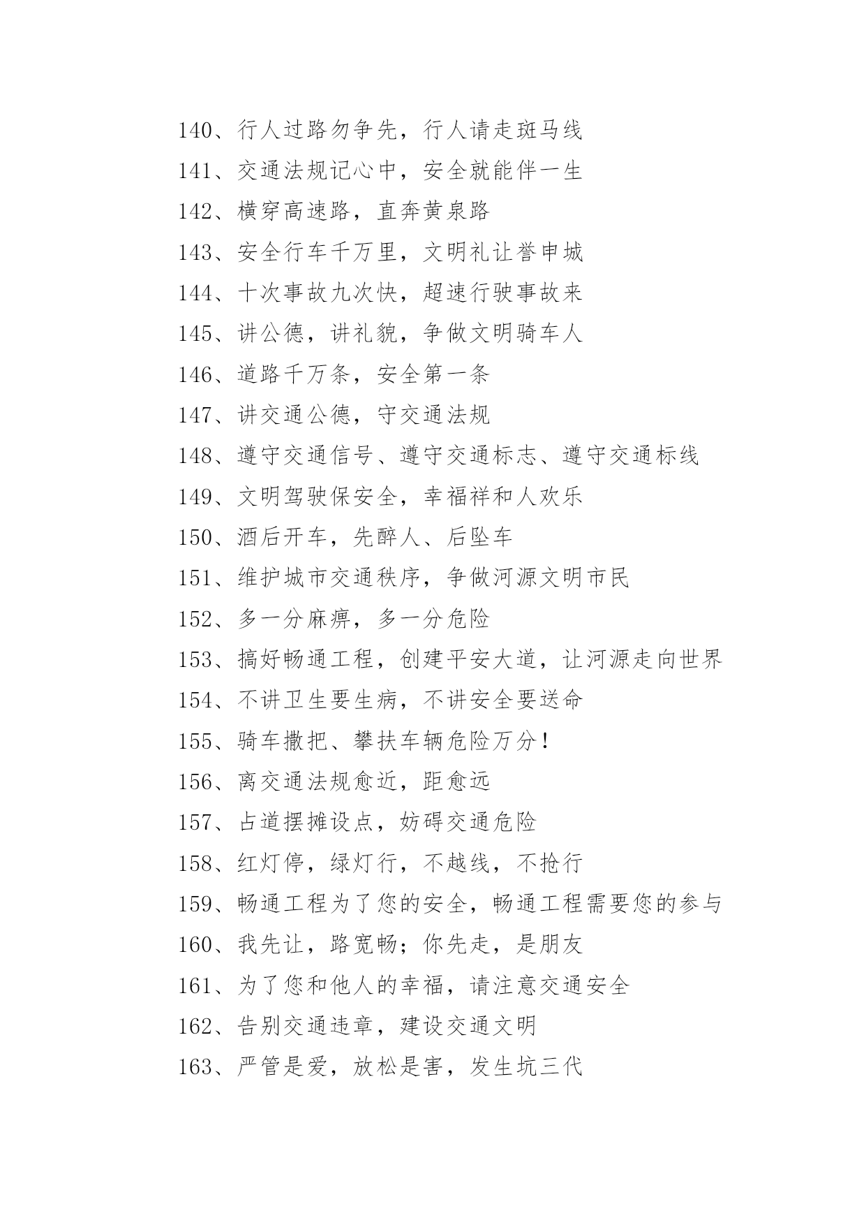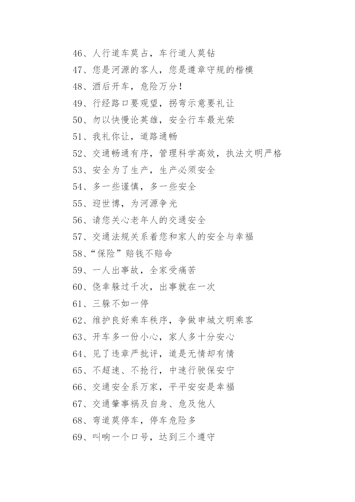 交通安全的宣传口号1、行车慎为本,开车礼当先2、铁路道口险情多,停车、了望再通过!3、让一让道路通畅,让一让安全有保障,让一让心情更舒畅4、进一步将受到谴责,退一步将得到尊重5、交通法规在心中,交通安全在手中6、人行横道车让人,各种车道人让车7、祝您一路平安!8、要遵守交规,不要乱行乱停9、恪守交规,法律为您生命护航10、要做英雄人,不开“英雄”车11、珍爱生命不要翻越护栏12、谨慎驾驶,保证安全13、多拉快跑,凶多吉少14、不长眼,你凶他就险15、出行时,切记系上交通法规这条安全带16、各行其道,安全可靠17、创造良好交通环境。18、行人过马路不能斜穿、也勿猛跑19、挣金山,挣银山,交通安全是靠山20、安全开车是大事,文明走路非小节21、骑车上路别着急,争、超、抢道不安全22、不开带病车上路23、行人一生平安,行车一路平安24、遵章守规连你我,道路畅通有保障25、交通法规是您生命之友!26、骑好车、走好路、安全伴您每一步27、遵守交通信号,遵守交通标志,遵守交通标线28、树立文明意识,搞好交通秩序29、违规是的祸根,侥幸是的隐患30、良药苦口利于病,交通规则利于行31、路好车好安全最好,慢行快行平安才行32、讲究交通公德,遵守交通法规33、车铃车闸齐全,维系您的安全34、遵守交规得平安,道路畅通保安全35、骑车抢行一秒,危险增加十分36、交通安全抛脑后,在前头37、您保持车况良好,车容整洁38、交通安全在我心中!39、加强综合治理,保障交通安全40、学龄前儿童上街要有成年人带领41、穿马路,跨护栏,少公德,多危险42、上有老,下有小,出了不得了43、宣传交通法规,提高交通文明意识44、最大的浪费是事故,最大的节约是安全45、行横道是您横过马路的安全带!46、人行道车莫占,车行道人莫钻47、您是河源的客人,您是遵章守规的楷模48、酒后开车,危险万分!49、行经路口要观望,拐弯示意要礼让50、勿以快慢论英雄,安全行车最光荣51、我礼你让,道路通畅52、交通畅通有序,管理科学高效,执法文明严格53、安全为了生产,生产必须安全54、多一些谨慎,多一些安全55、迎世博,为河源争光56、请您关心老年人的交通安全57、交通法规关系着您和家人的安全与幸福58、“保险”赔钱不赔命59、一人出事故,全家受痛苦60、侥幸躲过千次,出事就在一次61、三躲不如一停62、维护良好乘车秩序,争做申城文明乘客63、开车多一份小心,家人多十分安心64、见了违章严批评,道是无情却有情65、不超速、不抢行,中速行驶保安宁66、交通安全系万家,平平安安是幸福67、交通肇事祸及自身、危及他人68、弯道莫停车,停车危险多69、叫响一个口号,达到三个遵守70、“让”出平安,“抢”出祸端71、司机遵章千家乐,安全畅通百业兴72、开车斗气,害人害已73、司机一杯酒,亲人两行泪74、宁停十分等平安,不抢一秒保安全75、请您当心,跨越护栏就是生命的悬崖;76、麻痹是事故的祸根!77、您的亲人盼您开车平安归来78、拐弯伸手示意,保障行车安全79、道路交通要树立安全第一的思想,落实预防为主的方针80、行车走路,请您要对孩子呵护81、自觉遵守交通法规,争做河源文明市民82、司机同志:你我后半生,握在你手中83、开车心急险情多,慌慌张张出车祸84、行人过马路要先看左,后看右,左右看清再通过85、请您关心少年儿童的交通安全86、请您自觉遵守乘车秩序,切勿将头部和胳膊伸出窗外87、红灯常在心中亮,绿灯才能伴一生88、马达一响集中思想,车轮一动想着群众89、宁停三分,不抢一秒90、各行其道,安全畅通91、上班早出十分钟,路上安全有保证92、一日千里不是难,千金难买是安全93、遵守交通法规,是对您自己负责94、退一步心顺路宽都平安,抢半步车挤人怨招祸端95、我为河源交通添光彩!96、加强管理为人民群众,严格执法保交通安全97、智者以教训制止流血,愚者以流血换取教训98、开车“侃大山“,隐患常相随99、疲劳驾驶等于方向失灵100、事要办,钱要挣,安全行车是保证101、多一点谨慎少一份祸,少一份麻痹多一份安102、不要着急,红灯亮了歇口气103、您出行的安全牵动着家人的心104、中速行驶,安全礼让105、十次车祸九次快,思想麻痹事故来106、防事故求得平安在,遵规章换得幸福来107、行人要走人行道,过马路要走人行横道108、告别一切不文明交通行为109、讲究职业道德,保障交通安全110、您永远都平安,是家人最大的心愿111、人人不违章,安全有保障112、一次侥幸暗藏一次危险,一分自觉保证一份安全113、不开争强斗气车、争做礼让文明人114、人行横道是生命的绿色通道115、警惕保安全,麻痹起祸端116、人人守法规,方便你我他117、交通法规要遵守,安全警钟需常鸣118、为了您和他人的幸福,请自觉