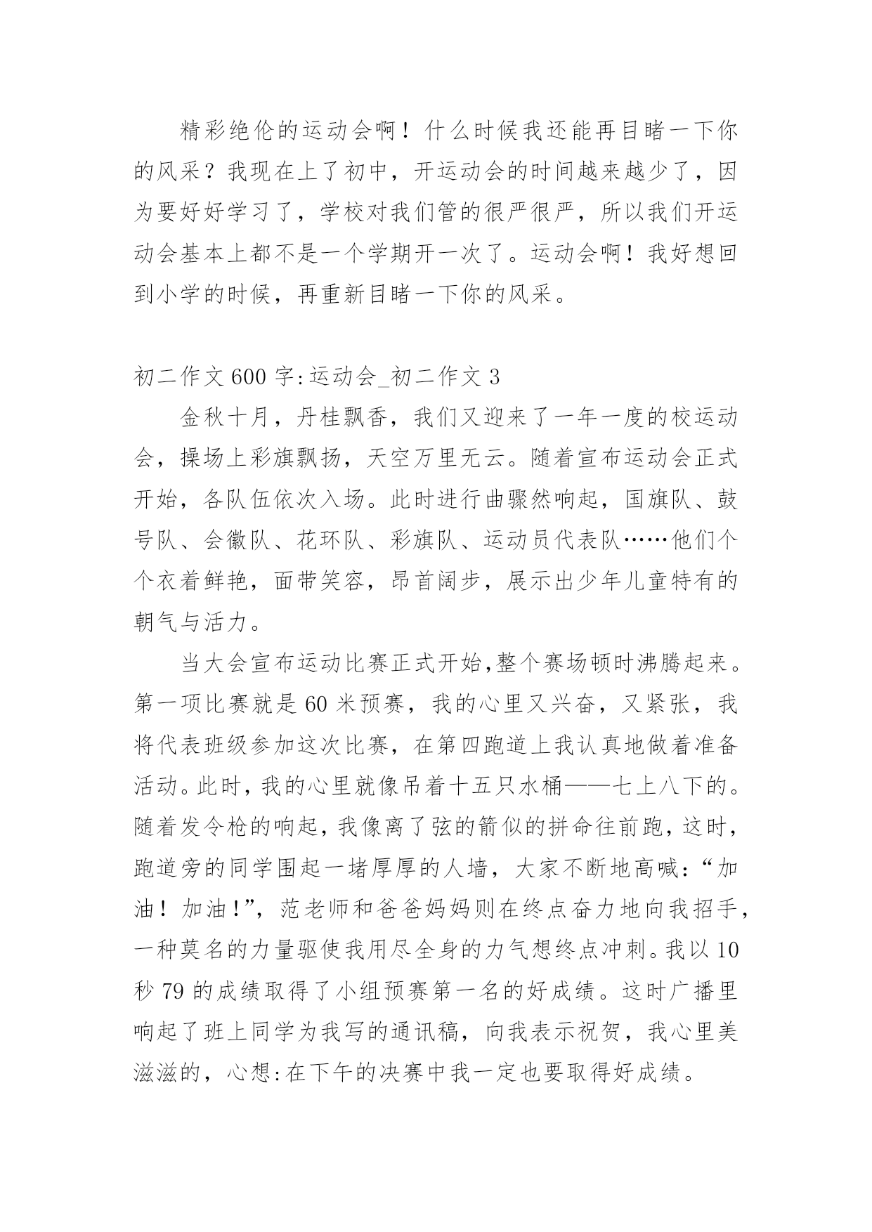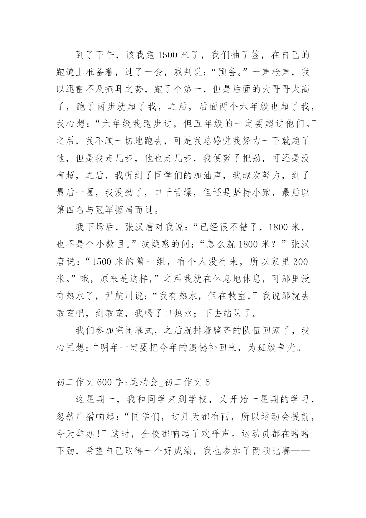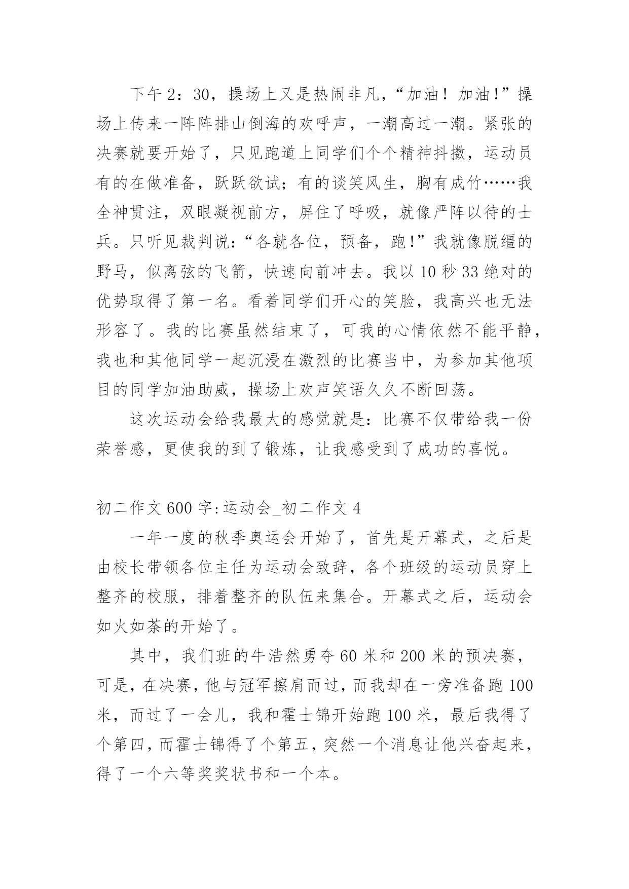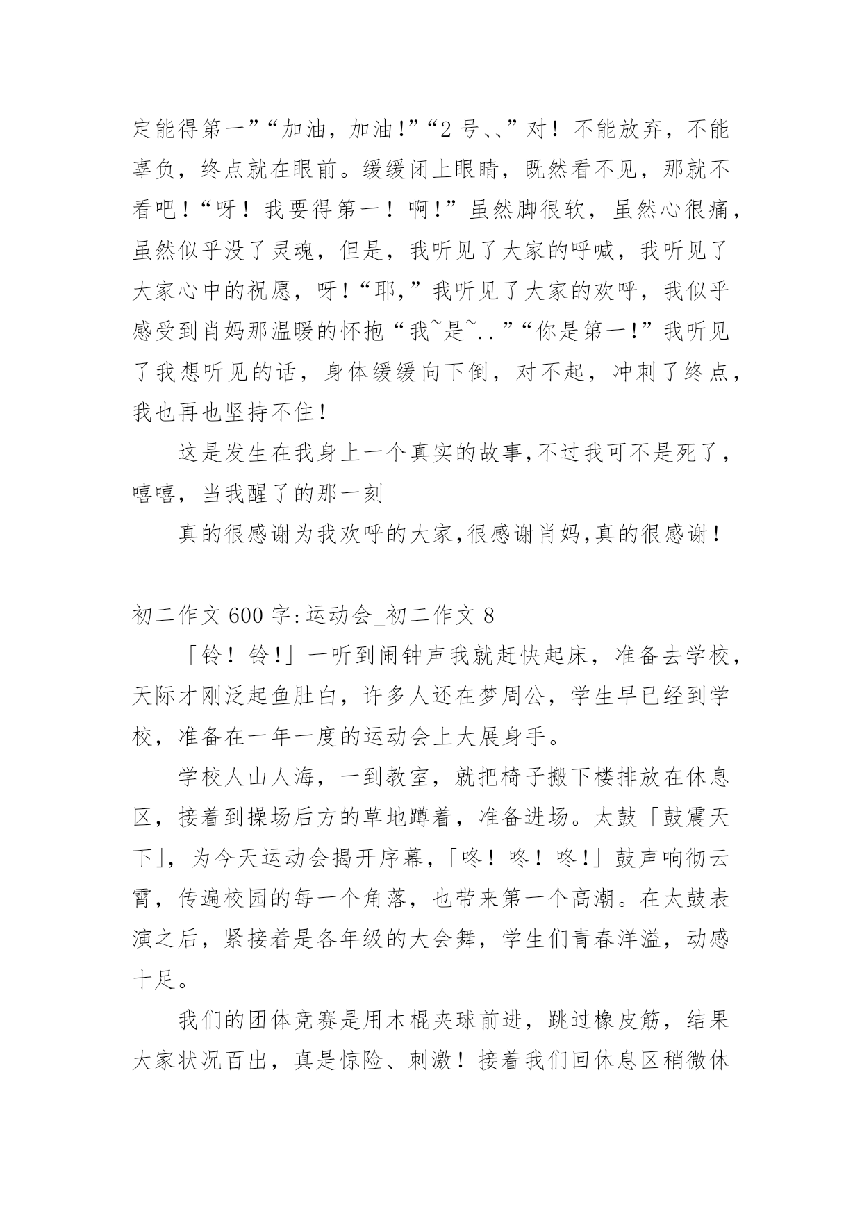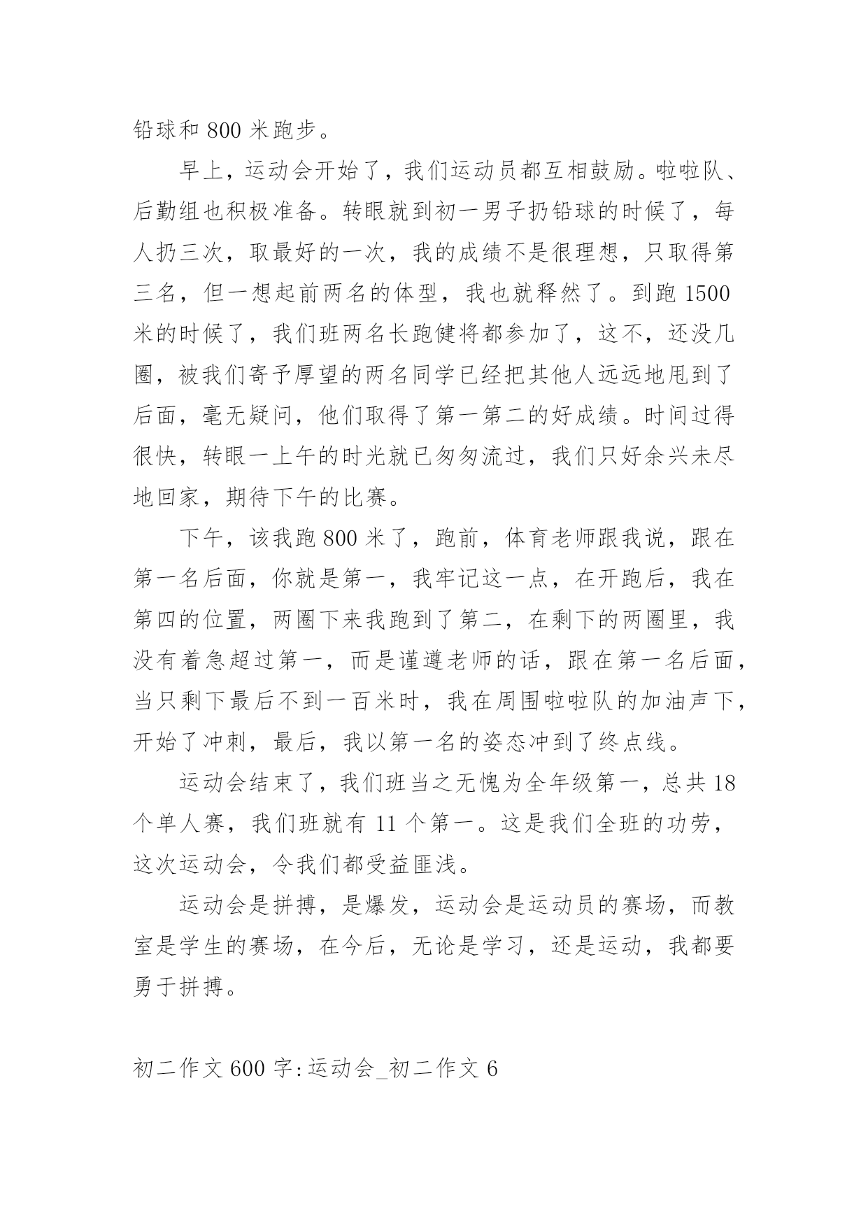 初二作文600字:运动会_初二作文在平时的学习、工作或生活中,大家都跟作文打过交道吧,通过作文可以把我们那些零零散散的思想,聚集在一块。那要怎么写好作文呢?下面是小编整理的初二作文600字:运动会_初二作文,仅供参考,欢迎大家阅读。初二作文600字:运动会_初二作文1球类运动会随着紧张的学习如期而至,同学们热情高涨,运动员们顽强拼搏,尽展大东本色!运动会即将来临,同学和老师们最欢迎、最关注的当然是篮球比赛。比赛的前几个星期,同学们就已经投入到了水深火热的训练中,老师也在积极地指导。同学们神采飞扬,摆出一副不可一世的神气,似乎冠军已胜券在握。男队奋力拼搏头一场比赛,队员们整装待发。每一个动作都像身经百战的战士一般,一名同学抢到了球,饿狼般仇视着前方,环顾四周,寻找空隙,丝毫不敢怠慢,朝空隙冲了过去,长驱直入,只见他脚一踏,身子一挺,头一扬,手一举把球往篮中送,球在篮框上滚了七八转,掉入网中。场上响起了雷鸣般的掌声,同学们不约而同地站了起来,为他们祝贺下半场。激烈的“战斗”进行着,比分也不相上下,同学们的心情跟着比分忽起忽落,这样的场景怎能不叫人揪心?下半场,队员们像打了鸡血似得,得分一次比一次精彩,可真有点儿看“NBA”的感觉呢。女队顽强不屈女队的战士们虽然技术上不比男队,却有着男队不可比的精神。队员们或轻或重地都受了伤,最轻的都擦破了膝盖。他们带伤征战,却依然打进了四强。四强中,一名战士手里掂量着球,眼睛直向篮框,做好了上篮的准备,直冲篮框,对方防守队员积极阻挡,她高高跃起,突然迅速地落下,重重地摔在了地上,一副十分痛苦的表情,老师上前去查看,才知是骨头错位了,表情十分凝重,忍不住流泪。虽然女队受了这么大的打击,仍取得了第四名的骄人成绩,虽败犹荣。比赛已然结束,队员们在场上拼搏的样子却历历在目,我也想和他们一样,在场上拼杀,为班级出一份力,争一份光。初二作文600字:运动会_初二作文2想起我上学的时候,最难忘的活动就是运动会了。当时我们是一个个的都是兴高采烈的呀,看到有同学跑得飞快,恨不得把自己的嗓子喊破,关键那得是我班同学啊!要是别的班同学,他们就不能这么喊了。想起我小学时候的运动会,那可是感兴趣了,因为小学的时候我们都是无忧无虑的,没有任何的问题,感觉当时活的很轻松。当时,我们是要放国庆节了,所以我们开了一场运动会。老师让我们每个同学拿好坐垫,我班同学都是兴高采烈的一个个的,放学回家都是蹦蹦跳跳的,恨不得马上见到家长,把这个高兴的事情和家长说。我也不例外,回到家中,我就立刻告诉家长,明天要开运动会的事情,家长也很高兴,他们给了我30块钱,那我明天开运动会,去买点好吃的去。我笑嘻嘻的接过了钱,妈妈说我就是一个实打实的小财迷。我说才不是呢,我只是想拿这些钱买点好吃的罢了。妈妈意味深长的看着我,说,哦,原来不是财迷呀,我嗯嗯,点了点头。妈妈又接着说,是个小吃货。我装作生气的转过了头,对妈妈说,哼,不理你了。到了第二天,运动会开始了,我们每个人都是兴高采烈的,拿着自己的小坐垫,就坐到了操场上,完全没有管地下脏不脏,只是小机会的让运动会开始,这样我们好看到精彩绝伦的表演。校长宣布,运动会开始了,第一个先表演的是,男子100米赛跑。想知道,100米拼的可不是体力活,而是速度啊!所以我们每个人都秉足了力气,给那些参赛者喊加油。看看看,那是我班的,我班的,我班的占据第一,好,他冲过了终点线,我们五班第一,五班第一。我们瞬间都站了起来,拥抱了对方,老师说我们当时就像新中国,回到了祖国一样。然后接下来的都是运动会的项目了,最后一项是拔河,我们每个人基本上都上去了,这次是一班对一班的,所以我们是基本上50多个同学都上去了,对方也是50多个同学,最终,因为我班有好几个重力级的,所以偶们班荣幸地赢了。运动会完整的落幕了,我们也从中感受到了许多的快乐,国庆节的七天假期,也就在这个时候开始了。我们的七天解放的时间也就从这个时候开始了。精彩绝伦的运动会啊!什么时候我还能再目睹一下你的风采?我现在上了初中,开运动会的时间越来越少了,因为要好好学习了,学校对我们管的很严很严,所以我们开运动会基本上都不是一个学期开一次了。运动会啊!我好想回到小学的时候,再重新目睹一下你的风采。初二作文600字:运动会_初二作文3金秋十月,丹桂飘香,我们又迎来了一年一度的校运动会,操场上彩旗飘扬,天空万里无云。随着宣布运动会正式开始,各队伍依次入场。此时进行曲骤然响起,国旗队、鼓号队、会徽队、花环队、彩旗队、运动员代表队……他们个个衣着鲜艳,面带笑容,昂首阔步,展示出少年儿童特有的朝气与活力。当大会宣布运动比赛正式开始,整个赛场顿时沸腾起来。第一项比赛就是60米预赛,我的心里又兴奋,又紧张,我将代表班级参加这次比赛,在第四跑道上我认真地做着准备活动。此时,我的心里就像吊着十