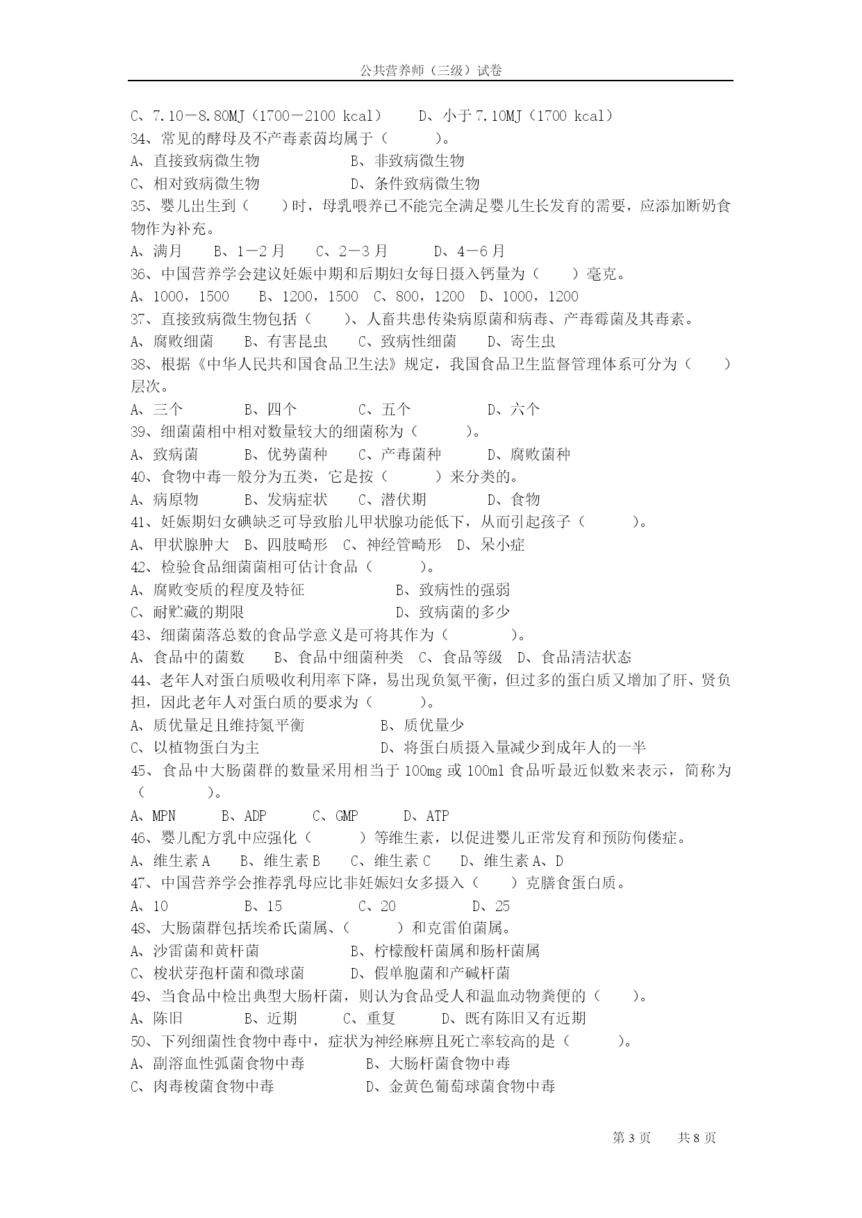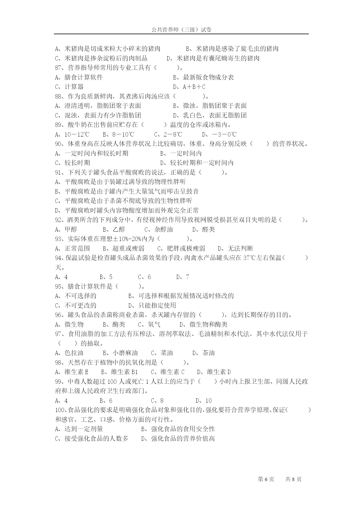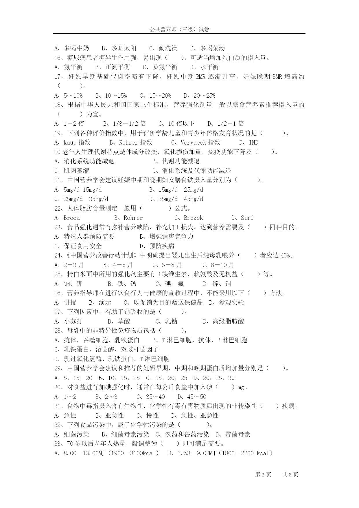 公共营养师(三级)试卷第页共NUMPAGES8页公共营养师(三级)理论知识试卷一、单项选择题,共100分,每题1分(请从四个备选项中选取一个正确答案填写在括号中,错选、漏选、多选均不得分)1、食物蛋白质中的必需氨基酸和参考蛋白(或理想模式)中相应必需氨基酸的比值是()。A、蛋白质消化率B、蛋白质生物价C、蛋白质功效比值D、氨基酸评分分值2、下列河豚毒素中,毒性最强的是()。A、河豚素B、河豚酸C、河豚卵巢毒素D、河豚肝脏毒素3、等量下列营养素中,在体内产生能量最大的是()。A、淀粉B、纤维素C、脂肪D、蛋白质4、一成年女性的BMI值为26,可以判断出她为()。A、正常B、中度消瘦C、超重D、肥胖5、测定食物中氮含量后,再乘以(),即可得到食物蛋白质的含量。A、5.25B、6.25C、7.25D、8.256、在酱油的生产过程中消毒和灭菌极为重要,酱油消毒可采用()。A、高温巴氏消毒法(85-90℃)B、低温高温巴氏消毒法(65℃)C、超高温消毒法(120-135℃)D、高温消毒法(100℃)7、亚硝酸盐中毒的特效解毒剂是()。A、硫酸钠B、二巯丙醇C、亚甲兰D、二巯基丙磺酸钠8、蛋白质净利用率可表达为()。A、(食物氮-粪氮)/食物氮*100%B、吸收氮/食物氮*100%C、储留氮/食物氮*100%D、食物氮/吸收氮*100%9、人生的第二个生长高峰是在()岁的青少年时期。A、10~16B、13~16C、12~18D、15~1810、下列各组指标中,均为脂肪变质时鉴定指标的是()。A、K值,挥发性盐基总氮,酸度B、酸度,酒精度,羰基价C、酸度,过氧化物值,羰基价D、酸价,K值,碘价11、被广泛用来作为对婴儿食品中蛋白质评价指标的是()。A、蛋白质功效比值B、蛋白质表观利用率C、蛋白质消化率D、蛋白质生物价12、身高、性别与体重,应用于儿童,可反映(),对区别急性营养不良和慢性营养不良有意义。A、较长期营养状况B、当前营养状况C、较长期和当前营养状况D、无法判断13、食物中的甘油三酯除具有供能和合成体脂外,还有助于()。A、脂溶性维生素的吸收B、胆固醇的分解C、参与肌肉蛋白的合成D、抗生酮作用14、青少年期由于生长发育对必需氨基酸要求高,优质蛋白质应占总蛋白质含量的()以上。A、30%B、40%C、50%D、60%15、虽然母乳中维生素D含量很低,但母乳无需额外补充维生素D,只要能保证婴儿()或适量补充鱼肝油即可。A、多喝牛奶B、多晒太阳C、勤洗澡D、多喝菜汤16、糖尿病患者糖异生作用强,易出现(),可适当增加蛋白质的摄入量。A、氮平衡B、正氮平衡C、负氮平衡D、水平衡17、妊娠早期基础代谢率略有下降,妊娠中期BMR逐渐升高,妊娠晚期BMR增高约()。A、5~10%B、10~15%C、15~20%D、20~25%18、根据中华人民共和国国家卫生标准,营养强化剂量一般以膳食营养素推荐摄入量的()为宜。A、1-2倍B、1/3-1/2倍C、10倍以下D、1/2-1倍19、下列各种评价指数中,用于评价学龄儿童和青少年体格发育状况的是()。A、kaup指数B、Rohrer指数C、Vervaeck指数D、IND20老年人生理代谢特点是体成分改变、氧化损伤加重、免疫功能下降及()。A、消化系统功能减退B、代谢功能减退C、肌肉萎缩D、消化系统及代谢功能减退21、中国营养学会建议妊娠中期和晚期妇女膳食铁摄入量分别为()。A、5mg/d15mg/dB、15mg/d25mg/dC、25mg/d35mg/dD、35mg/d45mg/d22、人体脂肪含量测定一般用()公式。A、BrocaB、RohrerC、BrozekD、Siri23、食品强化通常有弥补营养缺陷、补充加工损失、达到营养需要及()四种目的。A、特殊人群预防需要B、增强销售竞争力C、保证食用安全D、预防疾病24、《中国营养改善行动计划》中明确提出婴儿出生后纯母乳喂养()者应达40%。A、2-3月B、4-6月C、6-8月D、8-10月25、精白米面中所用的强化剂主要有B族维生素、赖氨酸及无机盐()等。A、钠、钾B、铁、钙C、碘、氟D、锌、铜26、营养指导师在进行饮食行为与健康的宣教过程中,不能采用以下()方法。A、讲授B、演示C、以促销为目的赠送保健品D、参观实验27、下列因素中,有助于钙吸收的是()。A、小苏打B、草酸C、乳糖D、高级脂肪酸28、母乳中的非特异性免疫物质包括()。A、抗体、吞噬细胞、乳铁蛋白B、T淋巴细胞、抗体、B淋巴细胞C、乳铁蛋白、溶菌酶、双歧杆菌因子D、乳过氧化氢酶、乳铁蛋白、T淋巴细胞29、中国营养学会建议和推荐的妊娠早期、
