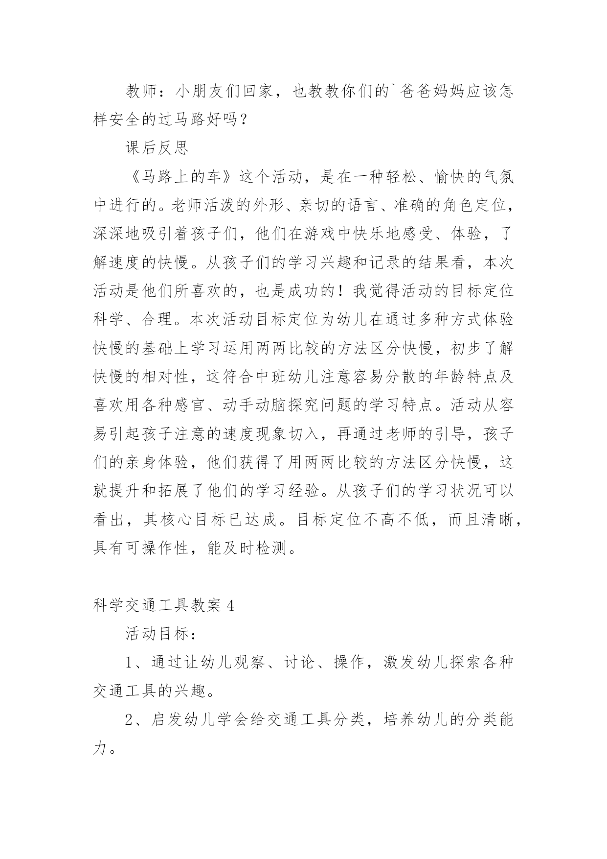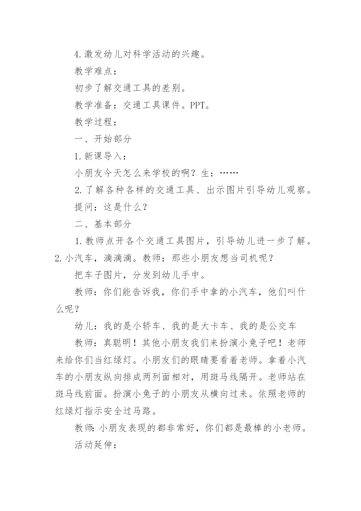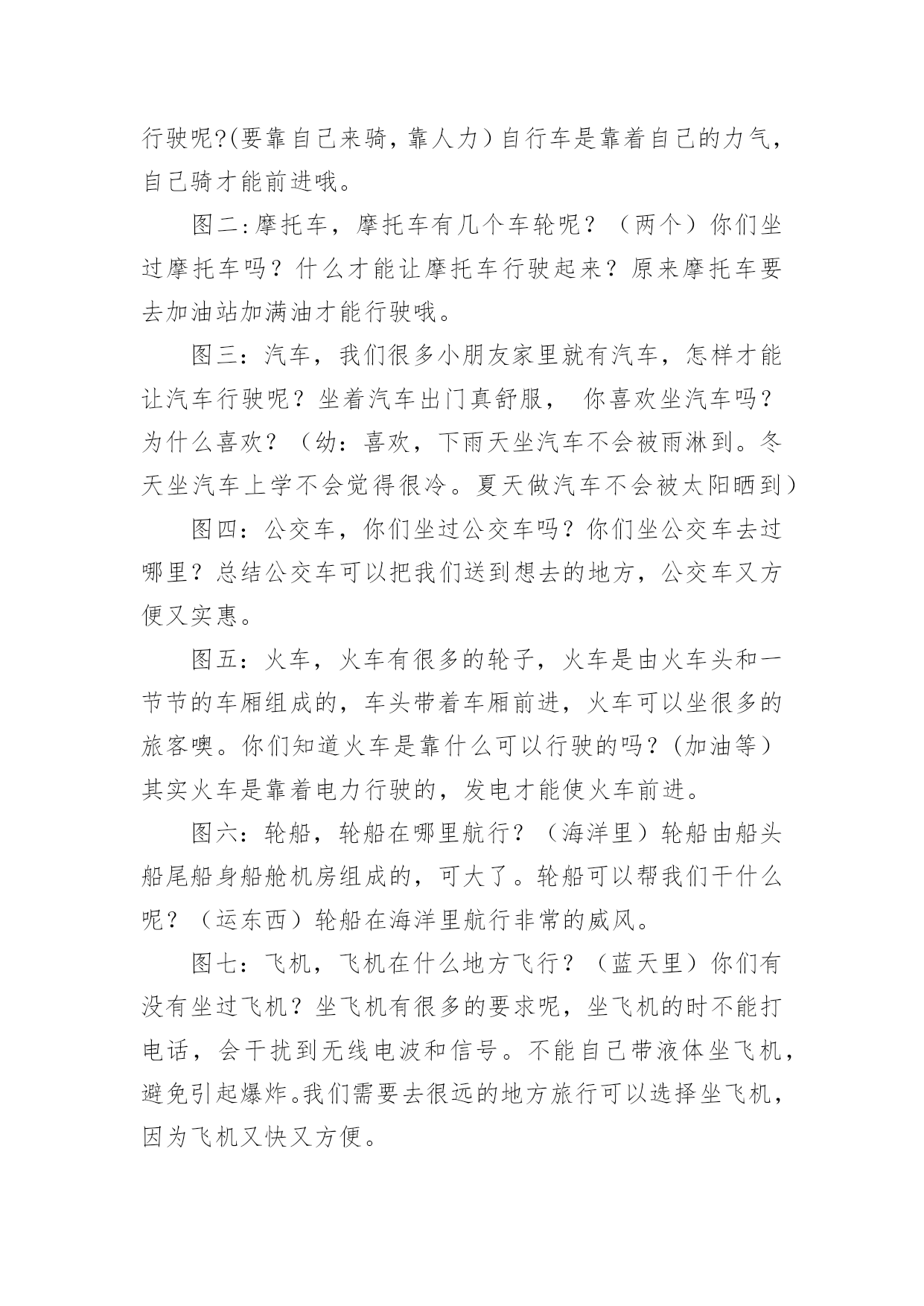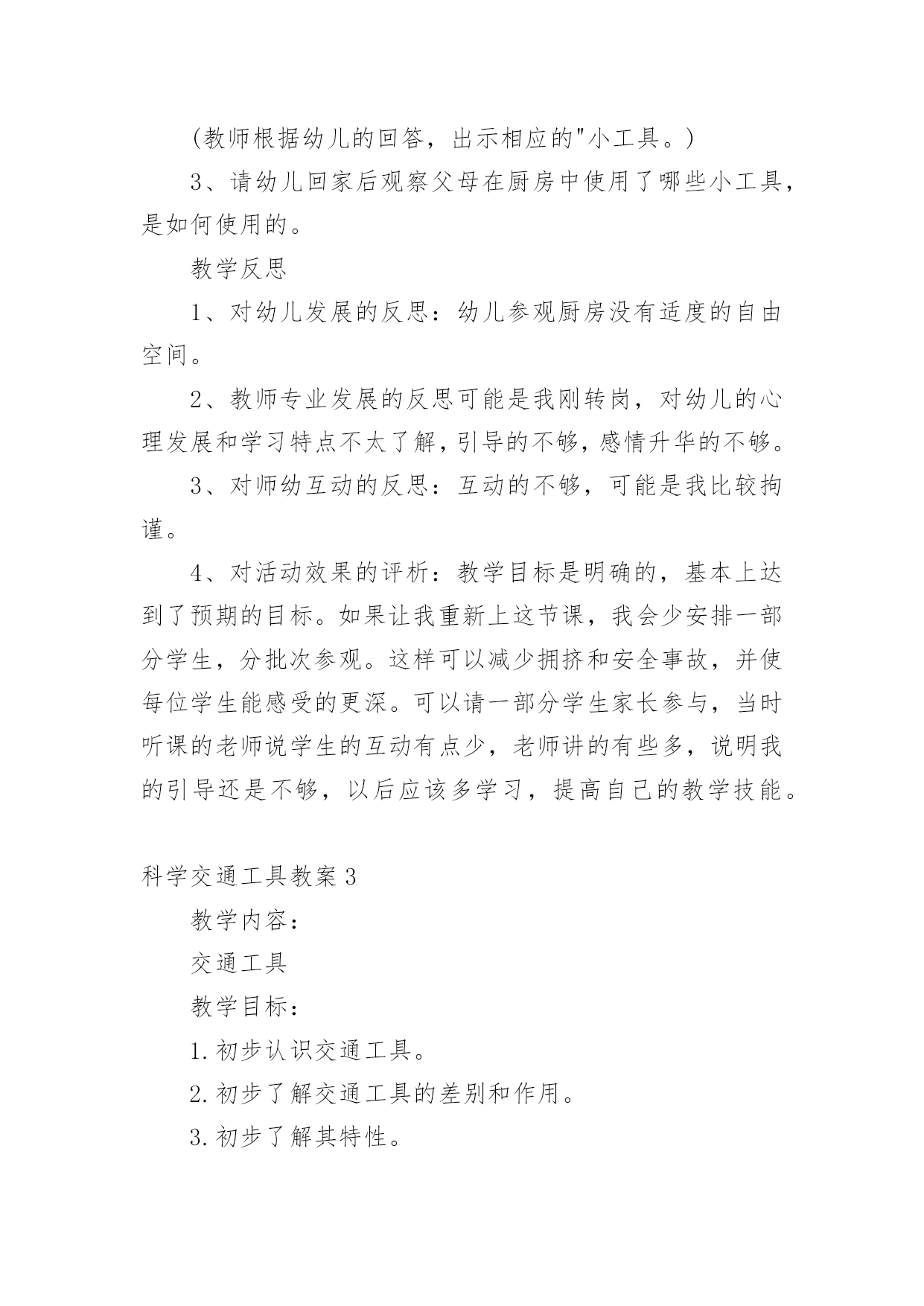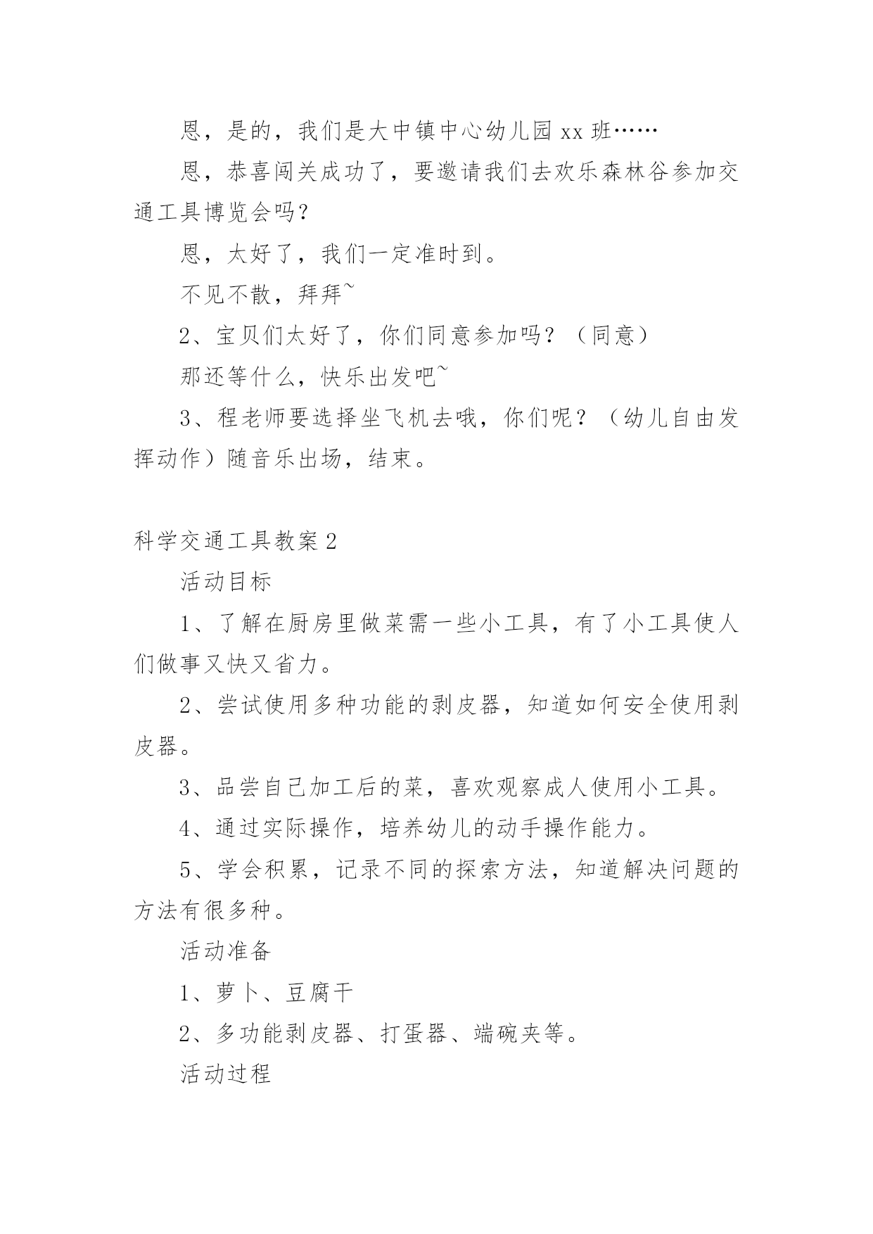 科学交通工具教案作为一名无私奉献的老师,就有可能用到教案,借助教案可以提高教学质量,收到预期的教学效果。教案要怎么写呢?下面是小编为大家收集的科学交通工具教案,欢迎大家分享。科学交通工具教案1活动目标:1、认识生活中各种交通工具。2、比较各种交通工具的方便性。活动准备:各种交通工具的幻灯片。活动过程:一、开心聚会,听声音说出是哪些交通工具,说说它们的特质,它们的方便性。1、师:今天我收到了一张欢乐谷组委会的邀请卡,请我们去一个很远的地方参加博览会。师:可是参加这个博览会有个要求,要求我们小朋友们闯关回答问题,你们有信心吗?2、第一关:听声音,说说各种交通工具的方便性。师:刚刚我们都听到了哪些声音?(幼:飞机、火车、小汽车、自行车、打铃声等)3、恩,我们一一来看看是有哪些传出的声音。图一:自行车,自行车有几个车轮?怎样才能使自行车行驶呢?(要靠自己来骑,靠人力)自行车是靠着自己的力气,自己骑才能前进哦。图二:摩托车,摩托车有几个车轮呢?(两个)你们坐过摩托车吗?什么才能让摩托车行驶起来?原来摩托车要去加油站加满油才能行驶哦。图三:汽车,我们很多小朋友家里就有汽车,怎样才能让汽车行驶呢?坐着汽车出门真舒服,你喜欢坐汽车吗?为什么喜欢?(幼:喜欢,下雨天坐汽车不会被雨淋到。冬天坐汽车上学不会觉得很冷。夏天做汽车不会被太阳晒到)图四:公交车,你们坐过公交车吗?你们坐公交车去过哪里?总结公交车可以把我们送到想去的地方,公交车又方便又实惠。图五:火车,火车有很多的轮子,火车是由火车头和一节节的车厢组成的,车头带着车厢前进,火车可以坐很多的旅客噢。你们知道火车是靠什么可以行驶的吗?(加油等)其实火车是靠着电力行驶的,发电才能使火车前进。图六:轮船,轮船在哪里航行?(海洋里)轮船由船头船尾船身船舱机房组成的,可大了。轮船可以帮我们干什么呢?(运东西)轮船在海洋里航行非常的威风。图七:飞机,飞机在什么地方飞行?(蓝天里)你们有没有坐过飞机?坐飞机有很多的要求呢,坐飞机的时不能打电话,会干扰到无线电波和信号。不能自己带液体坐飞机,避免引起爆炸。我们需要去很远的地方旅行可以选择坐飞机,因为飞机又快又方便。4、我们看了这么多的图片,图片中的这些工具使我们外出方便很多,给它们起个名字叫交通工具。5、假期的时候妈妈带我们去家附近的你会选择什么样的交通工具呢?(自行车)去附近的地方可以选择骑自行车车或开摩托车。如果我们现在要去很远的欢乐森林谷,你们会选择什么样的交通工具(飞机、火车、汽车、公交车)因为它们的行驶速度很快,给我们带来很多的方便。需要出远门可以选择它们。要越过蓝蓝的大海你会选择什么样的`交通工具呢?(轮船)二、第二关:设计未来的交通工具。你们还见过有哪些交通工具呢?(三轮车、面包车、电瓶车、出租车、地铁、汽艇)今天程老师带来了许多现代交通工具的图片,我们一起欣赏一下吧。(看幻灯片)我们每位小朋友都是小小设计师,等你们长大了你们想设计一个什么样的交通工具什么样的车?(面包做成的面包房子的车,车可以变形可以有翅膀,可以折叠的汽车,可以人工降雨的飞碟汽车,吸收太阳能的环保汽车等)一起欣赏发明家设计的的未来交通工具的幻灯片。三、参加博览会。1、师接电话,对话形式以收到参加交通工具博览会的通知结束本次课堂活动。师:喂,你好!恩,是的,我们是大中镇中心幼儿园xx班……恩,恭喜闯关成功了,要邀请我们去欢乐森林谷参加交通工具博览会吗?恩,太好了,我们一定准时到。不见不散,拜拜~2、宝贝们太好了,你们同意参加吗?(同意)那还等什么,快乐出发吧~3、程老师要选择坐飞机去哦,你们呢?(幼儿自由发挥动作)随音乐出场,结束。科学交通工具教案2活动目标1、了解在厨房里做菜需一些小工具,有了小工具使人们做事又快又省力。2、尝试使用多种功能的剥皮器,知道如何安全使用剥皮器。3、品尝自己加工后的菜,喜欢观察成人使用小工具。4、通过实际操作,培养幼儿的动手操作能力。5、学会积累,记录不同的探索方法,知道解决问题的方法有很多种。活动准备1、萝卜、豆腐干2、多功能剥皮器、打蛋器、端碗夹等。活动过程一、尝试操作,了解多功能剥皮器的使用方法。1、出示萝卜丝和切成花纹的豆腐干,引导幼儿观察。提问:萝卜丝和豆腐干是什么样子的'?2、幼儿讨论萝卜丝和豆腐干是怎样切成的。教师:萝卜丝切得好不好?为什么觉得好?请你们想想办法,讨论一下可以怎样做,你们也切出均匀的萝卜丝,豆腐干也能切出花纹。3、交流讨论结果。教师:你们决定怎样做?怎样才能做得又快又好?(让幼儿自由发表自己的意见)4、幼儿尝试使用多功能拨皮器,提醒幼儿注意安全。5、大家一起观看自己加工的萝卜丝和豆腐干,体验小工具的方便。6、将加工好的物品送到食堂进行加工。二、品尝萝卜丝和烧豆腐干教师:厨房的阿姨已经将你们切的萝卜丝和豆腐干炒好了,