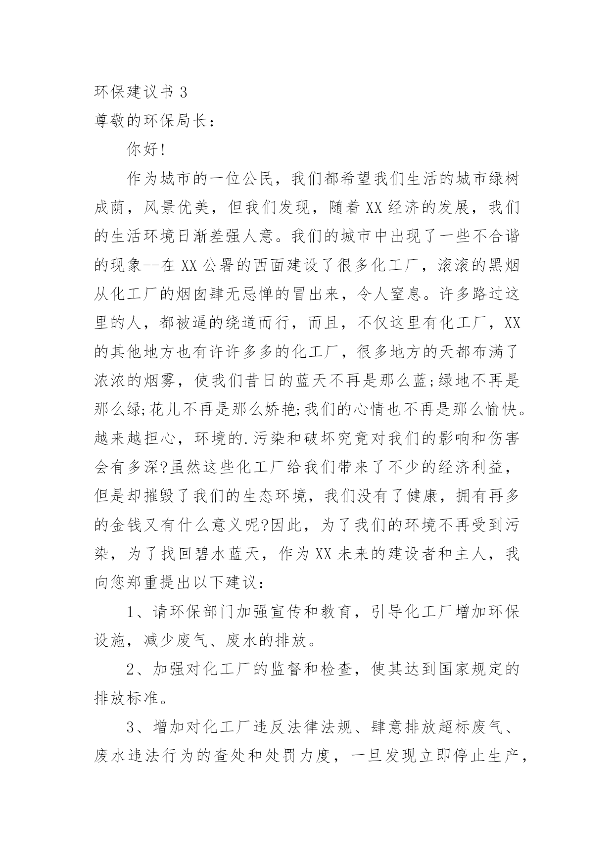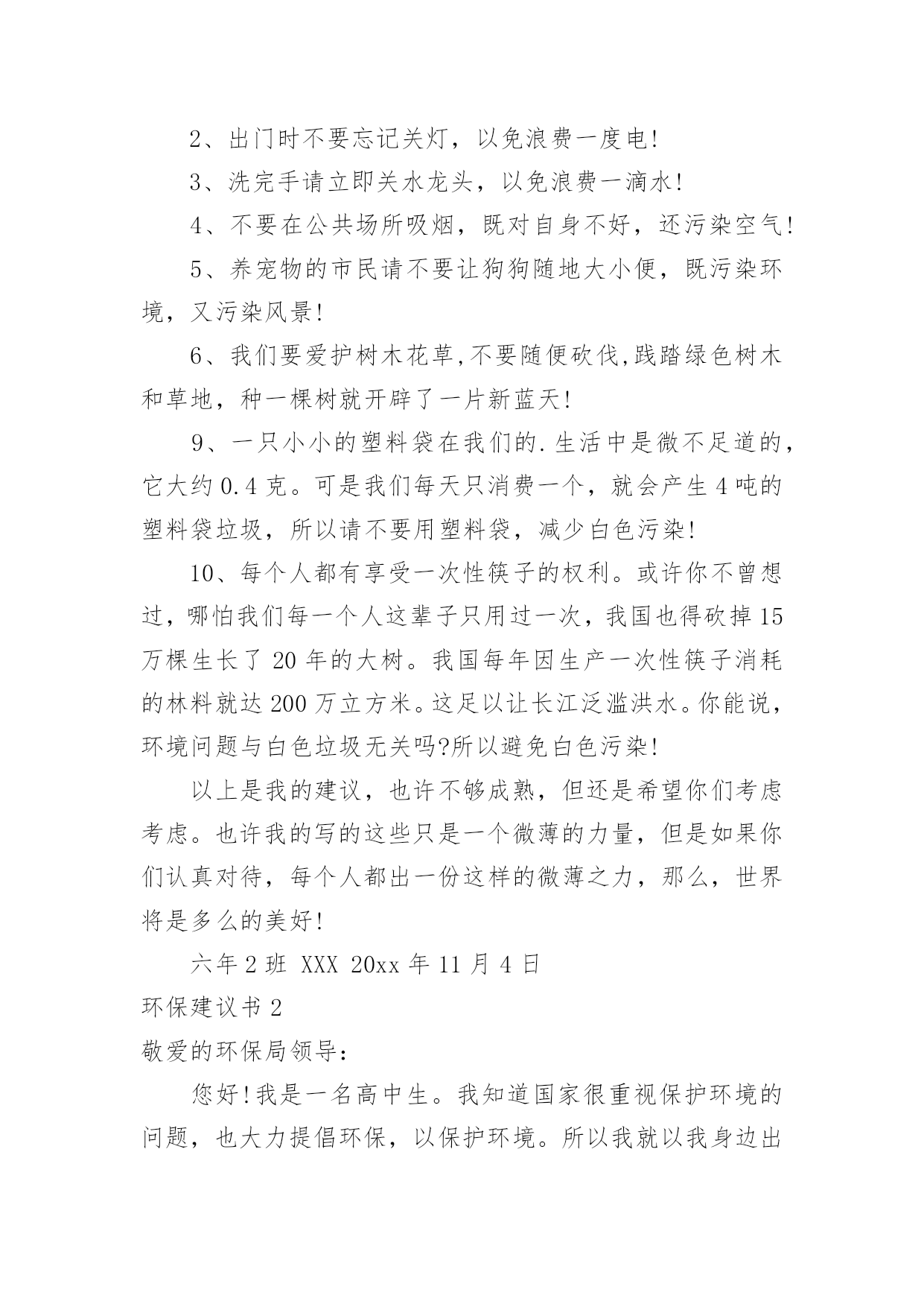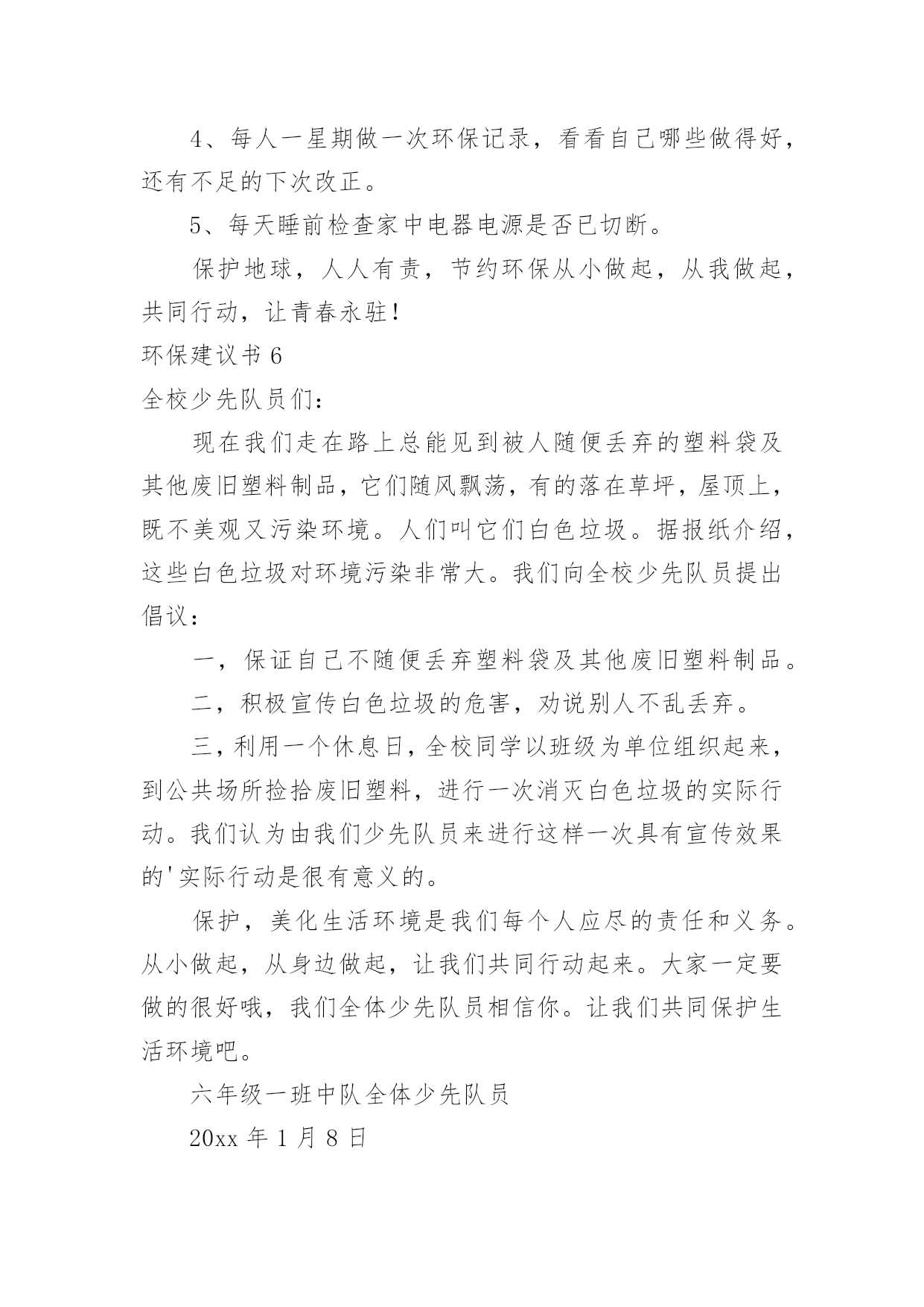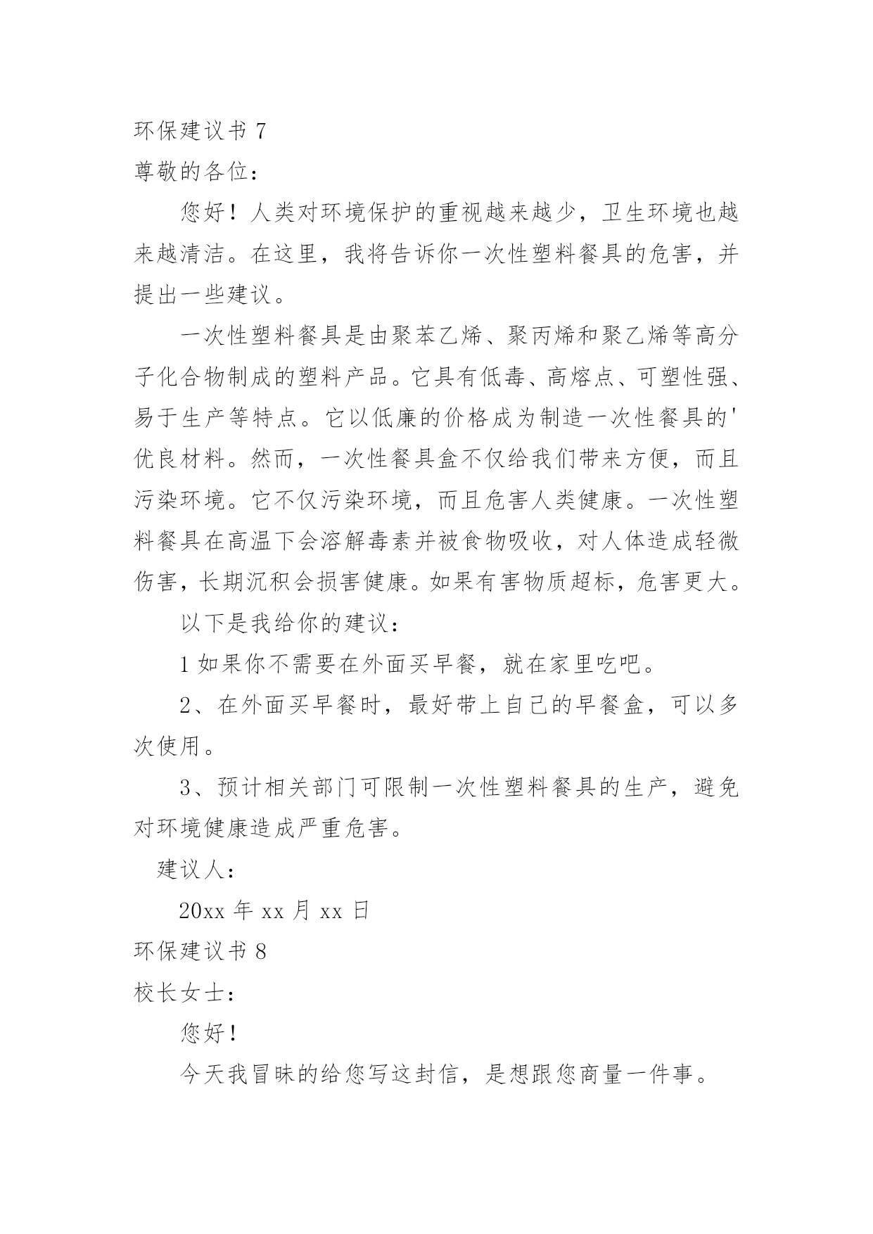 环保建议书环保建议书[热]在现在社会,我们使用上建议书的情况与日俱增,建议书是一连串的管理实践,往往有着至关重要的作用。你写建议书时总是没有新意?以下是小编为大家收集的环保建议书,欢迎大家借鉴与参考,希望对大家有所帮助。环保建议书1广大市民们:你们好!地球,这位人类的母亲,这个生命的摇篮,是那样的美丽壮观,和蔼可亲。但是,由于我们的滥砍滥伐,由于我们随意毁坏自然环境——地球那头美丽的秀发变得稀稀疏疏;地球那饱满的身躯变得骨瘦如柴;地球那容光焕发的面孔变得皱皱巴巴。一条条“皱纹”刻在了“母亲”的脸上!看看我们身边:一些工厂为了自身的利益,肆意破坏自然资源,那原本清澈见底的小溪,碧波荡漾的河水,现在变得混浊不堪、臭气熏天!马路上的那些川流不息的汽车尾部,喷出的一团团黑色烟雾,好似一条条张牙舞爪的黑龙,破坏了城市的环境,毁坏着人们的身心!为了让地球母亲展开那久违的笑容,我还想向大家发出一些忠告:1、不要乱丢乱扔,影响市容市貌!2、出门时不要忘记关灯,以免浪费一度电!3、洗完手请立即关水龙头,以免浪费一滴水!4、不要在公共场所吸烟,既对自身不好,还污染空气!5、养宠物的市民请不要让狗狗随地大小便,既污染环境,又污染风景!6、我们要爱护树木花草,不要随便砍伐,践踏绿色树木和草地,种一棵树就开辟了一片新蓝天!9、一只小小的塑料袋在我们的.生活中是微不足道的,它大约0.4克。可是我们每天只消费一个,就会产生4吨的塑料袋垃圾,所以请不要用塑料袋,减少白色污染!10、每个人都有享受一次性筷子的权利。或许你不曾想过,哪怕我们每一个人这辈子只用过一次,我国也得砍掉15万棵生长了20年的大树。我国每年因生产一次性筷子消耗的林料就达200万立方米。这足以让长江泛滥洪水。你能说,环境问题与白色垃圾无关吗?所以避免白色污染!以上是我的建议,也许不够成熟,但还是希望你们考虑考虑。也许我的写的这些只是一个微薄的力量,但是如果你们认真对待,每个人都出一份这样的微薄之力,那么,世界将是多么的美好!六年2班XXX20xx年11月4日环保建议书2敬爱的环保局领导:您好!我是一名高中生。我知道国家很重视保护环境的问题,也大力提倡环保,以保护环境。所以我就以我身边出现的问题给您写了这封建议书,希望我可以为环保尽一份力量。在日常生活中,我发现人们的环保意识还是有的,垃圾放到指定位置,不随意扔。但是小区里面缺少固定的垃圾存放点,虽然人们将垃圾堆放在路边,垃圾暴露在路上,味道很大,特别是夏天的时候会招来许多的苍蝇。很是煞风景。这也是跟建设绿色小区不符的。所以我希望政府可以设置固定的垃圾放置点,每天有固定的车收拾垃圾。政府为人们做好社会设施,人们也一样会增强自己的环保意识,共同为保护环境做贡献。我还发现,人们不管是什么垃圾都只是随便扔在一起。这样做是不对。有一句话说的好:垃圾是放错了地方的'资源。有许多垃圾还是有很大的回收价值的。相反,这些可以回收的垃圾没有得到有效的回收,这也是一种资源的浪费。所以我建议政府可以将垃圾分类回收,在放置垃圾箱的时候采用不同颜色的垃圾箱或者其他标语提示居民将垃圾分类,这样既可以使垃圾很方便回收,又可以增加人们的垃圾分类的意识,一举两得。同时也希望政府同时加大垃圾分类回收等环保意识在人们中间的宣传,进一步增强人们的环保意识。环境是大家的。生活在一个好的环境里面我相信也是大家都希望的。爱好环境,从你我做起。我也相信人们会跟政府一道为了我们美好的环境而努力。建议人:xxxxx年xx月xx日环保建议书3尊敬的环保局长:你好!作为城市的一位公民,我们都希望我们生活的城市绿树成荫,风景优美,但我们发现,随着XX经济的发展,我们的生活环境日渐差强人意。我们的城市中出现了一些不合谐的现象--在XX公署的西面建设了很多化工厂,滚滚的黑烟从化工厂的烟囱肆无忌惮的冒出来,令人窒息。许多路过这里的人,都被逼的绕道而行,而且,不仅这里有化工厂,XX的其他地方也有许许多多的化工厂,很多地方的天都布满了浓浓的烟雾,使我们昔日的蓝天不再是那么蓝;绿地不再是那么绿;花儿不再是那么娇艳;我们的心情也不再是那么愉快。越来越担心,环境的.污染和破坏究竟对我们的影响和伤害会有多深?虽然这些化工厂给我们带来了不少的经济利益,但是却摧毁了我们的生态环境,我们没有了健康,拥有再多的金钱又有什么意义呢?因此,为了我们的环境不再受到污染,为了找回碧水蓝天,作为XX未来的建设者和主人,我向您郑重提出以下建议:1、请环保部门加强宣传和教育,引导化工厂增加环保设施,减少废气、废水的排放。2、加强对化工厂的监督和检查,使其达到国家规定的排放标准。3、增加对化工厂违反法律法规、肆意排放超标废气、废水违法行为的查处和处罚力度,一旦发现立即停止生产,关闭工厂。4、环保部门要提高环保审核标准,严禁在我市建设新的污
