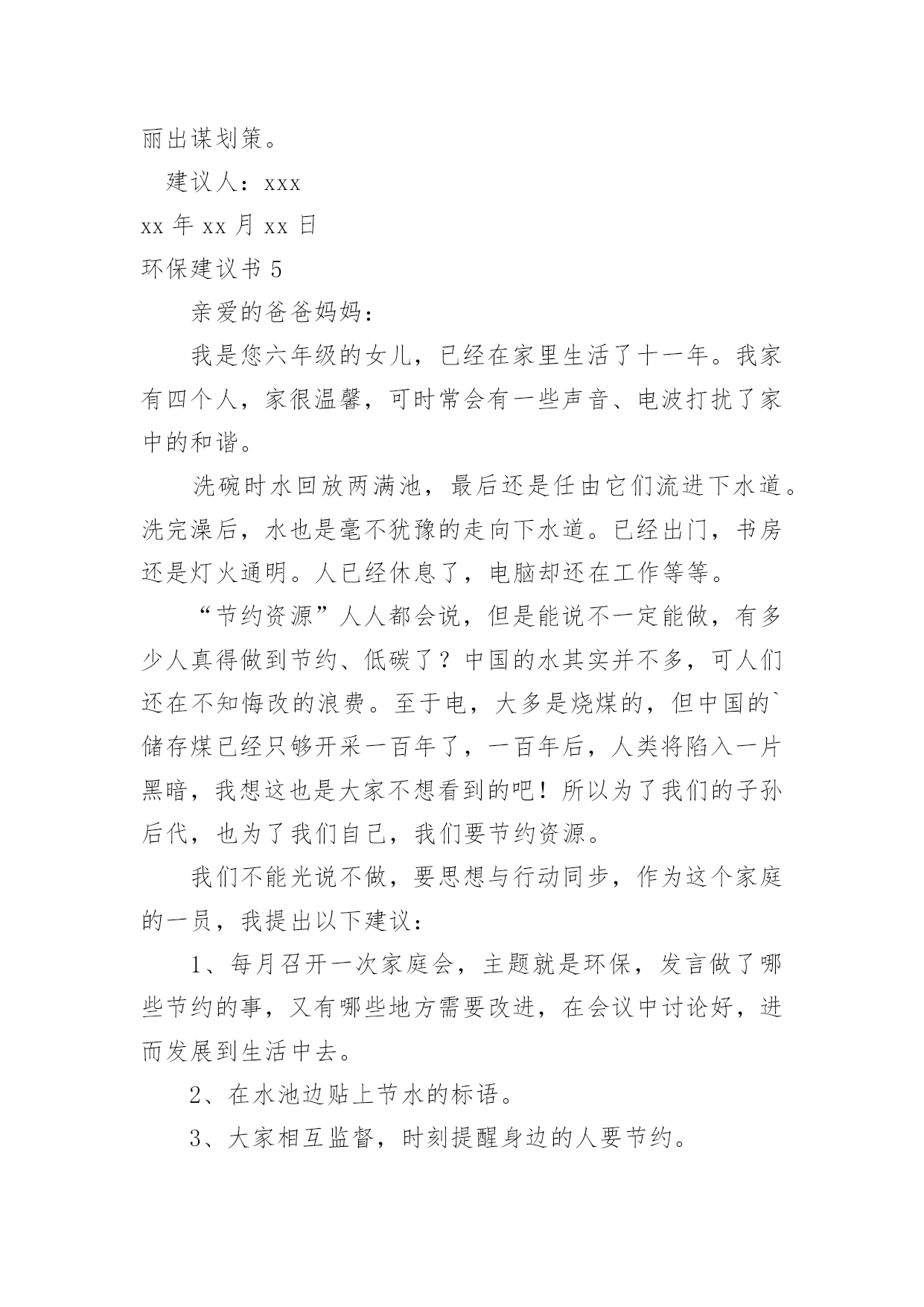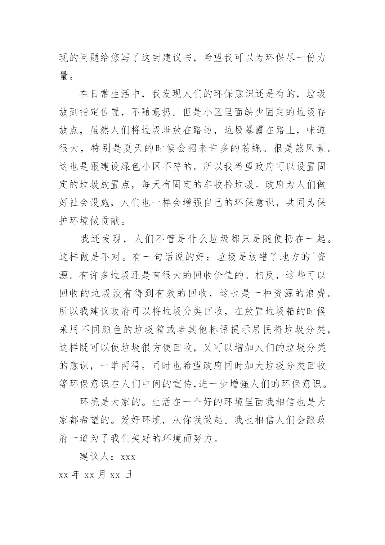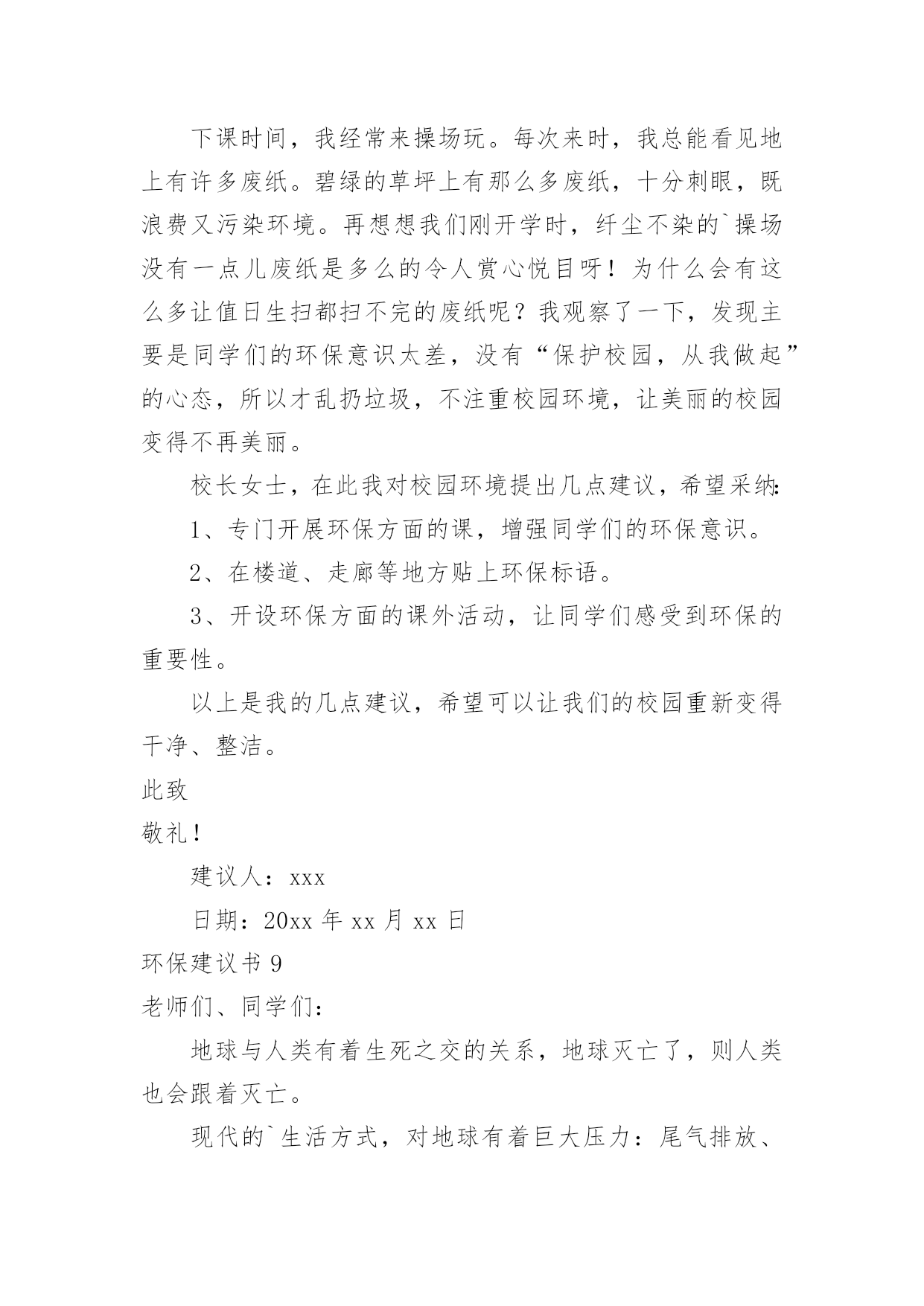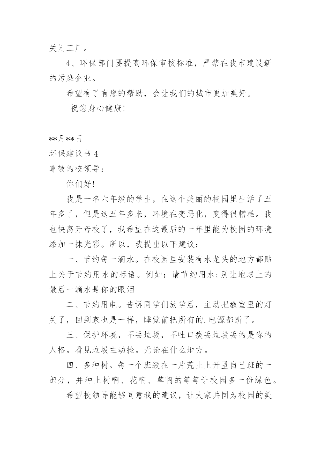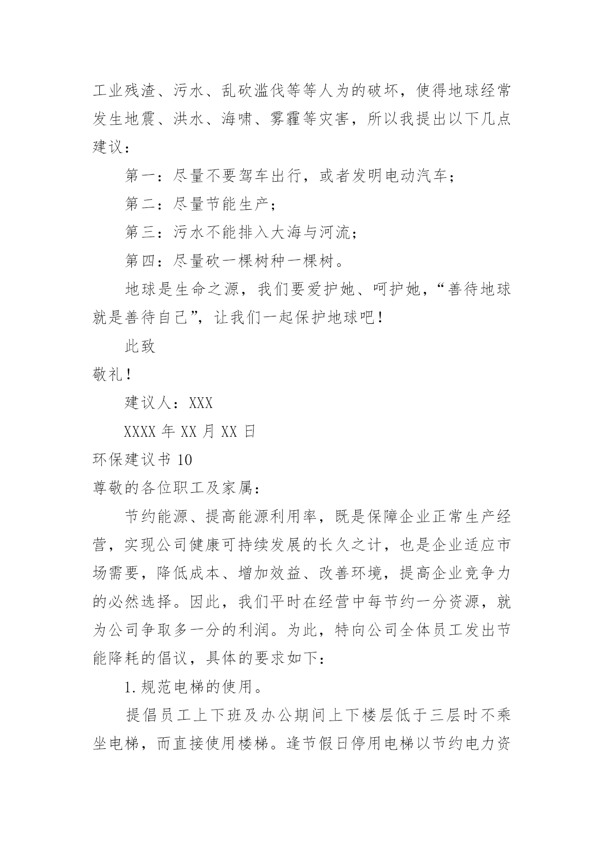 环保建议书环保建议书[热]在现在社会,我们使用上建议书的情况与日俱增,建议书是一连串的管理实践,往往有着至关重要的作用。你写建议书时总是没有新意?以下是小编为大家收集的环保建议书,欢迎大家借鉴与参考,希望对大家有所帮助。环保建议书1广大市民们:你们好!地球,这位人类的母亲,这个生命的摇篮,是那样的美丽壮观,和蔼可亲。但是,由于我们的滥砍滥伐,由于我们随意毁坏自然环境——地球那头美丽的秀发变得稀稀疏疏;地球那饱满的身躯变得骨瘦如柴;地球那容光焕发的面孔变得皱皱巴巴。一条条“皱纹”刻在了“母亲”的脸上!看看我们身边:一些工厂为了自身的利益,肆意破坏自然资源,那原本清澈见底的小溪,碧波荡漾的河水,现在变得混浊不堪、臭气熏天!马路上的那些川流不息的汽车尾部,喷出的一团团黑色烟雾,好似一条条张牙舞爪的黑龙,破坏了城市的环境,毁坏着人们的身心!为了让地球母亲展开那久违的笑容,我还想向大家发出一些忠告:1、不要乱丢乱扔,影响市容市貌!2、出门时不要忘记关灯,以免浪费一度电!3、洗完手请立即关水龙头,以免浪费一滴水!4、不要在公共场所吸烟,既对自身不好,还污染空气!5、养宠物的市民请不要让狗狗随地大小便,既污染环境,又污染风景!6、我们要爱护树木花草,不要随便砍伐,践踏绿色树木和草地,种一棵树就开辟了一片新蓝天!9、一只小小的塑料袋在我们的.生活中是微不足道的,它大约0.4克。可是我们每天只消费一个,就会产生4吨的塑料袋垃圾,所以请不要用塑料袋,减少白色污染!10、每个人都有享受一次性筷子的权利。或许你不曾想过,哪怕我们每一个人这辈子只用过一次,我国也得砍掉15万棵生长了20年的大树。我国每年因生产一次性筷子消耗的林料就达200万立方米。这足以让长江泛滥洪水。你能说,环境问题与白色垃圾无关吗?所以避免白色污染!以上是我的建议,也许不够成熟,但还是希望你们考虑考虑。也许我的写的这些只是一个微薄的力量,但是如果你们认真对待,每个人都出一份这样的微薄之力,那么,世界将是多么的美好!六年2班XXX20xx年11月4日环保建议书2敬爱的环保局领导:您好!我是一名高中生。我知道国家很重视保护环境的问题,也大力提倡环保,以保护环境。所以我就以我身边出现的问题给您写了这封建议书,希望我可以为环保尽一份力量。在日常生活中,我发现人们的环保意识还是有的,垃圾放到指定位置,不随意扔。但是小区里面缺少固定的垃圾存放点,虽然人们将垃圾堆放在路边,垃圾暴露在路上,味道很大,特别是夏天的时候会招来许多的苍蝇。很是煞风景。这也是跟建设绿色小区不符的。所以我希望政府可以设置固定的垃圾放置点,每天有固定的车收拾垃圾。政府为人们做好社会设施,人们也一样会增强自己的环保意识,共同为保护环境做贡献。我还发现,人们不管是什么垃圾都只是随便扔在一起。这样做是不对。有一句话说的好:垃圾是放错了地方的'资源。有许多垃圾还是有很大的回收价值的。相反,这些可以回收的垃圾没有得到有效的回收,这也是一种资源的浪费。所以我建议政府可以将垃圾分类回收,在放置垃圾箱的时候采用不同颜色的垃圾箱或者其他标语提示居民将垃圾分类,这样既可以使垃圾很方便回收,又可以增加人们的垃圾分类的意识,一举两得。同时也希望政府同时加大垃圾分类回收等环保意识在人们中间的宣传,进一步增强人们的环保意识。环境是大家的。生活在一个好的环境里面我相信也是大家都希望的。爱好环境,从你我做起。我也相信人们会跟政府一道为了我们美好的环境而努力。建议人:xxxxx年xx月xx日环保建议书3尊敬的环保局长:你好!作为城市的一位公民,我们都希望我们生活的城市绿树成荫,风景优美,但我们发现,随着XX经济的发展,我们的生活环境日渐差强人意。我们的城市中出现了一些不合谐的现象--在XX公署的西面建设了很多化工厂,滚滚的黑烟从化工厂的烟囱肆无忌惮的冒出来,令人窒息。许多路过这里的人,都被逼的绕道而行,而且,不仅这里有化工厂,XX的其他地方也有许许多多的化工厂,很多地方的天都布满了浓浓的烟雾,使我们昔日的蓝天不再是那么蓝;绿地不再是那么绿;花儿不再是那么娇艳;我们的心情也不再是那么愉快。越来越担心,环境的.污染和破坏究竟对我们的影响和伤害会有多深?虽然这些化工厂给我们带来了不少的经济利益,但是却摧毁了我们的生态环境,我们没有了健康,拥有再多的金钱又有什么意义呢?因此,为了我们的环境不再受到污染,为了找回碧水蓝天,作为XX未来的建设者和主人,我向您郑重提出以下建议:1、请环保部门加强宣传和教育,引导化工厂增加环保设施,减少废气、废水的排放。2、加强对化工厂的监督和检查,使其达到国家规定的排放标准。3、增加对化工厂违反法律法规、肆意排放超标废气、废水违法行为的查处和处罚力度,一旦发现立即停止生产,关闭工厂。4、环保部门要提高环保审核标准,严禁在我市建设新的污